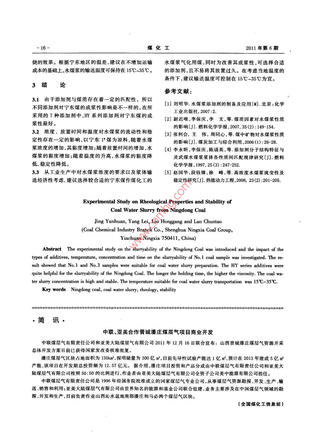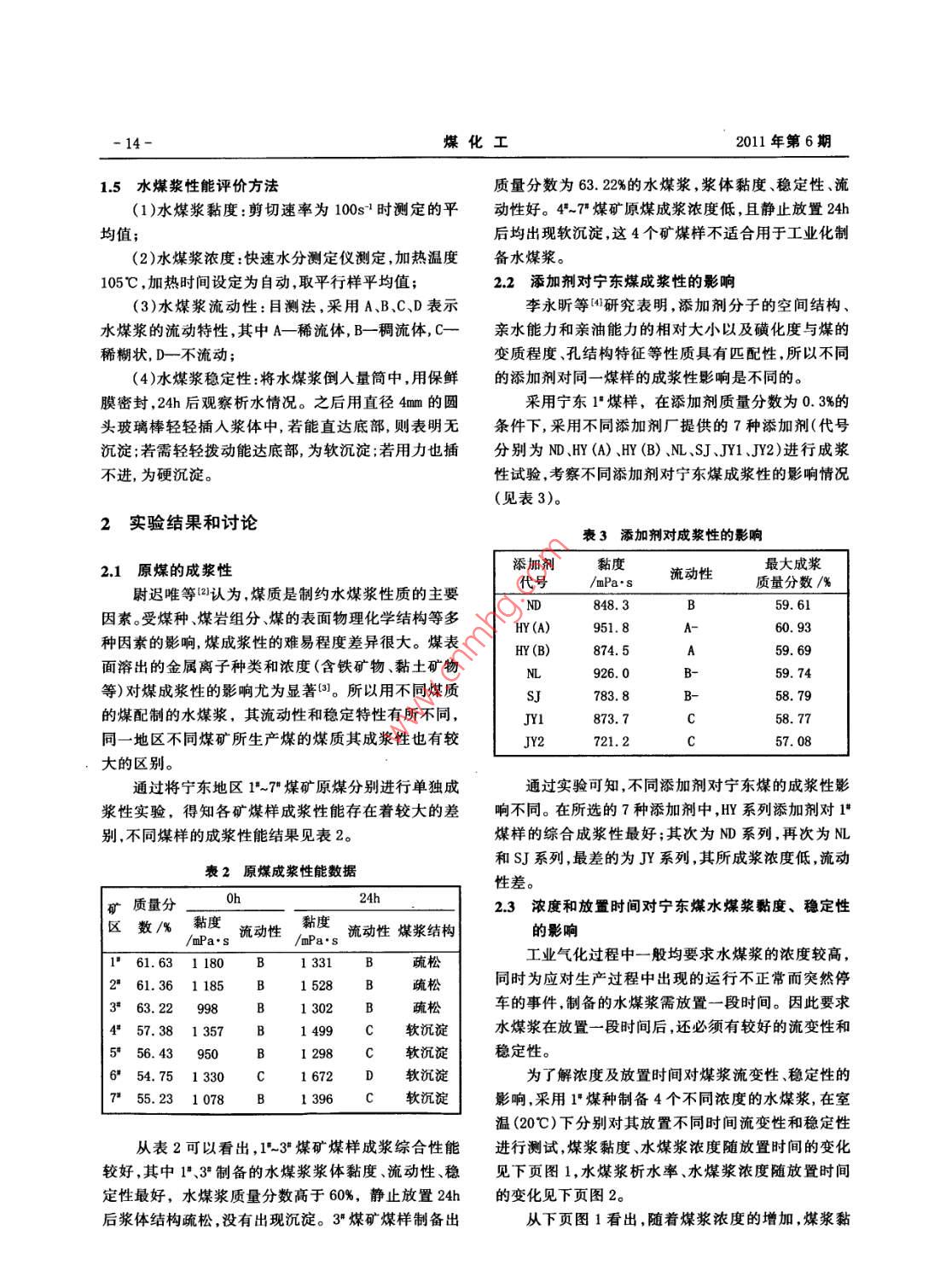 第6期(總第157期)煤化工No 6(Total No. 157)2011年12月Coal Chemical IndustryDe.201寧東煤水煤漿漿體性能實(shí)驗(yàn)研究井云環(huán)楊磊劉洪剛羅春桃(神華寧夏煤業(yè)集團(tuán)煤炭化學(xué)工業(yè)分公司,寧夏銀川750411)摘要通過(guò)寧東煤的成漿性實(shí)驗(yàn),考察了添加劑種類(lèi)溫度、水煤漿濃度和放置時(shí)間對(duì)煤樣成漿性的影響。實(shí)驗(yàn)結(jié)果表明:1、3煤樣適合制備水煤漿;HY系列添加劑對(duì)寧東煤的成漿性較好;隨著溫度的升高,水煤漿黏度降低,穩(wěn)定性降低;水煤漿黏度隨放置時(shí)間的延長(zhǎng)而增加;水煤漿濃度高,穩(wěn)定性好;水煤漿適宜的輸送溫度為15℃~35℃。關(guān)鍵詞寧東煤水煤漿流動(dòng)性穩(wěn)定性文章編號(hào):10059598(2011)-06-001304中圖分類(lèi)號(hào):TQ534文獻(xiàn)標(biāo)識(shí)碼:A為充分利用寧夏的資源綜合優(yōu)勢(shì),建立了寧東能煤礦煤的成漿性進(jìn)行了實(shí)驗(yàn)研究,以考察寧東煤水煤源化工基地。該基地煤化工園區(qū)建設(shè)有多個(gè)煤化工項(xiàng)漿流變性及穩(wěn)定性的影響因素。目,這些項(xiàng)目均采用寧東煤作原料煤,主要包括不黏結(jié)煤、長(zhǎng)焰煤、1/3焦煤、貧煤、瘦煤和無(wú)煙煤等。寧東Ⅰ賣(mài)驗(yàn)煤內(nèi)水質(zhì)量分?jǐn)?shù)高難以制備高質(zhì)量分?jǐn)?shù)的水煤漿。11煤的工業(yè)分析為深入了解寧東各煤礦煤質(zhì)的成漿性,為煤化工選用寧東煤田巳開(kāi)采煤礦的煤,各煤樣名稱(chēng)分別項(xiàng)目采用氣化技術(shù)提供一定依據(jù),對(duì)寧東煤田已開(kāi)采以1·、2、3°4、5°、6、P表示,其工業(yè)分析見(jiàn)表1表1煤樣的工業(yè)分析礦區(qū)M%A/%M/%V-/%FC%發(fā)熱量/J·kg全硫%11.918.5863.4624.550.348.6420.2535.8851.140.7914.766.0519.600.2810.1428.186.4030.73681.3013.2020.196.5820.27617.1422.1316.569,9038.4151.3919.232.5412實(shí)驗(yàn)儀器要求水煤漿中煤顆粒具有一定的粒度分布。先將煤小型破碎機(jī)、小型球磨機(jī)、篩分儀、攪拌器、黏度樣在空氣中晾干,然后用實(shí)驗(yàn)室小型破碎機(jī)破碎到計(jì)、水分測(cè)定儀。3m以下,再在小型球磨機(jī)中磨礦,篩分成不同顆粒13水煤漿的制備區(qū)間的煤粉。試驗(yàn)中,將篩分好的煤粉按照預(yù)定的雙為制備性質(zhì)優(yōu)良的高濃度水煤漿需要使水煤漿峰級(jí)配粒度分布,配制待測(cè)水煤漿中大小煤顆粒相互填充,達(dá)到較高的堆積密度,這就14實(shí)驗(yàn)過(guò)程稱(chēng)取已篩分的不同粒度的煤粉共100g,添加劑收稿日期:2011-09-171g,加入定量水配制水煤漿,混合攪拌5min后,分別作者簡(jiǎn)介:井云環(huán)(1973—),女,1998年畢業(yè)于武漢化工測(cè)定0h和靜止放置24h后的黏度、濃度、流動(dòng)性、穩(wěn)學(xué)院化工系,工程師,現(xiàn)主要從事煤氣化方面研究工作定性、析水率等14煤化工2011年第6期15水煤漿性能評(píng)價(jià)方法質(zhì)量分?jǐn)?shù)為63.22%的水煤漿,漿體黏度、穩(wěn)定性、流(1)水煤漿黏度:剪切速率為100s1時(shí)測(cè)定的平動(dòng)性好。44~7煤礦原煤成漿濃度低,且靜止放置24h均值;后均出現(xiàn)軟沉淀,這4個(gè)礦煤樣不適合用于工業(yè)化制(2)水煤漿濃度:快速水分測(cè)定儀測(cè)定,加熱溫度備水煤漿。105℃,加熱時(shí)間設(shè)定為自動(dòng),取平行樣平均值;22添加劑對(duì)寧東煤成漿性的影響(3)水煤漿流動(dòng)性:目測(cè)法,采用A、B、C、D表示李永昕等研究表明,添加劑分子的空間結(jié)構(gòu)、水煤漿的流動(dòng)特性,其中A—稀流體,B一稠流體,C一親水能力和親油能力的相對(duì)大小以及磺化度與煤的稀糊狀,D一不流動(dòng);變質(zhì)程度、孔結(jié)構(gòu)特征等性質(zhì)具有匹配性,所以不同(4)水煤漿穩(wěn)定性:將水煤漿倒入量筒中,用保鮮的添加劑對(duì)同一煤樣的成漿性影響是不同的。膜密封,24h后觀察析水情況。之后用直徑4mm的圓采用寧東1煤樣,在添加劑質(zhì)量分?jǐn)?shù)為0.3%的頭玻璃棒輕輕插入漿體中,若能直達(dá)底部,則表明無(wú)條件下,采用不同添加劑廠提供的7種添加劑(代號(hào)沉淀;若需輕輕撥動(dòng)能達(dá)底部,為軟沉淀;若用力也插分別為ND、HY(A)、mY(B)M、SJJY1、Y2)進(jìn)行成漿不進(jìn),為硬沉淀。性試驗(yàn),考察不同添加劑對(duì)寧東煤成漿性的影響情況(見(jiàn)表3)。2實(shí)驗(yàn)結(jié)果和討論表3添加劑對(duì)成漿性的影響21原煤的成漿性添加劑黏度代號(hào)流動(dòng)性最大成漿尉遲唯等2認(rèn)為,煤質(zhì)是制約水煤漿性質(zhì)的主要質(zhì)量分?jǐn)?shù)/%848.3因素。受煤種、煤巖組分、煤的表面物理化學(xué)結(jié)構(gòu)等多59.61HY(A)951.860.93種因素的影響,煤成漿性的難易程度差異很大。煤表A9.69面溶出的金屬離子種類(lèi)和濃度(含鐵礦物、黏土礦物926.059.74等)對(duì)煤成漿性的影響尤為顯著。所以用不同煤質(zhì)783.858.79的煤配制的水煤漿,其流動(dòng)性和穩(wěn)定特性有所不同873.7同一地區(qū)不同煤礦所生產(chǎn)煤的煤質(zhì)其成漿性也有較JY2721.2C57大的區(qū)別。通過(guò)將寧東地區(qū)1~7"煤礦原煤分別進(jìn)行單獨(dú)成通過(guò)實(shí)驗(yàn)可知,不同添加劑對(duì)寧東煤的成漿性影漿性實(shí)驗(yàn),得知各礦煤樣成漿性能存在著較大的差響不同。在所選的7種添加劑中,HY系列添加劑對(duì)1別,不同煤
