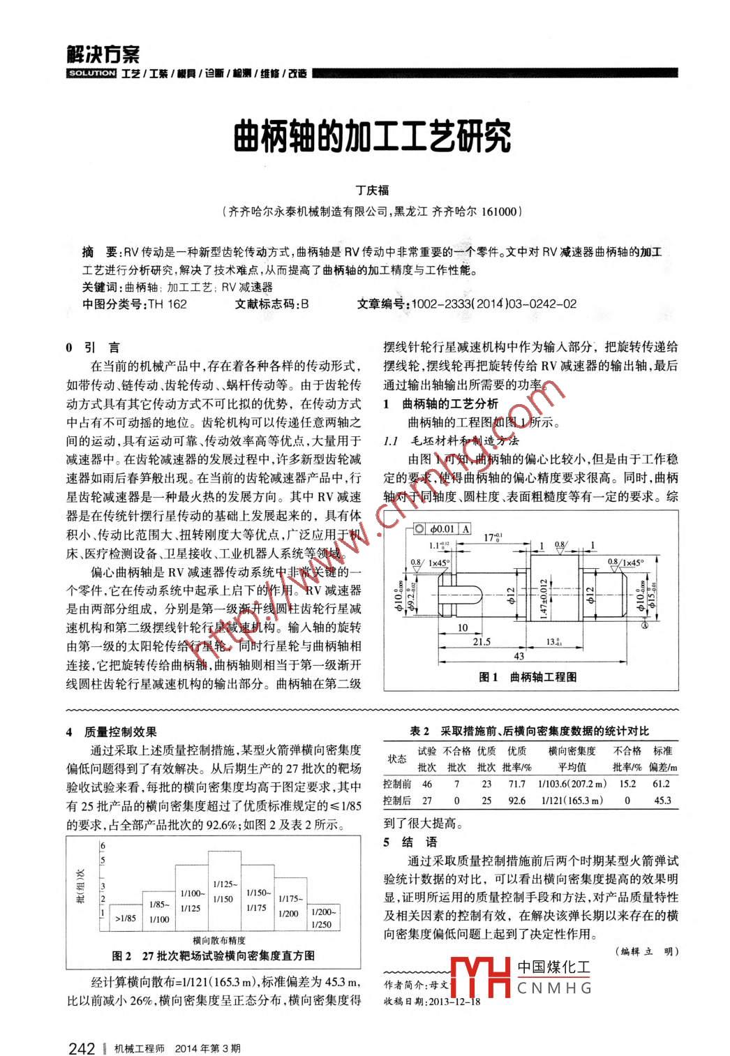 解決方案SOLUTI。N工藝/工/嘏目/迫斷/齟/維峰/改曲柄軸的加工工藝研究丁慶福(齊齊哈爾永泰機(jī)械制造有限公司,黑龍江齊齊哈爾161000摘要:RV傳動(dòng)是一種新型齒輪傳動(dòng)方式,曲柄軸是RV傳動(dòng)中非常重要的一個(gè)零件。文中對(duì)RV減速器曲柄軸的加工工藝進(jìn)行分析研究,解決了技術(shù)難點(diǎn),從而提高了曲柄軸的加工精度與工作性能。關(guān)鍵詞:曲柄軸;加工工藝;RV減速器中圖分類號(hào):TH162文獻(xiàn)標(biāo)志碼:B文章編號(hào):1002-2333(2014)03-0242-020引言擺線針輪行星減速機(jī)構(gòu)中作為輸人部分,把旋轉(zhuǎn)傳遞給在當(dāng)前的機(jī)械產(chǎn)品中,存在著各種各樣的傳動(dòng)形式,擺線輪,擺線輪再把旋轉(zhuǎn)傳給RV減速器的輸出軸,最后如帶傳動(dòng)、鏈傳動(dòng)、齒輪傳動(dòng)、蝸桿傳動(dòng)等。由于齒輪傳通過(guò)輸出軸輸出所需要的功率。動(dòng)方式具有其它傳動(dòng)方式不可比擬的優(yōu)勢(shì),在傳動(dòng)方式1曲柄軸的工藝分析中占有不可動(dòng)搖的地位。齒輪機(jī)構(gòu)可以傳遞任意兩軸之曲柄軸的工程圖如圖1所示。間的運(yùn)動(dòng),具有運(yùn)動(dòng)可靠、傳動(dòng)效率高等優(yōu)點(diǎn),大量用于1.1毛坯材料和制造方法減速器中。在齒輪減速器的發(fā)展過(guò)程中,許多新型齒輪減由圖1可知,曲柄軸的偏心比較小,但是由于工作穩(wěn)速器如雨后春筍般出現(xiàn)。在當(dāng)前的齒輪減速器產(chǎn)品中,行定的要求,使得曲柄軸的偏心精度要求很高。同時(shí),曲柄星齒輪減速器是一種最火熱的發(fā)展方向。其中RV減速軸對(duì)于同軸度、圓柱度、表面粗糙度等有一定的要求。綜器是在傳統(tǒng)針擺行星傳動(dòng)的基礎(chǔ)上發(fā)展起來(lái)的,具有體積小、傳動(dòng)比范圍大、扭轉(zhuǎn)剛度大等優(yōu)點(diǎn),廣泛應(yīng)用于機(jī)01A17床、醫(yī)療檢測(cè)設(shè)備、衛(wèi)星接收、工業(yè)機(jī)器人系統(tǒng)等領(lǐng)域。x45偏心曲柄軸是RⅤ減速器傳動(dòng)系統(tǒng)中非常關(guān)鍵的個(gè)零件,它在傳動(dòng)系統(tǒng)中起承上啟下的作用。RV減速器是由兩部分組成,分別是第一級(jí)漸開線圓柱齒輪行星減,速機(jī)構(gòu)和第二級(jí)擺線針輪行星減速機(jī)構(gòu)。輸入軸的旋轉(zhuǎn)由第一級(jí)的太陽(yáng)輪傳給行星輪,同時(shí)行星輪與曲柄軸相21.5連接,它把旋轉(zhuǎn)傳給曲柄軸曲柄軸則相當(dāng)于第一級(jí)漸開線圓柱齒輪行星減速機(jī)構(gòu)的輸出部分。曲柄軸在第二級(jí)圖1曲柄軸工程圖4質(zhì)量控制效果表2采取措施前、后橫向密集度數(shù)據(jù)的統(tǒng)計(jì)對(duì)比通過(guò)采取上述質(zhì)量控制措施,某型火箭彈橫向密集度偏低問題得到了有效解決。從后期生產(chǎn)的27批次的靶場(chǎng)狀態(tài)試驗(yàn)不合格優(yōu)質(zhì)優(yōu)質(zhì)橫向密集度不合格標(biāo)準(zhǔn)批次批次批次批率%平均值批率%偏差m驗(yàn)收試驗(yàn)來(lái)看,每批的橫向密集度均高于圖定要求,其中控制前4672371711036(2072m)152612有25批產(chǎn)品的橫向密集度超過(guò)了優(yōu)質(zhì)標(biāo)準(zhǔn)規(guī)定的≤185控制后27025926121(1653m)0453的要求,占全部產(chǎn)品批次的926%;如圖2及表2所示。到了很大提高。5結(jié)語(yǔ)通過(guò)釆取質(zhì)量控制措施前后兩個(gè)時(shí)期某型火箭彈試3l/125~驗(yàn)統(tǒng)計(jì)數(shù)據(jù)的對(duì)比,可以看出橫向密集度提高的效果明100-150l/175顯,證明所運(yùn)用的質(zhì)量控制手段和方法,對(duì)產(chǎn)品質(zhì)量特性l/175>1851/0012001200及相關(guān)因素的控制有效,在解決該彈長(zhǎng)期以來(lái)存在的橫1/250橫向散布精度向密集度偏低問題上起到了決定性作用。圖227批次靶場(chǎng)試驗(yàn)橫向密集度直方圖(編輯立明)中國(guó)煤化工經(jīng)計(jì)算橫向散布=2(1653m,標(biāo)準(zhǔn)偏差為453m,作者簡(jiǎn)介:母文CNMHG比以前減小26%,橫向密集度呈正態(tài)分布,橫向密集度得收稿日期:2013-12-18242機(jī)械工程師2014年第3期工芝/工/嘏具/斷/齟/維餡/改【 SOLUTION合各種考慮,曲柄軸的毛坯材料可以選擇45鋼,制造工坯尺寸車出合適長(zhǎng)度的毛坯。在車端面的過(guò)程中,在兩端藝可以采用模鍛,這樣加工出來(lái)的曲柄軸具有較好的強(qiáng)打用于雙頂尖安裝的頂尖孔,車床可選用CA6140機(jī)床。度、剛度和耐磨性。3)車削加工。粗、精車曲柄軸主軸頸、連桿軸頸等所1.2主要加工表面和技術(shù)要求有的外圓表面,同時(shí)在曲柄軸的兩端倒角,留一定的磨削1)外圓表面加工。加工外圓表面的主要技術(shù)要求有余量,車越程槽。形狀精度、位置精度和表面質(zhì)量。其中形狀精度是對(duì)圓4)銑削加工。銑削鍵槽至合適的尺寸,銑床可選用度、圓柱度、直線度有一定的要求。同軸度是位置精度的X52K機(jī)床。要求。表面粗糙度、表面硬度、殘余應(yīng)力是對(duì)表面質(zhì)量提5)磨削加工。對(duì)曲柄軸的主軸頸、連桿軸頸進(jìn)行粗出的要求。加工外表面時(shí)精度的具體等級(jí),應(yīng)根據(jù)外圓表磨、精磨加工,使零件尺寸符合要求。面的具體工作情況而定。外圓表面的加工一般采用車削、6)終檢。檢查曲柄軸的各項(xiàng)尺寸和結(jié)構(gòu)是否滿足要求。磨削,其尺寸精度一般可達(dá)到Ir6-IT5