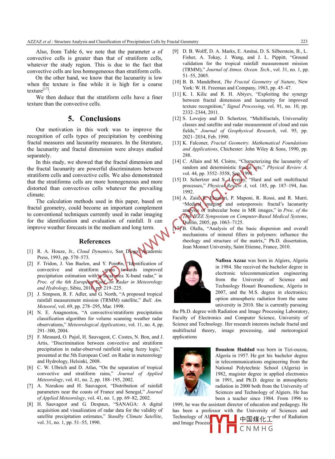 220JOURNAL OF ELECTRONIC SCIENCE AND TECHNOLOGY, VOL. 12, NO. 2, JUNE 2014Structure Analysis and Classification of PrecipitationCells by Fractal GeometryNafissa Azzaz and Boualem HaddadAbstract- -This paper analyzes the possibility to stratiform conditions, a threshold of Z, or a gradient ofdiscriminate between convective precipitation andvertical reflectivity, or the difference of Z observed abovestratiform precipitation. This study aims to improve the and belowfusion level (or shiny band). The resultsmeasurement of rainfall from teledetection data obtained with these algorithms are not entirely convincing,obtained both on the ground and in space. For this, two because they do not cover all the full diversity of weatherparameters, fractal dimension and fractal lacunarity, conditions'hiO.are considered. To calculate the fractal dimension, weThe work presented in this paper focuses on theuse the approach of box-counting and show that the difference between convective and stratiform cells in radarfractal dimension differs between convectives cells andimages, using fractal dimension and fractal lacunarity.stratiforms ones. And then the fractal lacunarityparameter is calculated by using the sliding boxes2. Databasealgorithm. The study for all the regions shows thatprecipitation cells can be described by differentIn this study, we consider four different weather radarlacunarities whatever the scale of analysis. We deducesites: Dakar (Senegal), Bordeaux (France), Melbournethat the two parameters, fractal dimension and fractal (Florida, USA), and State College PA (PennsyIvania, USA).lacunarity, can be used to classify precipitations ir2.1 Region of Dakarconvective regime and stratiform regime.Dakar is the capital of the Republic of Senegal. It isIndex Terms- Convectives cells, fractal dimension,located at the western extremity of Africa, on the narrowfractal lacunarity, radar, stratiforms cells.peninsula of Cape Verde.Being in a tropical semi-desert, Dakar has a1. Introductionmicroclimate of coastal type, influenced by the monsoontrade winds and sea. The hot wet season extends from JuneThe rainfall in general can be characterized by theto October with temperatures of about 27 C and a peak ofconvective regime and stratiform regimel". Convectiveprecipitations in August (250 mm).precipitation is very intense, with a relatively short duration,The radar of Dakar is installed on a tower of 30 mand is very volatile-. In the opposite, stratiform rains are above the sea level at Yoff Airport, in the east of Dakar. Itslow on average, but can persist for hours, leading to angeographical coordinates are 1444' north latitude anaccumulation of significant rainfall24.17° 29' west longitude. It is operated by both the NationalThe classification of precipitations in conveective and Meteorological Office of Senegal and ASECNAstratiform regimes is useful in a variety of meteorology's (Association for the Safety of Air Navigation). This radarapplications. It can help to improve the accuracy of rainfallworks only during storm periods. The average intensity ofrtrieval from teledetetion data obtained both on the rainfalls varies from 300 mm to 1500 mm from Saint Louisground and in spacelShl4.to Cap Skirring"!. The technical characteristics of theMany studies have approached the problem ofweather radar of Dakar are given in Table 1.discrimination between convective precipitation andstratiform precipitation5. Most of the proposed algorithmsTable 1: Characteristics of the: weather radar of Dakar regionconsider a single criterion to identify convective andTechnical characteristicValueDiameter of antenna2.5mManuscript received March 20, 2013; revised May 6, 2013.Transmission frequency5.7 GHzN. Azzaz is with the Laboratory of Images Processing and Radiation,Transmission power250 kW peakFaculty of Electronics and Computer Science, University of Science andTechnology, Algiers, Algeria (Corresponding author e-mail:Spatial resolution1kmx 1kmnafissa_ anl@yahoo.fr).Pulse duration3 usB. Haddad is with the Laboratory of Images Processing and Radiation,Repetition sensitivity-110 dBmFaculty of Electronics and Computer Science. University of Science andBeam wi中國煤化工Technology, Algiers, Algeria (e-mail: h_ boualem@hotmail.com).AntennaDigital Object Identifier: 10.3969/jissn. 1674-862X.2014.02.016MHCN MH G一AZZAZ et al: Structure Analysis and Classification of Precipitation Cells by Fractal Geometry221Table 2: Characteristics of the weather radar of Bordeaux regionTable 4: Characteristics of the weather radar of State College regionTechnical characracteristicValue .Technical characteristic_ValueType of antennaparabolicParabolicTransmission frequency3 GHzTransmission power500kW peakLatiude positin .40° 55 23" NSpatial resolution1kmx 1 kmLongitude position78° O' 14" wPulse durationSHsElevation758 metersRepetition frequency300 HzBeam width to 3dBBeam width to 3 dB0.93° (to 2850 MH2)2.2 Region of Bordeaux3. Theoretical ConceptsThe city of Bordeaux is located in the south western ofFrance. The Bordeaux radar is located in the Bordeaux- 3.1 Fractal DimensionMerignac airport, whose geographical coordinates areThe concept of fractals was first introduced b;44 49'54" north latitude and 0 41'30" west longitude. It is .Mandelbrot! 1,], as an indicator of surface roughness. Theone of 24 metropolitan France radars. The digital analysisfractal theory has been widely applied to different scientificof the reflectivity of 8 bits (SANAGA) includes dataareas, particularly image processing. It contains informationprocessing and data storagel8. The radar is a part of theabout geometric structures of fractals and can also be usedFrench network (ARAMIS) managed by Meteo-France.for non-fractals. It is a measure to quantize the complexityThe area is almost flat. Table 2 gives the technicalof the geometrical objects. Many approaches were proposedcharacteristics of the radar of Bordeaux.for estimating the fractal dimension of images. In our case,2.