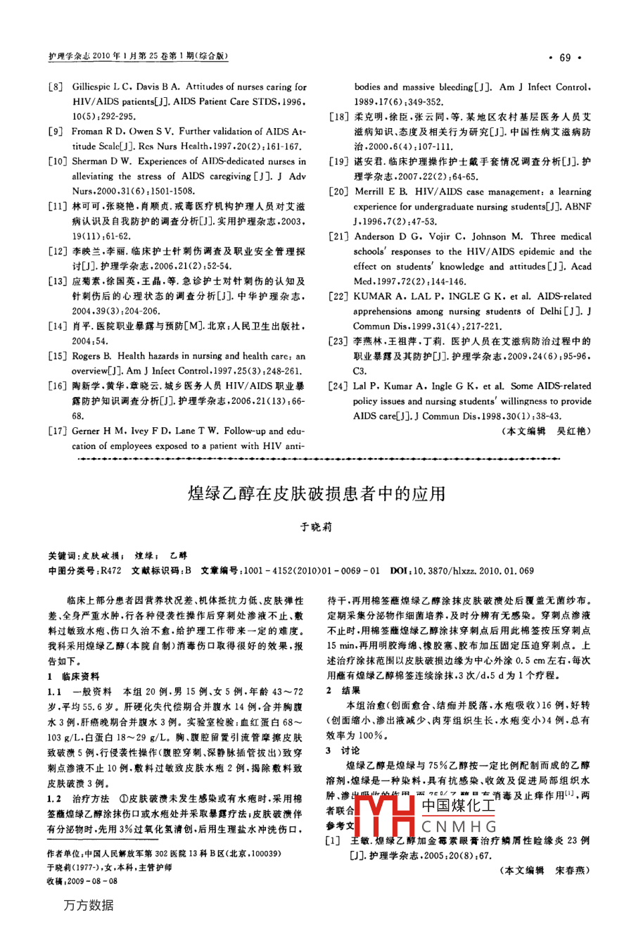擴(kuò)理學(xué)雜志2010年1月第25卷第1期《綜合版)69[8]Gilliespie L C, Davis B A. Attitudes of nurses caring forbodies and massive bleeding[J]. Am J Infect ControlHIV/AIDS patients[J]. AIDS Patient Care STDS, 19961989.17(6):349-35210(5):292-295.[18]柔克明徐臣,張?jiān)仆?等.某地區(qū)農(nóng)村基層醫(yī)務(wù)人員艾[9] Froman R D, Owen SV. Further validation of AIDS At滋病知識(shí)、態(tài)度及相關(guān)行為研究[冂].中國性病艾滋病防titude Scale[J]. Res Nurs Health 1997.20(2):161-167治,2000,6(4):107-1[1o] Sherman D w. Experiences of AIDS-dedicated nurses in[19]諶安君.臨床護(hù)理操作護(hù)土戴手套情況調(diào)查分析[J].護(hù)alleviating the stress of AIDS caregiving [J].JAdv理學(xué)雜志,2007,22(2):64-65.Nurs200031(6):1501-1508[20] Merrill E B. HIV/AIDS casc management: a learning[l1]林可可,張蹺艷,肖順貞,戒毒醫(yī)療機(jī)構(gòu)護(hù)理人員對(duì)艾滋experience for undergraduate nursing students[J]. ABNF病認(rèn)識(shí)及自我防護(hù)的調(diào)查分析[.實(shí)用護(hù)理雜志,2003,J,1996,7(2):47-53.19(11):61-62[21] Anderson D G, Vojir C. Johnson M. Three medical[12]李映蘭,李麗.臨床護(hù)士針刺傷調(diào)查及職業(yè)安全管理探schools' responses to the Hiv/ AIDS epidemic and the寸[J].護(hù)理學(xué)雜志,2006,21(2):5254.effect on students' knowledge and attitudes [J].Acad[13]應(yīng)菊素,徐國英,王晶,等,急診護(hù)土對(duì)針刺傷的認(rèn)知及Med,1997,72(2):144-146針刺傷后的心理狀態(tài)的調(diào)查分析[J.中華護(hù)理雜志,[22] KUMAR A,LALP, INGLE G K,etal. AlDS-relatedapprehensions among nursing students of Delhi [J].J[14]肖平.醫(yī)院職業(yè)暴露與預(yù)防[M]北京:人民衛(wèi)生出版社Commun Dis,1999,31(4):217-2212004:54[23]李燕林,王祖萍,丁莉,醫(yī)護(hù)人員在艾滋病防治過程中的[15] Rogers B. Health hazards in nursing and health care: ar職業(yè)暴露及其防護(hù)[J].護(hù)理學(xué)雜志,200924(6):95-96,overview[J]. Am J Infect Control, 1997,25(3):248-261[16]陶新學(xué)黃華章曉云城鄉(xiāng)醫(yī)務(wù)人員HV/AIDS職業(yè)暴[24]LalP, Kumar A, Ingle g K,etal. Some AIDS-related露防護(hù)知識(shí)調(diào)查分析[].護(hù)理學(xué)雜志,2006,21(13):66s willingness to proviAIDS care[J]. J Commun Dis. 1998.30(1):38-43.[17 Gerner H M, Ivey F D, Lane T w. Follow-up and edu-(本文編輯吳紅艷)cation of employees exposed to a patient with HIV anti-煌綠乙醇在皮膚破損患者中的應(yīng)用于曉莉關(guān)鍵詞:皮膚破損;煌綠;乙醇中圖分類號(hào):R472文獻(xiàn)標(biāo)識(shí)碼:B文章編號(hào):1001-4152(2010)01-0069-01DoI:10.3870/hlxz.2010.01.069臨床上部分患者因營養(yǎng)狀況差、機(jī)體抵抗力低、皮膚彈性待干,再用棉簽蘸煌綠乙醇涂抹皮膚破潰處后覆蓋無菌紗布差、全身嚴(yán)重水腫,行各種侵襲性操作后穿刺處滲液不止、敷定期采集分泌物作細(xì)菌培養(yǎng),及時(shí)分辨有無感染。穿刺點(diǎn)滲液料過敏致水皰、傷口久治不愈,給護(hù)理工作帶來一定的難度。不止時(shí),用棉簽蘸煌綠乙醇涂抹穿刺點(diǎn)后用此棉簽按壓穿刺點(diǎn)我科采用煌綠乙醇(本院自制)消毒傷口取得很好的效果,報(bào)15mn,再用明膠海綿、橡膠塞、膠布加壓固定壓迫穿刺點(diǎn)。上如下述治療涂抹范圍以皮膚破損邊緣為中心外涂0.5cm左右,每次1臨床資料用蘸有煌綠乙醇棉簽連續(xù)涂抹,3次/d,5d為1個(gè)療程11一般資料本組20例,男15例、女5例,年齡43~722結(jié)果歲,平均5.6歲。肝硬化失代償期合并腹水14例,合并胸腹本組治愈(創(chuàng)面愈合、結(jié)痂并脫落,水皰吸收)16例,好轉(zhuǎn)水3例,肝癌晚期合并腹水3例。實(shí)驗(yàn)室檢驗(yàn):血紅蛋白68(創(chuàng)面縮小滲出液減少、肉芽組織生長(zhǎng),水皰變小)4例,總有103g/L.白蛋白18~29g/L。胸、腹腔留置引流管摩擦皮膚效率為100%致破洗5例行侵襲性操作(腹腔穿刺深靜脈插管拔出)致穿3討論刺點(diǎn)滲液不止10例,敷料過敏致皮膚水皰2例,揭除敷料致煌綠乙醇是煌綠與75%乙醇按一定比例配制而成的乙醇皮膚破潰3例溶劑煌綠是一種染料,具有抗感染、收斂及促進(jìn)局部組織水1.2治療方法①皮膚破漬未發(fā)生感染或有水皰時(shí),采用棉腫消毒及止癢作用,兩簽蘸煌綠乙醇涂抹傷口或水皰處并采取暴露療法;皮膚破潰伴者聯(lián)中國煤化工有分泌物時(shí)先用3%過氧化氫清創(chuàng),后用生理鹽水沖洗傷口,考文CNMHG[1]主敏想綠乙醇加金霉素眼膏治療鱗屑性瞼緣炎23例作者單位;中國人民解放軍第302醫(yī)院13科B區(qū)(北京,100039)[].護(hù)理學(xué)雜志,2005:20(8):67于曉莉(1977-),女,本科,主管護(hù)師(本文編輯宋春燕)收稿:2009-08-08
