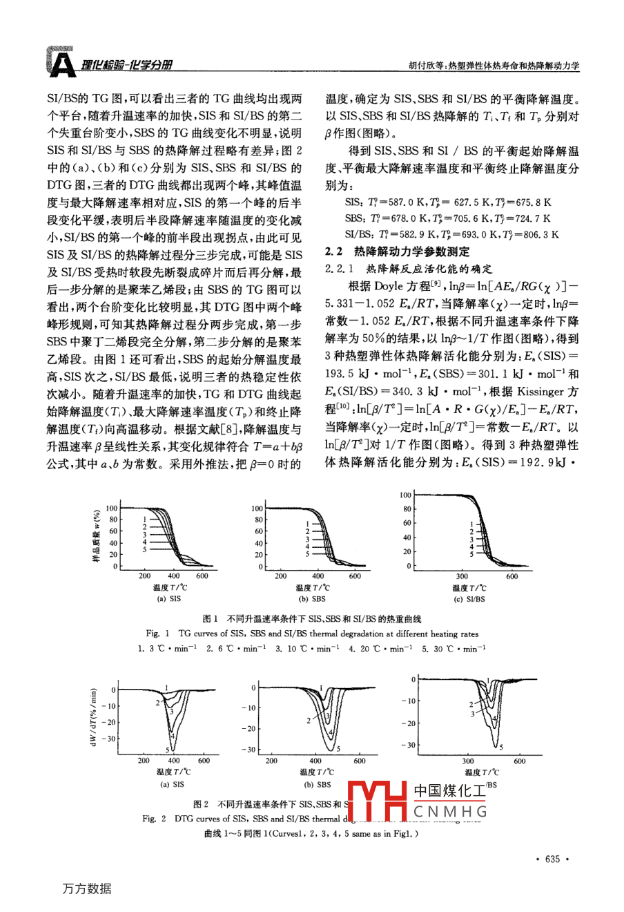 A理化驗(yàn)一等分PTCA(PART B: CHEM. ANAL.)2006年第42卷作筒報(bào)熱塑彈性體熱壽命和熱降解動(dòng)力學(xué)胡付欣,沈久明,楊性坤(信陽(yáng)師范學(xué)院化學(xué)化工學(xué)院,信陽(yáng)464000)摘要:利用熱重法研究了聚苯乙烯/聚二烯烴/聚苯乙烯三嵌段共聚物(SlIS,SBS,SI/BS)在氦氣氣氛條件下以不同升溫速率β時(shí)熱降解動(dòng)力學(xué)及其熱壽命。確定了熱降解溫度與升溫速率的關(guān)系,求得了熱降解過程的表觀活化能和熱降解速率常數(shù),得到了不同失重率時(shí)的熱壽命方程,計(jì)算出三種化合物在不同溫度下的壽命。關(guān)鍵詞:熱塑彈性體;熱重法;熱壽命;活化能;速率常數(shù)中圖分類號(hào):O643.1文獻(xiàn)標(biāo)識(shí)碼:A文章編號(hào):1001-4020(2006008063403THERMAL DEGRADATION KINETICS AND THERMO-LIFEOF THERMOPLASTIC ELASTOMERSHU Fu-xin, shen Jiur-ming, YANG Xing-kun(Dept. Chem. and Chem. Engineering, Xinyang Normal College, Xinyang 464000, China)Abstract Thermogravimetry was applied to the study of thermal degradation kinetics and thermo- life of thethermoplastic elastomers(SIS, SBS, SI/BS)in nitrogen atmosphere under different rates of temperature raising(p). The relationship between the rate of temperature-raising and the thermal degradation temperature wasdetermined, and the apparent activation energy and the constant of rate of thermal degradation were found, and thethermo-life equations under different weight-loss rates were obtained. The life of the 3 compounds under differenttemperatures were calculated.Keywords: Thermoplastic elastomer; Thermogravimetry: Thermo-life: Activation energy: Rate constant熱塑彈性體聚苯乙烯及其同系物與二烯烴類形究并不多見,本文用熱重法測(cè)定SDS的熱壽命和熱成的線形嵌段共聚物(SDS)被譽(yù)為新一代合成橡降解動(dòng)力學(xué)參數(shù),為其應(yīng)用提供理論參考依據(jù)。膠,它們?cè)谑覝叵戮哂辛蚧鹉z的性質(zhì),在高溫下又1試驗(yàn)部分呈現(xiàn)可塑性,具有熔融粘度和溶液粘度小、高彈性、模量小、易加工、余料可重復(fù)利用等特點(diǎn),故其應(yīng)用1.1主要儀器與原料范圍和需求量日益增大~41。最具代表性的SDSSTA409PC型熱分析儀是聚苯乙烯丁二烯苯乙烯(SBS類熱塑彈性體材SBS(YH792)和SIS(1105)為工業(yè)合格品料和聚苯乙烯異戊二烯-苯乙烯(SIS)類嵌段共聚SI/BS:自制(7物及聚苯乙烯-異戊二烯/丁二烯苯乙烯(SI/BS)類1.2熱降解分析嵌段共聚物。人們?cè)谄渲苽浜途酆衔锏慕M成、微觀熱重(TG)、微分熱重(DTG)的測(cè)量在結(jié)構(gòu)與性能關(guān)系等方面作了大量研究取得了可喜 NETZSCH STA-409PC型熱分析儀上進(jìn)行,N2流進(jìn)展。但對(duì)其熱壽命和熱降解動(dòng)力學(xué)方面的研量為20mL·min-1,樣品質(zhì)量為8-10mg,Al2O密封坩堝,升溫速率B=3,6,10,20,30℃·min1。收稿日期:2005-06-132中國(guó)煤化工基金項(xiàng)目:河南省自然科學(xué)基金資助課題(0611012400)CNMHG作者簡(jiǎn)介:胡付欣(1958-),男,河南長(zhǎng)葛人,副教授,主要從事2.1物理化學(xué)和材料熱化學(xué)研究工作圖1中的(a)、(b)和(c)分別為SS、SBS和理化起驗(yàn)-1等分冊(cè)胡付欣等:熱塑彈性體熱壽命和熱降解動(dòng)力學(xué)SI/BS的TG圖,可以看出三者的TG曲線均出現(xiàn)兩溫度,確定為SIS、SBS和SI/BS的平衡降解溫度個(gè)平臺(tái),隨著升溫速率的加快,SIS和SI/BS的第二以 SIS, SBS和SI/BS熱降解的T;、T和T分別對(duì)個(gè)失重臺(tái)階變小,SBS的TG曲線變化不明顯,說明作圖(圖略)。SIS和SI/BS與SBS的熱降解過程略有差異;圖2得到SIS、SBS和SI/BS的平衡起始降解溫中的(a)、(b)和(c)分別為SS、SBS和SI/BS的度、平衡最大降解速率溫度和平衡終止降解溫度分DTG圖,三者的DTG曲線都出現(xiàn)兩個(gè)峰其峰值溫別為度與最大降解速率相對(duì)應(yīng),SIS的第一個(gè)峰的后半TY=587.0K,T=627.5K,T=675.8K段變化平緩,表明后半段降解速率隨溫度的變化減T=678.0K,T=705.6K,T=724.7K小,SI/BS的第一個(gè)峰的前半段出現(xiàn)拐點(diǎn),由此可見SBs:T=582.9K,T=693.0K,Ty=806.3KSlS及SI/BS的熱降解過程分三步完成,可能是Ss22熱降解動(dòng)力學(xué)參數(shù)測(cè)定及SIBS受熱時(shí)軟段先斷裂成碎片而后再分解,最2.2.1熱降解反應(yīng)活化能的確定后一步分解的是聚苯乙烯段;由SBS的TG圖可以根據(jù) Doyle方程,ln9=ln[AERG(x)]看出,兩個(gè)臺(tái)階變化比較明顯,其DTG圖中兩個(gè)峰5.331-1.052E/RT,當(dāng)降解率(x)一定時(shí),ln9=峰形規(guī)則,可知其熱降解過程分兩步完成第一步常數(shù)-1.052E/RT,根據(jù)不同升溫速率條件下降SBS中聚丁二烯段完全分解,第二步分解的是聚苯解率為50%的結(jié)果,以ln9-1/T作圖(圖略),得到乙烯段。由圖1還可看出,SBS的起始分解溫度最3種熱塑彈性體熱降解活化能分別為:E(SIS)=高,SS次之,S/BS最低,說明三者的熱穩(wěn)定性依1935kJ·mol-,E(SBs)=301.1kJ·mol和次減小。隨著升溫速率的加快,TG和DTG曲線起E(SI/BS)=340.3kJ·mo-,根據(jù) Kissinger方始降解溫度(T)、最大降解速率溫度(T)和終止降程!mβ/T]=n[A·R·G(x)/E]-E/RT,解溫度(T)向高溫移動(dòng)。根據(jù)文獻(xiàn)[8],降解溫度與當(dāng)降解率(x)一定時(shí),n[B/T]=常數(shù)一E,/RT。以升溫速率B呈線性關(guān)系其變化規(guī)律符合T=a+b1n/7對(duì)1/T作圖(圖略)。得到3種熱塑彈性公式,其中a、b為常數(shù)。采用外推法把=0時(shí)的體熱降解活化能分別為:E(Sls)=192.9kJ80溫度T/℃(e)Sl/BS圖1不同升溫速率條件下SS、SBS和SI/BS的熱重曲線