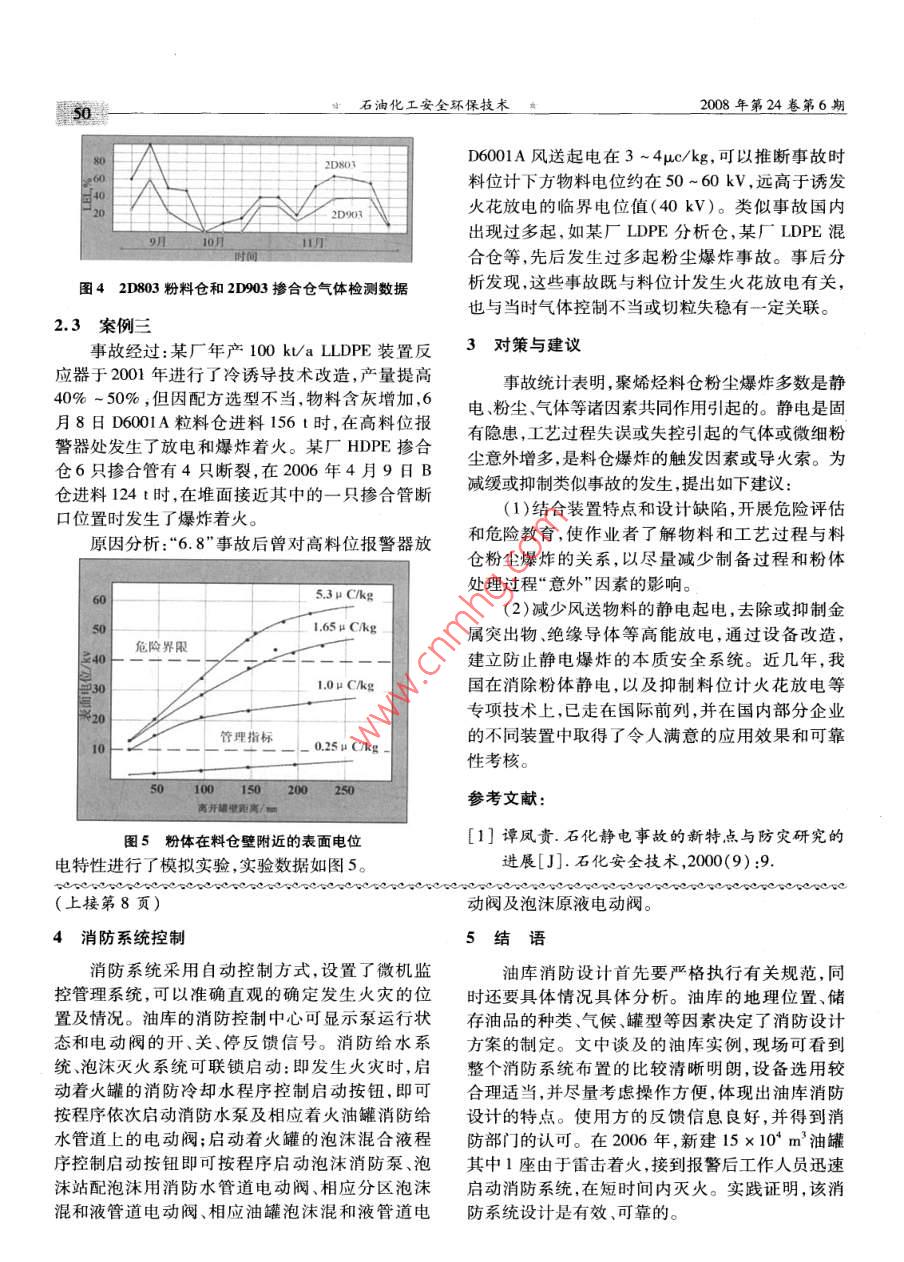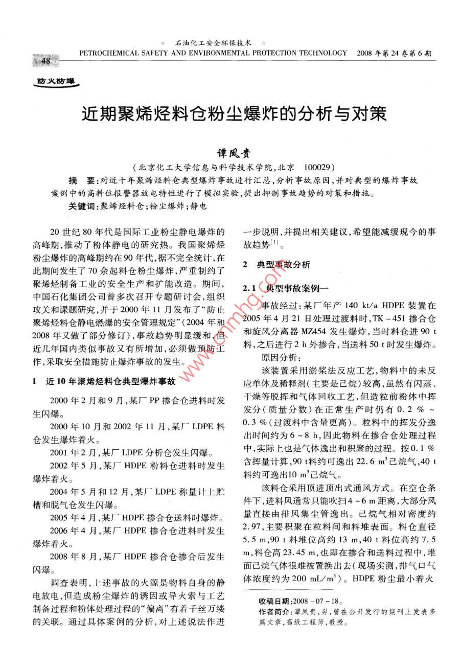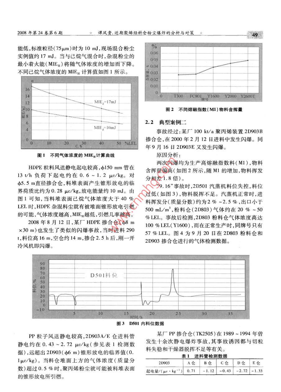 石油化工安全環(huán)保技術(shù)48PETROCHEMICAL SAFETY AND ENVIRONMENTAL PROTECTION TECHNOL0GY 2008 年第24卷第6期防火防爆近期聚烯烴料倉(cāng)粉塵爆炸的分析與對(duì)策譚鳳貴(北京化工大學(xué)信息與科學(xué)技術(shù)學(xué)院,北京100029)滴要:對(duì)近十年聚烯烴料倉(cāng)典型爆炸事故進(jìn)行匯總,分析事故原因,并對(duì)典型的爆炸事故案例中的高料位報(bào)警器放電特性進(jìn)行了模擬實(shí)驗(yàn),提出抑制事故趨勢(shì)的對(duì)策和措施。關(guān)鍵詞:聚烯烴料倉(cāng);粉塵爆炸;靜電.20世紀(jì)80年代是國(guó)際工業(yè)粉塵靜電爆炸的一步說(shuō)明,并提出相關(guān)建議,希望能減緩現(xiàn)今的事高峰期,推動(dòng)了粉體靜電的研究熱。我國(guó)聚烯烴故趨勢(shì)。粉塵爆炸的高峰期約在90年代,據(jù)不完全統(tǒng)計(jì),在2典型事故分析此期間發(fā)生了70余起料倉(cāng)粉塵爆炸,嚴(yán)重制約了聚烯烴制備工業(yè)的安全生產(chǎn)和擴(kuò)能改造。期間,2.1 典型事故案例一中國(guó)石化集團(tuán)公司曾多次召開(kāi)專(zhuān)題研討會(huì),組織攻關(guān)和課題研究,并于2000年11月發(fā)布了“防止事故經(jīng)過(guò):某廠(chǎng)年產(chǎn)140 kt/a HDPE裝置在聚烯烴料倉(cāng)靜電燃爆的安全管理規(guī)定”(2004年和2005年4月21日處理過(guò)渡料時(shí),TK -451摻合倉(cāng)2008年又做了部分修訂),事故趨勢(shì)明顯緩和,但和旋風(fēng)分離器MZ454發(fā)生爆炸,當(dāng)時(shí)料倉(cāng)進(jìn)90 t近幾年國(guó)內(nèi)類(lèi)似事故又有所增加,必須做預(yù)防工料,之后進(jìn)行2 h外摻合,當(dāng)送料50 t時(shí)發(fā)生爆炸。原因分析:作,采取安全措施防止爆炸事故的發(fā)生。該裝置采用淤槳法反應(yīng)工藝,物料中的未反1近10年聚烯烴料倉(cāng)典型爆炸事故應(yīng)單體及稀釋劑(主要是己烷)較高,雖然有閃蒸、2000年2月和9月,某廠(chǎng)PP 摻合倉(cāng)進(jìn)料時(shí)發(fā)干燥等脫揮和氣體回收工藝,但造粒前粉體中揮發(fā)分(質(zhì)量分?jǐn)?shù))在正常生產(chǎn)時(shí)仍有0.2 % ~生閃爆。2000年10月和2002年11月,某廠(chǎng)LDPE料0.3 %(過(guò)渡料中含量更高)。粒料中的揮發(fā)分逸出時(shí)間約為6~8h,因此物料在摻合倉(cāng)處理過(guò)程倉(cāng)發(fā)生爆炸著火。2001年2月,某廠(chǎng)LDPE分析倉(cāng)發(fā)生閃爆。中,實(shí)際上也是氣體逸出和積聚的過(guò)程。按0.1 %2002年5月,某廠(chǎng)HDPE粉料倉(cāng)進(jìn)料時(shí)發(fā)生含揮量計(jì)算,90 t料約可逸出22.6 m'已烷氣,40 t料約可逸出10 m'已烷氣。爆炸著火。2004年5月和12月,某廠(chǎng)LDPE 稱(chēng)量計(jì)上貯該料倉(cāng)采用頂進(jìn)頂出式通風(fēng)方式。在空倉(cāng)條件下,進(jìn)料風(fēng)通常只能吹掃4 ~6 m距離,大部分風(fēng)槽和脫氣倉(cāng)發(fā)生閃爆。2005年4月,某廠(chǎng)HDPE摻合倉(cāng)送料時(shí)爆炸。量直接由排風(fēng)集塵管逸出。己烷氣相對(duì)密度約2006年4月,某廠(chǎng)HDPE摻合倉(cāng)進(jìn)料時(shí)發(fā)生2.97,主要積聚在粒料間和料堆表面。料倉(cāng)直徑5.5 m,90 t料堆位高約13 m,40 t料位高約7.52008年8月,某廠(chǎng)HDPE摻合倉(cāng)摻合后發(fā)生m,料倉(cāng)高23.45 m,也即在摻合和送料過(guò)程中,堆.面已烷氣體很難被置換出去(現(xiàn)場(chǎng)實(shí)測(cè),排氣口氣閃爆。調(diào)查表明,上述事故的火源是物料自身的靜體濃度約為200 mU/m')。HDPE粉塵最小著火電放電,但造成粉塵爆炸的誘因或?qū)Щ鹚髋c工藝收稿日期:2008 -07 -18。制備過(guò)程和粉體處理過(guò)程的“偏離”有著千絲萬(wàn)縷作者簡(jiǎn)介:譚風(fēng)貴,男,曾在公開(kāi)發(fā)行的期刊上發(fā)表多的關(guān)聯(lián)。通過(guò)具體案例的分析,對(duì)上述說(shuō)法作進(jìn)篇文章,高級(jí)工程師,教授。2008年第24卷第6期.譚鳳貴.近期聚烯烴料倉(cāng)粉塵爆炸的分析與對(duì)策 土-49能低,標(biāo)準(zhǔn)粒徑(75μm)時(shí)為10 mJ,現(xiàn)場(chǎng)混合粉塵0.06實(shí)例值約17 mJ。當(dāng)與已烷氣混合時(shí),雜混粉塵的005最小著火能( MIEg)將隨氣體濃度的增加而下降。城0.04不同己烷氣體濃度的MIE計(jì)算值如圖1所示。城0.03200200116T300 FC801 Y1600 Y2000 Y2600T1MIE,-17mJ12圖2不同熔融指數(shù)( M1)物料含揮量2.2典型案例二MIE, , 10mJ事故經(jīng)過(guò):某廠(chǎng)100 kVa聚丙烯裝置2D903B摻合倉(cāng),在2000年2月12日進(jìn)料中發(fā)生閃爆。同10450 %LEL年9月16日2D903E又發(fā)生閃爆。圖1不同氣體濃度的 MIEn計(jì)算曲線(xiàn)原因分析:兩次閃爆均為生產(chǎn)高熔融指數(shù)料(M1),物料HDPE粒料風(fēng)送靜電起電較高,φ150 mm管在含揮量偏高(如圖2所示,隨MI的增加,物料揮發(fā)13v/h負(fù)荷下起電約在0.6~ 1.2 uc/kg。 對(duì)分相差1.8倍)。φs.5m直徑摻合倉(cāng),料堆表面產(chǎn)生錐形放電的臨“9. 16"事故時(shí),2D501汽蒸機(jī)料位失控,料位界荷質(zhì)比約為0.28 μe/kg,放電能量約10 mJ。由.過(guò)低(如圖3) ,物料脫揮不足。汽蒸機(jī)正常時(shí),進(jìn)圖1可知,當(dāng)料堆表面已烷氣體濃度大于40 %料揮發(fā)分(質(zhì)量分?jǐn)?shù))約為2 % ~2.5 % ,出口小于LEL時(shí), HDPE雜混料塵就有被堆面錐形放電引燃500 mL/m' ,粉料倉(cāng)(2D803)氣體約在20 % ~50的可能,氣體濃度越高, MIFg越低,引|燃幾率越高。% LEL。事故后檢測(cè),2D803粉料倉(cāng)氣體濃度