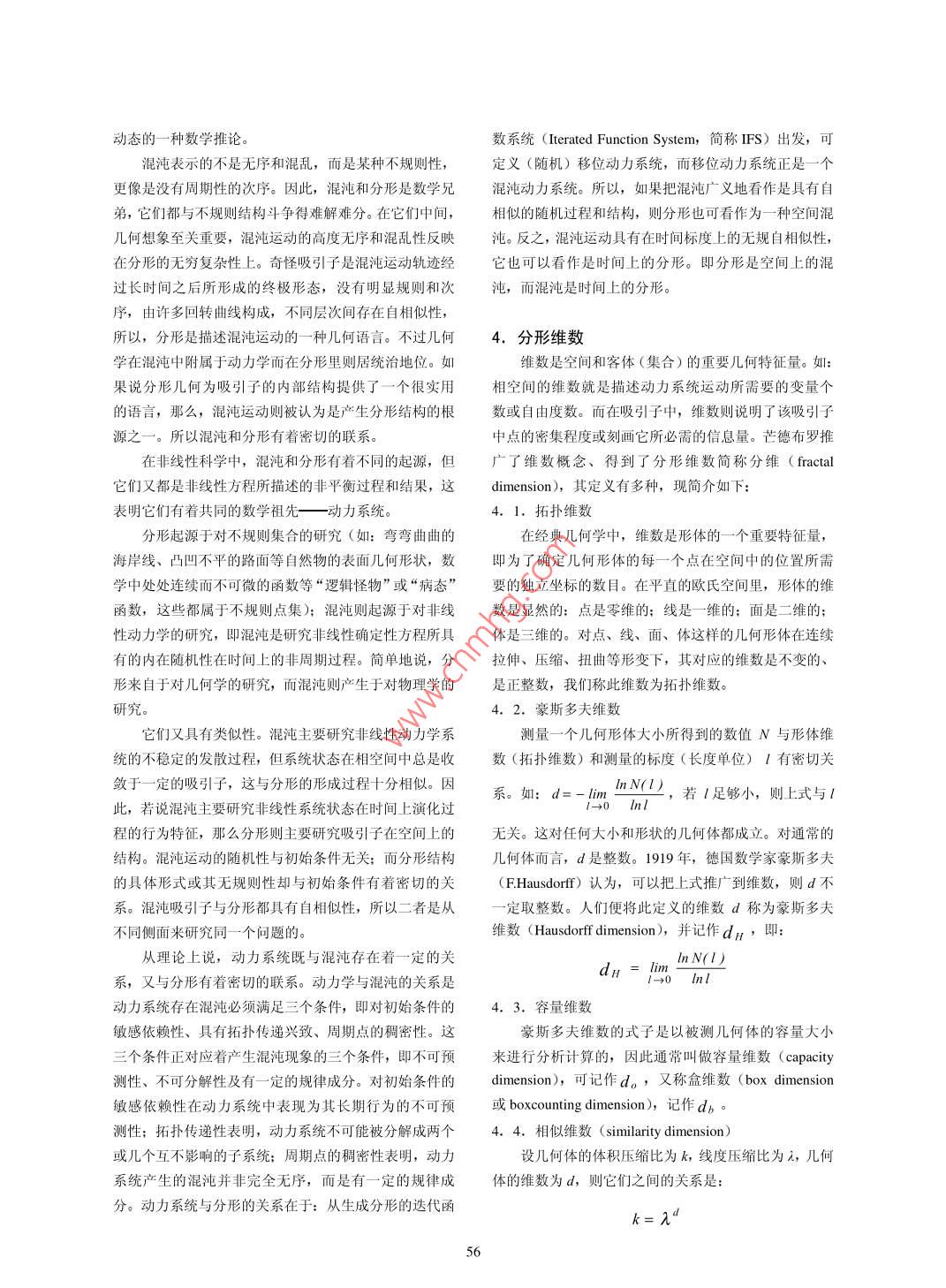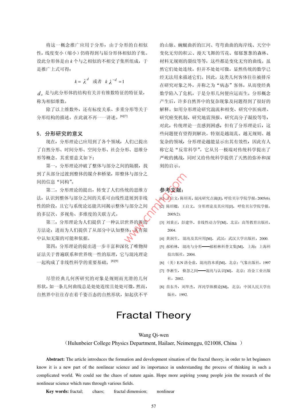 第8卷第5期2006年9月須面牌Sept. 2006分形理論王啟文(呼倫貝爾學(xué)院物理系,內(nèi)蒙古海拉爾區(qū)021008)摘要:本文介紹分形理論的產(chǎn)生與發(fā)展現(xiàn)狀,讓初學(xué)者了解這一非線性科學(xué)中的又一角色在我們認(rèn)識(shí)復(fù)雜世界的思維過程中的重要性,讓我們再一次看到自然界的混沌性。希望更多的有志青年投入到貫穿各個(gè)領(lǐng)域的非線性科學(xué)的研究中。關(guān)鍵詞:分形;混沌;分維;非線性中圖分類號(hào):O4155文獻(xiàn)標(biāo)識(shí)碼:A文章編號(hào):1671-9972(2006)05-005404大家知道,以經(jīng)典歐幾里德幾何為基礎(chǔ)的傳統(tǒng)數(shù)我們周圍的許多不規(guī)則和支離破碎的形狀,并通過鑒別學(xué),研究的都是一些簡單化、規(guī)則化、模型化的東西。出一族我稱為分形的形狀,創(chuàng)立了相當(dāng)成熟的理論?!钡?奧妙、神奇的大自然展現(xiàn)給我們的往往都是復(fù)雜且具有不規(guī)則幾何形態(tài)的物質(zhì)世界,展示給我們的是奇妙的分形。如:圖-1和圖-2中的分形和混沌勾勒出了豐富多彩的真實(shí)世界。l2在非線性科學(xué)中,分形與混沌有著不同的起源,但它們又都是非線性方程所描述的非平衡的過程和結(jié)果正如分形理論的創(chuàng)立者芒德布羅(B. B Mandelbrot)在他的名著《大自然的分形幾何學(xué)》中開始就說:“為什圖-1蕨類植物的葉么幾何學(xué)常常被說成是‘冷酷無情’、‘枯燥乏味’的?原因之一在于它無力描寫云彩、山嶺、海岸線或樹木的形狀。云彩不是球體、山嶺不是錐體、海岸線不是圓周、樹皮并不光滑、閃電更不是沿著直線傳播的.。這些圖形的存在,激勵(lì)著我們?nèi)ヌ剿髂切┍粴W幾里得擱置在邊、被認(rèn)為是‘無形狀可言’的形狀,去研究‘無定形’的形態(tài)學(xué)。然而數(shù)學(xué)家們蔑視這種挑戰(zhàn),他們越來越多地選擇了、想出了種種與我們看得見或感覺得到的圖-2科赫雪花任何東西都無關(guān)的理論來逃避大自然。作為這個(gè)挑戰(zhàn)的回答,我構(gòu)思和發(fā)展了大自然的一種新的幾何學(xué)一分1.分形理論的產(chǎn)生與發(fā)展形幾何學(xué)。并在許多不同領(lǐng)域中找到了用途。它描述了分形理論是非線性科學(xué)研究中十分活躍的一個(gè)分支,它的研究對(duì)象是自然界和非線性系統(tǒng)中出現(xiàn)的不收稿日期:20060721責(zé)任編輯:王婷婷光滑和不規(guī)則的幾何形體。分形理論的數(shù)學(xué)基礎(chǔ)是分作者簡介:王啟文(1963-),男,蒙古族,呼倫貝爾學(xué)院物理系副形幾何。教授,主要從事大學(xué)物理的教學(xué)、統(tǒng)計(jì)物理及非線性混沌分形理論的基本思想起源于20世紀(jì)初、發(fā)展于20理論的研究世紀(jì)60年代后。創(chuàng)立分形理論的代表人物為美國數(shù)學(xué)家、美國科學(xué)院院士芒德布羅(B.B. Mandelbrot)。1960的等邊三角形并挖去中間的一個(gè),如此分下去,最后所年,芒德布羅到哈佛大學(xué)去講課,發(fā)現(xiàn)自己硏究的經(jīng)濟(jì)得到的圖案便構(gòu)成一個(gè)無窮層次的自相似結(jié)構(gòu),稱為席模式中高低收入的分布圖與利塔沃經(jīng)濟(jì)中心大廈黑板爾賓斯基墊片或箭頭圖案。上的棉花價(jià)格變動(dòng)圖是一樣的,他不無怨氣地開玩笑說:“我的圖怎么能在做報(bào)告前就畫出來了呢?”,之后,他轉(zhuǎn)向?yàn)榉治雒迌r(jià)變化。他采用一種特殊的變換尺度的方式考察棉價(jià)變化的內(nèi)在序列,驚人地發(fā)現(xiàn)了:盡管棉價(jià)的每一次變好是隨機(jī)的,但價(jià)格的日變化和月變化的曲線竟然完全一致!這就是說,在大量的無序的數(shù)據(jù)里存在著一種出乎意料的有序。圖-4席爾賓斯基墊片芒德布羅又從“英國的海岸線有多長”的問題著手進(jìn)行研究,提出了一個(gè)驚人的論點(diǎn):任何一段海岸線都2.3.席爾賓斯基地毯( Sierpinski carpet);:如圖5是無限長的。雖然一條曲折的海岸線不能精確測量,但個(gè)正方形,等分為9個(gè)小正方形并挖去中間的一個(gè),把它卻有某種特征量,就是分形所揭示的分?jǐn)?shù)維數(shù),可以剩下的八個(gè)又這么處理,如此做下去,最后得到一個(gè)無對(duì)分形對(duì)象內(nèi)部的不均勻性、層次結(jié)構(gòu)性的整體數(shù)量特窮層次的自相似結(jié)構(gòu),稱為席爾賓斯基地毯。征進(jìn)行刻畫。分形的意義在于摸索自相似,自相似是跨越不同尺度的對(duì)稱性,圖案之中套圖案。1975年,芒德布羅用“分形”一詞囊括了其思想,相繼出版了杰作《分形對(duì)象——形、機(jī)遇和維數(shù)》、《分形——形、機(jī)遇和維數(shù)》、《大自然的分形幾何學(xué)》三本專著。在這些專著中,第一次系統(tǒng)地闡述了分形幾何的思想、內(nèi)容、意義和方法。這些專著的發(fā)表標(biāo)志著分形幾何作為一個(gè)獨(dú)立的學(xué)科正式誕生。圖-5席爾賓斯基地毯1998年,研究幾何與混沌的麥克·馬倫獲菲爾茲獎(jiǎng)再一次說明了混沌、分形理論在科學(xué)研究領(lǐng)域的地位以上是人為的理想的自相似結(jié)構(gòu),在真實(shí)的宏觀世界中也能看到各種自相似結(jié)構(gòu)。當(dāng)然物體總是不可避免地受到環(huán)境的各種隨機(jī)的作用,這就使得所形成的自相似結(jié)構(gòu)不可能是嚴(yán)格規(guī)則