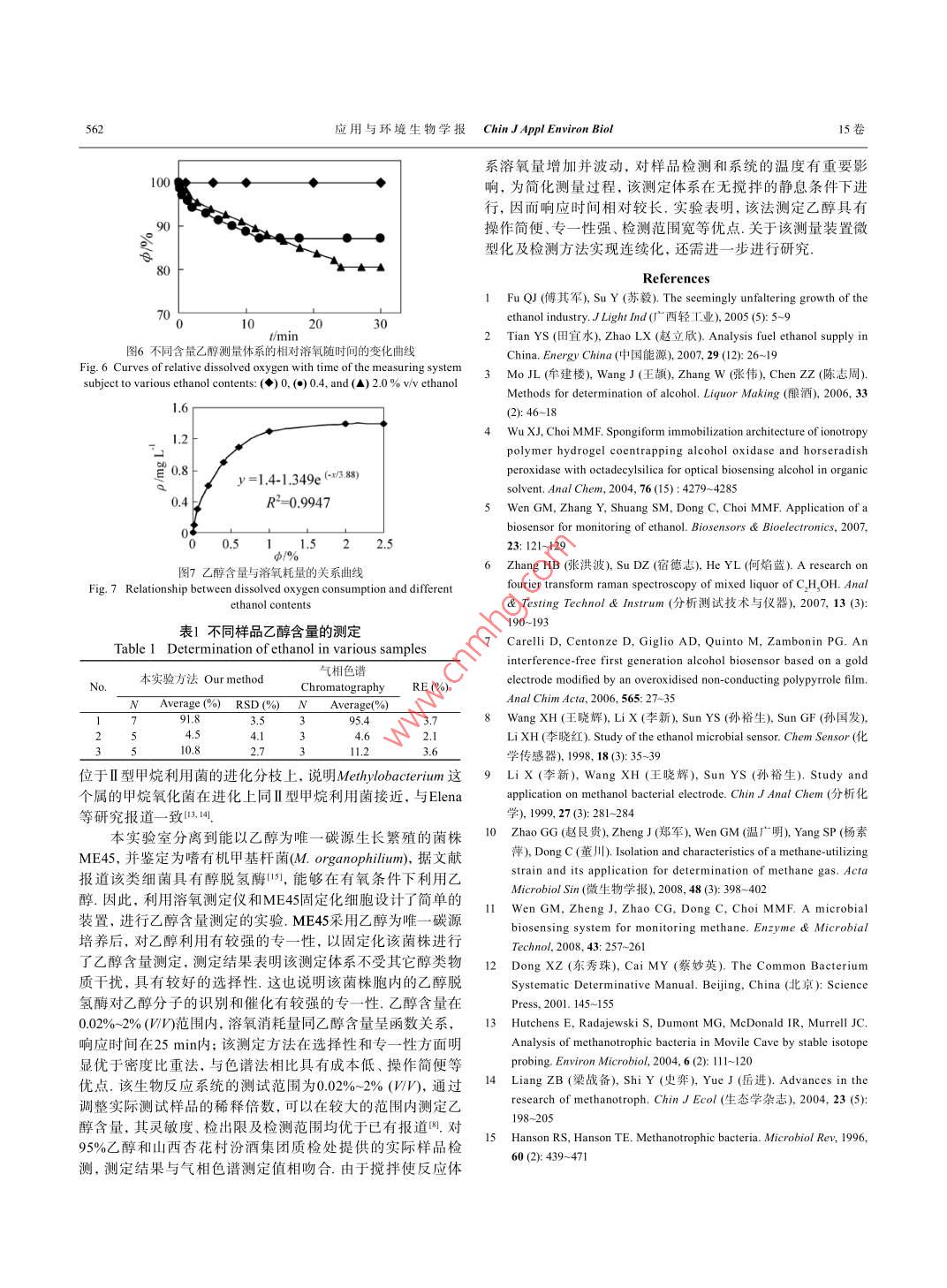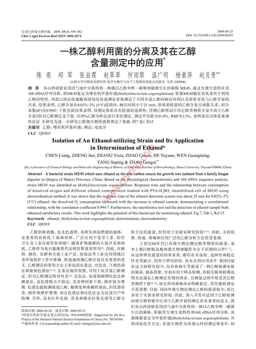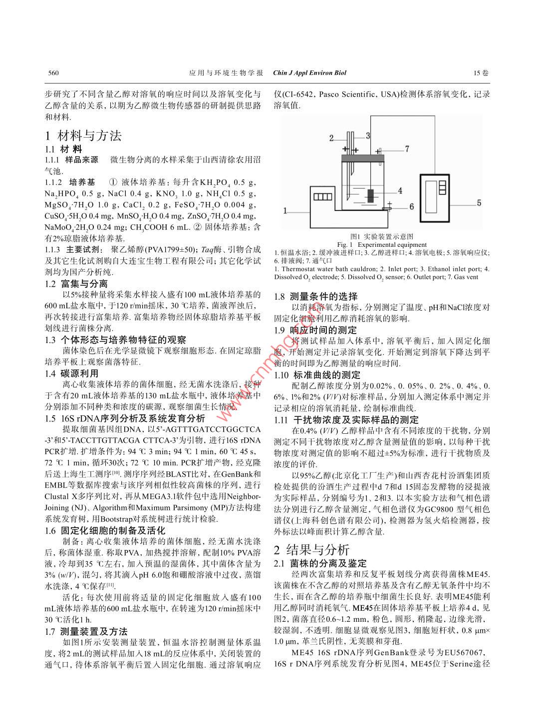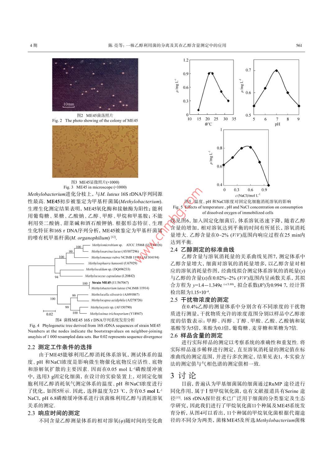 用與環(huán)境生物學(xué)報(bào)2009,15(4x59-5622009-08-25Chin J Appl Environ Bio/=/SSN 1006-687XDOⅠ:10.3724SPJ.1145.200900559株乙醇利用菌的分離及其在乙醇含量測定中的應(yīng)用陳亮鄭軍張益霞趙翠翠何雨原溫廣明楊素萍趙艮貴山西大學(xué)生物技術(shù)研究所化學(xué)生物學(xué)與分子工程教育部重點(diǎn)實(shí)驗(yàn)室太原030006摘要從山西清徐農(nóng)用沼氣池中分離得到一株能以乙醇為唯一碳源和能源生長的菌株ME45,通過生理生化特征及16 S rDNA序列分析,將ME45鑒定為嗜有機(jī)甲基桿菌 Methylobacterium organophiliun).依據(jù)ME45能在有氧條件下利用乙醇的特性,因此以固定化細(xì)胞和溶氧儀組成測定系統(tǒng)測定了不同含量乙醇的響應(yīng)時(shí)間以及溶氧變化與乙醇含量的關(guān)系結(jié)果表明,乙醇含量在0.02%~-2%(W∽)范圍內(nèi),響應(yīng)時(shí)間小于25min,溶氧消耗量同乙醇含量呈函數(shù)關(guān)系,擬合系數(shù)(R)為09947.干擾實(shí)驗(yàn)結(jié)果表明,該測定體系具有較強(qiáng)的選擇性,待測乙醇樣品中其它醇類物質(zhì)含量不高于乙醇含量5倍對乙醇測定無干擾.以95%乙醇為樣品進(jìn)行多次測定,測定平均值為918%,RSD為3.5%,表明該反應(yīng)體系重現(xiàn)性良好.本研究為進(jìn)一步研究乙醇微生物傳感器奠定了基礎(chǔ).圖7表1參15關(guān)鍵詞乙醇;嗜有機(jī)甲基桿菌;測定;電化學(xué)CLC Q939,9Isolation of An ethanol-utilizing strain and Its applicationin determination of ethanolCHEN Liang, ZHENG Jun, ZHANG Yixia, ZHAO Cuicui, HE Yuyuan, WEN Guangming,YANG Suping ZHAO(Key Laboratory of Chemical Biology and Molecular Engineering of Ministry of Education, Institute of Biotechnology, Shanxi University. Taiyuan 030006, China)Abstract a bacterial strain ME45 which uses ethanol as the sole carbon source for growth was isolated from a family biogasdigester in Qingxu of Shanxi Province, China. Based on the physiological characteristics and 16S rDNA sequence analysis,strain ME45 was identified as Methylobacterium organophilium. Response time and the relationship between consumptionof dissolved oxygen and different ethanol contents were studied with PVA-H, BO, immobilized cell of ME45 usingelectrochemical method. It was shown that the response time of the ethanol detection system was about 25 min for 0.02%-2%(/n)ethanol, the dissolved O, consumption increased with the increase in ethanol content, demonstrating a correlationalrelationship, with the correlation coefficient 0.994 7. Furthermore, the interference test and the detection of ethanol sample bothobtained satisfactory results. This work highlights the potential of this bacterium for monitoring ethanol, Fig 7, Tab l, Ref 15Keywords ethanol; Methylobacterium organophilium; determination; electrochemistryCLC Q9399乙醇俗稱酒精,是無色透明、易揮發(fā)和易燃燒的液體,析方法的報(bào)道,但仍處于實(shí)驗(yàn)室硏究階段氐.因此,尋找簡是重要的有機(jī)化工基礎(chǔ)原料,廣泛應(yīng)用于化學(xué)工業(yè)、醫(yī)療便、快速、準(zhǔn)確和應(yīng)用廣泛的乙醇分析方法倍受重視衛(wèi)生及工業(yè)合成等各領(lǐng)域.隨著礦物能源的大量開采和消上世紀(jì)80年代已有微生物法測定醇類物質(zhì)的報(bào)道,基耗,乙醇作為化石能源替代品將發(fā)揮重要作用叫因此,在釀本上都以醇脫氫酶和微生物細(xì)胞作為分子識別的元件7,酒、制藥、發(fā)酵和合成工業(yè)產(chǎn)品、化妝品等工業(yè)應(yīng)用領(lǐng)域以從這些研究報(bào)道的結(jié)果來看,都存在壽命短、選擇性和穩(wěn)定及環(huán)境保護(hù)工作中準(zhǔn)確、快速地檢測乙醇含量具有重要的意性差等缺點(diǎn),仍處于研究階段,尚未達(dá)到應(yīng)用水平我國目前義乙醇測定的常用方法主要包括比重法、比色法、氣相色譜在這方面研究較少,僅有孫裕生等報(bào)道了一種乙醇細(xì)菌電極法和液相色譜法比重法操作簡便,可用于高含量乙醇測的制備,制備簡便,并初步用于樣品檢測,但檢出限和檢測范定,但對乙醇測定特異性差叫比色法,如重鉻酸鉀比色法和圍無法滿足乙醇測定發(fā)展的要求,且測量過程中易受其它醇碘量法,顯色緩慢且不穩(wěn)定,受多種因素干擾,操作較為繁類物質(zhì)干擾咧;而且所用菌株尚未明確鑒定,其代謝機(jī)理也瑣色譜法能檢測微量乙醇,精密度和準(zhǔn)確性很高,但儀器昂不甚清楚.目前,國內(nèi)外微生物法測定乙醇的報(bào)道較少,而且貴、操作和維護(hù)繁瑣.而且色譜法和比色法也無法進(jìn)行戶外檢測.另外,還有紅外光譜、熒光和激光拉曼光譜等乙醇分多處于實(shí)驗(yàn)室研究階段.因此,深入開發(fā)可適用于乙醇檢測的微生物資源并應(yīng)用于乙醇含量的測定具有重要的意義.我們從山西清徐農(nóng)用沼氣池中分離得到一株以乙醇為唯一碳源收稿日期:2008-06-02接受日期:2008-09-12生長的菌株,依據(jù)其生理生化特性和16 S rDNA序列分析,該國家自然科學(xué)基金重點(diǎn)項(xiàng)目(No.50534100資助 Supported by the Key菌株被鑒定為甲基桿菌 Methylobacterium organophiliun),并Project of the National Natural Science Foundation of China*通訊作者Correspondingauthor(E-mai:chungui@sxu.edu.cn)利用電化學(xué)方法,在微生物作為識別元件的測定體系中,初560應(yīng)用與環(huán)境生物學(xué)報(bào) Chin J Appl Environ Bio15卷步研究了不同含量乙醇對溶氧的響應(yīng)時(shí)間以及溶氧變化與儀(CI-6542, Pasco Scientific,USA)檢測體系溶氧變化,記錄乙醇含量