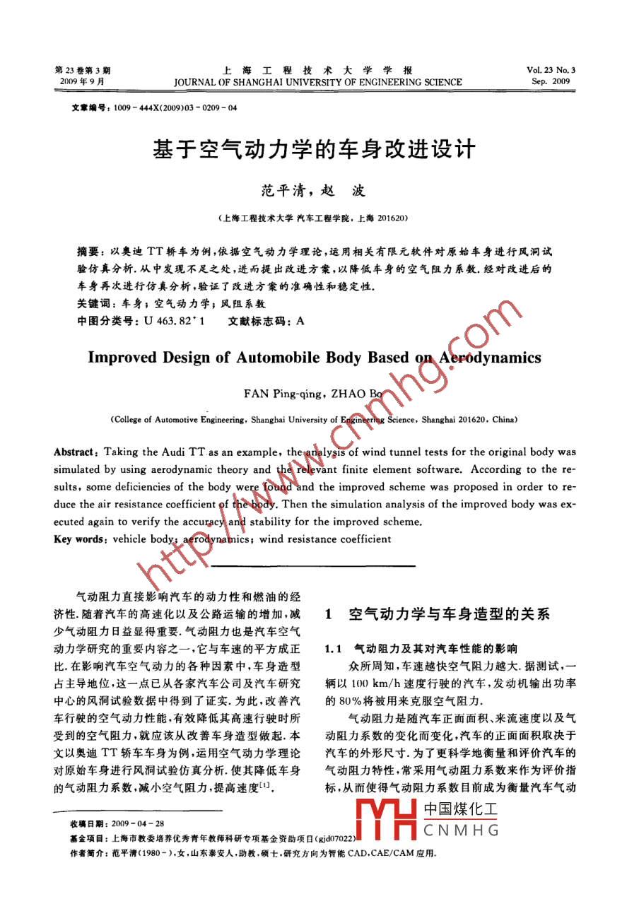 第23卷第3期上海工程oL. 23 No. 309年9月JOURNAL OF SHANGHAI UNIVERSITY OF ENGINEERING SCIENCEsep.2009文章編號:1009-444X(2009)03-0209-04基于空氣動力學(xué)的車身改進(jìn)設(shè)計范平清,趙波(上海工程技術(shù)大學(xué)汽車工程學(xué)院,上海201620)摘要:以奧迪TT轎車為例,依據(jù)空氣動力學(xué)理論,運(yùn)用相關(guān)有限元軟件對原始車身進(jìn)行風(fēng)洞試驗(yàn)仿真分析.從中發(fā)現(xiàn)不足之處,進(jìn)而提出改進(jìn)方案,以降低車身的空氣阻力系數(shù).經(jīng)對改進(jìn)后的車身再次進(jìn)行仿真分析,驗(yàn)證了改進(jìn)方案的準(zhǔn)確性和穩(wěn)定性關(guān)鍵詞:車身;空氣動力學(xué);風(fēng)阻系數(shù)中圖分類號:U463.821文獻(xiàn)標(biāo)志碼:AImproved Design of Automobile Body Based on aerodynamicsFAN Ping-qing, ZHAO BoCollege of Automotive Engineering, Shanghai University of Engineering Science, Shanghai 201620, China)Abstract Taking the Audi TT as an example, the analysis of wind tunnel tests for the original body wassimulated by using aerodynamic theory and the relevant finite element software. According to the re-sults, some deficiencies of the body were found and the improved scheme was proposed in order to re-duce the air resistance coefficient of the body Then the simulation analysis of the improved body was executed again to verify the accuracy and stability for the improved scheme.Key words: vehicle body aerodynamics; wind resistance coefficient氣動阻力直接影響汽車的動力性和燃油的經(jīng)濟(jì)性隨著汽車的高速化以及公路運(yùn)輸?shù)脑黾訙p1空氣動力學(xué)與車身造型的關(guān)系少氣動阻力日益顯得重要.氣動阻力也是汽車空氣動力學(xué)研究的重要內(nèi)容之一,它與車速的平方成正1.1氣動阻力及其對汽車性能的影響比在影響汽車空氣動力的各種因素中,車身造型眾所周知,車速越快空氣阻力越大.據(jù)測試,一占主導(dǎo)地位,這一點(diǎn)已從各家汽車公司及汽車研究輛以100km/h速度行駛的汽車,發(fā)動機(jī)輸出功率中心的風(fēng)洞試驗(yàn)數(shù)據(jù)中得到了證實(shí).為此,改善汽的80%將被用來克服空氣阻力車行駛的空氣動力性能,有效降低其高速行駛時所氣動阻力是隨汽車正面面積、來流速度以及氣受到的空氣阻力就應(yīng)該從改善車身造型做起.本動阻力系數(shù)的變化而變化,汽車的正面面積取決于文以奧迪TT轎車車身為例,運(yùn)用空氣動力學(xué)理論汽車的外形尺寸.為了更科學(xué)地衡量和評價汽車的對原始車身進(jìn)行風(fēng)洞試驗(yàn)仿真分析使其降低車身氣動阻力特性,常采用氣動阻力系數(shù)來作為評價指氣動阻力系數(shù)減小空氣阻力提高速度標(biāo),從而使得氣動阻力系數(shù)目前成為衡量汽車氣動中國煤化工收稿日期:2009-04-28基金項(xiàng)目:上海市教委培蕎優(yōu)秀青年教師科研專項(xiàng)基金資助項(xiàng)目(gd7022CNMHG作者筒介:范平清(1980-),女,山東秦安人,助教,碩士,研究方向?yàn)橹悄蹸AD,CAE/CAM應(yīng)用上海工程技術(shù)大學(xué)學(xué)報第23卷阻力特性的一個重要參數(shù).理論上,它只與汽車外高為4178mm×1842mm×1352mm;軸距為形形狀有關(guān),與形狀大小和來流速度無關(guān),是一個2468mm;前/后輪距為1572mm/1558mm將轎無量綱數(shù),也為做模型風(fēng)洞實(shí)驗(yàn)提供了理論基車的3D模型以lGS格式輸入 GAMBIT中進(jìn)行前礎(chǔ)口.它被定義為氣動阻力與氣流能量之比,即處理F△P(1)首先,對車身建立一個高4000mm,寬7000(1/2)mvS(1/2)pv2mm的流場,即計算區(qū)域,確定車身底部離地距離式中:F,為氣動阻力P為空氣密度;v-為氣流相為汽車輪胎高度,劃分網(wǎng)格對汽車的速度;S為汽車迎風(fēng)面積,也稱正面面積,其次,刈邊界進(jìn)行定義,車頭方向設(shè)定為人口即不考慮球面角的影響;△P為汽車表面壓力與大邊界,車身后端設(shè)為出口邊界,壓強(qiáng)為零(相對于大氣壓力之差氣壓),在外框的頂部設(shè)定為頂面,車身及底邊設(shè)為近年來,人們不斷重視燃油經(jīng)濟(jì)性,使得氣動墻體.進(jìn)口和出口是為了確定流體進(jìn)與出的方向,阻力系數(shù)顯著下降.當(dāng)然這并不是無止境的,對實(shí)用乘用車而言,其氣動阻力系數(shù)難以低于0.200)墻體則表示流體將無法通過的邊界1.2基于空氣動力學(xué)考慮的理想車身造型再次,將完成模型設(shè)置以MSH的格式導(dǎo)入到在影響汽車空氣動力的各種因素中,車身造型 Fluent環(huán)境中.車身和流場的三維網(wǎng)格如圖1占主要地位,以轎車為例基于空氣動力學(xué)理論,為所示了減少空氣阻力系數(shù),轎車車身設(shè)計大致遵循的規(guī)律,如表1所示表1理想的車身造型Tab. 1 The perfect autobody一4理想的車身遣型平整圓滑的車頭有助于減少CD值風(fēng)窗與地面的角度不是越小越有利于減少Cu值,而是有一個最佳值.三菱公司認(rèn)為前風(fēng)窗在30°左右而美國SAE810185標(biāo)準(zhǔn)卻認(rèn)圖1車身和流場的3D網(wǎng)格為28°Fig. 1 The 3D meshes of autobody and flow field車頂?shù)那€高一些能夠降低Cn值,但是由22車身的空氣動力學(xué)分析車頂于正投影面積增加,會增加迎風(fēng)面積,哪個影響大,要看具體情況在 Fluent里,對原車身進(jìn)行兩次分析,分別在車速為16.67m/s和27.78m/s(即時速60km/h從Co值的角度來看,三廂車最不好的地方就是尾部.近年來,三廂車車尾的后窗與水和100km/h)下進(jìn)行計算分析.空氣的性