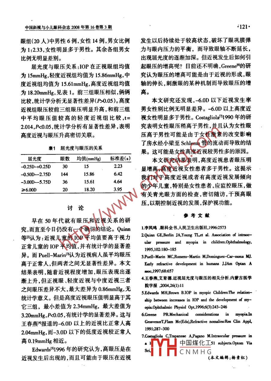 中國斜視與小兒眼科雜志2008年第16卷第3期眼壓與近視的相關(guān)分析李裕欽薛雨順車選義摘要目的探討眼內(nèi)壓與兒童青少年近視的關(guān)系。 方法選擇我院門診患者230人,年齡8~18歲。按屈光程度不同分為正視眼組(-0.25D- +0.25D),輕度近視組(-0.50D~- -2.75D),中度近視組(-3.00D~- -5.75D ), 高度近視組(≥6.0OD)四組,分別檢測眼壓、屈光度,分析比較其差別。結(jié)果高度近視組眼壓明顯高于其它三組,P<0.05,有統(tǒng)計(jì)學(xué)差異;其余三組眼壓相類似,無統(tǒng)計(jì)學(xué)差異。高度近視組女性患者多于男性,其余三組無明顯差別。結(jié)論青少年高度近視患者眼壓明顯增高,對于高度近視及有高度近視發(fā)展傾向的青少年應(yīng)監(jiān)控眼壓,千預(yù)高眼壓,以控制近視發(fā)展,保護(hù)視功能。關(guān)鍵詞眼壓近視Correlative analysis of intraocular pressure (IOP) and myopia. Li Yu-qin, Xue Yu- shun ,Che Xuan-yiDepartment of Ophthamology, Shanxi Provincial People 's Hospital, Xi'an 710068ABSTRACT Objective To study the relationship of intraocular pressure (I0P)and myopia in children andteen-agers. Methods 230 patients ranged from 8 to 18 years old were divided into four groups: emmetropia(-0.25D~+0.25D),low myopia(- -0.50D~- _2.75D ),medium myopia(-3.00D--5.75D ), severe myopia(≥6.0OD). The IOPand diopter were tested and satistically analyzed. Results 1.That the I0P of severe myopia is the highest, and ithas a significant diference between the severe myopia and the other three groups .2.The number of female is morethan male in severe myopia. Conclusions The IOP is obviously high in severe myopia It is necessary that theI0P of severe myopia was checked regularly and dropped down .Key words' intraocular pressure(IOP) myopia青少年近視發(fā)生與發(fā)展的原因,有很多因視組(≥6.0D)"。素。在臨床實(shí)踐中發(fā)現(xiàn)近視病人有眼壓偏高現(xiàn)檢查方法統(tǒng)- -取右眼作為研究對象。首象,尤其是高度近視病人。本文選擇8~18歲的先在自然狀態(tài)下,采用日本TOPCON CT- -80非兒童青少年作為研究對象,觀察眼壓( intraocu-接觸自動(dòng)眼壓儀測量眼壓(單位:mmHg),3次|lar pressure, I0P)與近視程度之間的關(guān)系,結(jié)果眼,取平均值。然后,滴6次復(fù)方托吡卡胺麻痹報(bào)告如下。睫狀肌,每次間隔5分鐘,最后一次滴完30分鐘后,采用日本TOPCON KR -8100PA電腦驗(yàn)對象與方法光儀連續(xù)3次測定眼屈光度,取平均值。研究對象選擇我院 2005年1月~-2006統(tǒng)計(jì)方法采用 SPSS11.0軟件將本文數(shù)年6月門診就診患者230人,年齡8~18歲,≤據(jù)進(jìn)行統(tǒng)計(jì),t檢驗(yàn),P<0.05為差異有顯著性。12歲108人,>12歲122人。男性:105人,女性.結(jié)果125人,男女比例為1:1.19。分組:根據(jù)屈光狀態(tài)的不同,把患者分為四組,分別為:正視眼組少年中,男性105(- -0.25D ~+0.25D),輕度近視組(-0.50D~-人中國煤化工1.19,高度近視2.75D),中度近視組(- 3.00D~- 5.75D ), 高度近fYHCNMHG作者單位:710068陜西省人民醫(yī)院眼科中國斜視與小兒眼科雜志2008年第16卷第3期*121.眼組(20人)中男性6例,女性14例,男女比例發(fā)生以后持續(xù)處于較高狀態(tài),破壞了眼鞏膜彈為1:2.33,女性明顯多于男性。其余各組男女力與眼內(nèi)壓力的平衡,而導(dǎo)致眼軸不斷延長,比例無明顯差別。出現(xiàn)屈光度的逐漸加深。但近視發(fā)生后如何引屈光度與眼壓關(guān)系:I0P在正視眼組均值起眼壓的增高呢?目前還不明確, Greenel的研為15mmHg,輕度近視組均值為15.86mmHg,中究認(rèn)為眼壓的增高可能是由于近視的形成,眼度近視組均值為15.61mmHg,高度近視組均值軸的伸長,刺激眼的某種機(jī)制而導(dǎo)致眼壓的增為18.20mmHg,見表1。前三組眼壓相似,倆倆高。比較,統(tǒng)計(jì)學(xué)分析無顯著性差異(P>0.05)。高度本文研究還發(fā)現(xiàn), -6.0D以下近視發(fā)生率近視組眼壓較前三組眼壓明顯升高,和前三組男女性別比例無明顯差異。- 6.0D以上高度近中平均眼壓值較高的輕度近視組比較,t=視女性明顯多于男性。Costagliola"1990 年的研2.014,P<0.05,統(tǒng)計(jì)學(xué)分析有顯著性差異,表明究表明女性眼壓稍高于男性,并且認(rèn)為女性眼高度近視與眼壓升高密切關(guān)聯(lián)。壓高于男性可能是由于女性激素的改變影響了房水經(jīng)小梁至Schlemn管的流動(dòng)而導(dǎo)致的結(jié)表1 屈光度與眼壓的關(guān)系果。這可能是女性高度近視較男性多的原因。屈光度眼數(shù)均值(mmHg)標(biāo)準(zhǔn)差()本文研究結(jié)果表明,高度近視患者眼壓明-0.25D~+0.25D30l52.23顯增高,高度近視女性患者多于男性。這提示-0.50D~ -2.75D4415.866.42我們對于高度近視或者有高度近視發(fā)展傾向-3.00D-- -5.75D3615.61 .4.64的少年兒童,特別是女性患者,應(yīng)監(jiān)控眼壓,做≥6.0D2018.203.95有關(guān)青光眼方面的檢查,密切隨訪,干預(yù)高眼壓,以期控制近視的發(fā)展,保護(hù)視功能。討論參考文獻(xiàn)早在50年代就有眼壓和近視關(guān)系的研究,而直至今日仍沒有一個(gè)確切的結(jié)論。Quinn1.李鳳鳴.眼科全書.人民衛(wèi)生出版社,1996:2573等認(rèn)為:近視兒童的IOP平均值要高于視力2.Quinn GE,Berlin JA,Young TL,et al. Association of intraoc-ular pressure and myopia in children.Ophthalmology,正常兒童的I0P平均值,并有統(tǒng)計(jì)學(xué)的顯著差1995,102:180-185異。而Puell- Marn'認(rèn)為近視病人雖平均眼壓3.ell-Marin MC,Romero -Martin M,Dominguez -Car -mona MJ.高于正常