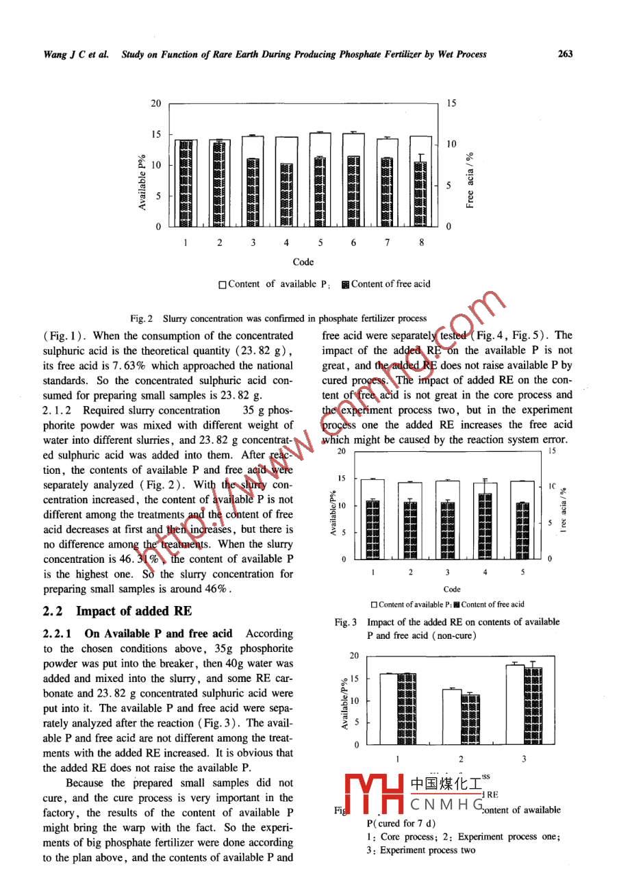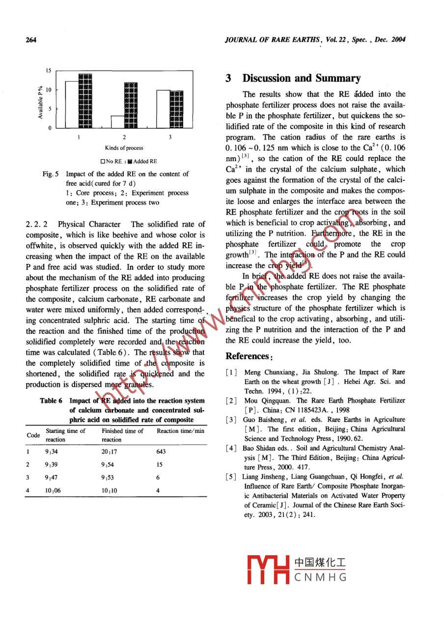 JOURNAL OF RARE EARTHSVol. 22, Spec. , Dec, 2004, p. 261Study on Function of Rare Earth During Producing PhosphateFertilizer by Wet Process*Wang Jiachen( 王甲辰)',Liu Xiangsheng(劉向生), Yang Jun(楊軍), Fan Yubin(樊玉斌), Wu Yanping(伍艷平)( Bejing General Research Instiutes for Nonferrous Metals, 100088 Beijing,China National Rare Earth Centerfor Agriculture of China, 100088 Bejing, China; Grirem Advanced Materials Co.,Ltd. Bejing 100088, Chi-na)Abstract: The impacts of the Rare Earth (RE) on the contents of available Phosphorus (P) and the physical characterof the calcium superphosphate produced by the wet process on the basis of simulating the consumption of concentratedsulphuric acid, the slury concentration and the cure conditions in different wet process were studied in laboratory, andthe results show that adding RE into different wet process does not raise available P, but changes its physical character,for example, the composite is loose and the color is offwhite.Key words: rare earth phosphate fertilizer, wet process , physical characteristics, available PCLC number: 0614.3Document Code: AArticle ID:1002 -0721(2004) -0261 -04A lot of researches showed that RE phosphate1.2 Methodsfertilizer could improve crop's ability in resisting saline-alkali , increase the yield and improve the quality1.2.1 Non-cure Process and cure processTheof the crops; and the RE phosphate fertilizer showednon-cure process was that mix proper phosphoriteremarkable impact of increasing the yield of crop,powder with water into slurry and add some concen-such as wheat, paddy rice, soybean, sorghum, cot-trated sulphuric acid. Mix them, and react for aboutton, sunflower and potato-s ; furthermore, it had30 min, then put them in a place and dry in the air.good impact on amending soil and ameliorating sa-The cure process was that mix proper phosphoriteline- alkali soil. At present, it has been applied in 13powder with water into slurry, adding some concen-provinces and 214 counties, the total application areatrutd sulphuric acid and reacted in half an hour, thenwere more than 20 thousand hectares, and obtainedkeeping them at 50 C for 7 d( complement arity Wa-very good impact for crop yieldl2). In 2002, it hadter every 12 h) and dried them in the air.been listed in the important task of national “ Tenth-1.2.2 Experiment plans(1) In order to testFive- Year-plan". However, the mechanism of REthe proper concentrated sulphuric acid consumed induring producing calcium superphosphate has notthe process, the treatments are listed in Table 1.been reported, and this study would be good to re-veal the mechanism of the increasing crop yield andTable 1 Make sure of proper consumption of concentrat-resisting salt of RE phosphate fertilizer and offer theed sulphuric acidtheoretical base for reconstructing the traditionalPhosphoriteConcentratedWater/gphosphate fertilizer industry and large area extension.Codepowder/gsulpburic acid/g.1 Materials and Methods529. 7869.493528. 5866.6927.3963.921.1 Materials26. 2061.14Phosphorite powder ( Offered by Guanghan cit-23. 8255. 58y, Sichuan province), RE carbonate ( 65% REO),21. 44.50. 22Concentrated sulphuric acid(98% ), Calcium carbon-20.5247.24ate and Distilled water.中國(guó)煤化工_44. 46MHCNMHG。Received date: 2004 -09 - 10; revised date: 2004-10- 15Foundation item: Project supponted by National Important Tackling Research Foundation of China (2002BA315A-7)Biography: Wang Jiachen ( 1965 - ), Male, Doctor; Major in: plant nutrition and RE aplication for agriculture* Corresponding author( E - mail: nhwjc@ tom. com)262JOURNAL OF RARE EARTHS, Vol.22, Spec.,Dec. 2004(2) In order to test proper slurry concentration(4) Impact of added RE on calcium sulphatein phosphate fertilizer process, the treatments are lis-physical charactersted in Table 2.Because a lot of calcium sulphate was producedduring the phosphate fertilizer production, the RETable 2 Make sure of proper slurry concentrationfunction in the process was simulated by adding theCode Phosphorite ConcentrWater/gSlurrysame quantity of RE into the reaction of the calciumpowder/gatedconcentrcarbonate and concentrated sulphuric acid. The ex-sulphurieacid/gation/gperment included 4 treatments was done as follows:3:23. 8265.5823:55.58 .38.64Table 5 Impact of RE on calcium sulphate solifyingtime23.8250. 5840.90Code CalciunConcentrRE45.5843.44Carbonate/gatsulphuriccarbon23.82 .40.58 .46.31ate/g23.82.35.5849. 599.813. 8830.5853. 372100.0225. 5857.770.0410.08(3) In order to confirm the impact of added REon available P and free acid, the follow experiments1.2. 3 Measurements The measurements of the a-were done: The experiment of preparing small phos-vailable P and the free acid in the phosphate fertilizerphate fertilizer samples( non - cure) included 5 treat-were quinoline phosphomolybdate gravimetric methodments as Table 3. The experiment of preparing bigand capacity method4!.phosphate fertilizer samples ( cure) included 6 treat-2 Results and Analysisments are listed in Table 4.2. 1 Process conditionsTable 3 Prepare small phosphate fertilizer samples( non -2.1.1 Consumption of concentrated sulphuric acidCode Phospho Concentrat Water/g RPhosphateWith consumption of concentrated sulphuric acidriteexfertilizerincreased gradually and the concentration of sulphuricRE contenv/(% ,REO)acid kept at 30% among the treatments , the acid solu-5tion prepared was added into the 35 g phosphorite3500.090.1powder and the contents of available P and free acid100.170.2were separately analyzed after reaction. Results show0.260.3that the content of free acid decreases, but the con-23. 82.400.43 .0.5tent of available P does not change among the former5 treatments, and then decreases with the consump-Table 4 Preparing big phosphate fertilizer samples( cure)tion of the concentrated sulphuric acid being reducedCode Phosphor- Concentr Water/g RProcess .20n 20itcarbonate/gpowder/g,191:179.0107.2225(179.21. 22Core .影325(145. 0.285. 5Experiment中