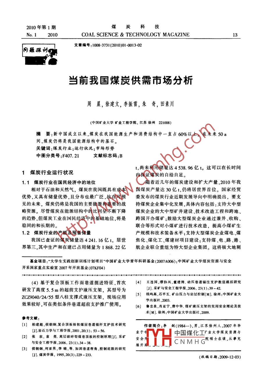 2010年第1期炭科技No. 12010COAL SCIENCE & TECHNOLOGY MAGAZINE13文章編號: 1008 -3731 (2010)01-0013-02向題探劉當前我國煤炭供需市場分析周晨,徐建文,李振雷,朱奇,田素川(中國礦業(yè)大學礦業(yè)工程學院,江蘇徐州221008)商要:新中國成立以來,煤炭在我國能源生產(chǎn)和消費結構中一直占60%以上。在未來50a間,煤炭仍將是我國能源結構中的基石。關鍵詞:煤炭行業(yè);運行狀況;市場形勢中圖分類號:F407.21文獻標志碼:B .t,尚未利用儲量達4538.96億t。這可以在長時間1煤炭行 業(yè)運行狀況內保證煤炭的自給自足。1.1煤炭行業(yè)在國民經(jīng)濟中的地位隨著近幾年的煤炭建設和擴大產(chǎn)量,2010年我相對于石油和天然氣,煤炭在我國既具有成本國煤炭產(chǎn)量達30億t,仍將居世界首位。國家經(jīng)貿優(yōu)勢,又具有儲量優(yōu)勢,且分布也最廣泛,故在可預委發(fā)布的煤炭行業(yè)近期發(fā)展導向中明確提出,要支見的未來,煤炭仍將是我國的主要能源和重要的戰(zhàn)持煤炭企業(yè)集中化發(fā)展,具體內容包括:支持大中型略資源。盡管煤炭在能源結構中的比列呈不斷下降煤炭企業(yè)的大中型礦井建設技術改造工程和跨地、的趨勢,但煤炭工業(yè)在國民經(jīng)濟中的基礎地位,將是跨國開辦煤礦;鼓勵大型煤炭企業(yè)通過兼并收購、穩(wěn)周的和長期的。聯(lián)合等形式對小煤礦進行技術改造,提高小煤礦生1.2煤炭行業(yè)的產(chǎn) 能及預備儲量產(chǎn)規(guī)模和技術裝備水平;支持大型煤炭企業(yè)煤電、煤我國已查證的煤炭儲量達4241. 16億t,居世焦化煤化工、煤建材項目建設;支持煤、電、路、港、界第三,其中生產(chǎn)和在建已占用儲量為1 868. 22億航企業(yè)聯(lián)合重組為特大型企業(yè)集團。這將極大地刺基金項目:“大學生實踐創(chuàng)新訓練計劃項月”中國礦業(yè)大學青年科研基金(2007A006);中國礦業(yè)大學煤炭資源與安全開采國家重點實驗室2007年開放基金(07KF04)中000000000000000100●00 *00#00 0000000100# 6* 000000 +00000號00口0000.000040000(4)基于復合頂板工作面巷道掘進特征,首次[4]王連國,繆協(xié)興, 董建鑄.動壓巷道錨注支護數(shù)值模擬研究.研發(fā)了高度5.5 m的超前支護液壓支架,其型號為[J].采礦與安全工程學報,2006, 23(1):39-42.ZCZ9040/24/55型八柱支撐式液壓支架,現(xiàn)場應用5] 錢鳴高,石平五.礦山壓力與巖層控制[M].徐州:中國礦業(yè)大學出版社,2003.效果較好,可在類似條件巷道超前支護推廣使用。[6] 魯忠良,肖亞寧,唐中華。煤礦液壓支架的實用安全理論及技術[M].徐州:中國礦業(yè)大學出版社,2009.參考文獻:1] 柏建彪.侯朝炯.復合頂板極軟煤層巷道錨桿支護技術研究作者簡介:事劍(1984- -),男,江蘇徐 州人,2007年畢[].巖石力學與工程學報2001 ,20(1); 53 -56.業(yè)于1中國煤化工業(yè)大學煤炭資源與.[2] 張農,袁亮.離層破碎型煤巷頂板的控制原理[J].采礦安全開二院碩士在讀,從事充與安全T.程學報.2006. 23(1):34-38.CNMHG[3] 侯朝炯,何亞男,李曉,等.加固巷道幫角、控制底鼓的研究[J].煤炭學報, 1995 ,20(3):229 - 233.(收稿日期:2009-12-03)14煤炭科技2010年第1期激煤炭行業(yè)的發(fā)展及產(chǎn)能的補充。根據(jù)當前煤炭市勢。煤炭進口量快速增長,上半年煤炭進口4827萬場的情況國家可抓住有利時機,進- - 步推進煤炭資t,同比增長1. 26倍;其中,6月進口量達到1607萬.源整合、企業(yè)兼并重組,促進媒炭行業(yè)的優(yōu)勝劣汰,t的歷史高位是2008年同月進口量的5倍多。煤減少和消除落后的煤炭生產(chǎn)能力,加快煤炭大基地、炭出口量大幅萎縮,1~6月累計出口煤炭已連續(xù)5企業(yè)大集團的建設步伐。個月出現(xiàn)單月凈進口的局面,1-6月累計煤炭凈進2煤炭市場形勢口3 660萬t。而我國政府的政策與干預也將對市場中國國內能源資源稟賦決定了中國以煤為主的有重大影響。還有.根據(jù)國務院發(fā)改委、財政部有關.能源消費結構,其中.第二產(chǎn)業(yè)煤炭消費量占90%,文件的精神,按照完善市場經(jīng)濟體制的要求,煤炭資第一產(chǎn)業(yè)與第三產(chǎn)業(yè)煤炭消費量占煤炭消費總量的源有償占用的市場化改革將進-一步深化,由目前的10%左右。煤炭的消費量在能源消費總量中從1978按煤炭的開采數(shù)量收取資源費,改按照煤炭資源的年到2004年的27a間消費比例都維持在65%以質量好壞、價格高低的不同征收煤炭資源稅。按煤炭上,這是我國能源消費結構的主要特點之一- ,煤炭消銷售價格征收資源稅,更能公平合理地體現(xiàn)煤炭資費量在較長時間里仍將維持在-一個較高水平。煤炭源的價值,因此這- -征收辦法將會落實隨著煤炭資市場的景氣程度主要取決于我國工業(yè)生產(chǎn)的增加源稅征收辦法的改進,煤炭生產(chǎn)成本將有較大幅度值,特別是電力冶金、建材和化工四大主要耗煤工的提高。2007年,我國取消延續(xù)了50多年的由政府業(yè)產(chǎn)品產(chǎn)量的持續(xù)增長。其中,電力用煤在煤炭消費組織產(chǎn)運需企業(yè)召開訂貨會的做法,由供需雙方企中的地位最為重要,其消耗量約占全國煤炭消耗量業(yè)根據(jù)市場供求關系自主銜接資源協(xié)商定價。在這的61%。鋼鐵行業(yè)為煤炭消費的第二大戶,其煉焦樣的背景下,供求關系成為煤價走勢的主要決定因煤用煤約占煤炭消費的30%。因而,可以說我國煤素。目前,我國重點電煤合