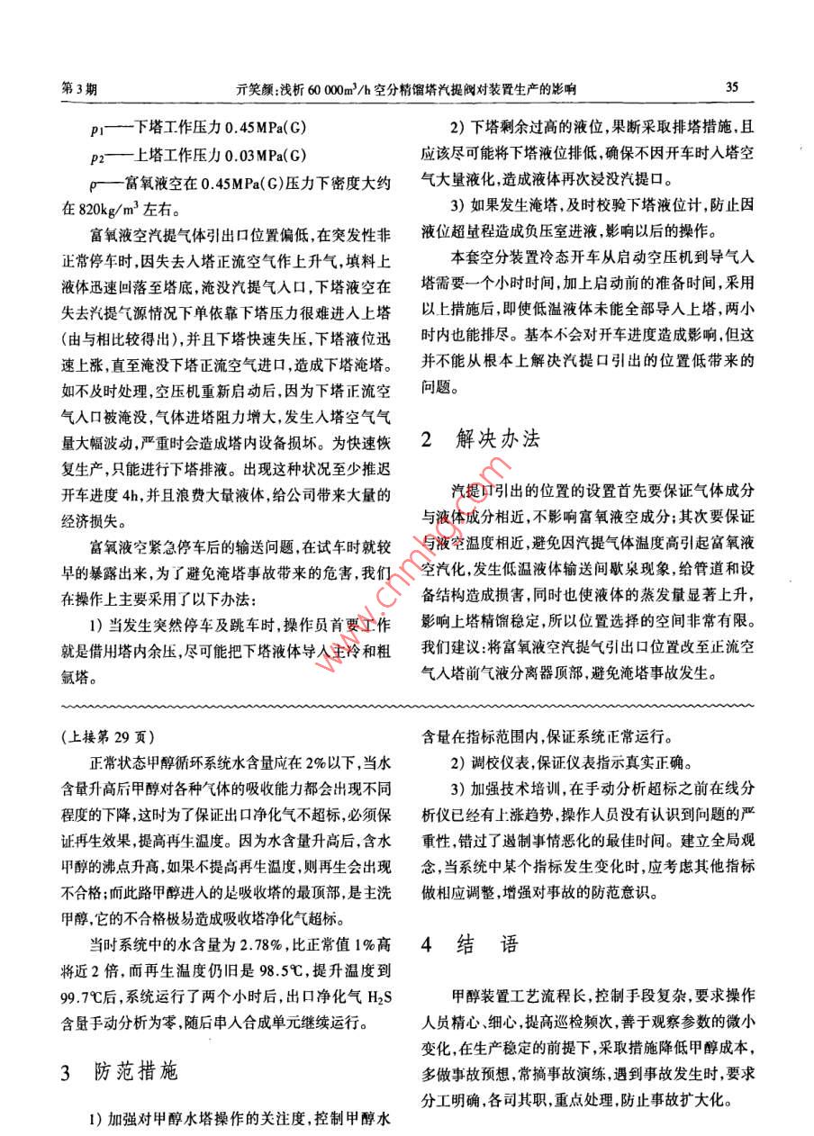 第35卷第3期化工設(shè)計(jì)通訊Vol 35 No. 32009年9月Chemical Engineering Design Communications淺析60000m3/h空分精餾塔汽提閥對裝置生產(chǎn)的影響亓笑顏(兗礦國泰化L有限公司,山東滕州277527)摘要;討論了精餾系統(tǒng)低濕液體輸送問題,分析了兗礦國泰化工有限公司60000m3(標(biāo))/h空分裝置在非正常停車時(shí)竄氧液空輸送所存在的問題;并提出解決辦法關(guān)鍵詞:空分;低溫液體;富氧液空;汽提中圖分類號:TQ113.26+43文獻(xiàn)標(biāo)識碼:A文章編號:100-6490(200)09-004-02由法液空公司設(shè)計(jì),采用汽輪機(jī)一拖二、立式雙床層0引言徑向流分子篩吸附器、液氧內(nèi)壓縮流程、全塔規(guī)整填隨著空分設(shè)計(jì)和制造工藝的不斷變革,單套空分料,主要產(chǎn)品為50000m3(標(biāo))/h高壓氧氣、5200(標(biāo))/h低壓氧氣、5000m3(標(biāo))h中壓氮?dú)狻?8000裝置生產(chǎn)能力更大更安全更節(jié)能產(chǎn)品提取率也更m2(標(biāo))/h低壓氮?dú)?還有液氧液氬液氮等液體產(chǎn)高,但伴隨生產(chǎn)能力擴(kuò)大而來的是精餾塔越來越高,品。自2005年投產(chǎn)至今,精餾系統(tǒng)液體輸送整體運(yùn)各塔之間低溫液體物料輸選難度越來越大,為了級解行情況穩(wěn)定能滿足正常生產(chǎn)需要。但因其富氧液空低溫液體輸送問題,低溫液體汽提輸送技術(shù)越來越多的汽提氣體引出口位置偏低,曾經(jīng)引起兩次下塔淹塔的被采用。該技術(shù)具有設(shè)備簡單可靠、投資少、節(jié)能、事故。便于操作等優(yōu)點(diǎn)精餾塔各數(shù)據(jù)如下:全塔高66m,下塔高度16m,低溫液體汽提輸送要滿足三個(gè)要求:一是必須有富氧液空上下塔進(jìn)出冂位差54m,為了便于富氧液空足夠長度的垂直管路作為提升管;二是低溫液體節(jié)流輸送調(diào)節(jié)閥門Lv160設(shè)置較低,液休在輸送直管后壓力能轉(zhuǎn)化成速度能,節(jié)流閥前后的管道管徑變化可以保證低溫液體狀得足夠的動力,并控制低溫2△。下塔塔徑400m,汽提口高度09m,液液體流速,三是汽提閥提供與低溫液體的溫度和組分1.1m,滿負(fù)荷時(shí)富氧液空流量600標(biāo)6)0.下塔搭相近的氣體通入提升管。低溫液體與汽提氣在節(jié)流液位控制0.3m。上塔工作壓力0030MPa(G),下塔閥后的提升管內(nèi)汽液混合,“密度降低。根據(jù)連通管工作壓力0.45MPa(G)。富氧液空在045MPa(G)壓原理,在上下塔壓差不變的情況下,提升管內(nèi)“低密度力下密度大約在820kg/m3左右。液體”將升的更高gh=820kg/m32×0.98×54m=0.43MPa1存在問題P△=P!-P2=0.45MPa-0.03MPa=0.42MPaP0富氧液空上下塔進(jìn)出口位差間靜壓;兗礦國泰化工有限公司60000m3/h空分裝置,p△—上下塔之間壓差收稿日期:2009-03-25作者簡介:亓笑顏(1981.11-),男黑龍江哈爾濱人本科學(xué)歷兗礦國泰化工有限公司空分車間工藝技術(shù)員。Emal: tujiameimer@163.om第亓笑顏淺析600003h空分精餾塔汽提閥對裝置生產(chǎn)的影響P下塔工作壓力045MPa(C)2)下塔剩余過高的液位,果斷采取排塔措施,且P2上塔工作壓力003MPa(G)應(yīng)該盡可能將下塔液位排低,確保不因開車時(shí)入塔空p富氧液空在045MPa(G)壓力下密度大約氣大量液化,造成液體再次浸沒汽提口。在820kg/m3左右。3)如果發(fā)生淹塔,及時(shí)校驗(yàn)下塔液位計(jì),防止因富氧液空汽提氣體引出口位置偏低,在突發(fā)性非液位超量程造成負(fù)壓室進(jìn)液,影響以后的操作。正常停車時(shí),因失去入塔正流空氣作上升氣,填料上本套空分裝置冷態(tài)開車從啟動空壓機(jī)到導(dǎo)氣人液體迅速回落至塔底淹沒汽提氣入口,下塔液空在塔需要一個(gè)小時(shí)時(shí)間加上啟動前的準(zhǔn)備時(shí)間,采用失去汽提氣源情況下單依靠下塔壓力很難進(jìn)入上塔以上措施后,即使低溫液體未能全部導(dǎo)人上塔兩小(由與相比較得出),并且下塔快速失壓,下塔液位迅時(shí)內(nèi)也能排盡。基本不會對開車進(jìn)度造成影響但這速上漲,直至淹沒下塔正流空氣進(jìn)口,造成下塔淹塔。并不能從根本上解決汽提口引出的位置低帶來的如不及時(shí)處理,空壓機(jī)重新啟動后,因?yàn)橄滤骺諉栴}。氣入口被淹沒,氣體進(jìn)塔阻力增大,發(fā)生入塔空氣氣量大幅波動,嚴(yán)重時(shí)會造成塔內(nèi)設(shè)備損壞。為快速恢2解決辦法復(fù)生產(chǎn),只能進(jìn)行下塔排液。出現(xiàn)這種狀況至少推遲開車進(jìn)度4h,并且浪費(fèi)大量液體,給公司帶來大量的汽提口引出的位置的設(shè)置首先要保證氣體成分經(jīng)濟(jì)損失。與液體成分相近,不影響富氧液空成分;其次要保證富氧液空緊急停車后的輸送問題,在試車時(shí)就較與液空溫度相近避免因汽提氣體溫度高引起富氧液早的暴露出來為了避免淹塔事故帶來的危害,我們空汽化發(fā)生低溫液體輸送間歇泉現(xiàn)象給管道和設(shè)在操作上主要采用了以下辦法:備結(jié)構(gòu)造成損害,同時(shí)也使液體的蒸發(fā)量顯著上升,1)當(dāng)發(fā)生突然停車及跳車時(shí)操作員首要工作影響上塔精餾穩(wěn)定,所以位置選擇的空間非常有限。就是借用塔內(nèi)余壓,盡可能把下塔液體導(dǎo)入主冷和粗我們建議:將富氧液空汽提氣引出口位置改至正流空氬塔。氣入塔前氣液分離器頂部,避免淹塔事故發(fā)生。(上接第29頁含量在指標(biāo)范圍內(nèi)保證系統(tǒng)正常運(yùn)行。正常