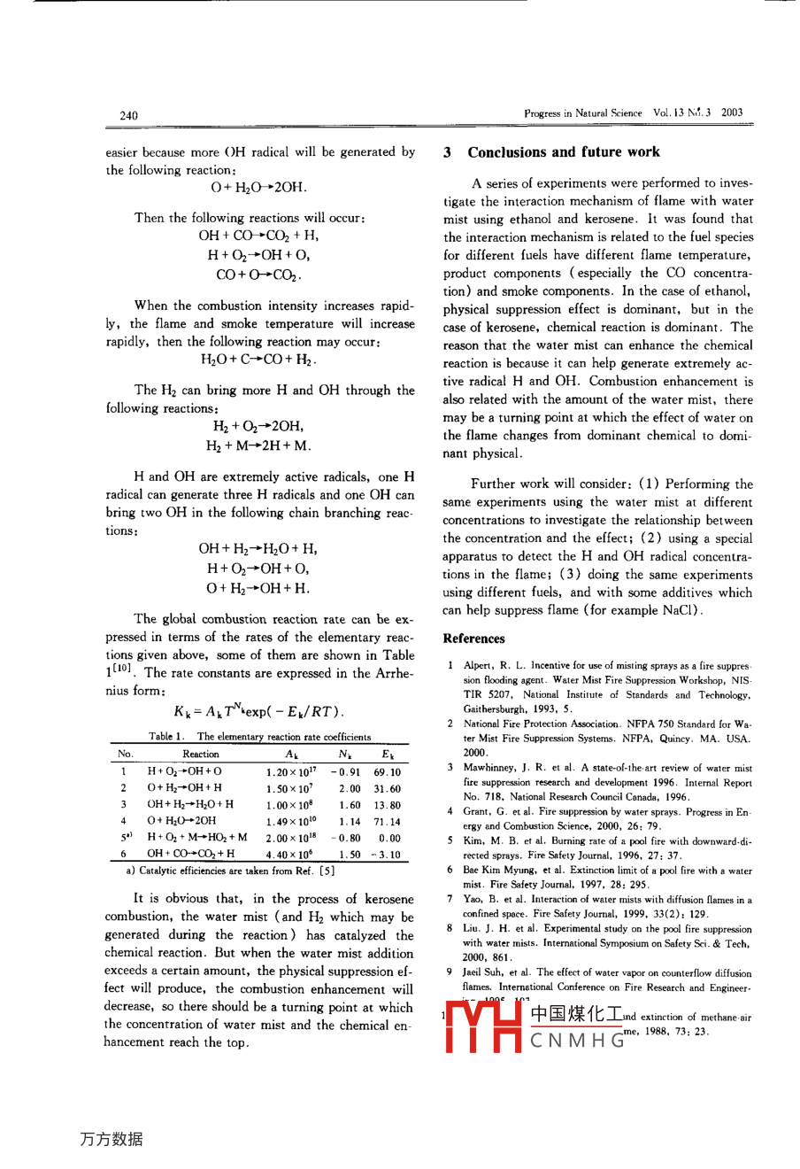 Vol. 13, No. 3. March 2003PROGRESS IN NATURAL SCIENCEPreliminary study on interaction of water mist with diffusion flameof liquid fuels”LIU Jjianghong", LIAO Guangxuan, LI Peide and YAO BinX9 A(State Key Laboratory of Fire Saley Science, Universily of Sciene and Technology of China, Hetei 230026. China)Reeived July 29, 2002; revised October 18, 2002AbstraetThe chetnical and physical interaction mechanisms of the water mist with dffusion flame of liquid fuels are ivestigatede.The dffererce of the thermograms and the thermal field isogroms between ethanol flame and kerosene flame with the water mist applica.tion is explained. With lhe waler mist ppliain, the diferece bewe ethanol and ketosene in heat release rate, O2 and co concentra-tions of their combustion products, and the termperature of their smoke are analyzed. At the same time. the interaction mechanism of thewater mist with diffusicon flame is presented and their relautionship to the fuel species and t the concentration of water mist is desribed.Keywords: water mist, difuson fame, lterncto mechanism.Since the first version of the Montreal Protocolmist is applied and it seems that this cannot be causedwas introduced in 1987, water mist for fire extin-only by physical effect. Some results suggest that theguishment and control have been widely recognized aschemical reactions are changed and enhanced withina halon 1301 replacement'. Water mist refers tothe flames by water vapor91. The present work is tofine water droplets in which 99% of the volume ofstudy the effect of water mist on suppressing or en-the spray is in drops with diameters less than 1000hancing the diffusive flames in confined space.micronss[21. Extinguishment mechanisms of watermist include thermal cooling, oxygen displacement,1Experimental apparatusfuel surface cooling and attenuation of radiative heatThe experimental apparatus is shown in Fig. 1.transfer. Factors that contribute to the success or fail-ure of a water mist system include droplet size, veloc-The fuel sample is contained in a circular stainlessity, spray pattern, momentum, geometry and othersteel pan with height of 10 mm and inner diameter ofcharacteristics of the protected area and the type of150 mm. The pool was mounted on a steel stand 600fuel3]. So it is very important to study the interac-mm above the ground to minimize the effect of sur-tionof water mist with flames. Most of flames arerounding ground surfaces on the behavior of the fire.diffusive and occur in confined space with proper ven-A downward-directed pressure nozzle was positionedtilation control, and the fuel always varies. The studyon a square steel plate 300 mm over the fuel sample.of the interaction of water mist with a diffusive flameThe nozzle was operated at pressure of 0. 5 MPa,in the confined space will. enhance the knowledge ofwhich could be altered by adjusting the pressure regu-such processes and be useful for developing the waterlators to meet different requirements. The water mistmist fire suppression system, improving the fire sup-was injected into the pool fire downward directly, andpression and control efficiency and extending their ap-the relative flow rate was about 1.0 mL/s. The coneplications.angle of the nozzle was 60*,and the volume mean di-ameter off the mists was about 80 μm. During the ex-The interaction of water mist with a diffusiveperiment period, the TVS 2000ST infrared thermo-flame in confined space has been investigated in dif-gram system and a thermal video system were used toferent aspectsl4~ 8but the enhancement effect ofrecord the thermogram and visualize the thermal fieldwater mist on combustion in some cases is still notof the flame before and after the injection of waterunderstood. Some recent experiments show that themist respectively .flame by a certain kind of fuel will be enhanced to alarger scale and its temperature will rise when waterSome K-type thermal couples of 0.5 mm diame-中國煤化工●Supported by the Major State Basic Ressearch Develpment Program of China (200“W E-mail: lh@ustc. edu. cnYHCNMHGProgress n Natural Science Val. 13 No.3 2003238ter were arrayed alongthe centerline and radius toignition started, and the fire was allowed to burn forcalibrate the TVS apparatus. The radiant heat flux of100s to make quasi-steady burning before the spraythe flame with and without the application of waterinjection. All the raw data were saved and processedmist was also measured by a thermogauge. All of theautomatically by a computer.systems began to receive the data after the automaticNozleComputer工Camera headFlameProcessor一tDisk1Realtime displayand recordHigh pressure Water tanknitrogenFig. 1. Schematic of the experimental apratus.2 Results and discussion(c)) and thermal field isograms ((d), (e), (f)) of .the kerosene flame with water mist application. ItFig. 2 shows the thermograms ((a), (b) anddemonstrates that the kerosene flame is enhanced to a(c)) and thermal field isograms ((d), (e) and (1))larger scale and temperature rises at the beginning ofof the ethanol flame with and without the applicationthe injection of water mist, the high temperature areaof water mist. It is obvious that the flame was sup-doubled after 35s, even after 60 s, the flame struc-pressed to a smaller scale and the temperature loweredture remained and the combust intensity kept high.rapidly due to the application of water mist, and afterThese experiments suggest that water mist indeedabout 60 s,the temperature lowered to below thechanges the chemical reactions within the flames. Ibolling point, and then the fire was extinguishedcan also be explained by the experimental results ofquickly. This phenomenon might be caused by physi-who observed the heat release rate olcal suppression effect of water mist,and can be ex-kerosene, O2 and CO concentrations of kerosene com-plained by the experiments of Yao'. One of his exbustion products, and the temperature of smoke withperiments was conducted in the cone colorimeter w