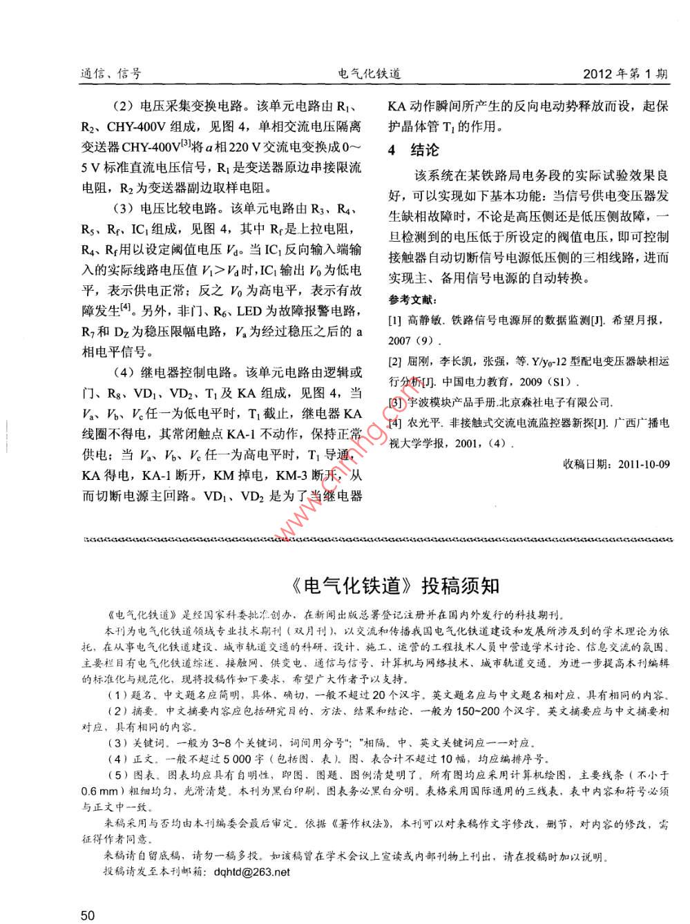 通信、信號(hào)電氣化鐵道2012年第1期(2)電壓采集變換電路。該單元電路由R1、KA動(dòng)作瞬間所產(chǎn)生的反向電動(dòng)勢(shì)釋放而設(shè),起保R2、CHY-400V 組成,見(jiàn)圖4,單相交流電壓隔離護(hù)晶體管T的作用。變送器CHY-400VB將a相220 V交流電變換成0~4結(jié)論5V標(biāo)準(zhǔn)直流電壓信號(hào),R:是變送器原邊串接限流該系統(tǒng)在某鐵路局電務(wù)段的實(shí)際試驗(yàn)效果良電阻,R2 為變送器副邊取樣電阻。(3)電壓比較電路。該單元電路由R3、R4、好,可以實(shí)現(xiàn)如下基本功能:當(dāng)信號(hào)供電變壓器發(fā)Rs、Rr、 IC,組成,見(jiàn)圖4,其中Rr是上拉電阻,生缺相故障時(shí),不論是高壓側(cè)還是低壓側(cè)故障,旦檢測(cè)到的電壓低于所設(shè)定的閥值電壓,即可控制R、Rq用以設(shè)定閾值電壓Vg。當(dāng)IC反向輸入端輸接觸器自動(dòng)切斷信號(hào)電源低壓側(cè)的三相線路,進(jìn)而入的實(shí)際線路電壓值Vi> Vg時(shí),IC輸出V為低電實(shí)現(xiàn)主、備用信號(hào)電源的自動(dòng)轉(zhuǎn)換。平,表示供電正常;反之V為高電平,表示有故參考文獻(xiàn):障發(fā)生刊。另外,非門、R6、LED為故障報(bào)警電路,[1]高靜敏.鐵路信號(hào)電源屏的數(shù)據(jù)監(jiān)測(cè)[D].希望月報(bào),R7和Dz為穩(wěn)壓限幅電路,Va 為經(jīng)過(guò)穩(wěn)壓之后的a2007 (9) .相電平信號(hào)。(4)繼電器控制電路。該單元電路由邏輯或[2]屈剛,李長(zhǎng)凱,張強(qiáng),等Y/yo-12型配電變壓器缺相運(yùn)門、Rg、VD1、VD2、Tr及KA組成,見(jiàn)圖4,當(dāng)行分析[J].中國(guó)電力教育,2009 (S1).V、b、V。任一 為低電平時(shí),Ti截止,繼電器KA[3]宇波模塊產(chǎn)品手冊(cè)北京森社電子有限公司.線圈不得電,其常閉觸點(diǎn)KA-1不動(dòng)作,保持正常[4]農(nóng)光平.非接觸式交流電流監(jiān)控器新探[D].廣西廣播電視大學(xué)學(xué)報(bào),2001, (4) .供電;當(dāng)V、%、V。任一為高電平時(shí),TI導(dǎo)通,收稿日期: 2011-10-09KA得電,KA-1 斷開(kāi),KM掉電,KM-3 斷開(kāi),從而切斷電源主回路。VD1. VD2是為了當(dāng)繼電器《電氣化鐵道》投稿須知《電氣化鐵道》是經(jīng)國(guó)家科委批準(zhǔn)創(chuàng)辦,在新聞出版總署登記注冊(cè)并在國(guó)內(nèi)外發(fā)行的科技期刊。本刊為電氣化鐵道領(lǐng)域?qū)I(yè)技術(shù)期刊(雙月刊),以交流和傳播我國(guó)電氣化鐵道建設(shè)和發(fā)展所涉及到的學(xué)術(shù)理論為依托,在從事電氣化鐵道建設(shè)、城市軌道交通的科研、設(shè)計(jì)、施工、運(yùn)營(yíng)的工程技術(shù)人員中營(yíng)造學(xué)術(shù)討論、信息交流的氛圍。主要欄目有電氣化鐵道綜述、接觸網(wǎng)、供變電、通信與信號(hào)、計(jì)算機(jī)與網(wǎng)絡(luò)技術(shù)、城市軌道交通。為進(jìn)一-步提高本刊編輯的標(biāo)準(zhǔn)化與規(guī)范化,現(xiàn)將投稿作如下要求,希望廣大作者予以支持。(1)題名。中文題名應(yīng)簡(jiǎn)明,具體、確切,一般不超過(guò)20個(gè)漢字。英文題名應(yīng)與中文題名相對(duì)應(yīng),具有相同的內(nèi)容。(2)摘要。中文摘要內(nèi)客應(yīng)包括研究目的、方法、結(jié)果和結(jié)論,一般為150-200個(gè)漢字。英文摘要應(yīng)與中文摘要相對(duì)應(yīng),具有相同的內(nèi)容。(3)關(guān)鍵詞。一般為3~8個(gè)關(guān)鍵詞,詞間用分號(hào)”; ”相隔。中、英文關(guān)鍵詞應(yīng)一一對(duì)應(yīng)。(4)正文。一般不超過(guò)5000字(包括圖、表)。圖、表合計(jì)不超過(guò)10幅,均應(yīng)編排序號(hào)。(5)圖表。圖表均應(yīng)具有自明性,即圖、圖題、圖例清楚明了。所有圖均應(yīng)采用計(jì)算機(jī)繪圖,主要線條(不小于0.6mm)粗細(xì)均勻,光滑清楚。本刊為黑白印刷,圖表務(wù)必黑白分明。表格采用國(guó)際通用的三線表,表中內(nèi)容和符號(hào)必須與正文中一致。來(lái)稿采用,與否均由本刊編委會(huì)最后審定。依據(jù)《著作權(quán)法》,本刊可以對(duì)來(lái)稿作文字修改,刪節(jié),對(duì)內(nèi)容的修改,需征得作者同意。來(lái)稿請(qǐng)自留底稿,請(qǐng)勿一稿多投。如該稿曾在學(xué)術(shù)會(huì)議上宣讀或內(nèi)部刊物上刊出,請(qǐng)?jiān)谕陡鍟r(shí)加以說(shuō)明。投稿請(qǐng)發(fā)至本刊郵箱: dqhtd@263.net50