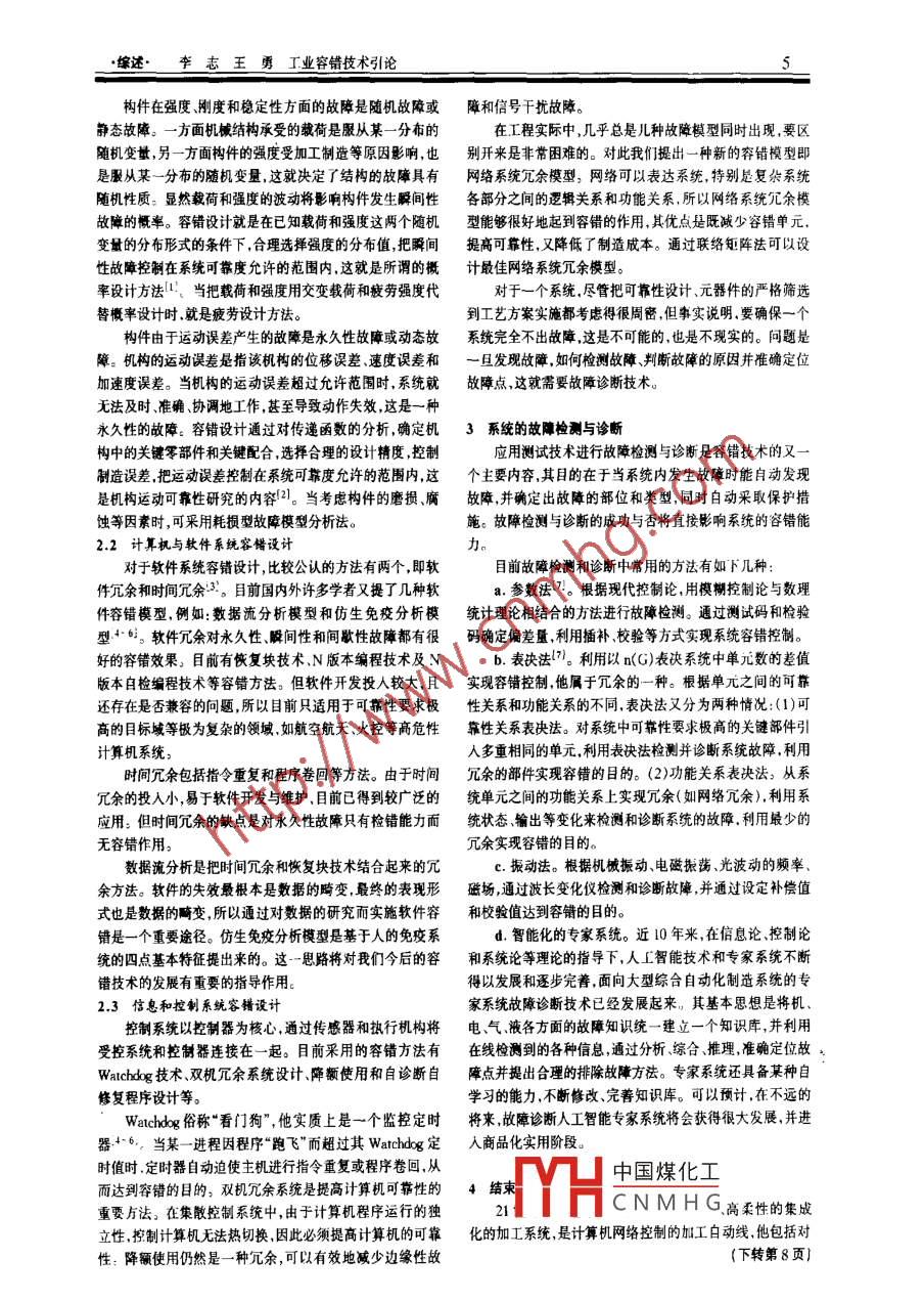 42002年1月機械設(shè)計與制造工程 第31卷第1期工業(yè)容錯技術(shù)引論李.志,王勇(渝州大學(xué)科研處.慶40033)摘要:容錯技術(shù)應(yīng)用非常廣泛,在相關(guān)理論的指導(dǎo)下,提出了工業(yè)客錯技術(shù)的基本概念,論述了常見的系統(tǒng)故障、典型的工業(yè)容錯設(shè)計方法和故障檢測手段,討論了工業(yè)容錯技術(shù)的應(yīng)用前景和發(fā)展方向。關(guān)鍵詞:工業(yè)系統(tǒng);容錯設(shè)計;故障診斷中圈分類號:1IP302.8文獻標(biāo)識碼:A文章編號:1007 - 9483(2002)01 -0004 - 02An Introduction to Fault - tolerant Technology for IndustryLI Zhi, WANG Yong(Yuzhou University, Chongqing, 40033,China)Astract: The use of fault - toerant tchnology is exensive usually. With the belp of relevant theory, the peper sets up a basicideaof fault - tolerant technology for industry, discuses a common systen failures. It givs the detail about a typical designmethod of faul - tolerant and inspetion, shows the prospects of this technology.Key words: Industry System;Fault - tulcrant Desig;Fault Iiagnosis容錯的基本思想是由馮.諾伊曼在1962年提出的。容免永久性瞬間性和間歇性故障的能力,稱為系統(tǒng)的容錯能錯技術(shù)能夠自動適時地監(jiān)測并診斷出系統(tǒng)的故障,然后采力。 當(dāng)用概率來度量這一能力時就是系統(tǒng)的容錯度。取相應(yīng)的故障控制或處理方法,自動修復(fù)或在線修復(fù)故障。容錯技術(shù)是可靠性理論的重要分支。系統(tǒng)的容錯度與隨著FMC.CIMC和FMS技術(shù)的迅猛發(fā)展,工業(yè)自動化、柔可靠度既有關(guān)聯(lián),又有區(qū)別。容錯度與可靠度-樣都是衡性化和集成化程度越來越高。為了有效地保證系統(tǒng)正常I量各種系統(tǒng)質(zhì)量好壞的重要指標(biāo).是對系統(tǒng)進行可靠性設(shè)作.就必須提高系統(tǒng)的可靠性。工業(yè)容錯設(shè)計是提高系統(tǒng)可計的重要依據(jù)。但是容錯度不能代替可靠度??煽慷仍诓豢啃缘闹匾緩剿灤┯谙到y(tǒng)的設(shè)計、實驗、生產(chǎn)和使用全同的規(guī)定條件下,有基本可靠度和任務(wù)可靠度之分:在一過程,他與系統(tǒng)整個壽命周期內(nèi)的全部可韓性活動有關(guān)。定條件下,系統(tǒng)的容錯度與任務(wù)可靠度存在-種函數(shù)關(guān)系。工業(yè)容錯技術(shù)包括系統(tǒng)的容錯設(shè)計和系統(tǒng)的故障診斷與檢1工業(yè)容錯技術(shù)基礎(chǔ)測等內(nèi)容,系統(tǒng)故障一般可以分為兩大類:-類是先天的固有故障,如元器件生產(chǎn)過程中造成的故障和線路與程序在設(shè)計2系統(tǒng)的容錯設(shè)計過程中產(chǎn)生的故障,這一-類故障需對其拆卸、更換或改正;當(dāng)系統(tǒng)設(shè)計過程中規(guī)定了可籍性指標(biāo)(如可靠度),并另一類故障是后天的永久性、瞬間性或間歇性故障,是由于按一定的方法把可靠性指標(biāo)分配給組成系統(tǒng)的分系統(tǒng)、設(shè)系統(tǒng)在運行過程中產(chǎn)生的缺陷所導(dǎo)致的,造成這-類故障備和元器件后,就需要研究實現(xiàn)這個可靠性指標(biāo)的可能性的原因很多.外部原因包括溫度、濕度、振動、沖擊、噪聲停及方法。系統(tǒng)的容錯設(shè)計就是對發(fā)生或可能發(fā)生故障的電等物理因素及操作人員過失等人為因素,內(nèi)部原因包括系統(tǒng)及其組成單元進行分析,鑒別其故障模式、故障原因或系統(tǒng)的偶然性故障和長時間使用后性能老化,以及經(jīng)過可故障機理,估計該故障模式對系統(tǒng)可能產(chǎn)生的影響,采取容靠性增長試驗仍未能發(fā)現(xiàn)的軟件和硬件缺陷等引起的故錯方法保證可靠性指標(biāo)分配。根據(jù)系統(tǒng)組成特點,系統(tǒng)故障。工業(yè)容錯技術(shù)主要針對系統(tǒng)可能出現(xiàn)的永久性、解間障可分為機械系統(tǒng)故障、軟件系統(tǒng)故障信息和控制系統(tǒng)故性和間歇性故障進行容錯設(shè)計、故障檢測與診斷以及故障障。決策。容錯設(shè)計的主要方法是系統(tǒng)冗余,但不同的故障形式工業(yè)容錯技術(shù)以控制論、模糊控制論、可靠性、概率論、必須采用不同的冗余方法。特別要指出,并不是所有的系系統(tǒng)論以及CIMS技術(shù)等理論為研兗基礎(chǔ);以自動化、柔性統(tǒng)故障都能用容錯技術(shù)加以解決,這也正是容錯技術(shù)不能化、集成化和信息化程度很高的大規(guī)模生產(chǎn)線加工中心為等同于可靠性理論的原因之一。下面分別就機械系統(tǒng)故研究對象;以設(shè)計制造和使用過程中經(jīng)濟損失最低為研究障、軟件系統(tǒng)故障信息和控制系統(tǒng)故障的容錯設(shè)計方法作目標(biāo)。系統(tǒng)在規(guī)定的使用壽命中,能夠檢測、診斷決策及避2.1機槭系統(tǒng)容鐠設(shè)計中國煤化工收稿日期:2001 -08 - 20作者簡介:李志(1965 - ).男.四川南充人,渝州大學(xué)副教授.碩+MYHC N M H G$術(shù)、CADCAPP/CAM等c_ .綜述 李志王勇工業(yè)容錯技術(shù)引論構(gòu)件在強度剛度和穩(wěn)定性方面的故障是隨機故障或障和信號干擾故障。靜態(tài)故障。一方面機械結(jié)構(gòu)承受的載荷是服從某一分布的在工程實際中,幾乎總是兒種故障模型同時出現(xiàn),要區(qū)隨機變量,另一方面構(gòu)件的強度受加工制造等原因影響,也別開來是非常困難的。對此我們提出一種新的容錯模型即