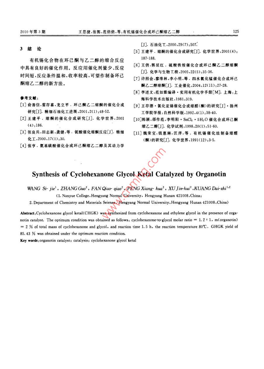 第31卷第3期衡陽(yáng)師范學(xué)院學(xué)報(bào) No. 3Vol. 312010年6月 Journal of Hengyang Normal University June.2010有機(jī)錫催化合成環(huán)己酮縮乙二醇王思捷1,張郭2,范俏俏2,彭湘華2,許金輝2,鄺代治12(1.衡陽(yáng)師范學(xué)院南岳學(xué)院,湖南衡陽(yáng)421008;2.衡陽(yáng)師范學(xué)院化學(xué)與材料科學(xué)系,湖南衡陽(yáng)421008)摘要:以環(huán)已烷為溶劑和帶水劑,有機(jī)錫為催化劑,催化合環(huán)己酮縮乙二醇。考察了各種因素對(duì)反應(yīng)的影響。實(shí)驗(yàn)確定了優(yōu)化反應(yīng)條件為:n(乙二醇):n(環(huán)已酮)=1:1.2,催化劑用量為2.0%(以環(huán)己酮和乙二醇總質(zhì)量計(jì)),反應(yīng)回流時(shí)間1.5h,反應(yīng)溫度80℃,其收率達(dá)85.43%關(guān)鍵詞:有機(jī)錫催化劑;催化合成;環(huán)己酮縮乙二醇中圖分類號(hào):O621.3文獻(xiàn)標(biāo)志碼:A文章編號(hào):1673-0313(2010)03-0122-040前言由于其結(jié)構(gòu)特點(diǎn)以及可以降解為無(wú)毒的無(wú)機(jī)錫化合物的優(yōu)點(diǎn),有望作為縮醛(酮)制備的催化劑。筆環(huán)己酮縮乙二醇又稱1,4-二氧雜螺[4,5]癸者以芐基錫化合物為催化劑,用環(huán)已烷作帶水劑,烷屬縮酮化合物,具有花木薄荷香味,其香味柔環(huán)已酮與乙二醇的縮合制備環(huán)己酮縮乙二醇,催化和,有較好的定香作用。也常用做有機(jī)合成的中劑用量少、反應(yīng)時(shí)間短、條件溫和、收率高,取得滿間體及反應(yīng)溶劑24。具有較廣泛的用途。環(huán)己酮意結(jié)果??s乙二醇的合成方法較多,一般在無(wú)機(jī)酸及其鹽、樹(shù)脂、有機(jī)酸、固體超強(qiáng)酸、雜多酸(鹽)以及分子篩1實(shí)驗(yàn)部分等催化劑作用下,由環(huán)己酮與乙二醇縮合而成81.1反應(yīng)方程式但傳統(tǒng)的合成方法往往伴隨脫水、氧化等副反應(yīng),環(huán)己酮與乙二醇的縮合反應(yīng),屬于1:1的反應(yīng)。導(dǎo)致產(chǎn)品中存在雜質(zhì)、色深,有異味,給精制帶來(lái)困 HO-CH2難。因此,人們?cè)诖呋钚愿?、環(huán)保型的催化劑方+一面做了大量的研究工作。王存德利用氯化亞錫催化合成環(huán)己酮縮乙二醇,韓穎等10報(bào)道五水氯化錫 +H2O催化合成縮酮類化合物。盡管他們都取得了較為滿意的結(jié)果,但后處理工藝較為復(fù)雜。魏榮寶等11.2儀器和試劑采用苯作帶水劑、二丁基二氯化錫作為催化劑合成儀器:FTIR-8700紅外光譜儀(4000~縮醛(酮),為縮酮的合成提供方法。有機(jī)錫化合物400cm,KBr壓片,日本島津公司); Bruker Av4400收稿日期:2010-03-06基金項(xiàng)目:湖南省科技計(jì)劃資助項(xiàng)目(2008FJ302;湖南省教育廳重點(diǎn)項(xiàng)目(06A009);湖南省高校“十一五”重點(diǎn)建設(shè)學(xué)科和重點(diǎn)實(shí)驗(yàn)資助項(xiàng)目作者簡(jiǎn)介:王思捷、張郭、范俏俏、彭湘華、許金輝均為007級(jí)在校生;鄺代治(1955-),男,湖南臨武人,教授,主要從事有機(jī)金屬化學(xué)研究2010年第3期王思捷,張郭范俏俏,等:有機(jī)錫催化合成環(huán)己酮縮乙二醇123核磁共振儀(TMS內(nèi)標(biāo),DCCl3溶劑,德國(guó)布魯克公司)。試劑:有機(jī)錫催化劑由本實(shí)驗(yàn)室自制(合成和表征另文報(bào)道)。其它試劑均為AR。1.3環(huán)己酮乙二醇縮酮的合成06050取環(huán)己酮、乙二醇反應(yīng)物總質(zhì)量2%的有機(jī)錫化合物作催化劑和分水劑于三頸反應(yīng)瓶中,分別安裝溫度計(jì)、攪拌器、分水器和回流冷凝管。加熱攪45拌反應(yīng)一定的時(shí)間,冷卻,放出分水器中的水層,將40反應(yīng)液和固體催化劑分離,加熱蒸餾,收集173~35182℃范圍內(nèi)的餾分為產(chǎn)品,為具有薄荷香氣的無(wú)0.8101216色透明液體,測(cè)折光率(1.4587)與文獻(xiàn)8值圖1反應(yīng)物物質(zhì)量比(n)對(duì)收率(y)的影響(1.4583)一致。紅外光譜數(shù)據(jù)為:2935.5cm和 Fig. The effect of ratio of n(eyclohexanone2864.1cm1為-CH2-的振動(dòng)吸收峰,1103.2cm為 to nlglycol)on the yield六元環(huán)縮酮的特征吸收峰,未出現(xiàn)羥基和羰基吸收的催化劑,恒溫?cái)嚢杌亓?0min后,分離產(chǎn)品。結(jié)1.59(10h,-(ch2)-)由iR和HNMR數(shù)據(jù)可峰,與環(huán)己酮乙二醇縮酮結(jié)構(gòu)相符合HNMR果見(jiàn)圖2(Cl3),8:3.938(4h,OC2CH2O),1.40970確認(rèn)產(chǎn)物為環(huán)己酮乙二醇縮酮。602結(jié)果和討論502.1不同帶水劑的影響實(shí)驗(yàn)表明,相同的反應(yīng)條件,不同的帶水劑對(duì)反應(yīng)收率影響較明顯,甲苯作帶水劑收率61.12%、00苯收率70.77%,環(huán)己烷收率80.56%??梢?jiàn)這三種帶水劑,環(huán)己烷作帶水劑反應(yīng)的收率最好。筆者實(shí)驗(yàn)以環(huán)己烷作帶水劑研究反應(yīng)條件。0.51.01.52.025301.01.52.2反應(yīng)物的物質(zhì)量比對(duì)收率的影響圖2催化劑的用量對(duì)收率的影響環(huán)己酮與乙二醇的縮合反應(yīng),屬于1:1的反 Fig. 2 The effect of catalyst amount on the yield應(yīng),為研究物質(zhì)量比的影響,取環(huán)己酮與乙二醇不在沒(méi)有催化劑的相同反應(yīng)條件下,收率僅為同的物質(zhì)量比(n)、加入各反應(yīng)組分總量2%的催化20.16%,當(dāng)加入有機(jī)錫化合物做催化劑,反應(yīng)收率劑和帶水劑,恒溫?cái)嚢杌亓?h,分離產(chǎn)品。反應(yīng)物有明顯提高,表明此有機(jī)錫對(duì)環(huán)己酮與乙二醇的縮物質(zhì)量比對(duì)收率的影