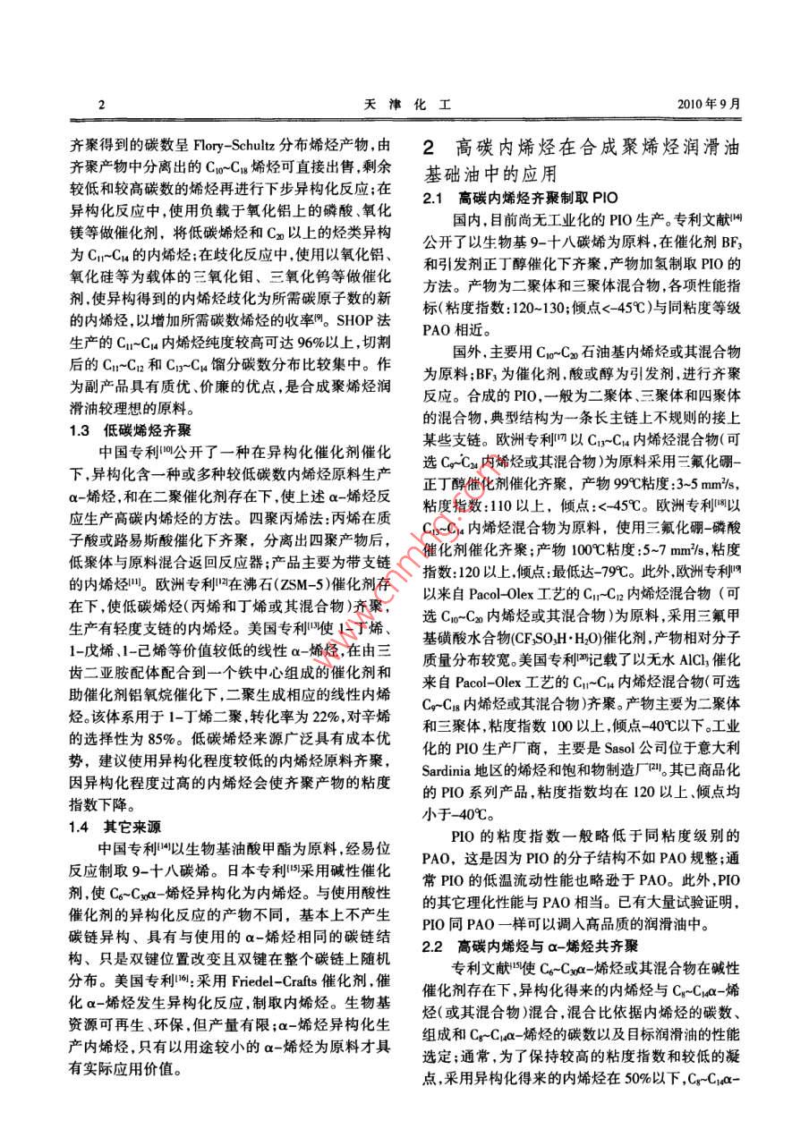 2010年9月天津化工2齊聚得到的碳數(shù)呈Flory- Schultz分布烯烴產(chǎn)物,由2高碳內烯烴在合成聚烯烴潤滑油齊聚產(chǎn)物中分離出的Cw-Cn烯烴可直接出售,剩余基礎油中的應用較低和較高碳數(shù)的烯烴再進行下步異構化反應;在2.1 高碳內烯烴齊聚制取PIO異構化反應中,使用負載于氧化鋁上的磷酸、氧化國內,目前尚無工業(yè)化的PI0生產(chǎn)。專利文獻網(wǎng)鎂等做催化劑,將低碳烯烴和Cx以上的烴類異構公開了以生物基9-十八碳烯為原料,在催化劑BF,為Cnr-Cu的內烯烴;在歧化反應中,使用以氧化鋁、和引發(fā)劑正丁醇催化下齊聚,產(chǎn)物加氫制取PIO的氧化硅等為載體的三氧化鉬、三氧化鎢等做催化方法。產(chǎn)物為二聚體和三聚體混合物,各項性能指劑,使異構得到的內烯烴歧化為所需碳原子數(shù)的新標(粘度指數(shù):120-130;傾點< 45C)與同粘度等級的內烯烴,以增加所需碳數(shù)烯烴的收率明。SHOP法PAO相近。生產(chǎn)的Cnr-Cu內烯烴純度較高可達96%以上,切制國外,主要用Cno~Cx石油基內烯烴或其混合物后的Cnm~Cn和Cg-Cu餾分碳數(shù)分布比較集中。作為原料;BF,為催化劑.酸或醇為引發(fā)劑,進行齊聚為副產(chǎn)品具有質優(yōu)、價廉的優(yōu)點,是合成聚烯烴潤反應。合成的PIO,-般為二聚體、三聚體和四聚體滑油較理想的原料。的混合物.典型結構為一條長主鏈上不規(guī)則的接上1.3低碳烯烴齊聚某些支鏈。歐洲專利叼以Crs-Cu內烯烴混合物(可中國專利公開了-種在異構化催化劑催化選CriCn內烯烴或其混合物)為原料采用三氟化硼-下,異構化含-種或多種較低碳數(shù)內烯烴原料生產(chǎn)正丁醇催化劑催化齊聚,產(chǎn)物99C粘度:3~5 mm/s,a-烯烴,和在二聚催化劑存在下,使上述a-烯烴反粘度指數(shù):110以上,傾點:< 45C。歐洲專利啊以.應生產(chǎn)高碳內烯烴的方法。四聚丙烯法:丙烯在質Crr-Cm內烯烴混合物為原料,使用三氟化硼-磷酸子酸或路易斯酸催化下齊聚,分離出四聚產(chǎn)物后,催化劑催化齊聚;產(chǎn)物100°粘度:5~7 mm/s,粘度低聚體與原料混合返回反應器;產(chǎn)品主要為帶支鏈指數(shù):120以上,傾點:最低達-79C。此外,歐洲專利明的內烯烴”。歐洲專利在沸石(ZSM-5)催化劑存以來自Pacol-0lex工藝的Cr Cn內烯烴混合物(可在下,使低碳烯烴(丙烯和丁烯或其混合物)齊聚,選Cn~C。內烯烴或其混合物)為原料,采用三氟甲生產(chǎn)有輕度支鏈的內烯烴。美國專利"使1-丁烯、基磺酸水合物(CFSOH+ HO)催化劑,產(chǎn)物相對分子1-戊烯.1-己烯等價值較低的線性a- -烯烴,在由三質 量分布較寬。美國專利記載了以無水AlCl催化齒二亞胺配體配合到一個鐵中心組成的催化劑和來自Pacol-Olex工藝的C-Cu內烯烴混合物(可選助催化劑鋁氧烷催化下,二聚生成相應的線性內烯CrCns內烯烴或其混合物)齊聚。產(chǎn)物主要為二聚體烴。該體系用于1-丁烯二聚,轉化率為22%,對辛烯和三聚體,粘度指數(shù) 100以上,傾點40以下。工業(yè)的選擇性為85%。低碳烯烴來源廣泛具有成本優(yōu)化的PIO生產(chǎn)廠商,主要是Sasol公司位于意大利勢,建議使用異構化程度較低的內烯烴原料齊聚,Sardinia 地區(qū)的烯烴和飽和物制造廠凹。其已商品化因異構化程度過高的內烯烴會使齊聚產(chǎn)物的粘度的PIO系列產(chǎn)品,粘度指數(shù)均在120以上傾點均指數(shù)下降。小于- 40C。1.4 其它來源PIO的粘度指數(shù)一般略低于同粘度級別的中國專利網(wǎng)以生物基油酸甲酯為原料,經(jīng)易位PAO,這是因為PIO的分子結構不如PAO規(guī)整;通反應制取9-十八碳烯。日本專利采用堿性催化常PIO的低溫流動性能也略遜于PAO。此外,PIO劑,使Co~Cxa-烯烴異構化為內烯烴。與使用酸性的其它理化性能與PAO相當。已有大量試驗證明,催化劑的異構化反應的產(chǎn)物不同,基本上不產(chǎn)生PIO同PAO - -樣可以調入高品質的潤滑油中。碳鏈異構、具有與使用的a-烯烴相同的碳鏈結2.2高碳內烯烴與 a-烯烴共齊聚構、只是雙鍵位置改變且雙鍵在整個碳鏈上隨機專利文獻"使Co~Cxax -烯烴或其混合物在堿性分布。美國專利1響:采用Friedel-Crafts催化劑,催催化劑存在下,異構化得來的內烯烴與Cr-Cna-烯化a-烯烴發(fā)生異構化反應,制取內烯烴。生物基烴(或其混合物)混合,混合比依據(jù)內烯烴的碳數(shù)、資源可再生.環(huán)保,但產(chǎn)量有限;a-烯烴異構化生組成和CrCua-烯烴的碳數(shù)以及目標潤滑油的性能產(chǎn)內烯烴,只有以用途較小的a-烯烴為原料才具選定;通常.為了保持較高的粘度指數(shù)和較低的凝有實際應用價值。.點,采用異構化得來的內烯烴在50%以下,CrCia-第24卷第5期許林林,等:高碳內烯烴在合成聚晞烴潤滑油中的應用烯烴在50%(體積比)以上的混合物。相同反應條件值較高的a ~烯烴(Cr~-Cr)原料生產(chǎn)性能相當?shù)木巯┫?以三氟化硼(引發(fā)劑為正丁醇)催化上述混合物烴潤滑油,也擴展了原料來源降低了生產(chǎn)成本。齊聚:實施例中使用80%的1-癸烯與20%的異構參考文獻:化得來的內十四碳烯混合物,收率:98.2%,粘度指[1]化工百科全書第 s卷氟化合物-工業(yè)溶劑[M.北京:化學工業(yè)出版社.1998.603.數(shù):142,凝點-509C;比較例中使用80%的1-癸烯與[2] ANIC SPA.Heterogeneous cationie calalyic sytems suiable for the20%內十四碳烯混合物,收率:97.9%, 粘度指數(shù):oligomerisaion of linear non terminal olefins,and a process for142,凝點:-32.5C。專利文獻間在Fri