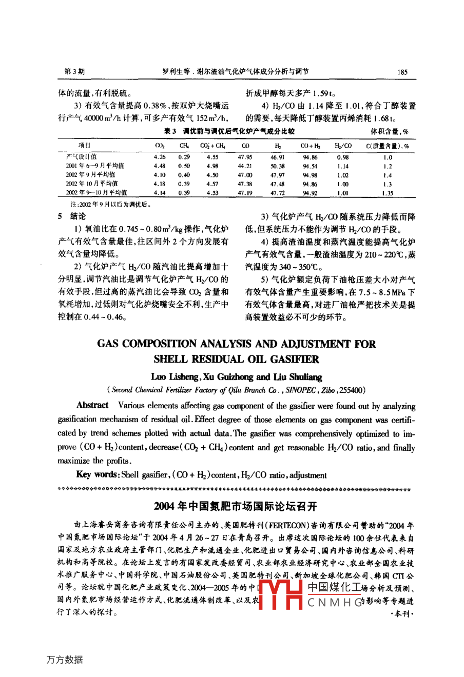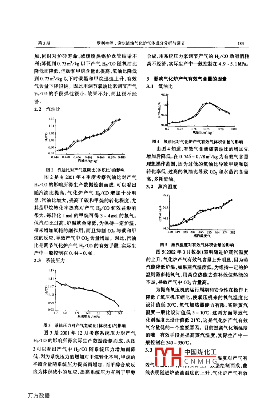 大氮肥2004年Large Scale Nitnogenous Fertilizer Industry第27卷第3期謝爾渣油氣化爐氣體成分分析與調(diào)節(jié)羅利生許桂忠劉樹(shù)亮(中石化齊魯分公司第二化肥廠,山東淄博2554000 )摘要通過(guò)分析渣油造氣機(jī)理,找出影響氣化爐產(chǎn)氣成分的各因素,用實(shí)際生產(chǎn)數(shù)據(jù)繪制的趨勢(shì)圖去驗(yàn)證各因素對(duì)氣化爐產(chǎn)氣成分的影響程度,對(duì)氣化爐進(jìn)行綜合調(diào)優(yōu),以達(dá)到提高氣化爐產(chǎn)氣(00+ H)含量,降低CO2和CH含量以及合理的H2/C0的目的,實(shí)現(xiàn)效益最大化。關(guān)鍵詞謝爾氣化爐(C0+H)含量 氫碳比調(diào)節(jié)1裝置簡(jiǎn)介及存在的問(wèn)題勢(shì)圖,根據(jù)物料的變化和生產(chǎn)需求優(yōu)化出最佳操中石化齊魯分公司年產(chǎn)10x 10*t甲醇裝置作條件。氣化爐設(shè)計(jì)工藝條件見(jiàn)表2。以減壓渣油、7.0MPa過(guò)熱蒸汽.純氧作原料制取表2氣化爐設(shè)計(jì)工藝梟件甲醇,同時(shí)外供羰基合成氣。Shell 渣油造氣單元氧油比!汽油比/戶濁捻分2臺(tái)氣化爐,每臺(tái)爐產(chǎn)原料氣(CO+ H2)mr-kg-' kgk2000m?/h,包括原料的加熱加壓、烴氧化、廢熱回.0.75 0.45 3202387.93 7.0___ 5.5_收及原料氣的洗滌和碳黑回收4部分。-段時(shí)間以來(lái)由于渣油碳含量降低,氫含量2影響氣化爐產(chǎn)氣 H/CO的因素高(見(jiàn)表1),產(chǎn)氣成分H/C0過(guò)高,最高達(dá)1.14,2.1 氧油比導(dǎo)致丁醇裝置丙烯消耗過(guò)高。1.表12001 年原料油組成比較1.07F渣油成分C.% H,% S,% Fei-。, Nir-s 灰分,%1.0386.5 22460.10.99”3季度平均81.5 10.11 1.629.230.43 0.1076 n.784李度平均81.06 10.48 1.6111.97 34.8 0.09氨油比/m'. kg'2001年6- -9月氣化爐產(chǎn)氣中有效氣(CO+H2)含量比設(shè)計(jì)值低0.32%,無(wú)效氣(CO2 + CH4)圖1氧油比對(duì)氣化爐產(chǎn)氣 H/CO(體積比)的影響由圖1(200年10月生產(chǎn)數(shù)據(jù))看出,在原料含量高0.43%。渣油部分氧化制取合成氣的反應(yīng)十分復(fù)雜,和其他操作條件不變的前提下, H2/C0隨氧油比產(chǎn)氣成分受多種因索控制,主要有氣化妒幾何尺變化存在一個(gè)較高區(qū)域,在0.76 ~ 0.80m2/kg氫寸燒嘴的型式物料組成、油槍特性、氧油比、蒸碳比較高。因?yàn)樘岣哐跤捅饶芴岣咛己图淄榈霓D(zhuǎn)汽油比(以下簡(jiǎn)稱汽油比)、系統(tǒng)壓力、進(jìn)料溫度、化率,碳轉(zhuǎn)化率高對(duì)降低產(chǎn)氣H/C0有利,甲烷進(jìn)料負(fù)荷等.其中氣化爐幾何尺寸、燒嘴型式和物轉(zhuǎn)化率高則對(duì)提高產(chǎn)氣H/C0有利,這樣氧油比料組成是決定性因素,目前為不可控制和更改因的變化對(duì)產(chǎn)氣H2/C0的影響有作用相反的兩方面結(jié)果,過(guò)高的氧油比會(huì)導(dǎo)致無(wú)效氣CO2含量增為解決氣化爐運(yùn)行和產(chǎn)氣成分存在的上述問(wèn)中國(guó)煤化工=0020題,達(dá)到效益最大化和安全生產(chǎn)的目的,以渣油部YHCNMHG族193年畢業(yè)于分氧化制合成氣的反應(yīng)機(jī)理作指導(dǎo),單獨(dú)考察油江蘇石油化工學(xué)院化學(xué)T.程系.曾任中石化齊魯外公司第二化肥槍和操作條件對(duì)氣化爐產(chǎn)氣質(zhì)量的影響,繪出趨廠甲醇車間技 術(shù)組長(zhǎng)。聯(lián)系電:.7588157.第3期羅利生等.謝爾渣油氣化爐氣體成分分析與調(diào)節(jié)83加,同時(shí)對(duì)爐磚壽命、臧緩廢熱鍋爐盤(pán)管結(jié)垢不合成,用系統(tǒng)壓力來(lái)調(diào)節(jié)產(chǎn)氣的H2/C0動(dòng)能消耗利;降低到0.75 m’/kg以下產(chǎn)氣H2/CO隨氧油比高不經(jīng)濟(jì),實(shí)際生產(chǎn)中- -般控制在 4.9~5.1 MPao降低而降低,但碳和甲烷含量也提高,氧油比降低到0.73m2/kg以下時(shí)碳黑和甲烷迅速上升,有效3影響氣化爐產(chǎn)氣有效氣含f 的因素氣含量下降很快。因此用調(diào)節(jié)氧油比來(lái)調(diào)節(jié)產(chǎn)氣3.1氧油比H2/C0的手段彈性很小,效果不好,而且很不經(jīng)2.2汽油比80451.151.110.0.774 0.76 0.78 0.8氧袖比m. kg'圖4氧油 比對(duì)氣化爐產(chǎn)氣有效氣體積含量的影響0.90由圖4知道,有效氣含量隨氧油比的增加先0.444 0.450 0.456.. 0.462 0.468 0.474 0.480)增加后降低,在0.745 ~0.78m'/kg為有效氣含量汽油比/kgkg理想操作范圍,因?yàn)檫^(guò)低的氧油比導(dǎo)致甲烷和碳圖2汽油 比對(duì)產(chǎn)氣氫碳比(體積比)的影響轉(zhuǎn)化率低,過(guò)高的氧油比導(dǎo)致CO2和水蒸汽含量圖2是由2001年4季度考察汽油比對(duì)產(chǎn)氣高,多耗渣油。H2/C0的影響所得生產(chǎn)數(shù)據(jù)繪制而成,可以看出3.2蒸汽溫度隨汽油比提高,氣化爐產(chǎn)氣H2/C0增加十分明952p顯,汽油比增大,提高了碳和甲烷的轉(zhuǎn)化程度,尤其是甲烷轉(zhuǎn)化率提高對(duì)產(chǎn)氣H/CO和效益影響很大,每轉(zhuǎn)化!mol的甲烷可得3~ 4mol的氫氣。,ξq4但汽油比過(guò)高,爐溫就會(huì)降低,為保持一定爐溫,帶來(lái)增加氧耗的副作用,而且抑制co2與碳和甲.4.031031932833734635536433382烷的反應(yīng),導(dǎo)致產(chǎn)氣中Co2含量增加。因此,汽油燕汽溫度七比是調(diào)節(jié)氣化爐產(chǎn)氣H2/C0的有效手段,實(shí)際生圖5蒸汽溫度對(duì)有效氣體積含量的影響產(chǎn)中一般控制在0.44~0.46。圖5(2002年3月數(shù)據(jù))表明隨進(jìn)爐蒸汽溫度2.3 系統(tǒng)壓力的上升,氣化爐產(chǎn)氣有效氣含量上升明顯,因?yàn)檎羝芙档蜖t溫,如果蒸汽溫度低,為維持-定的爐