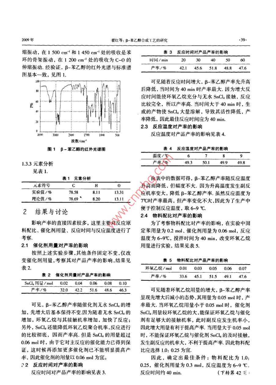 第25卷第5期山西大同大學學報(自然科學版) Vol.25.No.52009年10月 Joum nal of Shanxi Datong University(Natural Scienre)0.200β-苯乙醇合成工藝的研究翟紅,解海(山西大同大學化學與化工學院,山西大同037009)摘要:以苯和環(huán)氧乙烷為原料,在催化劑SnCL的作用下,通過 Friedel-Crafts-反應制得-苯乙醇,采用單因素試驗法,通過考察影響收率的主要因素,確定出最佳工藝條件:物料配比為1.0:0.25、催化劑用量為0.3mol、反應時間為40min、反應溫度為6-9℃,總收率可達51.6%關鍵詞:B-苯乙醇苯環(huán)氧乙烷合成中圖分類號:0625.34文獻標識碼:A文章編號:1674-0874(2009)05-0038-02B-苯乙醇,又名2-苯乙醇,是一種具有溫和玫Ftir8400傅立葉變換紅外光譜儀(美國PE公司),瑰香味的無色粘稠液體,是一種多功能的精細化R-24B型核磁共振波譜儀(美國瓦里安有限公司)學品,已被廣泛地用于配制食品、煙草、肥皂及1.2實驗步驟化妝品香精目前T業(yè)合成B-苯乙醇主要采取以下將經(jīng)干燥的苯(15.6g,0.2mol)加入干燥的三種路線:以甲苯為原料,先經(jīng)氯化生成氯化芐500mL三口燒瓶中,然后加入催化劑 SnCl(8.0g然后和氰化鉀反應轉(zhuǎn)變成苯乙腈,再還原為苯乙0.06mol),溫度控制在6~9℃,充分攪拌后,將環(huán)胺,最后轉(zhuǎn)變?yōu)楸揭掖?本法使用了毒性很大的氧乙烷(2.2g0.05mol)慢加入三口燒瓶中,繼續(xù)氰化物,且反應步驟多、工藝復雜,不適合中小企攪拌約40min.將反應混合液水解,水解后用分液業(yè)采用;以苯乙烯為原料,先經(jīng)催化氧化生成苯環(huán)漏斗分出有機相,有機相經(jīng)水洗后,精餾回收苯,氧乙烷,再經(jīng)催化氫化生成B-苯乙醇,此法采用冷卻,即得粗產(chǎn)品B-苯乙醇,然后把殘液在2~2.67催化氧化和催化加氫工藝,對設備要求苛刻,裝置a下精餾,分離出100-120℃餾分,即得高純度投資大,難于在中小企業(yè)中實行;以苯為原料環(huán)B-苯乙醇,產(chǎn)率為51.6%(文獻值45.2%氧乙烷通過 Friedel-Crafts-反應與苯作用得到苯乙合成路線如下:醇,該法雖然副產(chǎn)物多,但是生產(chǎn)工藝簡單,設備 CSnQ3要求低,投資少,適合于中小企業(yè).因此提高環(huán)氧乙烷法制備-苯乙醇收率有很重要的研究價值 Sna41實驗部分1.1實驗藥品與儀器 HO藥品:苯(西安化學試劑廠),環(huán)氧乙烷、硫酸(天津市化學試劑一廠),氫氧化鈉(西安化學試劑廠),無水氯化鈣(三津市科密歐化學試劑開發(fā)中1.3產(chǎn)品結(jié)構(gòu)鑒定心),四氯化錫(北京雙環(huán)化學試劑廠);試劑均為1.3.1折光率分析純經(jīng)測定產(chǎn)品的折光率1.5321(文獻值1.5320儀器:阿貝折光儀(上海光學儀器廠),PE-1.3.2紅外光譜圖2400CHN元素分析儀(美國鉑金埃爾默公司),I(kbr):在3436.2cm處的吸收為0H的伸收稿日期:2009-07-11基金項目:山西大同大學校青年科學研究基金[20081作者簡介:翟紅(1981-),女,山西朔州人,碩士,助教,研究方向:化學教學2009年翟紅等:B-苯乙醇合成工藝的研究39縮振動,在1500cm和1450cm處的吸收是苯表3反應時間對產(chǎn)品產(chǎn)率的影響環(huán)的骨架振動,在1200cm處的吸收為C-0的時間/min2030405060伸縮振動.經(jīng)驗證,B-苯乙醇的紅外光譜與標準譜產(chǎn)率/%42.145.651.848.847.6圖基本一致,見圖1.可見隨著反應時間增大,B-苯乙醇產(chǎn)率先升高后降低,當時間為40min時產(chǎn)率最大因為增大反應時間能使環(huán)氧乙烷充分與無水SnCl接觸,反應比較完全,所以產(chǎn)率高.當時間大于40min時,生成的產(chǎn)物使SnCl4大量溶解,導致其活性降低,產(chǎn)率降低,因此最佳反應時間應為40min2.3反應溫度對產(chǎn)率的影響403000001500100500反應溫度對產(chǎn)品產(chǎn)率的影響見表4波數(shù)/cm圖1-苯乙醇的紅外光譜圖表4反應溫度對產(chǎn)品產(chǎn)率的影響溫度/℃67891.3.3元素分析產(chǎn)率/%49.350.149.949.8見表1.表1元素分析由表中的數(shù)據(jù)可得,B苯乙醇產(chǎn)率隨反應溫度元素符號CH0升高而降低,但幅度不大.因為升高溫度發(fā)生副反實驗值/%78.588.1113.31應機率變大,降低B-苯乙醇產(chǎn)率.雖然反應溫度為理論值/%78.698.2013.117℃時產(chǎn)率最高,但產(chǎn)率變化不大,因此為了生產(chǎn)中2結(jié)果與討論便于控制反應溫度,取6~9℃2.4物料配比對產(chǎn)率的影響影響產(chǎn)率的直接因素較多,這里主要對反應原為了考察物料配比對產(chǎn)率的影響,在實驗中固料配比、催化劑用量、反應時間與反應溫度進行了定苯用量為0.2mol、催化劑用量為0.06mol,反應考察溫度為69℃,攪拌時間為40min,改變環(huán)氧乙烷2.1催化劑用量對產(chǎn)率的影響用量進行實驗,結(jié)果見表5按照上述實驗步驟,其他條件固定不變,僅改變催化劑用量,考察其對產(chǎn)品產(chǎn)率的影響,結(jié)果見表5物料配比對產(chǎn)品產(chǎn)率的影響表2.環(huán)氧乙烷/mol0.010.030.050.060.07表2催化劑用量對產(chǎn)品產(chǎn)率的影響產(chǎn)率/%33.645.151.549.1476SnCL用量/mo】0.020.040.060.080.10產(chǎn)/%32.042.251.648.646.3可見隨著環(huán)氧乙烷用量的增大,B-苯乙醇產(chǎn)率呈現(xiàn)先增大后減小的態(tài)勢,其用量為0.05mol時,產(chǎn)可見,B-苯乙醇產(chǎn)率隨催化劑無水SnCl4的增率最大.當環(huán)氧乙烷用量小于0.05mol時,催化劑加,先增大后基本保持不變因為隨著無水C的SnC4用量較環(huán)氧乙烷的大,能保證環(huán)氧乙烷與催化增加,環(huán)氧乙烷與其接觸機率增加,加快了反應;劑有足夠大的接觸機率,此時副反應發(fā)生機