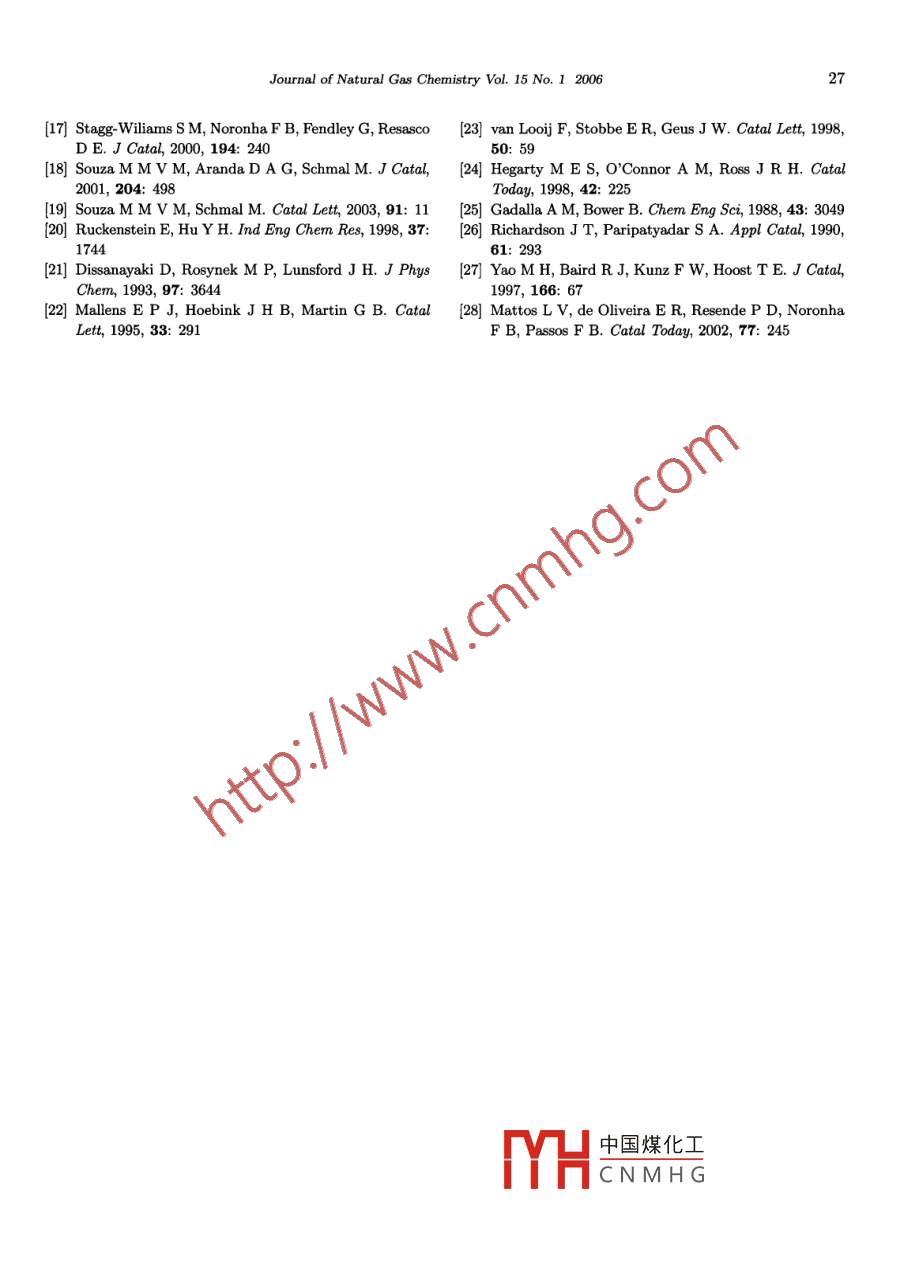 Availableonlineatwww.sciencedirect.comdbJournal of Natural Gas Chemistry 15(2006)21-27SCIENCE PRESSArticleSynthesis Gas Production from Natural Gason Supported Pt CatalystsMariana M.v. M. Souza, 2*, Octavio R. Macedo Neto, Martin SchmallNUCAT/PEQ/COPPE, Universidade Federal do rio de Janeiro, C P. 68502, 21945-970, Rio de Janeiro, brazil2. Escola de Quimica, Universidade Federal do rio de janeiro, C P. 68542, 21940-900, Rio de Janeiro, BrazilManuscript received November 9, 2005; revised December 5, 2005]Abstract: Auto-thermal reforming of methane, combining partial oxidation and reforming of methanewith COz or steam, was carried out with Pt/Al2O3, Pt/ZrO2 and Pt/CeO2 catalysts, in a temperaturerange of 300-900 C. The auto-thermal reforming occurs in two simultaneous stages, namely, total combus-tion of methane and reforming of the unconverted methane with steam and CO2, with the O2 conversionf 100% starting from 450C For combination with CO2 reforming, the Pt/CeO2 catalyst showed thelowest initial activity at 800C, and the highest stability over 40 h on-stream. This catalyst also presentedthe best performance for the reaction with steam at 800C. The higher resistance to coke formation of thecatalyst supported on ceria is due to the metal-support interactions and the higher mobility of oxygen inthe oxide latticeKey words: methane; steam reforming; CO2 reforming; partial oxidation; auto-thermal reformingplatinum catalyst; ceria; zir1. Introductionbecause of the highly endothermic property of the reaction and the H2/CO ratio obtained (about 3 )is onlyRenewed attention in both academic and indus- suitable for processes requiring a H2-rich feed(such astrial research has recently been focused on alterna- ammonia synthesis and petroleum refining process)tive routes for conversion of natural gas(methane)to but it is too high for fuel synthesis via Fischer-Tropschsynthesis gas, a mixture of Co and H2, which can be reaction (2, 3. Moreover, steam reformers are inade-used to produce chemical products with high added quate for hydrogen generation in fuel cell electric vehi-values, such as hydrocarbons and oxygenated com- cles because of their high thermal inertia for frequentpounds. In GTL (gas-to-liquid) plants, where natural start-up and shut-down operation condition (4, 5]gas is first converted to synthesis gas, which is theReforming of methane with CO2 is an alternatifeedstock for Fischer-Tropsch synthesis of hydrocar- route for synthesis gas generation, with important adbons, where, above 60%-70% of the cost of the overall vantages for some applicationsince the H2/c(process is associated with the production of synthesis uct ratio(about 1)is more adequate for synthesis ofas[1, 2. Therefore, reduction in synthesis gas gener- oxoalcohols, acetic acid and dimethyl ether [6, 7]. It isation costs would have a large and direct influence on also environmental friendly process because it reducesthe overall economics of these downstream industrial CO 2 emissions, which is the main source of greenhouseeffeSteam reforming of methane(SRM)is the mostimportant industrial process for production of syn. ofH中國煤化工CNMHTR), a combination-tion reactions, is anthesis gas. SRM is a very energy-intensive process advantageous route for synthesis gas piCorresponding author. Fax:(5521)25627598; E-mail: mmattos @eq ufrj. brMariana M. V M. Souza et al. Journal of Natural Gas Chemistry Vol. 15 No. 1 2006both economical and technical reasons. It has low- by H2 and CO chemisorption and TPR (19energy requirements due to the opposite contributionof the exothermic methane oxidation and endother- 2.2. Catalyst testingmic steam reforming. The combination of these re-actions can improve the reactor temperature controlThe reaction was carried out in a fixed-bed flowand reduce the formation of hot spots, avoiding cat- type quartz reactor loaded with 20 mg of catalyst,alyst deactivation by sintering or carbon deposition. under atmospheric pressure. The total feed flow rateMoreover, ATR allows the production of synthesis gas was held constant at 200 cm/min(WHSV=160h-1ywith a wider range of H2/Co ratios by manipulat- with flowing He. The steam was added to the systeming the relative concentrations of CO2/H2O and Oby a saturator with temperature control. The activityin the feed [8-10]. All these advantages indicate that tests were performed at different temperatures, rang-atR should be the technology of choice for large-scale ing from 300 to 900"C in steps of 50C that were keptGTL plants [11]. In addition, a fuel processor based for 30 min at each temperature. The loss in catalyston auto-thermal reforming of methane could provide activity at 800C was monitored up to 40 h on streama low cost and compact system, with fast start-up and The reaction products were analyzed by on-line gascapability to follow load variations, more adequate for chromatograph(CHROMPACK CP9001), equippedfuel cell electric vehicles [12, 13with a Hayesep d column and a thermal conductivityIt is well-known that the support has a significantdetectoreffect on the overall catalytic behaviors and the useof reducible oxides, like ZrO2 and CeO2, can result 2.3. Carbon deposition measurementsin additional process benefits when compared to irre-The amount of coke formed over the catalystsducible oxides, such as Al2 O3 or SiO2[14-16). The after deactivation tests at 800C was examined byreducibility and oxygen transfer capacity of zroz thermogravimetric analysis(TGA), using a RIGAKUand CeO2 have shown to be fundamental in keep-ermoanalyzer(model TAS 100). The samples wereing the active phase surface free of carbon deposits15, 17, 18. We have previously reported that Pt/zrOz heated at a rate of 10/min to 800"C in a flow ofand Pt/CeO2 are effective formulations for CO2 re- 15%02/N2(50 cm/min)forming and partial oxidation of methane [19].Theaim of this work is to investigate the coupling between3. Results and discussionthe steam or CO2 reforming with partial oxidation of