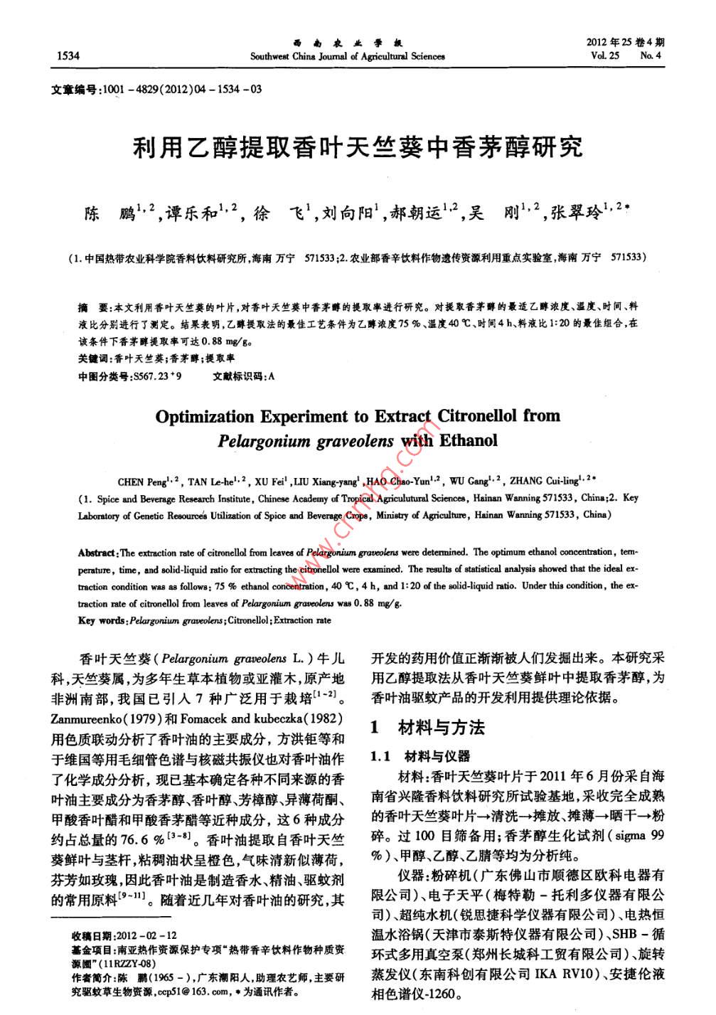 利用乙醇提取香葉天竺葵中香茅醇研究