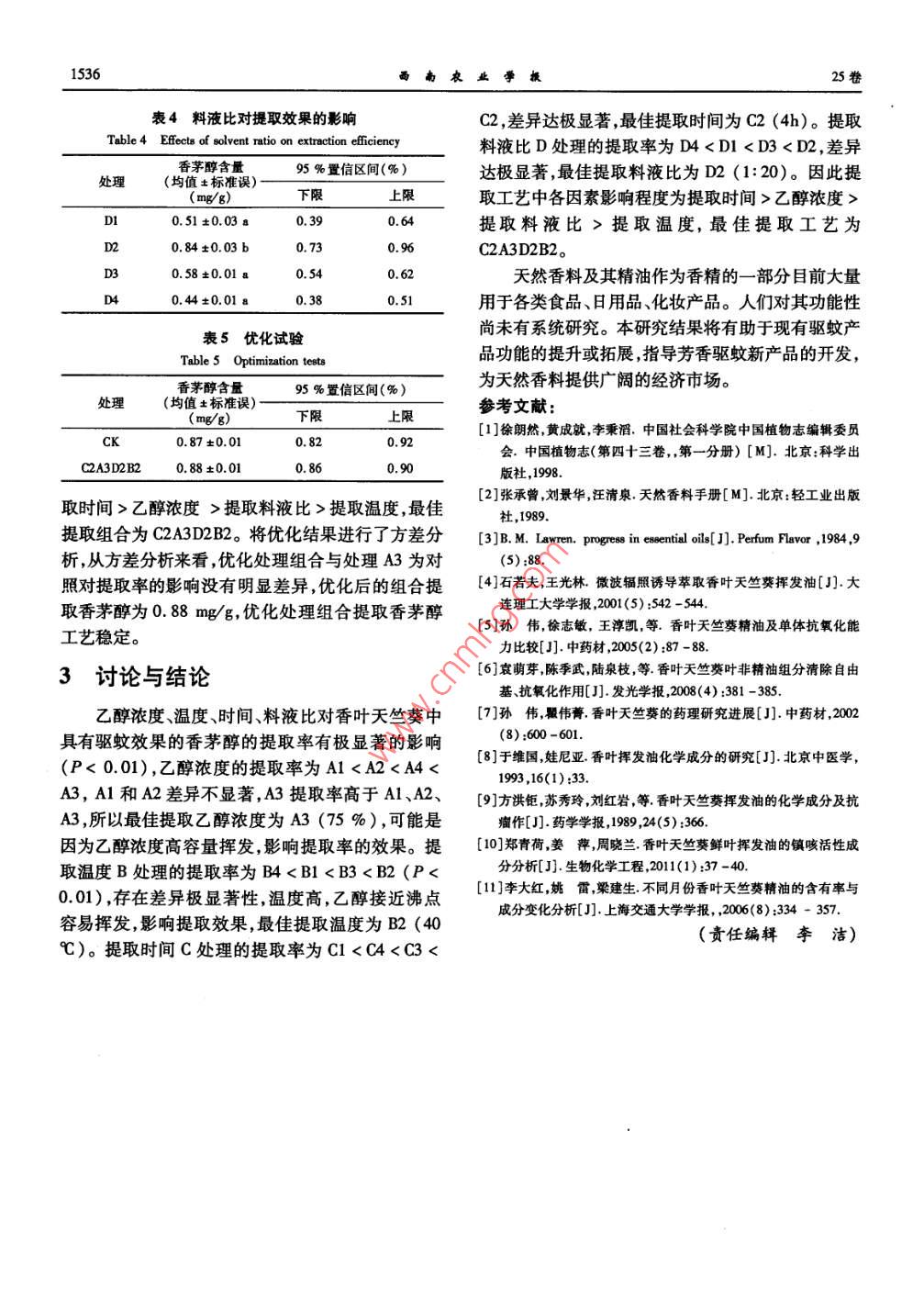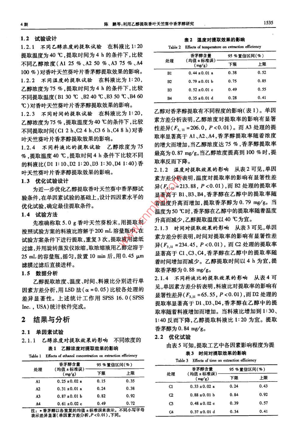 2012年25卷4期1534Southwest China Joumal of Agricultural SciencesVol 25 No 4文章編號(hào):1001-4829(2012)04-1534-03利用乙醇提取香葉天竺葵中香茅醇研究陳鵬2,譚樂和12,徐飛,劉向陽,郝朝運(yùn)2,吳剛2,張翠玲,2(1中國熱帶農(nóng)業(yè)科學(xué)院香料飲料研究所海南萬寧571533;2農(nóng)業(yè)部香辛飲料作物遺傳資源利用重點(diǎn)實(shí)驗(yàn)室海南萬寧571533摘要:本文利用香葉天竺葵的葉片,對(duì)香葉天竺葵中香茅醇的提取率進(jìn)行研究。對(duì)提取香茅醇的最適乙醇濃度、溫度、時(shí)間、料液比分別進(jìn)行了測定。結(jié)果表明,乙醇提取法的最佳工藝條件為乙酶濃度75%、溫度40℃、時(shí)間4h料液比1:20的最佳組合在該條件下香茅醇提取率可達(dá)0.88mg/go關(guān)鍵詞:香葉天竺葵;香茅醇;提取率中圖分類號(hào):S567239文獻(xiàn)標(biāo)識(shí)碼:AOptimization Experiment to Extract Citronellol fromPelargonium graveolens with EthanolCHEN Peng, 2, TAN Le-he. 2, XU Fei', LIU Xiang-yang, HAO Chao-Yun WU Gang 2, ZHANG Cui-ling. 2.(1. Spice and Beverage Research Institute, Chinese Academy of Tropical Agriculutural Sciences, Hainan Wanning 571533, China 2. KeyLaboratory of Genetic Resources Utilization of Spice and Beverage Crops, Ministry of Agriculture, Hainan Wanning 571533, ChinaAbstract: The extraction rate of citronellol from leaves of Pelargonium graveolens were determined. The optimum ethanol concentration, temperature, time, and solid-liquid ratio for extracting the citronellol were examined. The results of statistical analysis showed that the ideraction condition was as follows: 75 ethanol concentration, 40C, 4 h, and 1: 20 of the solid-liquid ratio. Under this conditiontraction rate of citronellol from leaves of pelargonium graveolens was 0. 88 mg/g.Key words: Pelargonium graveolens: Citronellol; Extraction rate香葉天竺葵( Pelargonium graveolens L.)牛兒開發(fā)的藥用價(jià)值正漸漸被人們發(fā)掘出來。本研究采科,天竺葵屬,為多年生草本植物或亞灌木原產(chǎn)地用乙醇提取法從香葉天竺葵鮮葉中提取香茅醇,為非洲南部,我國已引入7種廣泛用于栽培2)。香葉油驅(qū)蚊產(chǎn)品的開發(fā)利用提供理論依據(jù)。Zanmureenko(1979)fA Fomacek and kubeczka(1982用色質(zhì)聯(lián)動(dòng)分析了香葉油的主要成分,方洪矩等和1材料與方法于維國等用毛細(xì)管色譜與核磁共振儀也對(duì)香葉油作1.1材料與儀器了化學(xué)成分分析,現(xiàn)已基本確定各種不同來源的香材料:香葉天竺葵葉片于2011年6月份采自海葉油主要成分為香茅醇、香葉醇、芳樟醇、異薄荷酮、南省興隆香料飲料研究所試驗(yàn)基地采收完全成熟甲酸香葉醋和甲酸香茅醋等近種成分,這6種成分的香葉天竺葵葉片→清洗→攤放、攤薄→曬干→粉約占總量的76.6%。香葉油提取自香葉天竺碎。過100目篩備用;香茅醇生化試劑( sigma9葵鮮葉與莖桿,粘稠油狀呈橙色,氣味清新似薄荷,%)、甲醇、乙醇、乙腈等均為分析純。芬芳如玫瑰,因此香葉油是制造香水、精油、驅(qū)蚊劑儀器:粉碎機(jī)(廣東佛山市順德區(qū)歐科電器有的常用原料1。隨著近幾年對(duì)香葉油的研究,其限公司)、電子天平(梅特勒-托利多儀器有限公司)超純水機(jī)(銳思捷科學(xué)儀器有限公司)、電熱恒收稿日期:2012-02-12溫水浴鍋(天津市泰斯特儀器有限公司)、SHB-循基金項(xiàng)目:南亞熱作資源保護(hù)專項(xiàng)“熱帶香辛飲料作物種質(zhì)資源圓”(11RZZY08)環(huán)式多用真空泵(鄭州長城科工貿(mào)有限公司)、旋轉(zhuǎn)作耆簡介:陳鵬(1965-),廣東潮陽人,助理農(nóng)藝師,主要研蒸發(fā)儀(東南科創(chuàng)有限公司IARv10)、安捷倫液驅(qū)蚊草生物資源,ccp5l@163.cm,·為通訊作者。相色譜儀1260。4期陳鵬等:利用乙醇提取香葉天竺葵中香茅醇研究15351.2試驗(yàn)設(shè)計(jì)表2溫度對(duì)提取效果的影響1.2.1不同乙醇濃度的提取試驗(yàn)在料液比1:20Table 2 Efects of temperature on extraction efficiency提取溫度為40℃,提取時(shí)間為4h的條件下,比較香茅醇含量95%置信區(qū)間(%)不同乙醇濃度(A125%、A250%、A375%、A4處理(均值±標(biāo)準(zhǔn)誤)下限上限100%)對(duì)香葉天竺葵葉片香茅醇提取效果的影響。BI0.44±0.0180.380.521.2.2不同溫度的提取試驗(yàn)在料液比為1:200.79±0.01b0.85乙醇濃度為75%,提取時(shí)間為4h的條件下,比較0.52±0.01不同提取溫度(B130℃、B240℃、B350℃、B4600.35±0.01d0.280.41℃)對(duì)香葉天竺葵葉片香茅醇提取效果的影響。123不同時(shí)間的提取試驗(yàn)在料液比為1:20,乙醇對(duì)香茅醇提取有不同程度的影響(表1)。單因乙醇濃度為75%提取溫度為40℃的條件下,比較素方差分析表明乙醇濃度對(duì)提取率的影響有顯箸不同提取時(shí)間(C12h、C24h、C36h、C48h)對(duì)香性差異(F3,n=206.0,P<0.01)。而A3處理的提葉天竺葵葉片香茅醇提取效果的影響。取率顯著高于A1A2、A4,香茅醇提取率隨著濃度1.2.4不同料液比的提取試驗(yàn)乙醇濃度為75的增大而增加當(dāng)乙醇濃度達(dá)75%,香茅醇提取率%提取溫度40℃,提取時(shí)間4h條件下比較不同最高為0.87mg/g,當(dāng)乙醇濃度提高到100%時(shí),提的料液比(D:10、D21:20、D31:30、D41:40)香取率反而下降。葉天竺葵葉片香茅醇提取效果的影響。2.1.2溫度對(duì)提取效果的影響從表2可見,單因13優(yōu)化試驗(yàn)設(shè)計(jì)素方差分析表明溫度對(duì)提取率的影響有顯箸性差為近一步優(yōu)化乙醇提取香葉天竺葵中香茅醇試異(F3,n=213.8P<0