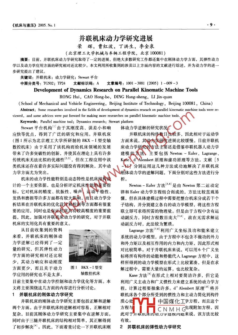 《機床與液壓》2005.No.1并聯(lián)機床動力學研究進展榮輝,曹紅波,丁洪生,李金泉(北京理工大學機械與車輛工程學院,北京10081)摘要:目前,并聯(lián)機床動力學研究取得了一定的進展,但絕大多數(shù)研究工作都還集中在剛體動力學方面,其彈性動力學以及動力學應用方面的研究相對還比較少。本文利用所收集到的涉及以上方面內容的文獻進行綜述,并為動力學的進步研究提出了建議關鍵詞:并聯(lián)機床;動力學研究; Stewart平臺中圖分類號:TG502;TP4文獻標識碼:A文章編號:1001-3881(2005)1-009-3Development of Dynamics Research on Parallel Kinematic Machine ToolsRONG Hui, CAO Hong-bo, DING Hong-sheng, LI Jin-quanSchool of Mechanical and Vehicle Engineering, Beijing Institute of Technology, Beijing 100081, China)Abstract: Some researches involved in the fields of development of dynamics reseach on parallel kinematic machine tools were re-viewed, and some advices were put forward for making more researches on parallel kinematic machine toolsKeywords: Parallel machine tool; Dynamics research; Stewart platformStewart平臺機構由于其剛度高、誤差小和響體動力學逆解的研究狀況。應快等優(yōu)點,得到了廣泛的研究和應用。并聯(lián)機床并聯(lián)機床的構件數(shù)目比較多,因此相對于運動學(圖1所示為北京理工大學所研制的BKX-I型變軸方面來說,其動力學研究進展比較緩慢。目前并聯(lián)機數(shù)控機床)由于采用了該機構而給機床領域的發(fā)展床動力學研究的方法主要還是借鑒串聯(lián)機器人動力學帶來了許多突破性的創(chuàng)新,并使其在理論上具有許多建模的方法,主要包括 Newton- Euler、 Lagrange傳統(tǒng)機床無法比擬的優(yōu)越性23,但在工程應用中該Kane、d' Alembert原理和虛功原理等方法。文獻[5類機床還存在著許多實際問題沒有得到解決,其中動11]分別運用這幾種方法成功地解決了并聯(lián)機床力學方面尤為突出。剛體動力學的逆解問題,下面分別對這些方法進行分機床的動力學性能特別是動態(tài)特性是機床結構設析計的一個主要依據(jù),也是分析評定機床性能的重要指Newton- Euler方法6是由 Newton第二運動定標。它對機床的精度、抗振性、噪聲、運動平穩(wěn)性、律和 Euler動力學方程組合而成的,方法比較直觀易發(fā)熱和磨損等許多方面都有較大影響,而且動力學分懂,但在具體建模過程中需要把整臺機床分成若干個析結果在并聯(lián)機床的優(yōu)化設計和控制等方面都有很重子結構,并分別建立各自的動力學模型,將這些方程要的應用,同時也是保證機床具有較高精度的重要前聯(lián)立即可求得所需的物理量。但是由于方程中含有運提,因此,加強對并聯(lián)機床動力學的研究,對于并聯(lián)動副反力,同時方程數(shù)目龐大5。,故在無需求解運機床的實用化具有重要的意義動副反力時,此法較為繁瑣。從目前收集到的資料grange方法利用廣義坐標及功和能來建立來看,并聯(lián)機床的剛體動系統(tǒng)的動力學模型,由于方程中不包含不做功的外力力學逆解已經得到了一定和外力矩以及相互作用的內力和內力矩,因此形式相量的研究,但其彈性動力對比較簡單。對于并聯(lián)機床來說,可以用6個廣義坐學方面的研究相對還比較標將所有構件的動能和勢能代人 Lagrange方程中,這少,其動力響應和動剛度樣所得到的動力學模型在形式上比較緊湊,但是在求方面更少,而且關于動力圖1BK-I型變解過程中,需要大量的運算,也比較復雜學應用的研究也不是太多軸數(shù)控機床Kane方法在形式上相對要簡潔許多,但它是目前主要集中在動力學控制和動力學優(yōu)化等方面。本利用廣義主動力和廣義慣性力來建立系統(tǒng)的動力學方文將主要圍繞這幾方面的內容進行分析討論。程,計算過程要抽象許多。 d' Alembert原理將并1并聯(lián)機床的剛體動力學研究聯(lián)機床各個部分所受到的慣性力和主動力簡化到構件并聯(lián)機床的剛體動力學研究主要包括正解和逆解質心處中國煤化工學方程,而且這個兩個方面。由于并聯(lián)機床的逆解相對容易,正解相對方程CNMHG現(xiàn)附加方程,因復雜,目前其剛體動力學研究主要集中在逆解方面。此對于廾聯(lián)饑木的刀子娃懊凹題來說,該方法比較同時由于三腿并聯(lián)機床的結構相對簡單,其正解得到有效。了初步解決。因此,下面著重討論一下并聯(lián)機床剛2并聯(lián)機床的彈性動力學研究《機床與液壓》2005.No.1相對于剛體動力學而言,并聯(lián)機床的彈性動力學動態(tài)特性是分析和評價機床性能的重要指標。傳研究還比較少,下面就所收集到的一些資料進行分統(tǒng)的機器人動力性能評價指標為動態(tài)條件數(shù)、動態(tài)最析小奇異值和動態(tài)可操作性橢球半軸幾何均值等9。2.1并聯(lián)機床動態(tài)特性分析與之有所差異,并聯(lián)機床的動態(tài)特性優(yōu)良與否主要取并聯(lián)機床的動態(tài)特性分析主要包括三個方面內決于機床的抗振性和切削穩(wěn)定性,所以并聯(lián)機床的設容,固有特性、動力響應特性和動力穩(wěn)定性,也可以計目標一般可歸結為如何提高機床的單位質量靜剛度用固有頻率、動力響應特性以及動剛度來描述。由于等因素,以提高機床的動剛度,并提高機床的精度并聯(lián)機床的動態(tài)特性對機床的影響比較大,因此隨著抗振能力和壽命等性能。并聯(lián)機床的不斷發(f