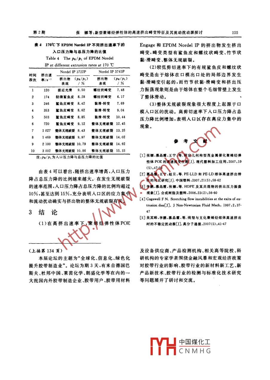 第30卷第2期青島科技大學(xué)學(xué)報(自然科學(xué)版)Vol 30 No. 22009 F4 A Journal of Qingdao University of Science and Technology(Natural Science Edition) Apr文章編號:1672-6987(2009)02015105新型聚烯烴彈性體的高速擠出畸變特征及其流動擾動源探討張娜,王寧,趙貝,宋相澎,吳其曄(青島科技大學(xué)橡塑材料與工程教育部重點實驗室,山東青島266042)要:米用雙毛細(xì)管流變僅研究由限定幾何構(gòu)型催化劑和 INSITE工藝開發(fā)的聚烯烴彈性體( POE Engage)和三元乙丙橡膠( EPDM Nordel IP)在高速擠出時的不穩(wěn)定流動現(xiàn)象和擠出畸變特征,并對各類不同擠出畸變的擾動源進行了探討。結(jié)果表明,鯊魚皮和螺紋狀畸變的空間起源在口模出口處,竹節(jié)狀黏滑畸變與擠出壓力振蕩現(xiàn)象是由于熔體/口模壁處的整體黏滑轉(zhuǎn)變引起,而熔體整體無規(guī)破裂現(xiàn)象則與口模入口區(qū)的擾動有關(guān)關(guān)鍵詞:聚烯烴彈性體;三元乙丙橡膠;擠出畸變中圖分類號:TQ325.14文獻標(biāo)識碼:AStudy of the Melt Flow Instability Behaviors ofPolyolefin Elastomer at High Speed ExtrusionZHANG Na, WANG Ning, ZHAO Bei, SONG Xiang-peng, WU QF-yo(Key Laboratory of Rubber-plastics, Ministry of Education, Qingdao University ofechnology, QingAbstract: The melt flow instability behavior and the causes of the extrusion distortion ofPOE Engage and EPDM Nordel IP produced by CGC and INSITETM technology weresystematically studied using a double capillary rheometer at constant speed. The resultindicated that the sharkskin fracture was caused by the interface instability at die exitand the extrusion pressure oscillation was due to the stick-slip transition at the interfacebetween the melts and die wall. However, the random fractures were related to the flowturbulence at the die entranceKey words: POE Engage; EPDM Nordel IP; extrusion distortion聚烯烴彈性體( POE Engage)和三元乙丙橡流動的起源——即探究流動擾動源的位置及擾動膠( EPDM Nordel IP是美國 Du Pont-Dow化學(xué)性質(zhì)。公司用限定幾何構(gòu)型催化劑和 INSITETM工藝生1實驗部分產(chǎn)的新型聚烯烴彈性體。其主要優(yōu)點是力學(xué)性能優(yōu)異,兼有良好加工性能,但實驗發(fā)現(xiàn)高速擠出時1.1原料與儀器也出現(xiàn)多種畸變現(xiàn)象。本研究將分門別類地歸POE Engage 8003, POE Engage 8150, EP-納梳理這些現(xiàn)象,同時探究不同熔體發(fā)生不穩(wěn)定DMardel IP 3745P中國煤化工CNMHG收稿日期:20080402基金項目:國家自然科學(xué)基金資助項目(50573037,50390090)作者簡介:張娜(1983~),女,礦士通訊聯(lián)系人152青島科技大學(xué)學(xué)報(自然科學(xué)版)第30卷均為美國 DuPont-Dow化學(xué)公司;含氟彈性體3745P中,制成PPA質(zhì)量分?jǐn)?shù)0.04%的復(fù)合材PPA5920,美國3M公司料,測試其流動性能。實驗溫度設(shè)定在170℃RH2000型雙筒毛細(xì)管流變儀,英國 Bohl公司;BX51型光學(xué)顯微鏡,日本 Olympus公司2結(jié)果與討論1.2主要原料的結(jié)構(gòu)與物理性能2.1 POE Engage和 EPDM Nordel IP的高速擠POE Engage和 EPDM Nordel IP的結(jié)構(gòu)與出畸變特征物理性能見表1、表2。4種樣品高速擠出時,具有代表性的擠出外觀見圖1所示。由圖1可見,隨著擠出速率增加,表1 POE Engage的結(jié)構(gòu)與物理性能2種POE樣品的擠出物表觀均由光滑表面發(fā)展Table 1 The structure and physical到出現(xiàn)鯊魚皮畸變,而后直接發(fā)展為整體無規(guī)破properties of POE Engage裂口。其中 POE Engage8150因相對分子質(zhì)量材料名稱較大,在很低剪切速率(120s1)已出現(xiàn)鯊魚皮畸性能80038150變。 EPDM Nordel ip3722P的擠出物外觀變化密度/(g規(guī)律與POE類同,但 EPDM Nordel IP3745P的門尼黏度ML擠出表觀十分豐富,除出現(xiàn)規(guī)則螺紋狀畸變和整x(辛烯)/%體無規(guī)破裂外,在一定剪切速率范圍內(nèi)還出現(xiàn)了熔融指數(shù)/(g·(10min)-1)竹節(jié)狀黏滑畸變?nèi)埸c(DsC)/t55圖1的擠出外觀照片提供了大量信息。(1)拉伸強度/MPa根據(jù)4種樣品均出現(xiàn)較規(guī)則的鯊魚皮和螺紋狀畸斷裂伸長率/%變,可以判斷4種樣品的大分子結(jié)構(gòu)均屬于線型邵爾A型硬度/度1分子2;(2) EPDM Nordel IP3745P出現(xiàn)竹節(jié)狀黏滑畸變,說明流動過程中熔體/毛細(xì)管壁的邊表2 EPDM Nordel IP的結(jié)構(gòu)與物理性能界發(fā)生了“時滑時黏”的振蕩,這與該樣品的門尼Table 2 The structure and physical properties黏度大、相對分子質(zhì)量分布窄,分子鏈纏結(jié)程度高of epdm Nordel IP有關(guān)。(3)所有擠出畸變大致歸為幾類:鯊魚皮和材料名稱性能螺紋狀畸變、竹節(jié)狀黏-滑轉(zhuǎn)變、整體無規(guī)破裂。3722P3745P不同的畸變類型有不同的規(guī)律和特征,結(jié)合其他MLlz5T實驗事實可以探究其不同的發(fā)生根源(乙烯)/%2.2黏滑畸變及其擾動源分析x(丙烯)/%30.5x(ENB)/%2.2.1竹節(jié)狀黏滑畸變的主要特征10萬15萬從圖1(d)得知, EPDM Nordel IP3745P在分子量分布寬度窄擠出速率達到353s時擠出物發(fā)生了竹節(jié)狀黏密度/(g·cm-3)0.880.88滑畸變,典型特征為擠出物表面交替出現(xiàn)一段較結(jié)晶度/%光滑、一段粗糙的畸變現(xiàn)象。在其擠出壓力-時間圖中(見圖2),擠出壓力發(fā)展曲線出現(xiàn)規(guī)律性振蕩,并且在一定范圍內(nèi),擠出速率越高,振蕩頻率1.3實驗條件越大,但一般壓力峰值不再增高。伴隨壓力振蕩,測試物料的流變性能。實驗溫度設(shè)定:POE熔體流動曲線發(fā)生斷裂或彎折(見