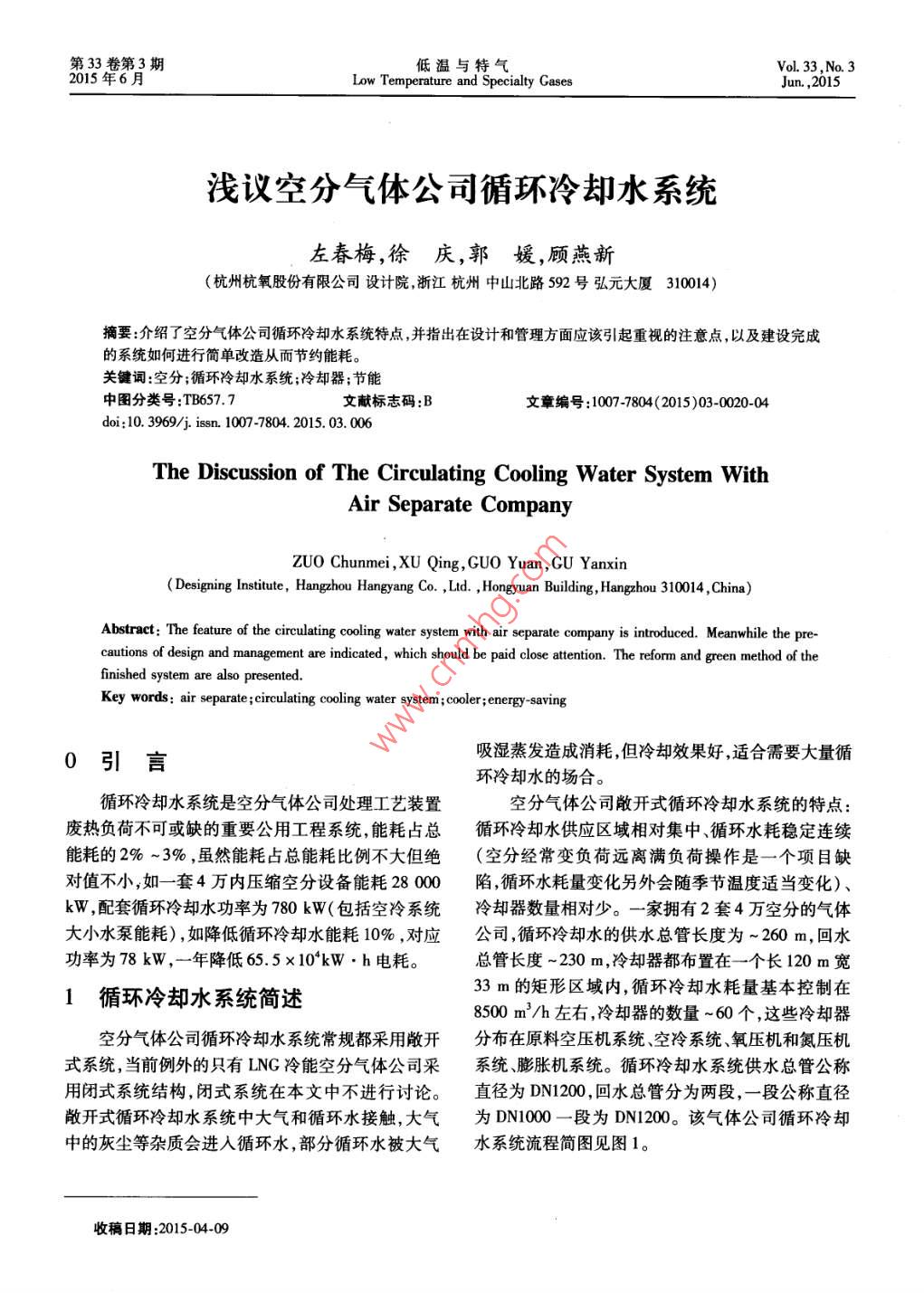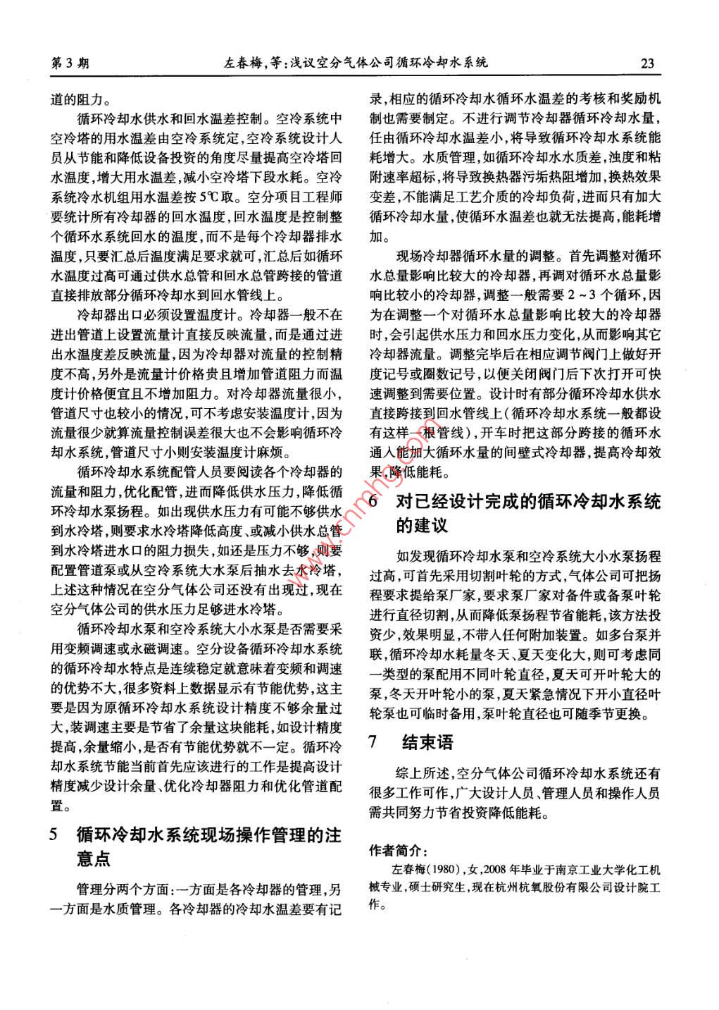 第33卷第3期低溫與特氣Vol 33. No. 3015年6月Low Temperature and Specialty GasesJun.,2015淺議空分氣體公司循環(huán)冷卻水系統(tǒng)左春梅,徐慶,郭媛,顧燕新(杭州杭氧股份有限公司設(shè)計(jì)院浙江杭州中山北路592號弘元大廈31004)摘要:介紹了空分氣體公司循環(huán)冷卻水系統(tǒng)特點(diǎn),并指出在設(shè)計(jì)和管理方面應(yīng)該引起重視的注意點(diǎn),以及建設(shè)完成的系統(tǒng)如何進(jìn)行簡單改造從而節(jié)約能耗。關(guān)鍵詞:空分;循環(huán)冷卻水系統(tǒng);冷卻器;節(jié)能中圖分類號:TB657.7文獻(xiàn)標(biāo)志碼:B文章編號:1007-7804(2015)03-0020-04doi:10.3969/jisn.1007-7804.2015.03.006The Discussion of The Cirng Cooling Water System WithAir seCompanyZUO Chunmei, XU Qing, GUO Yuan, GU YanxinDesigning Institute, Hangzhou Hangyang Co, Ltd, Hongyuan Building, Hangzhou 310014, China)Abstract: The feature of the circulating cooling water system with air separate company is introduced. Meanwhile the pre-cautions of design and management are indicated, which should be paid close attention. The reform and green method of thefinished system are also presentedKey words: air separate; circulating cooling water system; cooler; energy-saving0引言吸濕蒸發(fā)造成消耗,但冷卻效果好,適合需要大量循環(huán)冷卻水的場合。循環(huán)冷卻水系統(tǒng)是空分氣體公司處理工藝裝置空分氣體公司敞開式循環(huán)冷卻水系統(tǒng)的特點(diǎn):廢熱負(fù)荷不可或缺的重要公用工程系統(tǒng),能耗占總循環(huán)冷卻水供應(yīng)區(qū)域相對集中、循環(huán)水耗穩(wěn)定連續(xù)能耗的2%~3%,雖然能耗占總能耗比例不大但絕(空分經(jīng)常變負(fù)荷遠(yuǎn)離滿負(fù)荷操作是一個項(xiàng)目缺對值不小,如一套4萬內(nèi)壓縮空分設(shè)備能耗2800陷,循環(huán)水耗量變化另外會隨季節(jié)溫度適當(dāng)變化)、kW,配套循環(huán)冷卻水功率為780kW(包括空冷系統(tǒng)冷卻器數(shù)量相對少。一家擁有2套4萬空分的氣體大小水泵能耗),如降低循環(huán)冷卻水能耗10%,對應(yīng)公司,循環(huán)冷卻水的供水總管長度為~260m,回水功率為78kW,一年降低65.5×10kW·h電耗??偣荛L度~230m,冷卻器都布置在一個長120m寬循環(huán)冷卻水系統(tǒng)簡述33m的矩形區(qū)域內(nèi),循環(huán)冷卻水耗量基本控制在8500m3/h左右,冷卻器的數(shù)量~60個,這些冷卻器空分氣體公司循環(huán)冷卻水系統(tǒng)常規(guī)都采用敞開分布在原料空壓機(jī)系統(tǒng)、空冷系統(tǒng)、氧壓機(jī)和氮壓機(jī)式系統(tǒng),當(dāng)前例外的只有ING冷能空分氣體公司采系統(tǒng)、膨脹機(jī)系統(tǒng)。循環(huán)冷卻水系統(tǒng)供水總管公稱用閉式系統(tǒng)結(jié)構(gòu),閉式系統(tǒng)在本文中不進(jìn)行討論。直徑為DN1200,回水總管分為兩段,一段公稱直徑敞開式循環(huán)冷卻水系統(tǒng)中大氣和循環(huán)水接觸,大氣為DN100一段為DN1200。該氣體公司循環(huán)冷卻中的灰塵等雜質(zhì)會進(jìn)入循環(huán)水,部分循環(huán)水被大氣水系統(tǒng)流程簡圖見圖1。收稿日期:2015-04-09第3期左春梅,等:淺議空分氣體公司循環(huán)冷卻水系統(tǒng)我環(huán)冷卻水回水水莓菌環(huán)那水供水小水泵壓機(jī)高影癥機(jī)低溫癥機(jī)后奔卻器后沖卸器冷水機(jī)組水機(jī)圖1空分氣體公司循環(huán)冷卻水系統(tǒng)流程簡圖Fig. 1 The flow process chart ofting cooling water system in air separation gas company2循環(huán)冷卻水系統(tǒng)部分設(shè)計(jì)參數(shù)說明右,單段填料為14m左右,循環(huán)冷卻水供水壓力要克服進(jìn)水高度差產(chǎn)生的靜液柱壓力和供水總管到進(jìn)水循環(huán)冷卻水供水溫度和回水溫度的確定:根據(jù)口的流動阻力才可直接進(jìn)入水冷塔,一般供水總管到公司所在地連續(xù)不少于5a的每年最熱時期三個月進(jìn)水口的阻力在0MPa以下如供水壓力特別低的(一般為67、8三個月)的日平均氣溫、空氣的相對情況下可把壓降控制在0.05MPa左右以便循環(huán)水利濕度、采用涼水塔的形式、冷卻器對循環(huán)冷卻水的溫度要求等一系列參數(shù)確定??辗衷O(shè)備在江南一般供用自身壓力直接進(jìn)水冷塔。間壁式冷卻器是循環(huán)冷卻水不直接同被冷卻介質(zhì)接觸,空分中除上述空冷塔水32℃回水40℃,在西北一般供水30℃回水40℃和水冷塔外都屬于該類型該類型冷卻器設(shè)計(jì)時更關(guān)循環(huán)冷卻水供水回水壓力的確定:回水壓力根據(jù)涼水塔中布水器相對回水總管標(biāo)高、布水器阻力注循環(huán)冷卻水供水壓力和回水壓力的差值,而冷卻器的設(shè)計(jì)壓力一般都遠(yuǎn)大于循環(huán)冷卻水供水壓力。損失、回水總管最遠(yuǎn)端到布水器進(jìn)口管的循環(huán)水阻空分設(shè)備冷卻器按照循環(huán)冷卻水的合理允許溫力損失來確定。供水壓力根據(jù)回水壓力冷卻器阻升可分為三類第一類是采用循環(huán)冷卻水允許溫升力冷卻器出口到回水總管阻力和供水總管到冷卻的冷卻器,第二類是溫升希望小于循環(huán)冷卻水允許器進(jìn)口阻力來確定。溫升的冷卻器,第三類是溫升希望大于循環(huán)冷卻水循環(huán)冷卻水總量的確定:根據(jù)所有冷卻器所需允許溫升的冷卻器。第一類是原料空壓機(jī)氧氣壓要循環(huán)冷卻水量統(tǒng)計(jì)??s機(jī)、氮?dú)鈮嚎s機(jī)、膨脹機(jī)配套的冷卻