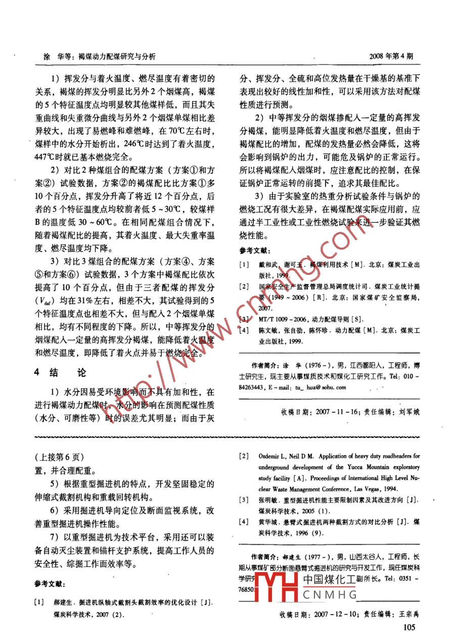 第36卷第4期煤炭科學(xué)技術(shù)VoL 36 No.42008年4月C0AL SCIENCE AND TECHNOLOGYApr. 2008家煤炭加工與環(huán)保褐煤動(dòng)力配煤研究與分析涂華',李文華”,姜英'(1.煤炭科學(xué)研究總院北京煤化工研究分院,北京1003; 2.中國煤炭學(xué)會(huì)煤化學(xué)專業(yè)委員會(huì),北京1003)摘要: 將褐煤摻配入煙煤中,研究了其主要煤質(zhì)指標(biāo)變化規(guī)律,分析了預(yù)測(cè)配煤煤質(zhì)的影響因素。研究結(jié)果表明,在進(jìn)行褐煤動(dòng)力配煤時(shí),由于水分因易受環(huán)境影響而不具有加和性,所以對(duì)預(yù)測(cè)配煤性質(zhì)(水分、可磨性等)的影響尤其明顯,但灰分、揮發(fā)分、全硫和高位發(fā)熱量在干燥基基準(zhǔn)下表現(xiàn)出了較好的線性加和性。通過熱重分析,研究了動(dòng)力配煤燃燒性能變化規(guī)律。試驗(yàn)結(jié)果.表明,中等揮發(fā)分的煙煤摻配入一定量的高揮發(fā)分褐煤,能明顯降低著火溫度和燃盡溫度。關(guān)鍵詞:褐煤;動(dòng)力配煤;加和性;燃燒性能中圖分類號(hào): TQ53文獻(xiàn)標(biāo)志碼: A文章編號(hào): 0253 -2336 (2008) 04 -0101 -05Research and analysis on steam coal blending with ligniteTU Hua', LI Wen-hua2 , JIANG Ying'(1. Beijing Research Institute of Cool Cheistry, China Coal Research Intinute, Bejing 100013, China;2. Coal Chemisty Comnitte of China Coal Society, Beijing 100013, China)Abstract: The variation law of the main coal quality index was researched was bituminous coal blended with lignite. The influence factorsto the blending coal quality were analyzed. The research resuts showed that due to the moisture of lignite could be easily inluenced by theenvironment and not have the aditivity during the lignite blending with the steam coal, therefore lignite would have obvious influenced tothe blending coal quality ( such as the moisture, grindabitity and others) , but the ash, volatile matter, total sulfur, gross calorific valuecould show a prefeable additivity in dry basis. The variation law of the combustion performance was researched with the thermal gravity analysis method. The experiment results showed that the kindling temperature and the bunout temperature was obviously descended whenthe medium volatile matter bituminous coal blended with the high volatile matter lignite.Key words: lignite; steam coal blending; aditity; combustion performance褐煤是煤化度最低的礦產(chǎn)煤,它具有水分大、般煙煤中原則上不配人褐煤}],而由于近年來局含碳量低、含氧量高、著火溫度低、發(fā)熱量低、化部地區(qū)煤炭供應(yīng)形勢(shì)緊張,現(xiàn)國內(nèi)已有數(shù)家煙煤電學(xué)反應(yīng)性好等特點(diǎn),不僅可作坑口電站的燃料,還廠采用或計(jì)劃采用低廉的低灰、低硫、低熱值褐.可用作直接液化或間接液化實(shí)現(xiàn)煤變油或煤化工產(chǎn)煤,與熱值較高的煙煤摻配后燃燒。目前國內(nèi)褐煤品合成,也可作為氣化用煤制造城市煤氣和合成甲- -般只用于褐煤鍋爐,為滿足主流煙煤鍋爐用戶的醇等合成氣用,具有較好的經(jīng)濟(jì)價(jià)值"。需要,有必要研究褐煤與煙煤混配后煤質(zhì)及燃燒性中國是世界上主要儲(chǔ)煤和產(chǎn)煤國家之一,到能的變化規(guī)律。2005年底,全國已探明的褐煤保有儲(chǔ)量達(dá)1 300多1試驗(yàn) 用煤與配煤方案億t,約占全國煤炭總儲(chǔ)量的13%。2006 年全國生產(chǎn)褐煤10511 多萬t,占全國原煤產(chǎn)量的選用了1種褐煤和2種煙煤3個(gè)煤樣進(jìn)行實(shí)驗(yàn)4.51%[2]。室混配試驗(yàn),煤樣化驗(yàn)結(jié)果見表1。褐煤雖然水分大、發(fā)熱量低,但一些優(yōu)質(zhì)褐煤中國煤化工)分別采用不同具有灰分較低且含硫量也很低等優(yōu)點(diǎn)。為了更好利配比三配,按以下6個(gè)用這些優(yōu)質(zhì)褐煤,隨著褐煤利用技術(shù)水平的提高,方案CHC NMHS.0%:80.0%;②褐煤的應(yīng)用范圍正在逐步擴(kuò)大。在動(dòng)力配煤時(shí),一A:B為30.0%:70.0%;③B:C為40.0%:1012008年第4期煤炭科學(xué)技術(shù)第36卷60.0%;④A: B:C為15. 0%:65. 0%:20.0%;⑤A35. 0%: 15.0%:50.0% (以上均為干燥基質(zhì)量配煤:B:C為25. 0%:30.0%:45.0%;⑥A:B:C為比,下同)。表1實(shí)驗(yàn)窒配煤試驗(yàn) 單煤化驗(yàn)結(jié)果煤樣工業(yè)分析(質(zhì)量分?jǐn)?shù)) /%干基全硫質(zhì)發(fā)熱量/MJ.kg1灰熔融性軟哈氏可磨代號(hào)名稱MM.sAgVar量分?jǐn)?shù)/%Qg.化溫度/C性指數(shù)褐煤24. 023. 813.9248.460.5429. 1620.9712105煙煤[8.62. 8616.78 37.420.5627.3924.051450煙煤II2.2.0321.19 29. 270.6626. 7125. 221 32068注: M,Mu分別為全水分和空氣干燥基水分; As為干燥基灰分: V為干燥無從基揮發(fā)分: Qg.s, Mm分別為千基高位和收到基低位發(fā)熱量。2.2試驗(yàn)結(jié)果與分析2配煤試驗(yàn) 與分析將配煤的主要煤質(zhì)指標(biāo)實(shí)測(cè)結(jié)果、預(yù)測(cè)計(jì)算值2.1配煤煤質(zhì)指標(biāo)預(yù)測(cè)值計(jì)算及二者之間的偏差值列于表2中。根據(jù)動(dòng)力配煤主要煤質(zhì)指標(biāo)間加和性關(guān)系得到1)表2中干燥基灰分(Ag)、揮發(fā)分(V)、預(yù)測(cè)計(jì)算值,由于采用了干燥基配煤比,則干燥基全硫(S.)、 高位發(fā)熱量(Q.)的偏差絕對(duì)值配煤的煤質(zhì)指標(biāo)X預(yù)測(cè)值計(jì)算公式為:分別為0.09% ~0.48%,0.23% ~0.97%, 0~x= ERX(1)0.04%,0.21 ~0. 84 MJ/kg,均分別處于其實(shí)驗(yàn)室再現(xiàn)性誤差允許范圍內(nèi)( <0.5%,< 1. 0%,式中R.一 第i種煤配煤比;X一第i種煤煤質(zhì)指標(biāo)中