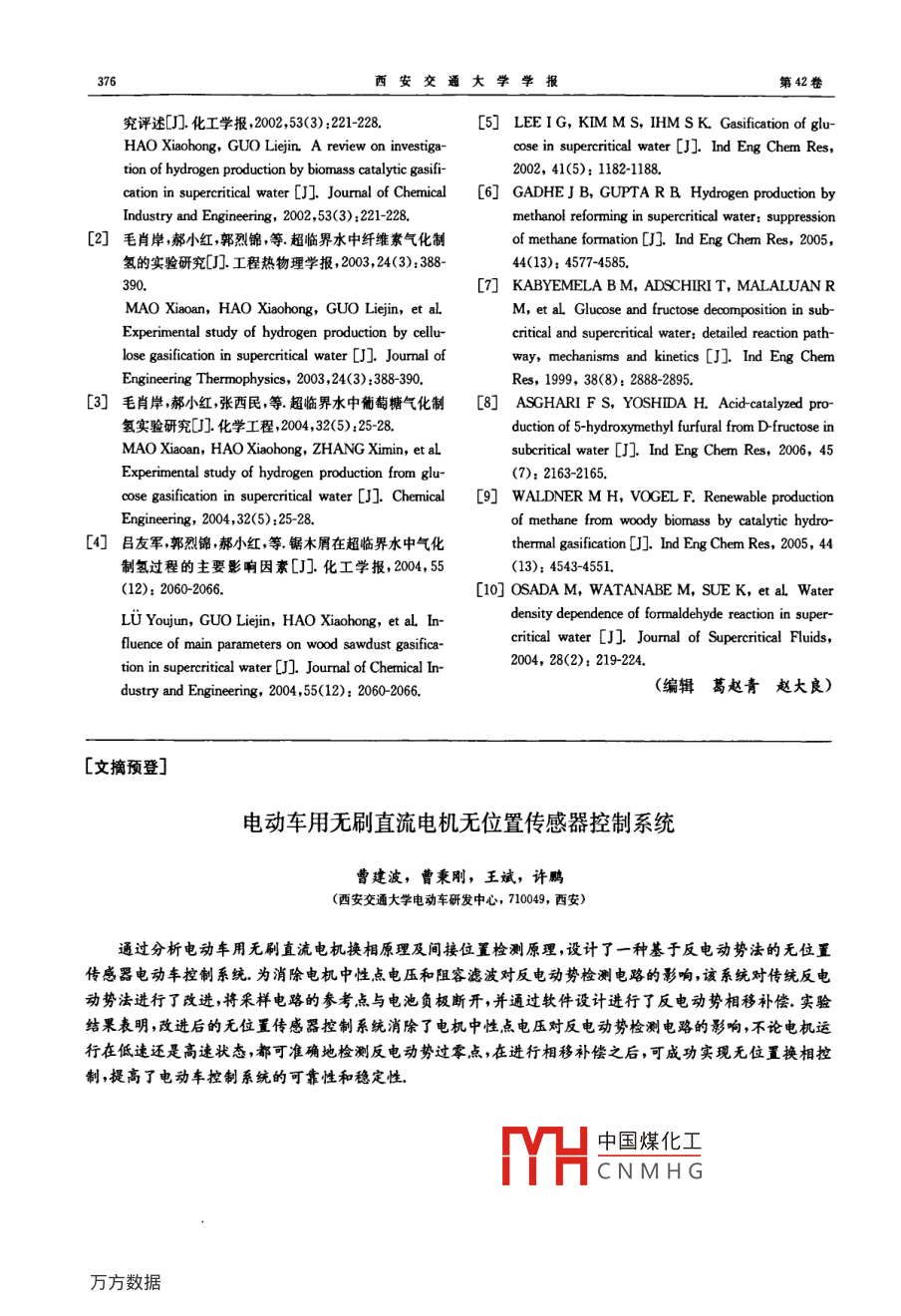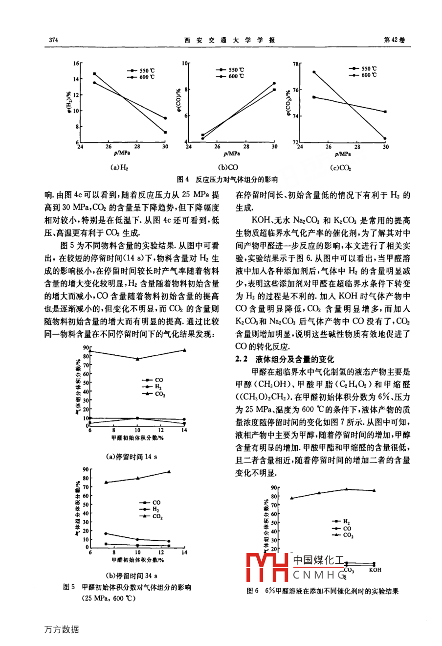 第42卷第3期西安交通大學(xué)學(xué)報(bào)VoL 42 No32008年3月JOURNAL OF XI AN JIAOTONG UNIVERSITYMar.2008超臨界水中甲醛氣化的實(shí)驗(yàn)研究張國(guó)妮2,張軍,徐益謙(1.東南大學(xué)熱能工程研究所,210096,南京;2.中石化集團(tuán)南京設(shè)計(jì)院,210048,南京)摘要:以葡萄糖在超臨界水氣化制氫中的中間產(chǎn)物甲醛為對(duì)象,研究了其在超臨界水中的氣化過(guò)程.結(jié)果表明:甲醛氣化生成的氣體產(chǎn)物主要成分是H2、CO2和CO,液體產(chǎn)物主要成分是CH3OHCH3OCH2OCH3和CH3OOCH;反應(yīng)溫度、壓力、時(shí)間以及物料含量對(duì)反應(yīng)產(chǎn)物存在影響,其中壓力和物料含量對(duì)氣化過(guò)程影響較大;低壓下低溫有利于H2生成,高壓下高溫更有利于H2生成;反應(yīng)時(shí)間長(zhǎng)、甲醛初始含量低亦有利于H2的生成根據(jù)氣化后的氣、液態(tài)產(chǎn)物及其含量,確定了甲醛在超臨界水中氣化轉(zhuǎn)換的路徑關(guān)鍵詞:超臨界水;甲醛;氣化中圖分類號(hào):TK91文獻(xiàn)標(biāo)志碼:A文章編號(hào):0253-987X(2008)03037205Experimental Research on Formaldehyde gasification in Supercritical WaterZHANG Guoni,2, ZHANG Jun, XU Yiqian'1. Institute of Thermal Energy Engineering, Southeast University, Nanjing 210096, ChinaAbstract: The gasification of formaldehyde, one of main intermediate products in supercriticalwater gasification of glucose, was investigated under the condition of supercritical water. The re-sults show that during the gasification of formaldehyde the primary components include H2, coand CO in the gaseous products, and CH3OH, CH3 OCH2 OCH, and CH; OOCH in the liquorproducts. The products mainly depend on the temperature, pressure, resident time in the reac-tor, and the solution concentration, especially on the pressure and the solution concentration inthe gasification process. According to the products and their contents in gas and liquor, thetransferring pathway of formaldehyde in supercritical water can be identified.Keywords: supercritical water; formaldehyde; gasification利用生物質(zhì)制氫是當(dāng)前生物質(zhì)能利用研究的主程的主要條件以及如何提高氣化產(chǎn)率上20,而對(duì)氣要方向之一生物質(zhì)制氫技術(shù)可以分為兩類,一類是化反應(yīng)機(jī)理的研究很少1.從已有的采用模型化合利用熱物理化學(xué)原理和技術(shù)制取氫氣,另一類是利物葡萄糖的研究結(jié)果口來(lái)看其在超臨界水中的氣用生物途徑轉(zhuǎn)換來(lái)制取氫氣生物質(zhì)在超臨界水條化分解過(guò)程主要分為3步,首先是分解成分子較大件下氣化制氫,其氣化率可達(dá)到100%氣體產(chǎn)物中的成分如5HMF和甘油醛這些中間產(chǎn)物再進(jìn)一H2的體積分?jǐn)?shù)甚至可超過(guò)50%,反應(yīng)不生成焦油步分解成分子較小的成分,如甲醛、甲醇、蟻酸等隨等副產(chǎn)品,不會(huì)產(chǎn)生二次污染,對(duì)高含水量的濕生物后這些小分子成分再通過(guò)直接分解或與水反應(yīng)最終質(zhì)可以直接氣化不需要高能耗的干燥過(guò)程,由此生成氣體但對(duì)各步的具體反應(yīng)過(guò)程及其影響因素引起了國(guó)內(nèi)外學(xué)者的廣泛關(guān)注目前對(duì)生物質(zhì)超臨還缺少基本了解甲醛是生物質(zhì)超臨界水氣化過(guò)程界水氣化制氫的研究,主要集中在確定影響氣化過(guò)的中國(guó)煤化工小,轉(zhuǎn)換過(guò)程相對(duì)簡(jiǎn)CNMHG收稿日期:2007-08-23.作者簡(jiǎn)介:張國(guó)妮(1976-),女,碩土生;張牛系人,男教僅,得工生導(dǎo)師.基金項(xiàng)目:國(guó)家重點(diǎn)基礎(chǔ)研究發(fā)展規(guī)劃資助項(xiàng)目(2003CB214500)第3期張國(guó)妮等:超臨界水中甲醛氣化的實(shí)驗(yàn)研究373單,為此本文以甲醛為對(duì)象研究其在超臨界水中的降;CO的含量隨溫度的變化略有起伏,但含量始反應(yīng)過(guò)程終很高,其體積分?jǐn)?shù)基本保持在70%以上(如圖21實(shí)驗(yàn)所示)反應(yīng)時(shí)間對(duì)氣體組分的組成沒(méi)有影響,但影響實(shí)驗(yàn)系統(tǒng)如圖1所示將一定含量的甲醛溶液各組分的含量(見(jiàn)圖3):H2含量隨反應(yīng)停留時(shí)間的加人加料罐,反應(yīng)后的產(chǎn)物通過(guò)氣液分離器分離氣延長(zhǎng)而增加;CO的含量隨反應(yīng)停留時(shí)間的變化時(shí)相產(chǎn)物由分離器的上方排出,經(jīng)由濕式氣體流量計(jì)減時(shí)增,在停留25s時(shí)體積分?jǐn)?shù)達(dá)到最大值來(lái)計(jì)量并收集反應(yīng)殘液由分離器的下方排出并收4.87%最小含量出現(xiàn)在16s時(shí),但總體來(lái)看變化集.反應(yīng)器由長(zhǎng)300mm、內(nèi)徑25mm的不銹鋼不大;CO2含量隨反應(yīng)停留時(shí)間的延長(zhǎng)而減少,在(316L)制成使用電加熱方式保證反應(yīng)器的高溫.停留14s時(shí)含量最高體積分?jǐn)?shù)為84.7%,之后隨反應(yīng)器的溫度用與反應(yīng)管外壁接觸的熱電偶測(cè)量,著停留時(shí)間的延長(zhǎng)含量一直減少,在停留時(shí)間為34壓力由壓力傳感器測(cè)量s時(shí)體積分?jǐn)?shù)達(dá)到最小值75.1%實(shí)驗(yàn)用甲醛為分析純將其直接與蒸餾水混合配制成不同含量的溶液作為反應(yīng)物料.對(duì)氣樣和液樣先采用氣相色譜與紅外結(jié)合的方法確定其組分,然后對(duì)氣體產(chǎn)物使用國(guó)產(chǎn)GC9890A氣相色譜儀進(jìn)行氣體組分定量分析,采用TCD熱導(dǎo)檢測(cè)器,高純氬氣作載氣,使用填充柱,TCD