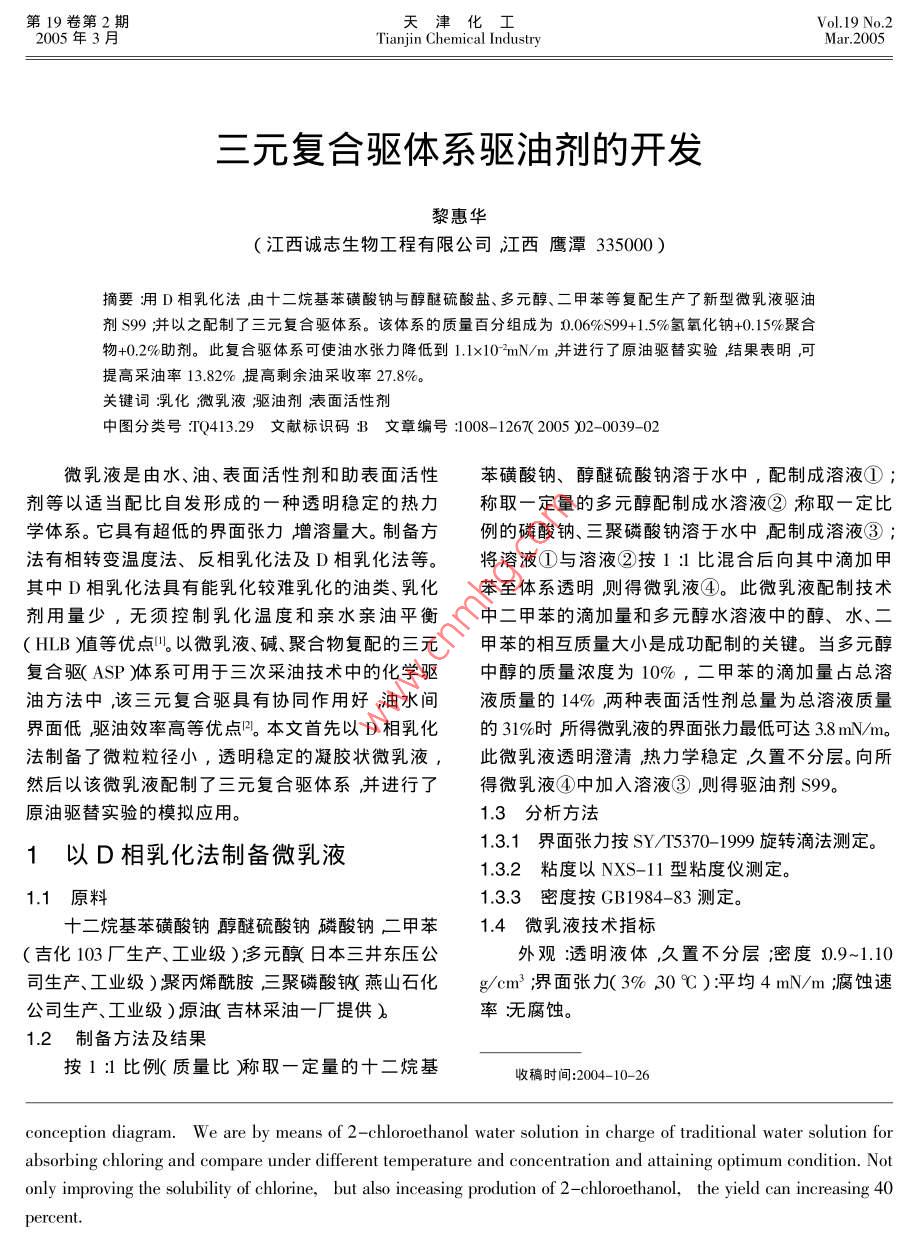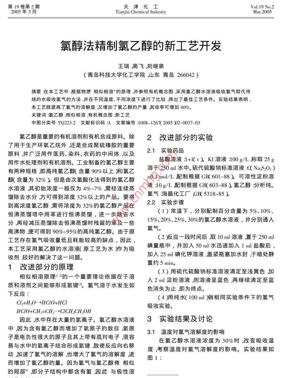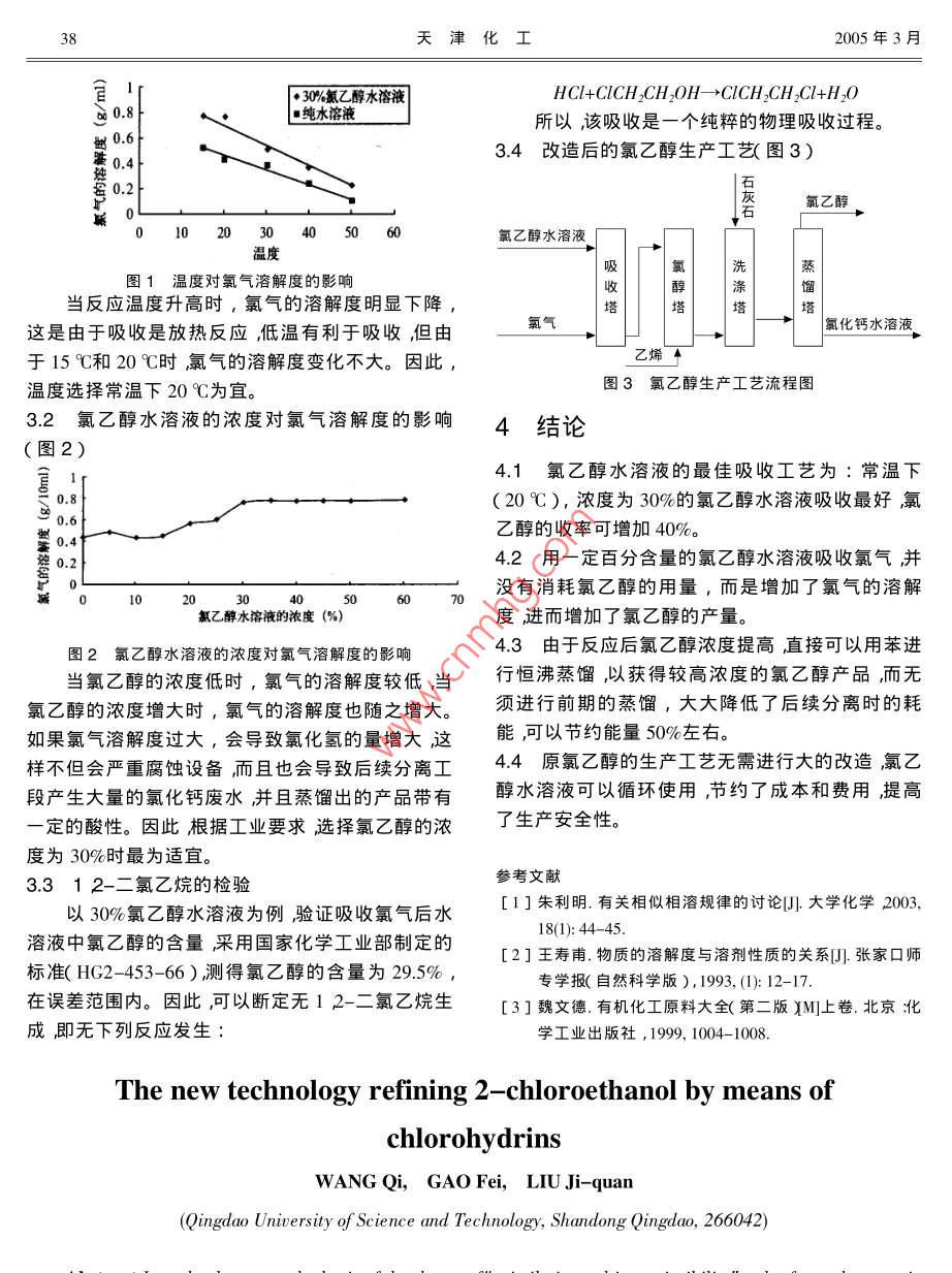 第19卷第2期天津化工Vol 19 No. 22005年3月Tianjin Chemical IndustryMar.2005氯醇法精制氯乙醇的新工藝開發(fā)王琪高飛劉繼泉青島科技大學(xué)化工學(xué)院山東青島266042)摘要迕本工藝中根據(jù)物質(zhì)相似相溶″的原理并參照有機(jī)概念圖采用氯乙醇水溶液吸收氯氣取代傳統(tǒng)的水吸收氯氣的方法并在不同溫度、不同濃度下進(jìn)行了比較得出了最佳工藝條件。實(shí)驗(yàn)結(jié)果本工藝既提高了氯氣的溶解度又增加了氯乙醇的產(chǎn)量其收率可增加40%。關(guān)鍵詞氤乙醇相似相溶洧機(jī)概念圖新工藝中圖分類號rQ223.2文獻(xiàn)標(biāo)識碼:A文章編號∶008-12672005)2-0037-03氯乙醇是重要的有機(jī)溶劑和有機(jī)合成原料。除2改進(jìn)部分的實(shí)驗(yàn)了用于生產(chǎn)環(huán)氧乙烷外還是合成聚硫橡膠的重要原料,并廣泛用作醫(yī)藥、染料、農(nóng)藥的中間體,以及2.1實(shí)驗(yàn)藥品用作水處理劑和有機(jī)溶劑。工業(yè)制備的氯乙醇主要鹽酸溶液+1(v)KI溶液:00g/L稱取25g有兩種規(guī)格即高純氯乙醇(含量90%以上和氯乙于250ml水中。硫代硫酸鈉標(biāo)準(zhǔn)溶液 C Nas,o)醇含量為32%)但是由次氯酸化法得到的氯乙醇01mL配制根據(jù)GB601-88)可溶性淀粉溶水溶液其初始濃度一般僅為4%-7%需經(jīng)連續(xù)蒸液:0g/L配制根據(jù)GB603-88)氯乙醇分析純。餾除去水分方可得到濃度32%以上的產(chǎn)品。要得氯氣海晶化工廠GK5318-85到高濃度氯乙醇需將濃度為32%的氯乙醇產(chǎn)品在22實(shí)驗(yàn)步驟恒沸蒸餾塔中用苯進(jìn)行恒沸蒸餾,進(jìn)一步除去水(1)常溫下,分別配制百分含量為5%、10%、分再經(jīng)減壓蒸餾除去恒沸蒸餾時(shí)殘留的苯及一些15%、20%、25%、30%的氯乙醇水溶液,并分別通入高沸物便可得到90%-95%的高純氯乙醇。由于原氯氣。工藝存在氯氣吸收量低且耗能較高的缺點(diǎn),因此(2販應(yīng)一段時(shí)間后取10m溶液置于250ml本工藝采用氯乙醇的水溶液(原工藝為水)作為吸碘量瓶中,并加入50m水迅速加入1m鹽酸后收劑較好的解決了這一問題。1改進(jìn)部分的原理置約5min3)用硫代硫酸鈉標(biāo)準(zhǔn)溶液滴定至淺黃色加相似相溶原理μ2的一個(gè)重要理論依據(jù)在于溶入2m淀粉溶液則溶液呈藍(lán)色,再繼續(xù)滴定至藍(lán)質(zhì)和溶劑之間能夠形成氬鍵。氯氣溶于水發(fā)生如色消失為止即為終點(diǎn)。下反應(yīng)(4)用純水(100ml)相同實(shí)驗(yàn)條件下的氯氣Cl2+H2O→HCO+HCl吸收實(shí)驗(yàn)HClO+CH=CH,CICHCH OH因此水中存在大量的氫離子。氯乙醇水溶液3實(shí)驗(yàn)結(jié)果及討論中因?yàn)楹新纫掖级黾恿搜踉拥臄?shù)目氧原3.1溫度對氯氣溶解度的影響子是電負(fù)性很大的原子且其上帶有孤對電子很容在氯乙醇水溶液濃度為30%時(shí),改變吸收溫易與水中的氫離子結(jié)合形成氬鍵致使反應(yīng)向右移度,考察溫度對氯氣溶解度的影響。實(shí)驗(yàn)結(jié)果如動(dòng)加速了氯氣的溶解也增大了氯氣的洛解度進(jìn)圖1而增加了氯乙醇的量。因?yàn)槁葰馀c氯乙醇有相似的局部”,即分子結(jié)構(gòu)中都含有氯因此與極性溶天津化工2005年3月E∞副4氯乙醇水溶液HCL+CICH,CH, CH2 CI+H2O所以該吸收是一個(gè)純粹的物理吸收過程。34改造后的氯乙醇生產(chǎn)工藝圖3)氯乙0102030405060氯乙醇水液溫度圖1溫度對氯氣溶解度的影響當(dāng)反應(yīng)溫度升高時(shí),氯氣的溶解度明顯下降氯醇塔塔蒸餾塔這是由于吸收是放熱反應(yīng)低溫有利于吸收但由氯氣氯化鈣水溶液于15℃和20℃時(shí)氯氣的溶解度變化不大。因此乙烯↑溫度選擇常溫下20℃為宜。圖3氯乙醇生產(chǎn)工藝流程圖32氯乙醇水溶液的濃度對氯氣溶解度的影響4結(jié)論(圖2)4.1氯乙醇水溶液的最佳吸收工藝為:常溫下(20℃),濃度為30%的氯乙醇水溶液吸收最好氯乙醇的收率可增加40%。4.2用一定百分含量的氯乙醇水溶液吸收氯氣并沒有消耗氯乙醇的用量,而是增加了氯氣的溶解氯乙醇水溶液的濃度(%)度進(jìn)而增加了氯乙醇的產(chǎn)量圖2氯乙醇水溶液的濃度對氯氣溶解度的影響4.3由于反應(yīng)后氯乙醇濃度提高直接可以用苯進(jìn)當(dāng)氯乙醇的濃度低時(shí),氯氣的溶解度較低當(dāng)行恒沸蒸餾,以獲得較高濃度的氯乙醇產(chǎn)品,而無氯乙醇的濃度增大時(shí),氯氣的溶解度也隨之增大。須進(jìn)行前期的蒸餾,大大降低了后續(xù)分離時(shí)的耗如果氯氣溶解度過大,會(huì)導(dǎo)致氯化氫的量增大這能可以節(jié)約能量50%左右樣不但會(huì)嚴(yán)重腐蝕設(shè)備而且也會(huì)導(dǎo)致后續(xù)分離工4.4原氯乙醇的生產(chǎn)工藝無需進(jìn)行大的改造氰乙段產(chǎn)生大量的氯化鈣廢水并且蒸餾出的產(chǎn)品帶有醇水溶液可以循環(huán)使用節(jié)約了成本和費(fèi)用提高一定的酸性。因此根據(jù)工業(yè)翌求選擇氯乙醇的濃了生產(chǎn)安全性。度為30%時(shí)最為適宜3.312-二氯乙烷的檢驗(yàn)參考文獻(xiàn)以30%氯乙醇水溶液為例險(xiǎn)驗(yàn)證吸收氯氣后水[1]朱利明.有關(guān)相似相溶規(guī)律的討論大學(xué)化學(xué)2003溶液中氯乙醇的含量采用國家化學(xué)工業(yè)部制定的18(1):44-45[2]王壽甫物質(zhì)的溶解度與溶劑性質(zhì)的關(guān)系張家口師標(biāo)準(zhǔn)(HG2-453-66)測得氯乙醇的含量為295%專學(xué)報(bào)(自然科學(xué)版),1993,