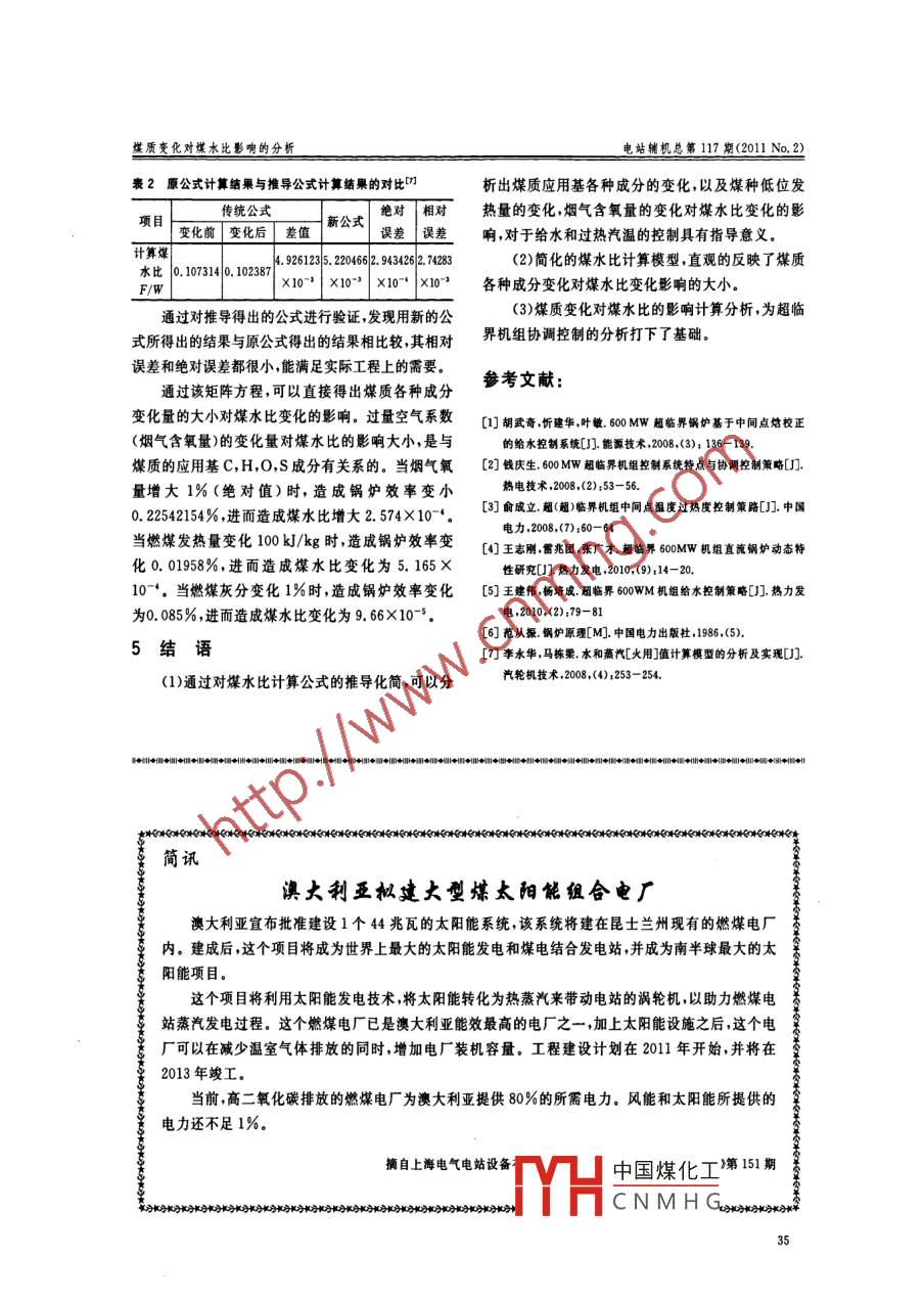 .第32卷第2期電站輔機Vol. 32 No, 22011年6月Power Station Auxiliary EquipmentJun. 2011文章編號:1672 -0210(2011)02- 03-03煤質(zhì)變化對煤水比影響的分析馬棟梁,朱延海(神華江蘇國華陳家港發(fā)電有限公司安全技術(shù)部,江蘇鹽城224631)摘要:煤水比的控制調(diào)節(jié)在給水和過熱汽溫控制中起著決定性的作用。煤質(zhì)的變化對于煤水比數(shù)值的影響很大。目前,煤炭供應(yīng)已日趨緊張,電站鍋爐采用各種煤作為燃料已咸常例。因此,煤質(zhì)的變化會對機組適行產(chǎn)生影.響?,F(xiàn)以謀水比計算公式為基礎(chǔ),推導(dǎo)了因煤質(zhì)變化對煤水比影響的矩陣方程。通過該矩陣方程,可計算出煤質(zhì)中各種成分的變化對煤水比變化的影響大小。對于超臨界機組控制理論及策略的研究具有參考意義。關(guān)鍵詞:超臨界;機組;煤質(zhì);煤水比;控制;策略;計算;方程中團分類號:TK265文獻標識碼:AAnalysis on the Influence of Coal Quality against the Coal-water ratioMA Dong ling,ZHU Yanhi(Security Technology Department , Shenhua Jiangsu Guo Hua Chenjagang Power Co. Ltd,Yancheng, Jiangsu, 224631, China)Abstract :The control & regulation of coal-water ratio plays a decisive role in the control of feeding water andsuperheated steam temperature. The changes of coal quality will greatly affect the value of coal-water. Coal supply isincreasing day by day at present and all kinds of coals may be common used in the boilers of power plants. Therefore,the changes of coal quality will greatly afect the operation of power unit. The matrix equation of afected coal-waterratio has been deduced with the change of coal quality based on the calculated formula of coal-water ratio. Throughthis equation, the effective degree of the change of coal components can be calculated against change of coal-waterratio,which has a reference to the research of the control theory and strategy of supercritical power unit.Key words: supercritical; power unit; coal quality; coal- water ratios control; strategy; calculation; equation鍋爐給水和過熱蒸汽溫度,具有重要的意義(1-5。既述超臨界機組由于控制系統(tǒng)的高耦合性,所以常2煤水比計算公式采取比例控制。其中,煤水比的控制調(diào)節(jié)在給水和.現(xiàn)依據(jù)的鍋爐煤水比計算公式,即國家標準電過熱汽溫控制中起著決定性的作用。煤水比不是一站性能試驗規(guī)程(GB10184-88)中的鍋爐煤水比個固定的數(shù)值,而是隨著煤質(zhì)和負荷工況的變化而計算公式0。 計算公式如式1所示:改變的。在煤炭資源日益緊張的今天,鍋爐燃燒的E= n-in(1)燃煤,往往不是設(shè)計時選用的煤種,煤質(zhì)成分的變化W= Qmn對于煤水比數(shù)值的大小影響很大。所以確定煤質(zhì)成式中: in-過熱器出口焓值,kJ/kg;分變化對煤水比數(shù)值影響的大小,進而更好的控制igw一省煤 器進口焓值,kJ/kg;中國煤化工收稿日期:2011-04-01修回 日期:2011-04-27作者簡介:馬棟梁(1982-),男,碩士,工程師,現(xiàn)從事電廠熱控維護方面的,MYHCNMHG33電站輔機總第117期(2011 No.2)給煤量,t/h;b,=dA' b;=du b。 = daw,給水量,t/h;B=[u* (0. 011C +0. 003732S +0. 101H"+Q.- -低位 發(fā)熱量,kJ/kg;0. 0082580* +0.01044N* +0. 01869W>+一鍋爐效率,n=1- 2q一鍋爐五0.007461A*)+ag *ap]dC ,dS ,dH> ,dO" ,dN ,dW* ,dA"項熱損失之和,q2為排煙熱損失,qs為化學(xué)不完全-煤質(zhì)變化以后C,S,H,O,N,水分,灰.燃燒熱損失,q,為機械不完全燃燒熱損失,qs為散分的應(yīng)用基成分變化量;熱損失,qs為其它熱損失。du 一~排煙溫度變化量;3公式的化簡與推導(dǎo)dan一-由于排煙含氧量的變化,過量空氣系數(shù)的變化量;計算煤水比變化量的時候,作如下化簡:dQr-燃料低位 發(fā)熱量的變化量;取q:,gs,96為定值,分別為0.1.0.4、0.32。dqa一機械不完 全燃燒熱損失的變化量.取冷空氣的焓值為30C時的焓值,為39 kJ/Nm'.由于灰渣率所占的份額很小,通常不到10%,所以4公式的計算驗證及分析灰渣率和爐渣含碳量分別取為定值?;以禂?shù)取為以某電廠660MW超臨界機組額定負荷工況為0.1,飛灰系數(shù)ap取為0.9.例進行計算,性能計算的原始數(shù)據(jù)如表1所示:由于目前的電廠鍋爐排煙溫度為110~160 C褰1原始數(shù)撮,在這個溫度范圍之內(nèi),排煙氣體的比熱容變化不校核煤種大,所以可以取為定值。取定在溫度為135 C時的項目符號|單位設(shè)計煤種(神華烏蘭木各種氣體成分的比熱容。(神華石圪臺煤)倫礦煤)經(jīng)過對計算煤水比的公式進行化簡和求導(dǎo),得過熱器出口到如下計算F/W變化量的式子:壓力Pst | MPa26.0326. 03[a-品x這obTst|C|60505溫度《(最)- =當- BQ=>-By +dq.省煤器進口壓力P%| MPa29. 68Q'Qme-in.dQ.省煤器進口溫度T C I294Qmη空預(yù)器出口煙溫| v| C |122.2式中:a1 = 0. 116apyU + 0.011u- 3.467ap爝氣含氧量02| %az = 0. 043apU + 0.003732u - 1. 3anas = 0. 345apU + 0. 101u- 10. 335am”應(yīng)用基含碳量| C| %|57. 6058as =-0.043awv + 0.008258u+ 1. 299aw,應(yīng)用基含氫量| H %|1.59as = 0.01044uas = 0.01869u應(yīng)用基含氧量| 0| % |11.141ar = 0.007461u應(yīng)用基含氮量|N| % |0.680.9ag = 0.011C + 0.003732S + 0.101H' +應(yīng)用基含硫量| S| % |0. 700.80. 008258O + 0.01044Np + 0.01869W> +0. 007461A> +0.116axC" + 0.489apyS' +應(yīng)用基水分w> % |16. 00 .0.345a,H' - 0.043ap,O"應(yīng)用基灰分A”%7.99a, = [0.0889(C +0.375S*) +0. 265H> -低位發(fā)熱量, 」Q. |kJ/k21770230300.03330*](1. 303u- 39)中國煤化工b=dC br=dS' bz =dH'爐渣THCNMHGb.=dO' bs=dN> b。 =dW>34煤質(zhì)變化對煤水比影響的分析電站輔機總第117期(2011 No. 2)表2原公式計算結(jié)