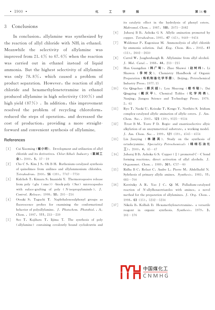 第56卷第10期化工學報2005年10月Journal of Chemical Industry and Engineering ( China)October 2005研究簡報Synthesis of ally lamine in ethanolBingtao(唐炳濤), ZHANG Shufen(張淑芬),YANG(楊錦宗(State Key laboratory of Fine Chemicals, Dalian University of Technology, Dalian 116012, Liaoning, China)Abstract: Allylamine was prepared from the ammonolysis of allyl chloride or the reaction of allyl chloridewith hexamethylenetetramine in ethanol. The selectivity of allylamine was improved from 21.4% to 67. 6%when the reaction was carried out in ethanol instead of liquid ammonia. At the same time, the selectivity ofallylamine was increased from 13. 3% to 67. 6% when the molar ratio of NH to allyl chloride was increasedfrom 4.5: 1 to 25: 1. However, the reaction of allyl chloride and hexamethylenetetramine in ethanolproduced allylamine with high selectivity(100%)and high yield(87%). The synthesis of allylamine fromthe reaction of allyl chloride and hexamethylenetetramine in ethanol was more straightforward andconvenientKey words: allyl chloride; allylamine; synthesis; hexamethylenetetramineCLC number: TQ. 9Document code: AArticle|D:0438-1157(2005)10-1897-04Moreover, allyl alcohol was formed as a by-productIntroductionwhen aqueous ammonia was used for theAllylamine is a versatile organic intermediateamination. Although the selectivity of allylamineIt is useful as a corrosion inhibitor for steel, and by the ammonolysis of allyl alcohol could reachis also used for the synthesis of quinolines[21. The 90%8J, the conversion of allyl alcohol was verypolymer of allylamine can also be molded into low and the reaction conditions were quite severe.microcapsulesl33, polymeric fluorescence probes 4JIn this paper, two more straightforward andand polymeric catalytic carrier[5]. Allylamine is convenient methods of synthesis of allylcommonly prepared from ammonolysis of allyl (1) ammonolysis of allyl chloride in ethanol, andchloride. The process proceeds with low(2)reaction of allyl chloride and hexamethylene-selectivity of allylamine, and the selectivity of thetetramine in ethanol are reported. The results oftransformation to allylamine, diallylamine andexperiments showed that the selectivity of allylamirtriallylamine depends on reaction temperature, reached 78.8% and 100% respectively when NH, andreaction time, molar ratio of NH3/allyl chloridehexamethylenetetramine were usedand molar ratio of CuCl /allyl chlorideExperimentalEthanol, NH.OHFirst author TANG Bingtao, male, born in 1976, PhDnetetramine were analytically pureCorresponding author: Prof. ZHANG Shufen,中國煤化工 d according to thehangshf( chem. dlut, edu. cnmetCNMHGTheFoundation item: supported by Trans-century Training determination of the ratio of allylamineProgram Foundation for the Talents by the State Education methylamine, diallylamine and triallylamine in theCommission and the National Natural Science Foundation of Chinaon of allyl chloride wa(20276009)performed on a HP6890GC/5973MSD·1898化工報第56卷1.2 Ammonolysis of allyl chloride in ethanolGC-MS showed that the product was pureThe ethanol solution saturated with NH3 allylamine(M=57)(11.6%,mass,20C)10,CuCl1(34mg,0.362 Results and discussionmmol) and allyl chloride(0.7 g, 12 mmol)waadded into a stainless steel autoclave reactor 2. 1 Ammonolysis of allyl chloride in ethanolequipped withThe reaction of allyl chloride (AC) andwas kept at the designated temperature, under the ammonia proceeded in series, and the product waspressure of 0.6 MPa. After 8 h, the reactor was a mixture of monoallylamine (MAA), diallylamineallowed to cool down to room temperature and the (DAA)and triallylamine(TAA). When NH, Opressure was released slowly. Analysis of the was used, allyl alcohol was formed as a by-product by GC-MS showed that the conversion of product. The process of the reaction is shown asllyl chloride was 100 %, and the selectivity of the follows and the results are listed in Table 1products was as follows: allylamine (M= 57) CH2=CHCH, CI+NH,+,,=CHCH, NH,+HCl67.6%. diallylamine (M+=97)24.2%andCH=CHCH NH,+CH,=CHCH CItriallylamine (M+=137)8.2%(CH2=CHCH2)2 NH+HCI1.3 Preparation of allylamine from reaction of(CH,-CHCH,),NH+CH,-CHCH, C(CH,=CHCH)3N+HCIin ethanolCH,- CHCH, CI+OHCH,-CHCH, OH+ CIA 500 ml three-necked flask equipped with aThe data in Table 1 show that when ethanolmechanical stirrer, a reflux condenser andwas used as solvent, the selectivity of the reactionthermometer was charged with allyl chloride(11.6 to generate allylamine reached 67.6%,whereasg, 0.15 mol), hexamethylenetetramine (20when liquid ammonia was used, the selectivity was0. 14 mol),0.6 g KI (as catalyst) and 300 ml only 21. 4%, which might be caused by theethanol. The mixture was stirred for 1o h at 40 cfollowing two reasons:(1) the polarity of ethanol60 mlhydrochloric acid waswas useful for stabilizing the -allyl complex ofadded. After another 10 h. the solvents were allyl chloride and CuCl, enhancing the reaction ofremoved under reduced pressure. Then a solution of allyl compounds with nucleophiles[Il(2)th25.3 g sodium hydroxide in 250 ml water was strong exothermic amination reaction could takeslowly added to the reaction mixture, and the place in a mild condition where the concentration offraction (52)was collected. The fraction the reactants was diluted by adding solvent 133. Thewas dried with anhydrous sodium sulfate to give formation of by-product allyl alcohol was due to the6. 7 g product (84%). Analysis of the product by hydrolysis of allyl chloride when NH, OH wasTable 1 Results of ammonolysis of allyl chlorideTem/CTime/hMAA/%DAA/%DTAA/%NHs25:161.017.625:1中國煤化工2.2CNMHG33. 513.356.4ethanol1:10025:178.817.4O Content of allyl alcohol was 1.9 %; @ Conversion of allyl chloride was 57. 1%: Yield of allylamine was 50. 7% when amount of allylincreased from 0.9 g to 9 g: Mass percent, determined by GC-MS analysis of product第10期TANG Bingtao et al: Synthesis of allylamine in ethanol1899·used