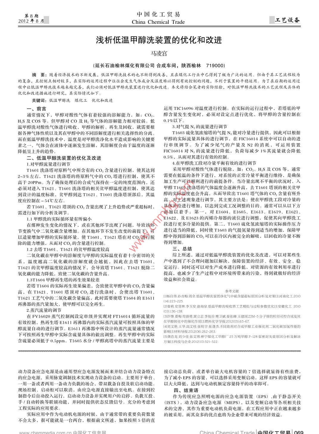 中國化工貿(mào)易工藝設(shè)備第8期China chemical trade2012年8月化工廠中應(yīng)急電源(EPS)的選用臧云峰(中國石化工程建設(shè)公司,北京100101)、EPS( Emergency Power Supply)的工作原理要,這也是之前大多數(shù)設(shè)計(jì)人員,選用UPS為重要的電動(dòng)機(jī)負(fù)荷供電般情況下EPS由兩路市電回路供電,主要由整流充電器、蓄電的重要原因。UPS的特點(diǎn)就是,穩(wěn)壓穩(wěn)頻,逆變器長期在線熱運(yùn)行池組、逆變器,互投裝置等部分組成;在市電正常時(shí),由市電經(jīng)過輸僅在故障時(shí)才轉(zhuǎn)為旁路供電,不存在電源切換短時(shí)斷電的問題,其工出切換裝置給重要負(fù)荷供電,同時(shí)充電器為蓄電池進(jìn)行充電或浮充;程實(shí)踐上原理如當(dāng)市電斷電后或電壓超出供電范圍,控制器啟動(dòng)逆變器,同時(shí)輸出切換裝置將市電供電狀態(tài)立即切換到逆變器供電,為負(fù)荷設(shè)備提供應(yīng)急供電;當(dāng)市電恢復(fù)時(shí),應(yīng)急電源將恢復(fù)為市電供電。其原理如圖郵物一電器人遭氫的人5EPS原理圖工程實(shí)際中應(yīng)用的通用型應(yīng)急電源(EPS)是采用最新電力電子產(chǎn)品及應(yīng)用技術(shù),以單片機(jī)系統(tǒng)及專用控制芯片為核心的智能化集中UPS原理圖二、EPS現(xiàn)階段在化工廠中的應(yīng)用但是,對于化工廠需要用應(yīng)急電源或者不間斷電源供電的重要負(fù)EPsS的特點(diǎn)是持續(xù)供電能力強(qiáng),耐惡劣環(huán)境(防水、防火、防塵、荷來講,其重要性大多數(shù)體現(xiàn)在工藝流程中的某些關(guān)鍵的反應(yīng)步驟或放腐蝕)有輸出回路配置靈活,過載能力強(qiáng),平時(shí)無功率損耗,無熱者關(guān)鍵的操作環(huán)節(jié),對于電動(dòng)機(jī)本身是沒有特別嚴(yán)苛的運(yùn)行要求,與S切換時(shí)備,在對正常電網(wǎng)影響方面,EPS與電網(wǎng)相對隔離,正常時(shí)只起到監(jiān)好選擇造價(jià)高,能耗高,壽命低但是可靠性比較優(yōu)越的UP。因此只間在100~200ms保證不了電動(dòng)機(jī)的控制回路可靠動(dòng)作的要求電網(wǎng)作用。而最新的EPS技術(shù)研究突破了100ms的限制,現(xiàn)在對于特殊有切在化工廠的實(shí)際工程設(shè)計(jì)中,由于特殊的環(huán)境條件,相當(dāng)一部分換時(shí)間要求的電動(dòng)機(jī)電源,加裝靜態(tài)開關(guān)ISTS,如此一來,切換時(shí)間大大減少,可以達(dá)到5ms以下,完全可以滿足電動(dòng)機(jī)的控制要求。增的裝置區(qū)內(nèi)都劃分為火災(zāi),爆炸危險(xiǎn)環(huán)境;因此為了在事故情況下保加了sTs的工程應(yīng)用上的EPS原理圖如下障人員及財(cái)產(chǎn)的安全,有效地制止災(zāi)害或事故的蔓延提供可靠供電通常會(huì)設(shè)置應(yīng)急照明及疏散指示等,作為消防應(yīng)急電源及事故應(yīng)急電源,由于這部分負(fù)載基本都是各種的燈具或者饋電電源,其對于電源切換時(shí)間的要求不是很高,因此適合采用EPS,這方面的應(yīng)用在實(shí)際中比較廣泛。三、EPS在化工廠中應(yīng)用的發(fā)展隨著EPS在切換時(shí)間,輸出電能質(zhì)量等各項(xiàng)技術(shù)上的日益完善化工廠中也開始逐步采用其為重要的電動(dòng)機(jī)負(fù)荷供電。32A/3P這就涉及到EPS的選型問題,傳統(tǒng)的為EPS應(yīng)急照明饋線負(fù)荷供電容量比較容易確定。當(dāng)其為電動(dòng)機(jī)負(fù)荷供電的時(shí)候,就需要遵循如下的當(dāng)負(fù)載為多臺(tái)電動(dòng)機(jī)且都同時(shí)啟動(dòng)時(shí),EPS容量=變頻啟動(dòng)電動(dòng)除此之外,在化工廠工程應(yīng)用中,對于切換要求不是很高的重要電動(dòng)機(jī)負(fù)機(jī)功率之和+軟啟動(dòng)電動(dòng)機(jī)功率之和×20+星三角啟動(dòng)機(jī)功率之和x荷,還可以采用專門為電動(dòng)機(jī)負(fù)荷設(shè)計(jì)的動(dòng)力設(shè)備應(yīng)急電源MEPS3+直接啟動(dòng)電動(dòng)機(jī)之和×5倍2當(dāng)負(fù)載多臺(tái)電動(dòng)機(jī)且都分別單臺(tái)啟動(dòng)時(shí)(不是同時(shí)啟動(dòng),EPS容量=各個(gè)電動(dòng)機(jī)功率之和但必須滿足以下條件:※直接啟動(dòng)的最大的單臺(tái)電動(dòng)機(jī)功率不大于EPS容量的1/7;I MEPS※星三角啟動(dòng)的最大的單臺(tái)電動(dòng)機(jī)功率不大于EPS容量的1/4;※軟啟動(dòng)的最大的單臺(tái)電動(dòng)機(jī)功率不大于EPS容量的1/3;※變頻啟動(dòng)的最大的單臺(tái)電動(dòng)功率不大于EPS的容量;實(shí)際設(shè)計(jì)中,應(yīng)按上述條件中的最大值調(diào)整EPS的容量,電動(dòng)機(jī)啟動(dòng)時(shí)的順序?yàn)橹苯訂?dòng)在先,其次是星三角的啟動(dòng)有軟啟動(dòng)的再啟動(dòng),最后是變頻啟動(dòng)的再啟動(dòng)。確定了EPS的容量,下面要做的就是確定備用時(shí)間,和針對負(fù)荷的選型一般化工廠工藝負(fù)荷,備用時(shí)間要求30-60分鐘,對于EPS負(fù)載MEPS原理圖為重要的電動(dòng)機(jī)負(fù)荷時(shí),市電和逆變器供電的切換時(shí)間就顯得尤為重中國化工貿(mào)易2012年8月China chemical trade工藝設(shè)備淺析低溫甲醇洗裝置的優(yōu)化和改進(jìn)馬凌宮延長石油榆林煤化有限公司合成車間,陜西榆林719000)摘要:隨著經(jīng)濟(jì)技術(shù)的不斷發(fā)展,低溫甲醇洗技術(shù)的也不斷得到改善,且在煤仳