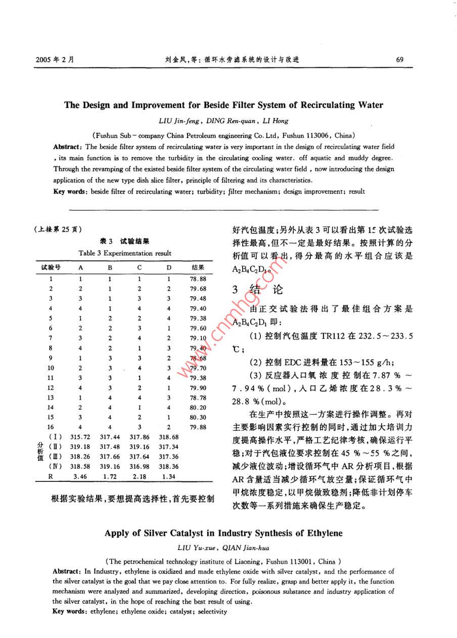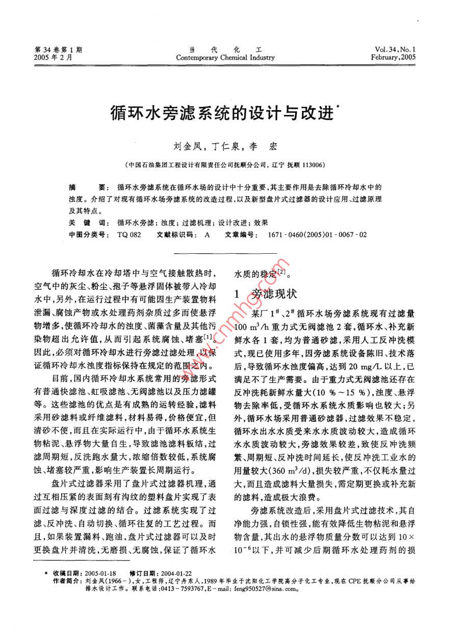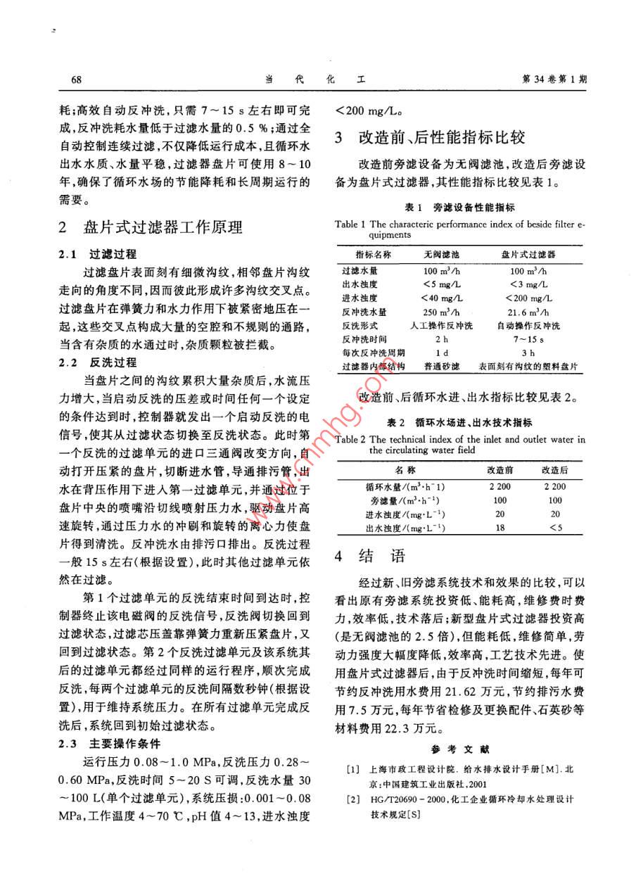 第34卷第1期當(dāng)代化工Vol. 34, No. 12005年2月Contemporary Chemical IndustryFebruary, 2005循環(huán)水旁濾系統(tǒng)的設(shè)計與改進(jìn)劉金鳳,丁仁泉,李宏(中國石油集團(tuán)工程設(shè)計有限責(zé)任公司撫順分公司,遼寧撫順113006)要:循環(huán)水旁濾系統(tǒng)在循環(huán)水場的設(shè)計中十分重要,其主要作用是去除循環(huán)冷卻水中的濁度。介紹了對現(xiàn)有循環(huán)水場旁濾系統(tǒng)的改造過程,以及新型盤片式過濾器的設(shè)計應(yīng)用、過濾原理及其特點關(guān)鍵詞:循環(huán)水旁濾;濁度;過濾機(jī)理;設(shè)計改進(jìn);效果中圖分類號:TQ082文獻(xiàn)標(biāo)識碼:A文章編號:1671-0460(2005)01-0067-02循環(huán)冷卻水在冷卻塔中與空氣接觸散熱時,水質(zhì)的穩(wěn)定2空氣中的灰塵粉塵、孢子等懸浮固體被帶入冷卻水中,另外,在運(yùn)行過程中有可能因生產(chǎn)裝置物料1旁濾現(xiàn)狀泄漏、腐蝕產(chǎn)物或水處理藥劑雜質(zhì)過多而使懸浮某廠1#、2#循環(huán)水場旁濾系統(tǒng)現(xiàn)有過濾量物增多,使循環(huán)冷卻水的濁度、菌藻含量及其他污100m3/h重力式無閥濾池2套,循環(huán)水、補(bǔ)充新染物超出允許值,從而引起系統(tǒng)腐蝕、堵塞(1]。鮮水各1套,均為普通砂濾,釆用人工反沖洗模因此,必須對循環(huán)冷卻水進(jìn)行旁濾過濾處理,以保式,現(xiàn)已使用多年,因旁濾系統(tǒng)設(shè)備陳舊、技術(shù)落證循環(huán)冷卻水濁度指標(biāo)保持在規(guī)定的范圍之內(nèi)。后,導(dǎo)致循環(huán)水濁度偏高,達(dá)到20mg/以上,已目前,國內(nèi)循環(huán)冷卻水系統(tǒng)常用的旁濾形式滿足不了生產(chǎn)需要。由于重力式無閥濾池還存在有普通快濾池、虹吸濾池、無閥濾池以及壓力濾罐反沖洗耗新鮮水量大(10%~15%),濁度、懸浮等。這些濾池的優(yōu)點是有成熟的運(yùn)轉(zhuǎn)經(jīng)驗,濾料物去除率低,受循環(huán)水系統(tǒng)水質(zhì)影響也較大;另采用砂濾料或纖維濾料,材料易得,價格便宜,但外,循環(huán)水場采用普通砂濾器,過濾效果不穩(wěn)定,清砂不便,而且在實際運(yùn)行中,由于循環(huán)水系統(tǒng)生循環(huán)水出水水質(zhì)受來水水質(zhì)波動較大,造成循環(huán)物粘泥、懸浮物大量自生,導(dǎo)致濾池濾料板結(jié),過水水質(zhì)波動較大,旁濾效果較差,致使反沖洗頻濾周期短,反洗跑水量大,濃縮倍數(shù)較低,系統(tǒng)腐繁、周期短、反沖洗時間延長,使反沖洗工業(yè)水的蝕、堵塞較嚴(yán)重,影響生產(chǎn)裝置長周期運(yùn)行。用量較大(360m3/d),損失較嚴(yán)重,不僅耗水量過盤片式過濾器采用了盤片式過濾器機(jī)理,通大,而且造成濾料大量損失,需定期更換或補(bǔ)充新過互相壓緊的表面刻有溝紋的塑料盤片實現(xiàn)了表的濾料,造成極大浪費(fèi)。面過濾與深度過濾的結(jié)合。過濾系統(tǒng)實現(xiàn)了過旁濾系統(tǒng)改造后,采用盤片式過濾技術(shù),其自濾、反沖洗、自動切換、循環(huán)往復(fù)的工藝過程。而凈能力強(qiáng),自鎖性強(qiáng),能有效降低生物粘泥和懸浮且,如果裝置漏料、跑油,盤片式過濾器可以及時物含量,其出水的懸浮物質(zhì)量分?jǐn)?shù)可以達(dá)到10×更換盤片并清洗,無磨損、無腐蝕,保證了循環(huán)水10-6以下,并可減少后期循環(huán)水處理藥劑的損·收橫日期:200501-18修訂日期:200401-22作者簡介:劉金風(fēng)(1966-),女,工程師,遼寧丹東人,1989年畢業(yè)于沈陽化工學(xué)院高分子化工專業(yè),現(xiàn)在CPE撫順分公司從事給排水設(shè)計工作。聯(lián)系電話:0413-7593767,E-mail:feng950527@當(dāng)代化工第34卷第1期耗:高效自動反沖洗,只需7~15s左右即可完<200mgL。反自動控制連續(xù)過濾,不僅降低運(yùn)行成本,且循水3改造前、后性能指標(biāo)比較出水水質(zhì)、水量平穩(wěn),過濾器盤片可使用8~10改造前旁濾設(shè)備為無閥濾池,改造后旁濾設(shè)年,確保了循環(huán)水場的節(jié)能降耗和長周期運(yùn)行的備為盤片式過濾器,其性能指標(biāo)比較見表1需要表1旁濾設(shè)備性能指標(biāo)2盤片式過濾器工作原理Table 1 The characteric performance index of beside filter e-quipments21過濾過程指標(biāo)名稱無閥濾池盤片式過濾器過濾盤片表面刻有細(xì)微溝紋,相鄰盤片溝紋過濾水量100m3h走向的角度不同,因而彼此形成許多溝紋交叉點<3 mg/L進(jìn)水濁度<40mg氣<200mg/L過濾盤片在彈簧力和水力作用下被緊密地壓在反沖洗水量21.6m3h起,這些交叉點構(gòu)成大量的空腔和不規(guī)則的通路,反洗形式工操作反沖洗自動操作反沖洗當(dāng)含有雜質(zhì)的水通過時,雜質(zhì)顆粒被攔截。反沖洗時間7~15s每次反沖洗周期2.2反洗過程過濾器內(nèi)部結(jié)構(gòu)普通砂濾表面刻有溝紋的塑料盤片當(dāng)盤片之間的溝紋累積大量雜質(zhì)后,水流壓力增大,當(dāng)啟動反洗的壓差或時間任何一個設(shè)定改造前、后循環(huán)水進(jìn)、出水指標(biāo)比較見表2的條件達(dá)到時,控制器就發(fā)出一個啟動反洗的電表2循環(huán)水場進(jìn)、出水技術(shù)指標(biāo)信號使其從過濾狀態(tài)切換至反洗狀態(tài)。此時第 Table 22 The technical index of the inlet and outlet water i個反洗的過濾單元的進(jìn)口三通閥改變方向,自the circulating water field動打開壓緊的盤片,切斷進(jìn)水管,導(dǎo)通排污管,出改