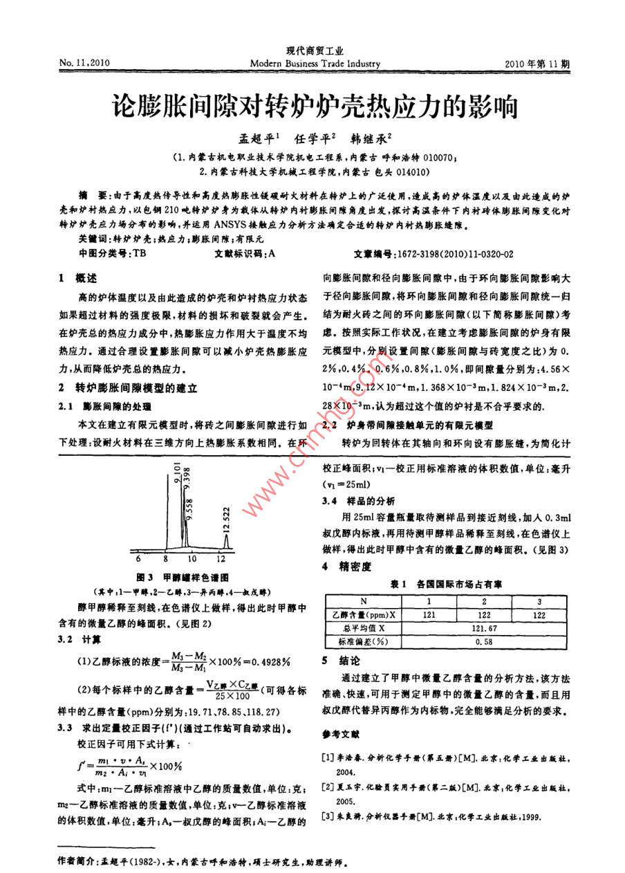 現(xiàn)代商貿(mào)工業(yè)No.11,2010Modern Business Trade Industry2010年第11期甲醇中微量乙醇測(cè)定方法的應(yīng)用研究許增輝中國石滷吐哈油田分公司甲醇廠,新疆吐魯番838202)摘要:介紹了用安捷倫6890N氣相色譜儀分析甲醇中微量乙醇含量的分析方法的優(yōu)化,該方法能有效消除常規(guī)方法中存在的理論誤差和方法誤差,這種新的方法在生產(chǎn)實(shí)踐中起到了很好的效果關(guān)鍵詞:氣相色譜;甲醇;內(nèi)標(biāo)法中圖分類號(hào):TB文獻(xiàn)標(biāo)識(shí)碼:A文章編號(hào):1672-3198(2010)11-0319-01用色譜內(nèi)標(biāo)法測(cè)量甲醇中微量乙醇含量是最常用的方1.2試驗(yàn)條件法,能對(duì)樣品中的各組分進(jìn)行分別分離,有選擇性高、分離1)儀器:安捷倫6890N氣相色譜儀;色譜柱:530系列效能高、靈敏度高、分析速度快、樣品用量少、重復(fù)性好等特毛細(xì)管柱,30m*0.53mn0.88(長度內(nèi)徑←膜厚)點(diǎn)。采用氣相色譜法分析甲醇中微量乙醇含量能夠及時(shí)(2)柱溫:120℃;檢測(cè)室溫:300℃準(zhǔn)確地將數(shù)據(jù)提供給生產(chǎn)部門。實(shí)際分析中我們常常采用(3)進(jìn)樣量:1.0ul;載氣:氮?dú)?尾吹氣流速:30ml/mir異丙醇作為內(nèi)標(biāo)物來測(cè)量甲醇中的微量乙醇含量,但是,在氫氣流速:40ml/min;空氣流速:400ml/min實(shí)際應(yīng)用中我們發(fā)現(xiàn)我廠生產(chǎn)的甲醇中不僅含有微量乙(4)試劑:乙醇(色譜純),異丙醇(色譜純)甲醇(色譜醇還含有微量的異丙醇(見圖1),這樣,再用異丙醇作為內(nèi)純),叔戊醇(色譜純)標(biāo)物必定會(huì)影響到分析結(jié)果的準(zhǔn)確度,這就要求我們必須2試驗(yàn)方法找到一個(gè)更加合適的物質(zhì)作為內(nèi)標(biāo)物。經(jīng)過研究我們最終2.1定性方法發(fā)現(xiàn)用叔戊醇做內(nèi)標(biāo)物是一個(gè)理想的選擇該方法采用保留時(shí)間定性。即在一定的和操作條件(如柱溫、柱長、柱內(nèi)經(jīng)、載氣流速等)不變時(shí),任何一種物質(zhì)都有確定的保留時(shí)間tR,測(cè)定時(shí)只要在相同的操作條件,分別測(cè)出已知物和未知樣品的保留值,在未知樣品色譜圖中對(duì)應(yīng)于已知物保留值的位置上,若有峰出現(xiàn),則可判斷樣品含有此已知物組分2.2定量方法該方法采用內(nèi)標(biāo)法定量。內(nèi)標(biāo)法是選擇一種樣品中不圖1甲醇罐樣色譜圖存在的物質(zhì)(純)做內(nèi)標(biāo)物,定量地加人到已知質(zhì)量的樣品(其中:1-平醇2—乙,3一異醇)中,測(cè)定內(nèi)標(biāo)物和樣品中組分的峰面積,引入質(zhì)量校正因子,就可計(jì)算樣品中待測(cè)組分的質(zhì)量百分?jǐn)?shù)3實(shí)驗(yàn)部分3.1配制標(biāo)準(zhǔn)樣(1)叔戊醇內(nèi)標(biāo)溶液的制備:用100ml容量瓶量取色譜醇甲醇接近刻線,加0.5m叔戊醇,再用色譜醇甲醇定容到100ml(2)乙醇標(biāo)液的制備:①稱取空容量瓶(100m)得到其圖2加入內(nèi)標(biāo)物叔戊醇之后的甲醇標(biāo)樣色譜峰質(zhì)量為M1=51.8134g,②稱取空容量瓶+甲醇(接近刻線)的質(zhì)量為M2=130.2714g。③稱取100ml容量瓶+甲(其中:1一甲囀,2一乙,3一異丙醇,4一叔戊畔)醇+0.5ml乙醇(用m移液管準(zhǔn)確移取)的總質(zhì)量M3=1方法概述130.6600,計(jì)算乙醇標(biāo)液的濃度1.1方法原理(3)不同濃度乙醇溶液的制備:①空白溶液的制備,用將被稱為內(nèi)標(biāo)物的物質(zhì)s(權(quán)戊醇)加入到樣品中進(jìn)行移液管準(zhǔn)確移取0.3ml叔戊醇內(nèi)標(biāo)液加色譜醇甲醇至色譜分析后用組分(乙醇)和內(nèi)標(biāo)物s各自的相對(duì)校正因25ml至刻線,在色譜儀上做樣,得出此不加乙醇標(biāo)液時(shí)色譜子校準(zhǔn)其峰值,按下式計(jì)算組分i的質(zhì)量百分含量的方法醇甲醇中含有的微量乙醇的蜂面積。②用移液管準(zhǔn)確移取就是內(nèi)標(biāo)定量法。03ml叔戊醇內(nèi)標(biāo)液、0.1ml乙醇標(biāo)液至25ml容量瓶中,用由內(nèi)標(biāo)法公式可知:色譜醇甲醇稀釋至刻線,在色譜儀上做樣,得出此時(shí)甲醇中x-m×:A×10%式中,四內(nèi)標(biāo)物的質(zhì)量;音有的微量乙醇的面積,⑤稚確移取0河叔皮內(nèi)標(biāo)f乙醇的校正因子;m一樣品質(zhì)量;fs內(nèi)標(biāo)物的校正因子;Ai乙醇的峰面積;As內(nèi)標(biāo)物的峰面積??叹€,在色譜儀上做樣,得出此時(shí)甲醇中含有的微量乙醇的峰面積④0.3m叔戊醇內(nèi)標(biāo)液+0.6ml乙醇標(biāo)液,用色譜作者簡(jiǎn)介:許增輝(1976—),女,新疆吐魯番人,大專,中國石油吐哈油田分公司甲醇廠,助理工程師研究方向:甲醇分析現(xiàn)代商貿(mào)工業(yè)Modern Business Trade Industr2010年第11期論膨脹間隙對(duì)轉(zhuǎn)爐爐殼熱應(yīng)力的影響孟超平1任學(xué)平2韓繼承(1.內(nèi)蒙古機(jī)電職業(yè)技術(shù)學(xué)院機(jī)電工程系,內(nèi)蒙古呼和浩特0100702.內(nèi)蒙古科技大學(xué)機(jī)械工程學(xué)院,內(nèi)蒙古包頭014010)擴(kuò)要:由于高度熱傳導(dǎo)性和高度熱膨脹性鏝磯耐火材料在特爐上的廣泛使用,逵成高的爐體溫度以及由此造咸的爐殼和爐襯熱應(yīng)力,以包鋼210噸特爐爐身為載體從轉(zhuǎn)爐內(nèi)襯膨脹間隙角度出發(fā),探討高溫條件下內(nèi)襯磚體膨脹間隙變化對(duì)轉(zhuǎn)爐爐殼應(yīng)力場(chǎng)分布的影響,并運(yùn)用 ANSYS接觸應(yīng)力分析方法確定合適的轉(zhuǎn)爐內(nèi)襯熱膨脹縫