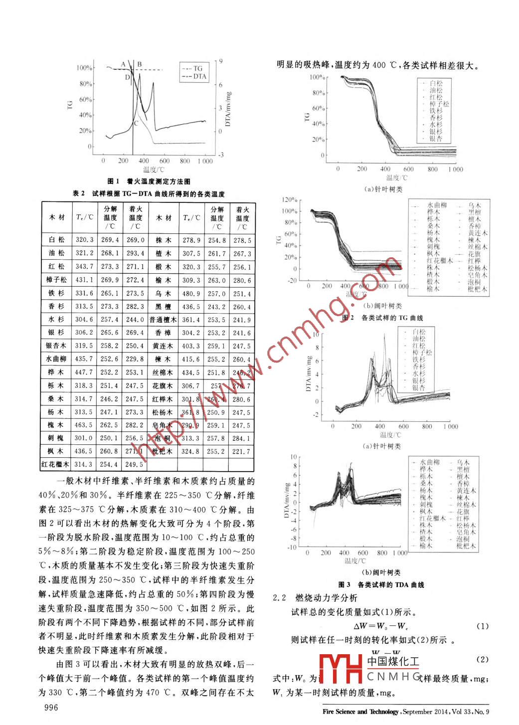 消防理論研究常用實木家具木質(zhì)類生物質(zhì)的熱重分析殷飛12,3,朱國慶23(1.中國礦業(yè)大學(xué)安全工程學(xué)院,江蘇徐州22116;2.中國礦業(yè)大學(xué)消防工程研究所,江蘇徐州22116;3.中國礦業(yè)大學(xué)煤礦瓦斯與火災(zāi)防治教育部重點實驗室,江蘇徐州221116)摘要:采用熱重分析法對35種常用實木家具木質(zhì)類生保護,以10℃/min升溫速率從10℃升至1000℃并保物質(zhì)的熱解過程進行研究,確定其失重規(guī)律、著火溫度和燃燒溫2min,實驗結(jié)束后經(jīng)恒溫水浴降至室溫。樣品質(zhì)量5動力學(xué)方程,并對比分析針葉樹類和闊葉樹類生物質(zhì)的失重規(guī)~6mg,天平精度1.0×10‘g。參比物質(zhì)為a-Al2O3。律。DTA曲線顯示大多教試樣著火溫度比分解溫度高20~30表1樣品種類及質(zhì)量統(tǒng)計℃。結(jié)果表明:常用實木家具木質(zhì)類生物質(zhì)的失重分為脫水、木材平均質(zhì)量/mg木質(zhì)名稱平均質(zhì)量/mg穩(wěn)定、快速失重和慢速失重4個階段;其熱解機理滿足一階反白松紅花檻木5.3應(yīng)動力學(xué)方程,在高溫區(qū)域,活化能和頻率因子擬合方程相美油松系數(shù)接近1;活化能約為65~85kJ/(mol·K),而頻率因子變紅松5.5楂木5.4化范圍較大。為室內(nèi)火災(zāi)特性的研究提供基礎(chǔ)數(shù)據(jù)。樟子松5.4椴木關(guān)鍵詞:木質(zhì)美生物質(zhì);家具;燃燒特性,著火溫度;熱重鐵杉5.4榆木分析5.5中圖分類號:X9134,TK121文獻標志碼:A水杉5.4黑擅5.1文章編號:1009-0029(2014)09-0995-04銀杉普通檀木5.4銀杏木香樟我國提出加快城市化和小城鎮(zhèn)化建設(shè)步伐的舉措,水曲柳黃連木將進一步促進住宅建設(shè),為各類家具提供了發(fā)展空間。樺木5.7揀木5.2實木家具因其自然的材質(zhì)、天然、無化學(xué)污染的特性,迎5.1絲棉木合現(xiàn)代都市人崇尚自然的心理將得到廣泛的使用。5.4花旗木5.4實木家具的使用,加大了室內(nèi)可燃物的載荷給建筑楊木5.1紅棒木5.7物的防火安全留下了火災(zāi)隱患。目前,國際上許多國家槐木松楊木都在對室內(nèi)材料的火災(zāi)特性展開研究并建立火災(zāi)數(shù)據(jù)刺槐5.7皂角木庫,而我國相關(guān)研究機構(gòu)和高校較少起步晚,對火災(zāi)材[楓木56泡桐5.3料特性等方面的研究數(shù)據(jù)較少。筆者對常用實木家具木2實驗結(jié)果與分析質(zhì)類生物質(zhì)進行熱解特性研究得到相對應(yīng)的著火溫度,2.1著火溫度分析擴展了對實木家具燃燒特性的研究,為生物質(zhì)的特性研采用TG-DTA曲線能確定試樣著火溫度,如圖1究和火災(zāi)危險性提供了基礎(chǔ)數(shù)據(jù)。所示。從DTA曲線最初急劇上升點D作垂線,交TG曲1實驗部分線于C點,在該點作切線,交過A點水平線于B點,B點1.1實驗樣品所對應(yīng)的溫度即為著火溫度。試樣的各類溫度如表2所采用35種長江中下游地區(qū)常用實木家具木質(zhì)類生示,可以看出:物質(zhì)。將樣品用植物粉碎機粉碎,分樣篩篩分出100目(1)大多數(shù)試樣著火溫度比分解溫度高20~30℃,以上的樣品粉末至干燥箱內(nèi)50℃環(huán)境下干燥3h,并裝小部分試樣著火溫度低于分解溫度。入磨砂口玻璃瓶。樣品種類及質(zhì)量如表1所示。(2)木材著火溫度約為250~270℃,針葉樹類與闊1.2實驗條件葉樹類的著火溫度相差不大實驗儀器采用ZCT-A/B型綜合熱分析儀,升溫速(3)木材的T(外延起始溫度)可表示木材的穩(wěn)定度:0.1~100℃/min,溫度范圍:0~1200℃,符合JB/T性,可以看出木材的穩(wěn)定溫度約為320℃。針葉樹類的6856-93《中華人民共和國機械行業(yè)標準》要求。溫度大部分約在300℃;闊葉樹類的T。普遍高于針葉樹反應(yīng)氣氛為空氣氣氛,實驗前30min進行恒溫水浴類T。中國煤化工CNMHG基金項目:江蘇省自然科學(xué)基金項目(BK2013111);江蘇省高校優(yōu)勢學(xué)科建設(shè)工程項目(PAPD)防科季與披術(shù)2014年9月第33卷第9期100明顯的吸熱峰溫度約為400℃,各類試樣相差很大。DTA02004006008002004006008001000圖1著火溫度測定方法圖表2試樣根據(jù)TG-DIA曲線所得到的各類溫度(a)钅葉樹類20°分解著火解著火水曲柳烏木木材T/℃溫度溫度木材|T./C溫度溫度/c/C/℃白松32084204269株木2894258428584油松32.228194楂木30.521.7|267.3在根木二腳紅343.7273.3271.1椴木|320.3257256.1樟子松431.1269.9272.4榆木309.3|263.0280.6煅木02004006008001000鐵杉|33.6265.1273.5烏木480.9257.0251.4枇杷木溫度℃香杉|313.5273.3282.3黑檀|436.5243.2260.4(b)闊葉樹類水杉|304.6257.4|24.0普通檀木361.4253.5241.9圖2各類試樣的TG曲線銀杉306.2265.6269.4香樟304.2253.2241.610銀杏木319.5258.2|250.4黃連木|403.3|259.1247.5水曲柳435.722.621.8楝木415.625.2126.4樟子松樺木447.7252.2253.1絲棉木434.5251.8246.2二櫟木318.3251.4247.5花旗木306.7257桑木|314.7246.2247.5紅櫸木301.8260.4280.60[楊木3:5241.12733松楊木36.8250.915槐木463.5262.5282.2皂角木290.9259.1247.52004008001000刺槐301.0250.1256.5泡桐313.3|257.8|284.1溫度℃楓木436.5260.8271.1枇杷木324.8|25.21|221.17(a)針葉樹類10紅花橙木3432544245水曲柳烏木般木材中纖維素、半纖維素和木質(zhì)素約占質(zhì)量的02%和30%單纖維素在2330c分解維1槐木素在325~375℃分解,木質(zhì)素在310~400℃分解。由圖2可以看出木材的熱解變化大致可分為4個階段,第紅花權(quán)木一紅階段為脫水階段,溫度范圍為10~100C,約占總重的b80情木5%~8%;第二階段為穩(wěn)定階段,溫度范圍為100~2500200400600800100