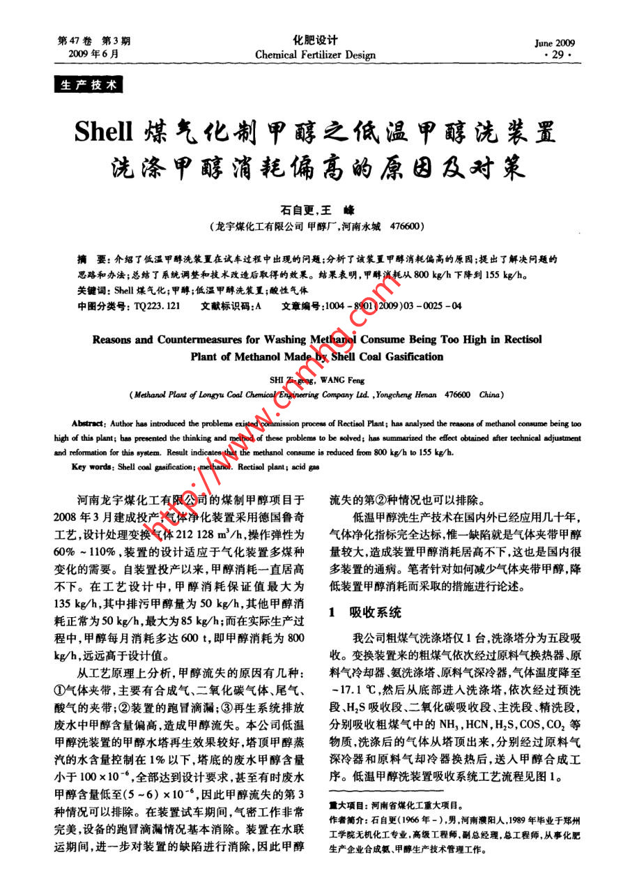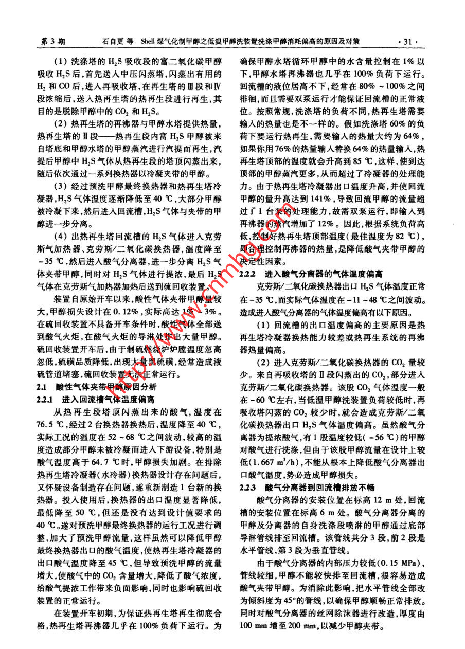 Shell煤氣化制甲醇之低溫甲醇洗裝置洗滌甲醇消耗偏高的原因及對(duì)策