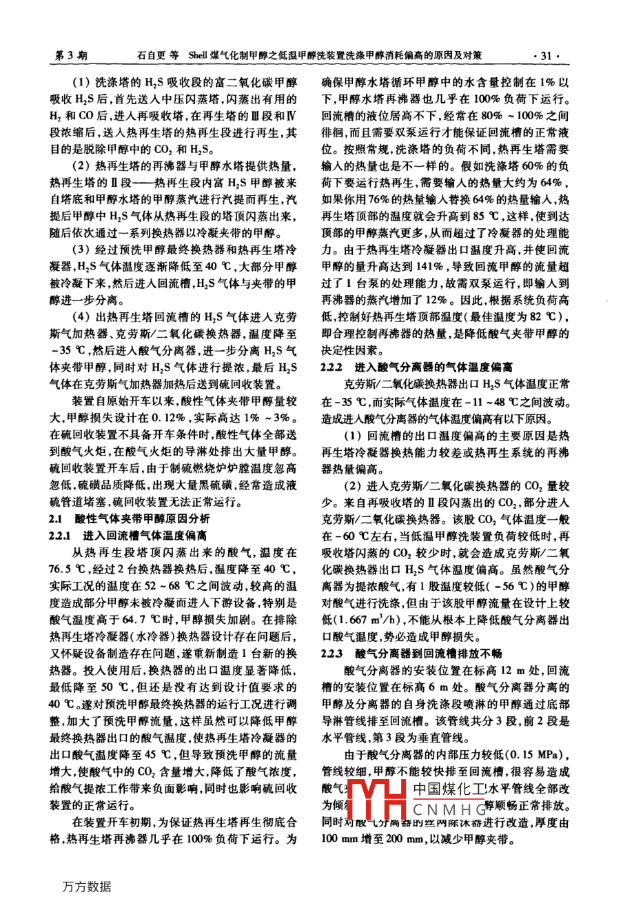 Shell煤氣化制甲醇之低溫甲醇洗裝置洗滌甲醇消耗偏高的原因及對策