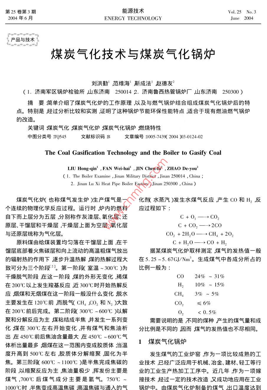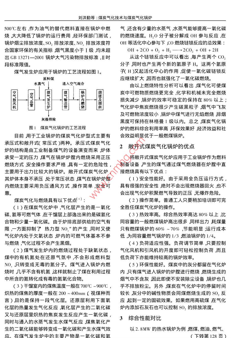 第25卷第3期能源技術(shù)Vol.25 No.3 :2004年6月ENERGY TECHNOLOGYJune 2004, 產(chǎn)品與技術(shù)煤炭氣化技術(shù)與煤炭氣化鍋爐劉洪勤’范維?!煞?趙德友( 1.濟(jì)南軍區(qū)鍋爐檢驗(yàn)所山東濟(jì)南250014 2.濟(jì)南魯西熱管鍋爐廠山東濟(jì)南250300 )摘要簡(jiǎn)單介紹了煤炭氣化爐的工作原理,以及與燃?xì)忮仩t結(jié)合組成煤炭氣化鍋爐后的特點(diǎn)。特別是經(jīng)過分析比較和實(shí)測(cè),證明了這種鍋爐節(jié)能環(huán)保性能特點(diǎn)適合于現(xiàn)有燃油燃?xì)忮仩t的改造。關(guān)鍵詞煤炭氣化煤炭氣化爐煤炭氣化鍋爐燃燒特性中圖分類號(hào):TQ545文獻(xiàn)標(biāo)識(shí)碼B文章編號(hào):1005-7439( 2004 )03-0124-02The Coal Gasification Technology and the Boiler to Gasify CoalLIU Hong-qin' , FAN Wei-hai' , JIN Chen-fa' , ZHAO De-you'( 1. The Boiler Examine , Jinan Military District ,Jinan 250014 , China ; .2. Jinan Lu Xi Heat Pipe Boiler Factory ,Jinan 250300 , China )煤炭氣化爐(也稱煤氣發(fā)生爐)生產(chǎn)煤氣是一化劑水蒸汽)發(fā)生水煤氣反應(yīng)產(chǎn)生CO和H2 ,反個(gè)連續(xù)的物理化學(xué)反應(yīng)過程。運(yùn)行時(shí),爐內(nèi)的燃料應(yīng)過程如下:自下而上層分為五層,分別稱作灰渣層、氧化層、還C +0,→→CO,原層、干餾層和干燥層,干燥層上面為空層氧化層C+CO,-→2CO與還原層統(tǒng)稱為氣化層。CO2 + 2H20一→CH4 + 202原料煤由給煤裝置均勻落在干餾層上面在干C+H20-→CO+H,餾層底部著火焦碳層和向上流動(dòng)的高溫粗煤氣放出據(jù)某煤炭氣化爐取樣測(cè)定煤氣的發(fā)熱值- -般的輻射熱的作用下逐步升溫?zé)峤饷旱臒峤膺^程大在5.25 ~5.67GJ/Nm。生成煤氣中各成分所占的致可分為三個(gè)階段。第一階段(室溫~ 300C )為比例一般為:干燥脫氣階段在這一階段,煤的外形無變化褐煤CO24% ~ 31%在200C以上發(fā)生羧基反應(yīng)近300°C時(shí)開始熱解反H210% ~ 15%應(yīng)煙煤和無煙煤在這一階段一般沒什么變化脫水CH43%~5%主要發(fā)生在120C前,而脫氣( CH4 ,CO2 和N2 )大致CO2≤ 6%在200C前后完成。第二階段( 300C ~ 6009C )以解< 0.5%聚和分解反應(yīng)為主煤粘結(jié)成半焦并發(fā)生一系列變需要說明的是不同的煤種產(chǎn)生的煤氣量和成化;煤在300°C左右開始變化,并有煤氣和焦油析分比例是不同的,因而煤氣的發(fā)熱值也不盡相同。出在4509C前后焦油含量最大在4509C ~ 600C氣1煤炭氣化鍋爐體析出量最多煙煤在這一范圍內(nèi)變成膠質(zhì)體;當(dāng)溫度升高到500C左右膠質(zhì)體分解縮聚,固化為半發(fā)生煤氣的工業(yè)爐窯作為-項(xiàng)比較成熟的工焦。第三階段(6009C~1100C)是半焦完成焦碳的業(yè)技術(shù),已經(jīng)廣泛應(yīng)用于機(jī)械、冶金、建材、輕工等行;階段,以縮聚反應(yīng)為主焦油量極少揮發(fā)份主要是業(yè)的工業(yè)生產(chǎn)熱加工工序中。近幾年作為一項(xiàng)嫁煤氣,700C后煤氣成分主要是氫氣。750C ~接技術(shù)經(jīng)過一定的技術(shù)改造,又成功地應(yīng)用在工業(yè)1000C時(shí)半焦變成高溫焦碳高溫焦碳與通入的氣鍋爐中。 由煤炭氣化爐制備的煤氣出口溫度達(dá)到劉洪勤等:煤炭氣化技術(shù)與煤炭氣化鍋爐500C左右,作為油氣的替代燃料直接在鍋爐中燃?xì)膺€含有少量的水蒸氣水蒸氣能夠提高一氧化碳燒大大降低了鍋爐的運(yùn)行費(fèi)用,經(jīng)環(huán)保部門測(cè)試,的燃燒速度。H2O 分子被分解成OH參與反應(yīng)在鍋爐煙塵排放濃度、SO2排放濃度、NO,排放濃度符0H等活化中心參與下CO燃燒鏈鎖反應(yīng)的總效果:合國家環(huán)保的有關(guān)指標(biāo)煙氣黑度小于I級(jí)均未超OH+2C0+O2+H,-→2C02+0H+2H出GB 13271- -2001鍋爐大氣污染物排放標(biāo)準(zhǔn),II 時(shí)從這個(gè)鏈鎖反應(yīng)中可以看出,每產(chǎn)生兩個(gè)CO2段標(biāo)準(zhǔn)限值。分子同時(shí)也產(chǎn)生兩個(gè)新的氫原子H。這兩個(gè)氫原煤氣發(fā)生爐應(yīng)用于鍋爐的工藝流程如圖1??? H )又起活化中心的作用,促使一氧化碳鏈鎖反原料煤.應(yīng)繼續(xù)擴(kuò)大,因而也就強(qiáng)化了一氧化碳燃燒。水蒸氣通入空氣混合由以上燃燒特性分析可以看出煤氣化可使煤道炭中可燃物質(zhì)燃燒更完全化學(xué)和機(jī)械未完全燃燒鼓一輸及損失減少,鍋爐的效率可穩(wěn)定的保持在80%以上;煙機(jī)肉|氣化爐中焦炭燃燒很少產(chǎn)生碳黑粒子煙氣中飛灰及可燃物濃度較小,鍋爐中煤氣進(jìn)行無焰燃燒排煙灰渣排除黑度可保持在林格曼1級(jí)以內(nèi)??傊禾繗饣亪D1煤炭氣化鍋爐的工藝流程爐的燃料綜合利用率高環(huán)保效果好經(jīng)濟(jì)效益和社目前用于工業(yè)鍋爐的煤炭氣化爐型式主要有會(huì)效益明顯優(yōu)于--般燃煤鍋爐。承壓式和敞開式(常壓式)兩種。承壓式煤炭氣化2敞開 式煤炭氣化鍋爐的優(yōu)點(diǎn)爐的結(jié)構(gòu)是由工業(yè)制備煤氣的設(shè)備演變而來爐體承受一定的壓力煤氣在鍋爐爐膛內(nèi)燃燒采用正壓將敞開式煤炭氣化爐應(yīng)用于工業(yè)鍋爐作為燃料燃燒方式,安全操作要求嚴(yán)格,具有-定的危險(xiǎn)性,制備設(shè)備產(chǎn)生的煤氣通過煤氣燃燒器在爐膛中直主要用于出力比較大的鍋爐。敞開式煤炭氣化爐,接燃燒具有以下優(yōu)點(diǎn):其爐體本身不承壓,處于常壓狀態(tài)煤氣在鍋爐爐膛( 1 )安全性能好。由于采用全