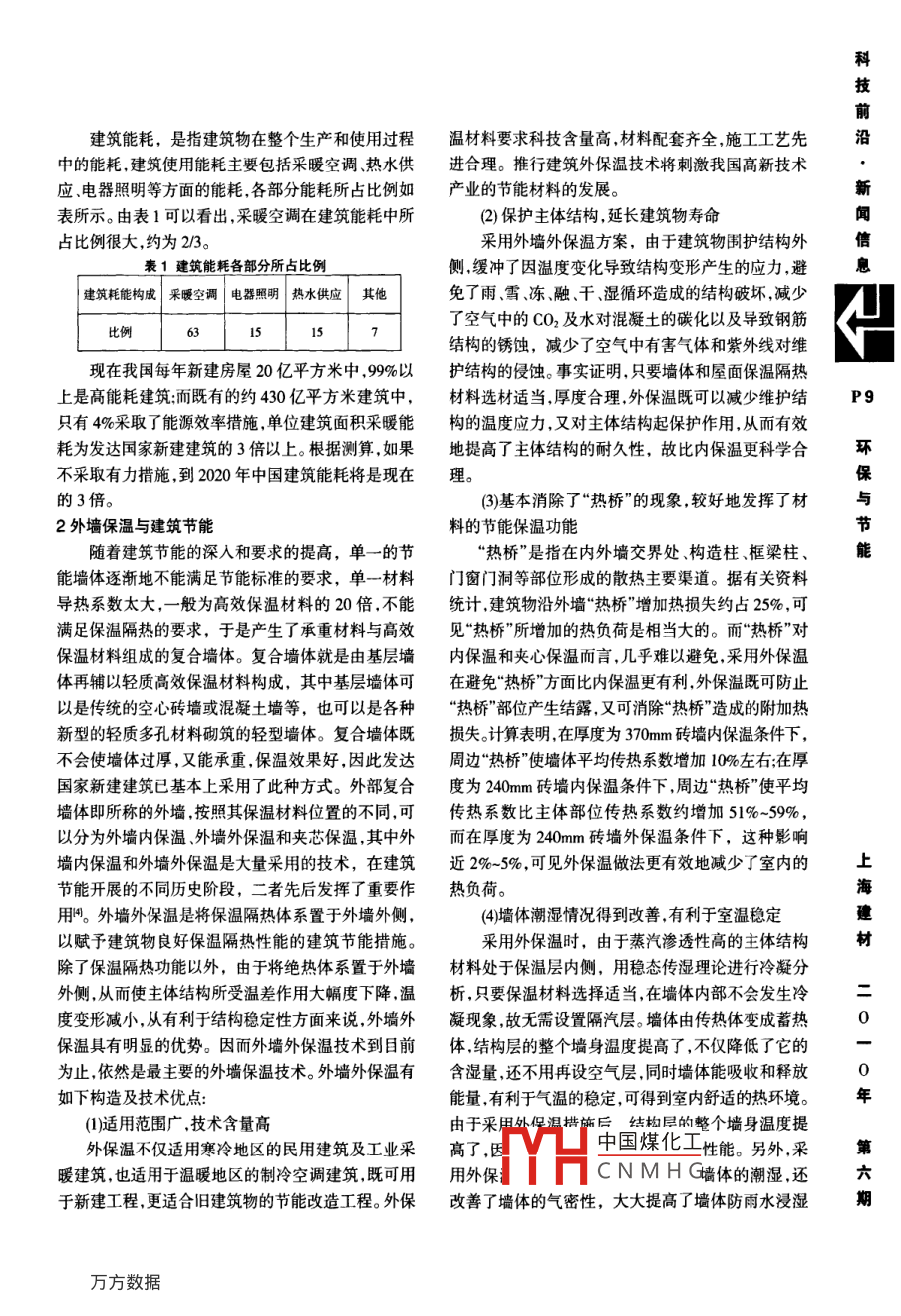 科技前沿·新聞信息外墻保溫與建筑節(jié)能陜西金泰氟堿化工有限公司技術(shù)中心康永山西省監(jiān)理建筑有限公司柴海濤摘要:建筑節(jié)能己成為我國實施能源節(jié)約戰(zhàn)略的重要環(huán)節(jié),建筑節(jié)能反映在墻體上,就是對墻體圍護結(jié)枃進(jìn)行保溫處理。隨著建筑節(jié)能要求的進(jìn)一步提高,墻體保溫體系對現(xiàn)有的保溫材料提出了新的技術(shù)和要求,對各種新型墻體材料的研究和應(yīng)用是建筑建材工業(yè)及民用可持續(xù)發(fā)展的又一個新趨勢關(guān)鍵詞:建筑節(jié)能外墻保溫能源節(jié)約戰(zhàn)略環(huán)保我國是能耗大國,建筑能耗又占全國總能耗的鍵,建筑墻體保溫材料是實現(xiàn)建筑節(jié)能的最基本的與很大一部分,單位建筑能耗比同氣候條件下發(fā)達(dá)國條件。在國外發(fā)達(dá)國家已經(jīng)廣泛使用的背景下,全國節(jié)家髙出二十余倍,這使得我國的建筑能源在高消耗范圍內(nèi)新型建筑墻體保溫材料的用量日益增多,推的過程中很容易對環(huán)境產(chǎn)生諸多不良影響。建設(shè)資行使用的政策力度加大。建材工業(yè)“十五”規(guī)劃對新源節(jié)約型社會,是我國做出的重大戰(zhàn)略決策,建筑節(jié)型墻體材料的發(fā)展和結(jié)構(gòu)調(diào)整重點作了明確規(guī)定:能在我國經(jīng)濟發(fā)展中占有重要地位,直接關(guān)系到社即“發(fā)展新型墻體材料,促進(jìn)經(jīng)濟與資源、環(huán)境協(xié)調(diào)會經(jīng)濟的可持續(xù)發(fā)展。發(fā)展”。人們逐漸意識到節(jié)約能源和環(huán)境保護的重要性,1建筑節(jié)能與建筑能耗向高居住質(zhì)量、高健康狀智能化方向發(fā)展,將是實現(xiàn)建筑節(jié)能,是指在不降低建筑物使用功能的前可持續(xù)發(fā)展理念的大趨勢,也是中國經(jīng)濟社會面臨提下,提高建筑中的能源利用效率,降低建筑能耗。的重要任務(wù)。對此相關(guān)政府部門制定了一系列的建筑節(jié)能包括三個方面:一是建筑本體的節(jié)能包括政策和法規(guī),把對建筑節(jié)能的關(guān)注提升到了重要高建筑規(guī)劃與設(shè)計、圍護結(jié)構(gòu)的設(shè)計節(jié)能等;二是建筑系統(tǒng)的節(jié)能,包括采暖與制冷系統(tǒng)等設(shè)備的節(jié)能;三提髙建筑的保溫隔熱性能是降低建筑能耗的關(guān)是能源管理,規(guī)范管理的方式以達(dá)到合理用能。海(三)城市基礎(chǔ)設(shè)施,是指城市生存和發(fā)展所必須具備的工程性基礎(chǔ)設(shè)施和社會性基礎(chǔ)設(shè)施的總稱包括材道路、隧道、橋梁、軌道交通、供排水園林綠化、水利、港口等建設(shè)工程(四)大型公共建筑,是指單體建筑面積在二萬平方米以上的公共建筑;(五)能效測評,是指對反映建筑能源消耗量及其用能系統(tǒng)效率等性能指標(biāo)進(jìn)行檢測計算,并給出其所處的水平;(六)見證取樣檢測,是指在建設(shè)單位、監(jiān)理單位人員的見證下,由施工單位的試驗人員按照有關(guān)技術(shù)標(biāo)準(zhǔn)0規(guī)范的規(guī)定,在施工現(xiàn)場從檢測對象中抽取檢測樣品,并送至具備檢測資質(zhì)的檢測機構(gòu)進(jìn)行檢測的活動;(七)綠色建筑,是指在建筑的全壽命周期內(nèi),最大限度地節(jié)約資源(節(jié)能、節(jié)地、節(jié)水、節(jié)材)保護環(huán)境和減少污染,為人們提供健康適用、高效的使用空間,與自然和諧共生的建筑第五十一條鼓勵農(nóng)村村民個人建設(shè)住房和臨時建筑采中國煤化工六第五十二條本條例自2011年1月1日起施行。CNMHG科技前建筑能耗,是指建筑物在整個生產(chǎn)和使用過程溫材料要求科技含量高材料配套齊全施工工藝先沿中的能耗,建筑使用能耗主要包括采暖空調(diào)、熱水供進(jìn)合理。推行建筑外保溫技術(shù)將刺激我國高新技術(shù)應(yīng)電器照明等方面的能耗,各部分能耗所占比例如產(chǎn)業(yè)的節(jié)能材料的發(fā)展。新表所示。由表1可以看出,采暖空調(diào)在建筑能耗中所(2)保護主體結(jié)構(gòu),延長建筑物壽命占比例很大,約為2/3。采用外墻外保溫方案,由于建筑物圍護結(jié)構(gòu)外倍表1建筑能耗各部分所占比例側(cè)緩沖了因溫度變化導(dǎo)致結(jié)構(gòu)變形產(chǎn)生的應(yīng)力避息建筑耗能構(gòu)成采暖空調(diào)|電器照明熱水供應(yīng)其他免了雨、雪、凍、融、干、濕循環(huán)造成的結(jié)構(gòu)破壞,減少了空氣中的CO2及水對混凝土的碳化以及導(dǎo)致鋼筋15結(jié)構(gòu)的銹蝕,減少了空氣中有害氣體和紫外線對維現(xiàn)在我國每年新建房屋20億平方米中,99%以護結(jié)構(gòu)的侵蝕。事實證明,只要墻體和屋面保溫隔熱上是髙能耗建筑而既有的約430億平方米建筑中,材料選材適當(dāng),厚度合理,外保溫既可以減少維護結(jié)P9只有4%采取了能源效率措施,單位建筑面積采暖能構(gòu)的溫度應(yīng)力,又對主體結(jié)構(gòu)起保護作用,從而有效耗為發(fā)達(dá)國家新建建筑的3倍以上。根據(jù)測算,如果地提高了主體結(jié)構(gòu)的耐久性,故比內(nèi)保溫更科學(xué)合環(huán)不采取有力措施,到2020年中國建筑能耗將是現(xiàn)在理。的3倍。(3)基本消除了“熱橋”的現(xiàn)象,較好地發(fā)揮了材2外墻保溫與建筑節(jié)能料的節(jié)能保溫功能保