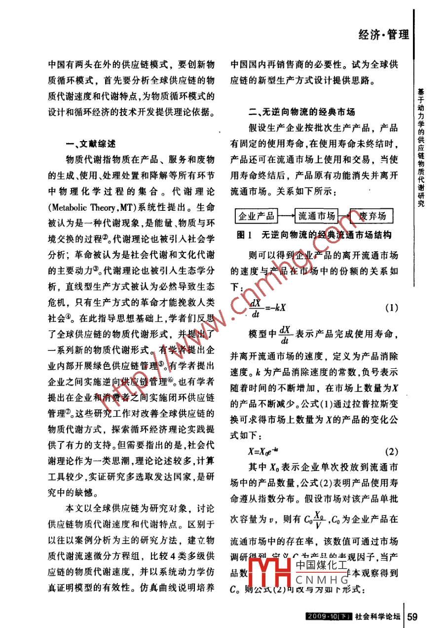 經(jīng)濟(jì)·管理基于動力學(xué)的供應(yīng)鏈物質(zhì)代謝研究基于動力學(xué)的供應(yīng)鏈物質(zhì)代謝研究口肖偉賴明勇[內(nèi)容摘要]以產(chǎn)品材料利用度作為循環(huán)經(jīng)濟(jì)的主要績效指標(biāo),綜合逆向物流和流通市場結(jié)構(gòu)來考察他們對該績效指標(biāo)的影響。在構(gòu)造微分方程的基礎(chǔ)上,建立了流通市場與回收市場中產(chǎn)品流動的模型,并與無逆向物流情況下的流通市場模型進(jìn)行對比,觀察到市場結(jié)構(gòu)和逆向物流冋樣對產(chǎn)品的材料利用度有影響,逆向物流處理能力的增加能提高產(chǎn)品材料利用度。定義了表觀因子和對應(yīng)公式作為產(chǎn)品材料利用度的統(tǒng)計(jì)指標(biāo),以便政府與企業(yè)調(diào)研使用,為實(shí)施和評估循環(huán)經(jīng)濟(jì)模式提供參考。[關(guān)鍵詞]動力學(xué);供應(yīng)鏈;物質(zhì)代謝;循環(huán)經(jīng)濟(jì)。[作者簡介]肖偉,湖南大學(xué)工商管理學(xué)院博士研究生,研究方向:供應(yīng)鏈。賴明勇,湖南大學(xué)經(jīng)濟(jì)與貿(mào)易學(xué)院院長,博士研究生導(dǎo)師,主要從事供應(yīng)鏈、國際貿(mào)易研究。引言型產(chǎn)品,間接為歐美國家承擔(dān)了巨額碳排全球供應(yīng)鏈( Global supply chain)一詞放成本,這種貿(mào)易形式顯然不利于京都議最早出現(xiàn)在1956年①。之后的學(xué)者們不斷定書框架的后續(xù)發(fā)展。2008年2月1日,豐富,形成了完整的定義,認(rèn)為全球供應(yīng)鏈中國國家環(huán)??偩职l(fā)布《2008中國可持續(xù)是實(shí)現(xiàn)一系列分散在全球各地的相互關(guān)聯(lián)發(fā)展戰(zhàn)略報(bào)告》。報(bào)告對世界59個(gè)主要國的商業(yè)活動,包括釆購原料和零件、處理并家資源績效水平調(diào)查排序。中國資源績效得到最終產(chǎn)品、產(chǎn)品增值、對零售商和消費(fèi)居世界倒數(shù)第6位。2008年7月19日,者的配送、在各個(gè)商業(yè)主體之間交換信息,OECD發(fā)表《中國環(huán)境績效評估報(bào)告》。報(bào)其主要目的是降低成本擴(kuò)大收益。告認(rèn)為,中國環(huán)境保護(hù)存在缺陷,“十五"計(jì)全球供應(yīng)鏈有力促進(jìn)了中國制造商的劃中主要環(huán)境指標(biāo)沒有完成。有鑒于此,發(fā)展,也帶來了諸多挑戰(zhàn)。日本《呼聲》月刊2008年3月5日溫家寶總理在第十一屆2007年11月號發(fā)表題為“是全世界在污全國人民代表大會第一次會議上發(fā)表《政染中國”的文章,日本京都造型藝術(shù)大學(xué)教府工作報(bào)告》,他明確提出,要加大節(jié)能減授竹村真一指出,不是中國在污染世界,而排和環(huán)境保護(hù)力度。是世界在污染中國?;ㄆ煦y行首席經(jīng)濟(jì)學(xué)加大節(jié)能減排的力度從根本上而言,家唐雅玲接受媒體采訪時(shí)也無不憂慮地指是中國煤化工要?jiǎng)?chuàng)新物質(zhì)循出,中國出口大量能源密集型和資源密集環(huán)模CNMH口呼續(xù)發(fā)展道路。58社會科學(xué)論壇E0910下經(jīng)濟(jì)·管理中國有兩頭在外的供應(yīng)鏈模式,要?jiǎng)?chuàng)新物中國國內(nèi)再銷售商的必要性。試為全球供質(zhì)循環(huán)模式,首先要分析全球供應(yīng)鏈的物應(yīng)鏈的新型生產(chǎn)方式設(shè)計(jì)提供思路質(zhì)代謝速度和代謝特點(diǎn),為物質(zhì)循環(huán)模式的設(shè)計(jì)和循環(huán)經(jīng)濟(jì)的技術(shù)開發(fā)提供理論依據(jù)。無逆向物流的經(jīng)典市場假設(shè)生產(chǎn)企業(yè)按批次生產(chǎn)產(chǎn)品,產(chǎn)品學(xué)文獻(xiàn)綜述有固定的使用壽命,在使用壽命未終結(jié)時(shí),物質(zhì)代謝指物質(zhì)在產(chǎn)品、服務(wù)和廢物產(chǎn)品還可在流通市場上使用和交易,當(dāng)使的生成使用、處理處置和降解等所有環(huán)節(jié)用壽命終結(jié)后,產(chǎn)品原有功能消失并離開f中物理化學(xué)過程的集合。代謝理論流通市場。關(guān)系如下所示:( Metabolic Theory,MT)系統(tǒng)性提出。生命被認(rèn)為是一種代謝現(xiàn)象,是能量、物質(zhì)與環(huán)企業(yè)產(chǎn)品}流通市場}[廢棄場換的過程2代謝理論也被引入社會學(xué)圖1無逆向物流的經(jīng)典流通市場結(jié)構(gòu)分析;革命被認(rèn)為是社會代謝和文化代謝則可以得到企業(yè)產(chǎn)品的離開流通市場的主要?jiǎng)恿?。代謝理論也被引人生態(tài)學(xué)分的速度與產(chǎn)品在市場中的份額的關(guān)系如析,直線型生產(chǎn)方式被認(rèn)為必然導(dǎo)致生態(tài)下危機(jī),只有生產(chǎn)方式的革命才能挽救人類dX==kX社會④。在此指導(dǎo)思想基礎(chǔ)上,學(xué)者們反思了全球供應(yīng)鏈的物質(zhì)代謝形式,并提出了模型中表示產(chǎn)品完成使用壽命,系列新的物質(zhì)代謝形式。有學(xué)者提出企并離開流通市場的速度,定義為產(chǎn)品消除業(yè)內(nèi)部開展綠色供應(yīng)鏈管理。有學(xué)者提出速度。k為產(chǎn)品消除速度的常數(shù),負(fù)號表示企業(yè)之間實(shí)施逆向供應(yīng)鏈管理。也有學(xué)者隨著時(shí)間的不斷增加,在市場上數(shù)量為X提出在企業(yè)和消費(fèi)者之間實(shí)施閉環(huán)供應(yīng)鏈的產(chǎn)品不斷減少。公式(1)通過拉普拉斯變管理②。這些研究工作對改善全球供應(yīng)鏈的換
