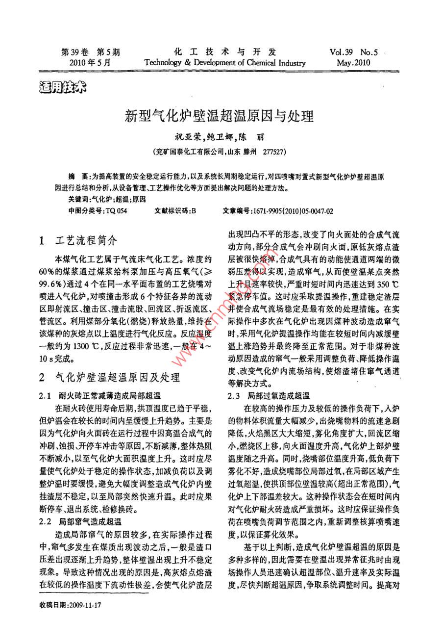 第39卷第5期化工技術與開發(fā)Vol.39 No.52010年5月Technology & Development of Chemical IndustryMay .2010適用技術新型氣化爐壁溫超溫原因與處理祝亞榮,鮑衛(wèi)娜,陳麗(兗礦國泰化工有限公司,山東滕州277527)摘要:為提高裝置的安全穩(wěn)定運行能力,以及系統(tǒng)長周期穩(wěn)定運行,對四噴嘴對置式新型氣化爐爐壁超溫原因進行總結和分析,從設備管理、工藝操作優(yōu)化等方面提出解決問題的處理方法。關鍵詞:氣化爐;超溫;原因中國分類號:TQ 054文獻標識碼:B文章編號:1671-9905(2010)05-0047-02出現凹凸不平的形態(tài),改變了向火面處的合成氣流1工藝流程簡介動方向,部分合成氣會沖刷向火面,原低灰熔點渣本煤氣化工藝屬于氣流床氣化工藝。濃度約層被很快熔掉,合成氣具有的動能使通道兩端的微60%的煤漿通過煤漿給料泵加壓與高壓氧氣(≥弱壓差得以實現, 造成竄氣,從而使壁溫某點突然99.6% )通過4個在同一水平面布置的工藝燒嘴對上升且速率較快,嚴重時短時間內迅速達到350 C噴進入氣化爐,對噴撞擊形成6個特征各異的流動緊急停車值。這時應采取提溫操作,重建穩(wěn)定渣層區(qū)即射流區(qū)撞擊區(qū)撞擊流股、回流區(qū)、折返流區(qū)、并使合成氣流場穩(wěn)定是最有效的處理措施。在實管流區(qū)。利用煤部分氧化(燃燒)釋放熱量,維持在際操作中多次在氣化爐出現因煤種波動造成竄氣該煤種的灰熔點以上溫度進行氣化反應。反應溫度時,采用氣化爐提溫操作均能在較短時間內減緩壁-般約為1300七,反應過程非常迅速,一般在4~溫上漲趨勢并最終降至正常范圍。對于非煤種波10 s完成。動原因造成的竄氣一般采用調整負荷、降低操作溫度、改變氣化爐內流場結構,使熔渣堵住竄氣通道2氣化爐壁溫超溫原因及處理等解決方式。2.1耐火磚 正常減薄造成局部超溫2.3局部過氧造 成超溫在耐火磚使用壽命后期,拱頂溫度已趨于平穩(wěn),在較高的操作壓力及較低的操作負荷下,人爐但爐溫會在較長的時間內呈緩慢上升趨勢。主要是的物料體積流量大幅減少,出燒嘴物料的流速急劇因為氣化爐向火面磚在運行過程中因高溫合成氣的降低,火焰黑區(qū)大大縮短,霧化角度擴大,回流區(qū)縮沖刷、蝕損開停車沖擊等原因,不斷減薄,整體熱阻小,燃燒區(qū)上移,向火面溫度升高,氣化爐上部爐壁不斷減小,以至氣化爐大面積溫度上升。這時應盡溫度隨之升高。同時,燒嘴部位溫度升高,低負荷下量使氣化爐處于穩(wěn)定的操作狀態(tài),加減負荷以及調霧化不好,造成燒嘴部位局部過氧,在局部區(qū)域產生整爐溫時要緩慢,避免大幅度調整造成氣化爐內壁過氧超溫,使拱頂部位壁溫較高(超出正常范圍),氣掛渣層不穩(wěn)定,以至局部突然快速升溫。此時應果化爐上下部溫差較大。這種操作狀態(tài)會在短時間內斷停車、退出系統(tǒng)、檢修換磚。對氣化爐耐火磚造成嚴重損壞。這時應保證操作負2.2局部竄氣造成超溫荷在噴嘴負荷調節(jié)范圍之內,重新調整核算噴嘴速造成局部竄氣的原因較多,在實際操作過程度,以保證霧化效果。中,竄氣多發(fā)生在煤質出現波動之后,一般是渣口基于以上判斷,造成氣化爐壁溫超溫的原因是壓差出現逐漸上升趨勢,整體壁溫出現上升不穩(wěn)定多種多樣的,因此需要在壁溫出現異常征兆時由現現象。導致這種情況出現的原因是,高灰熔點熔渣場操作人員迅速確認超溫部位、溫升速率及實際溫在較低的操作溫度下流動性極差,會使氣化爐渣層度,盡快判斷超溫原因,爭取系統(tǒng)調整時間。提高對收稿日期:2009-11-1748化工技術與開發(fā)第39卷氣化爐壁溫超溫的認識并有效解決超溫問題,可提避免氣化系統(tǒng)因壁溫超溫問題導致系統(tǒng)停車,提高高裝置的安全穩(wěn)定長周期運行能力。氣化爐的運行周期,為后工序的安全、穩(wěn)定、長周期運行奠定基礎。3結語了解氣化爐壁溫超溫原因與處理方法,盡可能Reasons and Solutions of Overtemperature in Wall of New style GasifierZHU Ya-romg , BAO Wei-na ,CHEN Li(Yankuang Cathay Coal Chernicals Co. Ltd. , Tengzhou 277527, China)(上接第38頁)[12]符劍剛. 銅鉬分離有機抑制劑巰基乙酸的合成與應[17] Nagaraj D. R. The mechanism of slfide deression with用研究[D].長沙:中南大學,2001.functionalized synthetic polymers[J]. Symp Elec-[13] 歐樂明. 銅鉬混合精礦浮選分離礦漿電化學及電位trochen (Miner Metall Process) ,1992, (5) :213-219.調控浮選柱研究[D].長沙:中南工業(yè)大學, 1998.[18] M. Poorkani, S. Banisi Industrial use of nitrogen in[14] s. G. Salamy, J. G. Nixon. The aplication of electro-flotation of molybdenite at the Sarcheshmeh a∞pper com-chemical methods to flotation research[J]. Institution ofplex[J]. Minerals Engineering, 2005,18: 735-738.Mining and Metallungy, 1953:503-516.[19]李國勝,曹亦俊,桂夏輝,等.旋流- 靜態(tài)微泡浮選柱[15] s.Chander, D. W Fuerstenau. Electrochemial flotation用于銅鉬分離的試驗研究[J].有色金屬(選礦部separation of chalocite from molybdenite[J]. Int. J. .分),2009(3):42-45.Miner. Prcses, 1982,(10):89-94.[20]周旭日,李春菊,周育軍. 浮選柱-浮選機聯合處理[16] P. Krishnaswamy, D. w. Fuerstenau. Electrochemical銅鉬混合精礦的研究[J].礦產保護與利用,2005,mechanism for the aqueous disolutio of molybdenite(3):37-39.[]. Int. Symposum on Hyomalallurgy, 1983, 227-[21]楊鵬,劉樹貽,陳藎. 脈動高梯度磁選分離難選銅鉬241.混合精礦的研究[J].礦冶,1994,(2):31-35.Review on Flotation and 