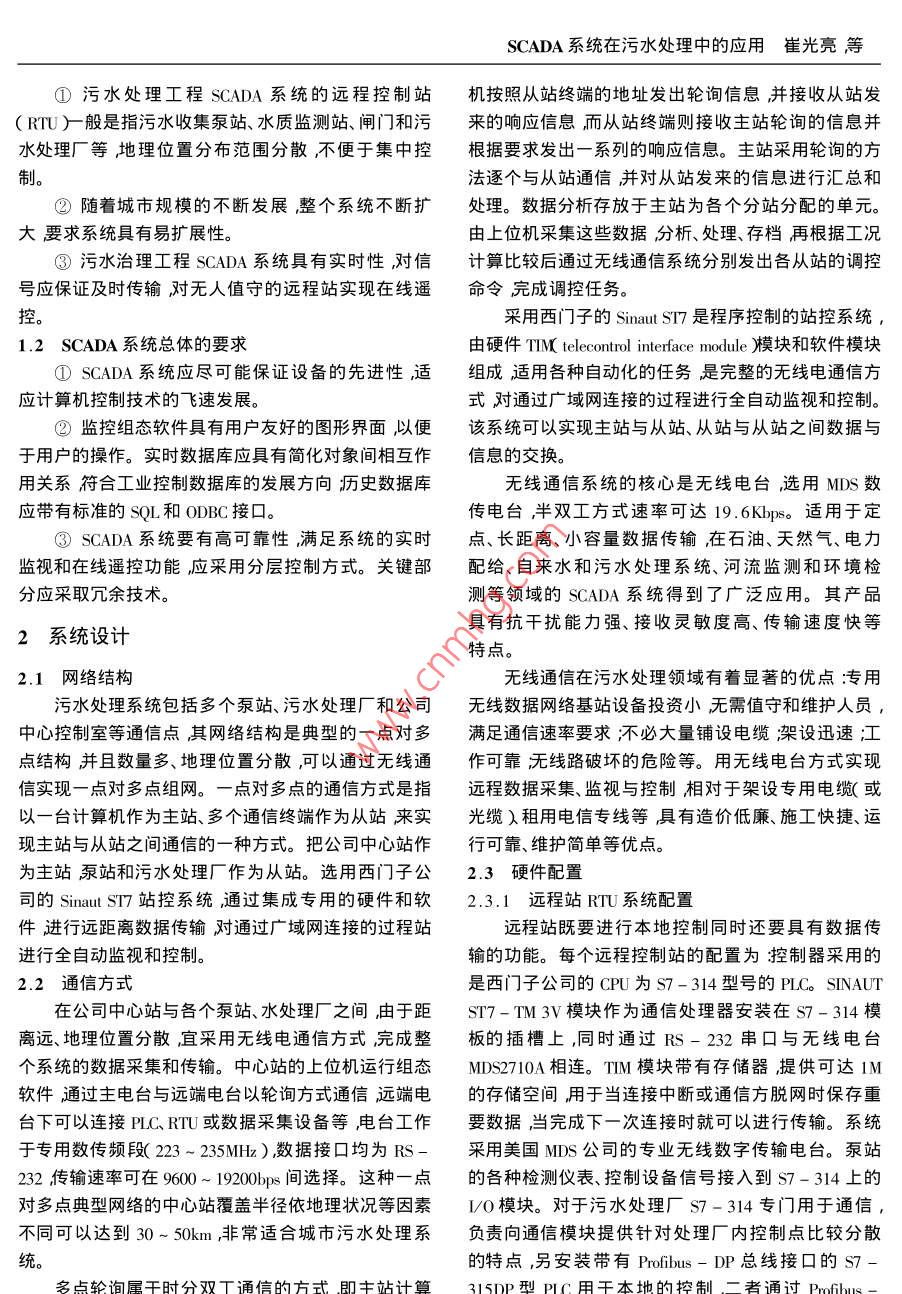 《自動(dòng)化儀表》第24卷第10期2003年10月幅伴熱DCS畫(huà)面集中監(jiān)控(TT,2及T3)并把報(bào)警安全生力開(kāi)關(guān)MaAe信號(hào)引入儀表人員值班室內(nèi)實(shí)現(xiàn)及時(shí)預(yù)防和處理此項(xiàng)原設(shè)計(jì)原理圖技術(shù)已應(yīng)用二年多效果十分顯著。但是要完成此功能必須具備兩個(gè)條件:是變送器工作在數(shù)字通信方式;二示壓邏點(diǎn)報(bào)警信號(hào)是APM的信號(hào)處理器必須是使用S智能處理器。變送器聯(lián)信號(hào)4結(jié)束語(yǔ)b改造后原理圖幾年來(lái),灬C-3000集散型控制系統(tǒng)和ST-3000圖3風(fēng)機(jī)壓力聯(lián)鎖改造原理圖智能變送器在我廠使用一直較好其故障率和維護(hù)量極少。隨著新技術(shù)的不斷應(yīng)用繼續(xù)不斷地開(kāi)發(fā)和研U站報(bào)警制DCS和智能變送器的新功能使其更好地服務(wù)于石值班報(bào)警變送器回化企業(yè)是我們今后努力的方向。圖4DSC溫度監(jiān)控系統(tǒng)圖修改稿日期2002-06-30SCADA系統(tǒng)在污水處理中的應(yīng)用The Application of SCADa System in Sewage Treatment崔光亮!馮正進(jìn)!蘇純2劉成良1上海交通大學(xué)機(jī)電控制研究所上海200030海寧污水處理廠2海寧314400)摘要利用遠(yuǎn)程通信構(gòu)成分級(jí)計(jì)算機(jī)監(jiān)控系統(tǒng) SCADA)實(shí)現(xiàn)污水處理的本地控制和遠(yuǎn)程控制中心的集中監(jiān)控與調(diào)度。針對(duì)污水處理系統(tǒng)的特點(diǎn)與要求對(duì)系統(tǒng)結(jié)構(gòu)、通信方式、硬件配置和監(jiān)控組態(tài)軟件進(jìn)行了設(shè)計(jì)。該系統(tǒng)投入實(shí)際運(yùn)行表明效果良好。關(guān)鍵詞 SCADA系統(tǒng)污水處理數(shù)據(jù)采集無(wú)線通信Abstract The hierarchical computerized supervisory control system( SCADA)is composed with remote communication. Centralized supervisory controlnd dispatching of local and remote control are implemented for sewage treatment. In accordance with the features and requirement of sewage treatmentsystem, system architecture communication scheme hardware composition and configuration software of supervisory and control are designed. The re-ey words SCADA system Sewage treatment Data acquisition Wireless communication0引言水收集管網(wǎng)、泵站、水質(zhì)監(jiān)測(cè)站和城市污水處理廠。污水處理廠一般建在遠(yuǎn)離市區(qū)靠近河流的地方以便于污水處理 SCADA系統(tǒng)是指通過(guò)采用儀表、控制將處理后的水排出泵站、監(jiān)測(cè)站分布在市區(qū)和工業(yè)區(qū)裝置和計(jì)算機(jī)等設(shè)備對(duì)污水收集處理工程進(jìn)行自動(dòng)內(nèi)污水處理系統(tǒng)控制設(shè)備地點(diǎn)分散。從整體看污水檢測(cè)、監(jiān)測(cè)、控制和管理以保證污水處理系統(tǒng)安全、處理過(guò)程是一個(gè)地理位置分散、分布時(shí)變參數(shù)多、復(fù)雜經(jīng)濟(jì)、有效地運(yùn)行。同時(shí)對(duì)污水處理工藝進(jìn)行自動(dòng)的生產(chǎn)過(guò)程系統(tǒng)。化監(jiān)測(cè)和適時(shí)控制是提高污水處理效率、降低處理SCADA系統(tǒng)的主要結(jié)構(gòu)包括遠(yuǎn)程控制單元能耗的關(guān)鍵。 SCADA技術(shù)又稱為計(jì)算機(jī)四遙(遙測(cè)、(RTU)通信網(wǎng)絡(luò)及中心主站三部分,遙控、遙信、遙調(diào))技術(shù)在給排水行業(yè)得到廣泛的應(yīng)1污水處理 SCADA系統(tǒng)的特點(diǎn)與要求用。SCADA系統(tǒng)在污水處理中的應(yīng)用崔光亮簿等①污水處理工程 SCADA系統(tǒng)的遠(yuǎn)程控制站機(jī)按照從站終端的地址發(fā)岀輪詢信息并接收從站發(fā)RTU)般是指污水收集泵站、水質(zhì)監(jiān)測(cè)站、閘門(mén)和污來(lái)的響應(yīng)信息而從站終端則接收主站輪詢的信息并水處理廠等地理位置分布范圍分散不便于集中控根據(jù)要求發(fā)出一系列的響應(yīng)信息。主站采用輪詢的方制,法逐個(gè)與從站通信并對(duì)從站發(fā)來(lái)的信息進(jìn)行匯總和②隨著城市規(guī)模的不斷發(fā)展,整個(gè)系統(tǒng)不斷擴(kuò)處理。數(shù)據(jù)分析存放于主站為各個(gè)分站分配的單元。大要求系統(tǒng)具有易擴(kuò)展性。由上位機(jī)采集這些數(shù)據(jù)分析、處理、存檔再根據(jù)工況③污水治理工程 SCADA系統(tǒng)具有實(shí)時(shí)性對(duì)信計(jì)算比較后通過(guò)無(wú)線通信系統(tǒng)分別發(fā)出各從站的調(diào)控號(hào)應(yīng)保證及時(shí)傳輸對(duì)無(wú)人值守的遠(yuǎn)程站實(shí)現(xiàn)在線遙命令完成調(diào)控任務(wù)控采用西門(mén)子的 Sinaut st是程序控制的站控系統(tǒng)12 SCADA系統(tǒng)總體的要求由硬件們 w telecontrol interface module)模塊和軟件模塊① SCADA系統(tǒng)應(yīng)盡可能保證設(shè)備的先進(jìn)性,適組成適用各種自動(dòng)化的任務(wù)是完整的無(wú)線電通信方應(yīng)計(jì)算機(jī)控制技術(shù)的飛速發(fā)展式對(duì)通過(guò)廣域網(wǎng)連接的過(guò)程進(jìn)行全自動(dòng)監(jiān)視和控制②監(jiān)控組態(tài)軟件具有用戶友好的圖形界面以便該系統(tǒng)可以實(shí)現(xiàn)主站與從站、從站與從站之間數(shù)據(jù)與于用戶的操作。實(shí)時(shí)數(shù)據(jù)庫(kù)應(yīng)具有簡(jiǎn)化對(duì)象間相互作信息的交換。用關(guān)系符合工業(yè)控制數(shù)據(jù)庫(kù