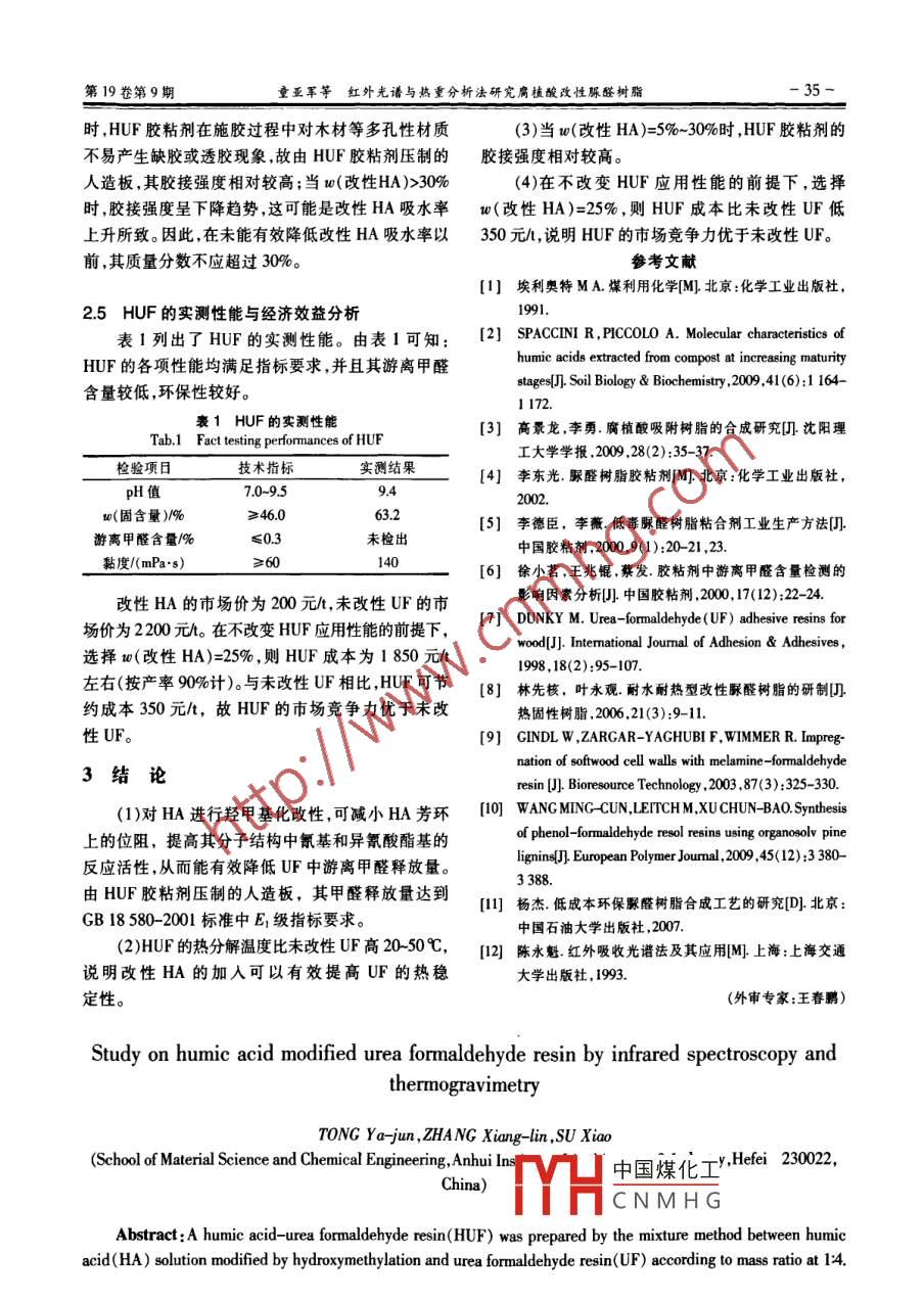 中啁膚粘荊2010年9月第19卷第9期-32CHINA ADHESIVESVol 19 No 9,Sep. 2010研制利應(yīng)用紅外光譜與熱重分析法研究腐植酸改性脲醛樹脂童亞軍,章祥林,蘇肖安徽建筑工業(yè)學(xué)院材化學(xué)院,安徽合肥230022)摘要:將腐植酸(HA)進(jìn)行羥甲基化改性,然后搜照m(HA羥甲基化溶液)m脲醛樹脂(UF)=1i4比例將兩者混合均勻,制得腐植酸-脲醛樹脂(HUF)。采用紅外光譜(斤-R)熱重分析(TGA)及差示掃描量熱(DSC)法等對UF和HUF的結(jié)構(gòu)熱穩(wěn)定性及玻邐化轉(zhuǎn)變溫度(T等進(jìn)行表征。結(jié)果表明:HUF與UF的F-R曲線基本相同,前者的-R特征峰均有不同程度增強(qiáng),熱失重峰向高溫區(qū)移動,說明HUF既保留了UF的原有結(jié)構(gòu),又具有較強(qiáng)的耐熱性;當(dāng)如(改性HA)=5%~30%時,HUF膠粘劑的膠接強(qiáng)度相對較大與未改性UF相比,HUF價格更低(節(jié)約350元/)、更環(huán)保(甲醛釋放量達(dá)到G818580-2001標(biāo)準(zhǔn)中E1級指標(biāo)要求),故HUF具有較強(qiáng)的市場競爭力和良好的應(yīng)用前景。關(guān)鍵詞:腐植酸;脲醛樹脂;羥甲基化;膠粘劑;低成本;環(huán)保;紅外光譖;熱垂分析中圖分類號:TQ433431文獻(xiàn)標(biāo)識碼:A文章編號:1004-2849(2010)09-0032-050前言途徑是降低n(甲醛)n(尿素)比例、改進(jìn)合成工藝(如腐植酸(HA)是從腐敗植物(腐植質(zhì))中提取出控制反應(yīng)溫度、分批加入尿素等)以及添加甲醛捕捉來的堿溶性物質(zhì)叫。HA廣泛存在于土壤、河流及海劑等6。提高UF性能的基本措施是加入填料(如樹洋中,最有希望加以開發(fā)利用的HA來源是一些低皮、木粉及面粉等)和改性劑聚乙烯醇(PVA)、三聚熱值的煤(諸如泥炭、褐煤和風(fēng)化煤等)。HA與其它氰胺及酚類氧化淀粉等門。天然大分子物質(zhì)不同之處在于,其不具有某種完整利用木質(zhì)素、氧化淀粉等對UF進(jìn)行改性的的結(jié)構(gòu)和化學(xué)構(gòu)型僅由某些相似(分子量和結(jié)構(gòu)成研究報道相對較多。本研究采用自制的改性HA(可分均不同)的高分子羥基、芳香族及羧酸類等物質(zhì)所減小HA芳環(huán)上的位阻,提高其反應(yīng)活性)作為UF組成的復(fù)雜混合物。HA分子中含有多種活性官能的改性劑,通過大量試驗得到制備HUF(HA改性脲團(tuán),故其具有酸性、親水性界面活性、陽離子交換能醛樹脂)的適宜工藝條件和改性HA適宜的添加比力配合作用及吸附分散能力等諸多特點。根據(jù)例,從而制備出一種低成本低游離甲醛含量和高性HA的結(jié)構(gòu)特點,可采用不同工藝將其與不同單體能的人造板用HUF膠粘劑。共聚,從而制備出不同性能的HA改性樹脂,這既有1試驗部分利于充分發(fā)揮HA的獨特功效,又有利于拓寬其應(yīng)用領(lǐng)域。1.1試驗原料脲醛樹脂(UF)膠粘劑向具有生產(chǎn)工藝簡單、價褐煤,內(nèi)蒙古扎賚諾爾;氫氧化鈉(NaOH),分析格低廉等優(yōu)勢在木材加工領(lǐng)域中得到廣泛應(yīng)用,是純(>96%)天津大茂化學(xué)試劑廠;碳酸鈉(>995%)、目前需求量最大的膠粘劑之一。UF主要優(yōu)點是硬度氯化銨(>995%),分析純,廣東西隴化工廠;甲高、耐熱性好、成本低、固化前呈水溶性且能與多種醛(37.0%),工業(yè)級,金海達(dá)樹脂有限責(zé)任公司;聚材料混合使用,主要缺點是加工或使用過程中會釋乙烯醇PVA}·T業(yè)級(>995%).安徽皖維集團(tuán)有限放出游離甲醛。降低UF中游離甲醛釋放量的主要公司中國煤化工淮化集團(tuán)有限公收稿日期:20100421;修回日期:201005-27CNMHG基金項目:安徽省教育廳重點項日(K2008A002)作者簡介:童亞軍(1985-),安徽無為縣人在讀碩士研究方向為高分子材料與環(huán)保型金屬表面處理劑。E- mail: tongyan.2010@163cmcn通訊作者:章祥林。E-mail:akl@aiai.edu.cn第19卷第9期童亞軍等紅外光譜與熱重分析法研究腐植酸改性脲醛樹脂司;鄰苯二甲酸酐,分析純,上海中試化工總公司(2)結(jié)構(gòu)特征:采用紅外光譜(FT-R)法進(jìn)行表楊木單板,安徽穎上縣。征(KBr壓片法制樣,每次測量時儀器的背景干擾都應(yīng)從樣品頻譜中自動減除)。12試驗儀器(3)黏度:按照GBT14074-2006標(biāo)準(zhǔn)進(jìn)行測Nicolet8700傅里葉變換紅外光譜儀,美國熱電定(測試溫度25℃,28號轉(zhuǎn)子,轉(zhuǎn)速40r/min)。儀器公司;STA409PC同步熱分析儀,德國耐馳公(4)熱穩(wěn)定性:采用熱重分析(TGA)法進(jìn)行表司;FA2014型電子天平,上海良平儀器儀表有限公征(N2氣氛,升溫速率10℃/mn,N2流量50 ml/min)。司;MWD-10B型拉力機(jī),濟(jì)南鑫光試驗機(jī)制造有限(5)玻璃化轉(zhuǎn)變溫度(T):采用差示掃描量公司;PHS-3B型pH計,上海雷磁分析儀器有限公熱(DSC)法進(jìn)行表征(升溫速率10℃/min,N2氣氛司;NDJ-1型旋轉(zhuǎn)式黏度計,上海衡平儀器儀表廠。流量50mL/min)。(6)膠接強(qiáng)度:按照GB/T14074-2006標(biāo)準(zhǔn),采13試驗制備用拉力機(jī)進(jìn)行測定(測試溫度25℃,拉伸速率131HA羥甲基化溶液的制備588kN/min)。將626g褐煤放入1000mL三口燒瓶中,加人500mL蒸餾水搖勻然后緩慢加人9g固體NaOH2結(jié)果與討論和52g碳酸鈉將三口燒瓶置于加熱套(65-75℃)21改性前后HA或UF的FT-R表征與分析中,啟動攪拌器,反應(yīng)2h后冷卻出料。圖1為未改性HA、羥甲基化改性HA未改性將100g上述溶液放入500mL三口燒瓶中,加UF和HUF的FT-R曲線入48mL甲醛溶液調(diào)節(jié)pH值至10-11,升溫至70℃,由圖1a(未改性HA)可知:3407cm處為-OH攪拌2h即可的伸縮振動