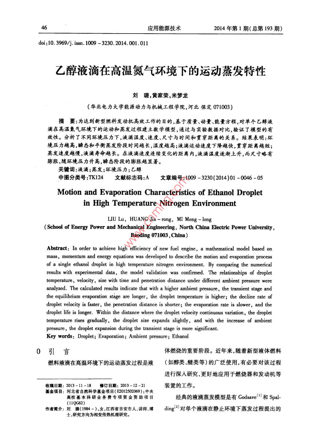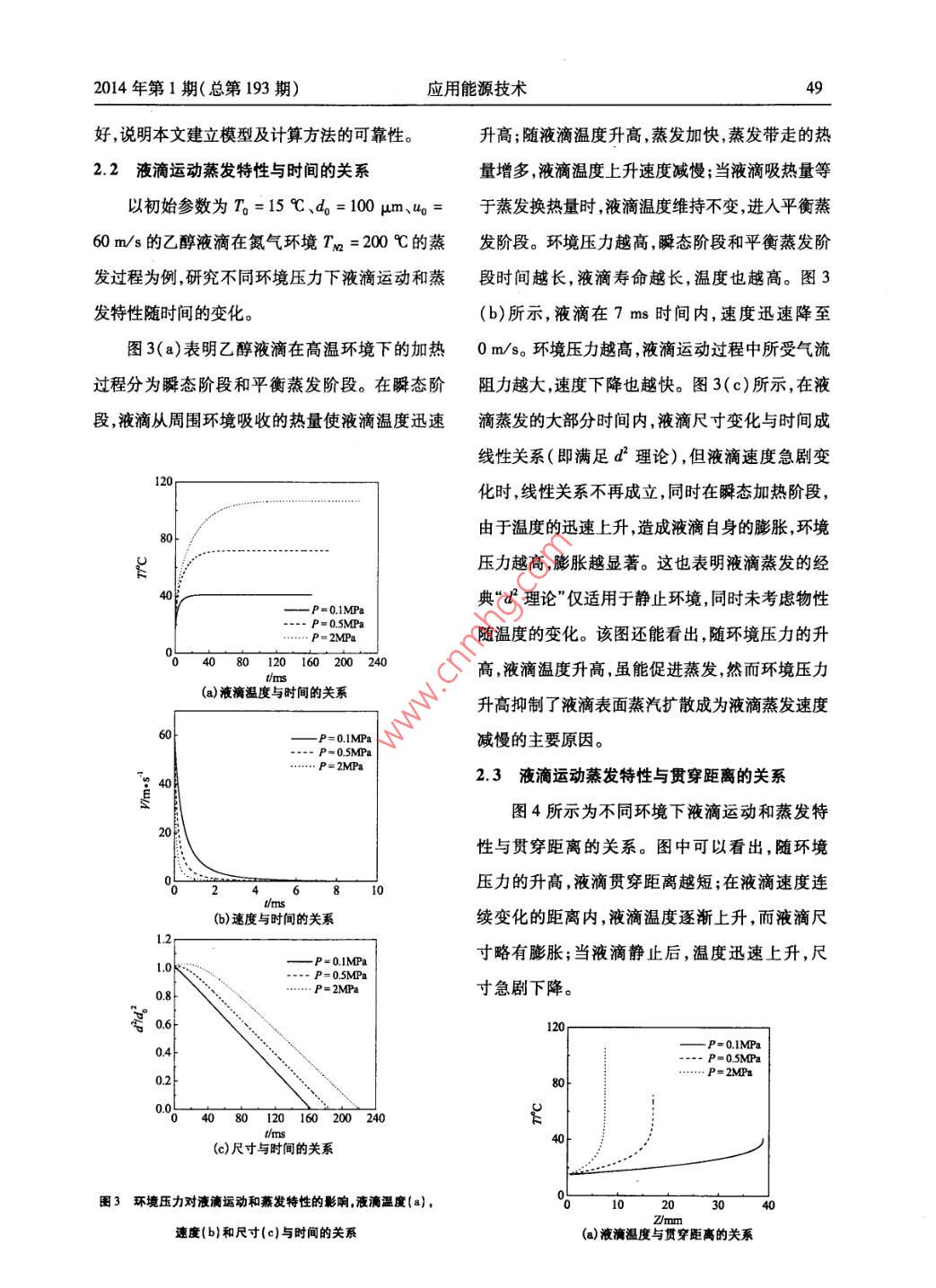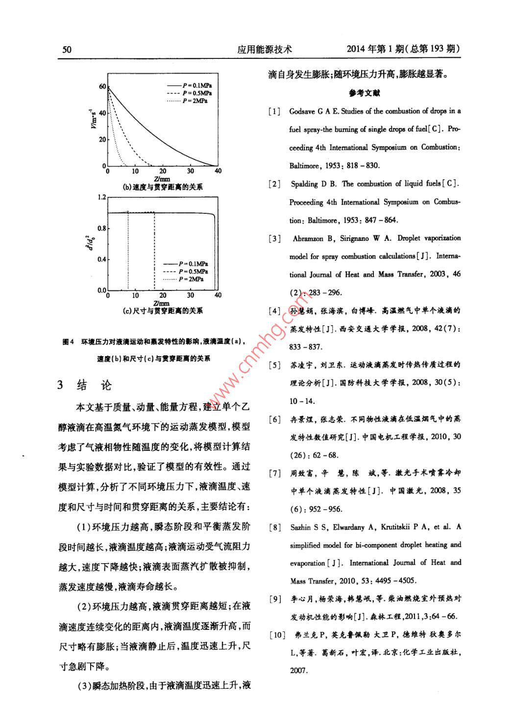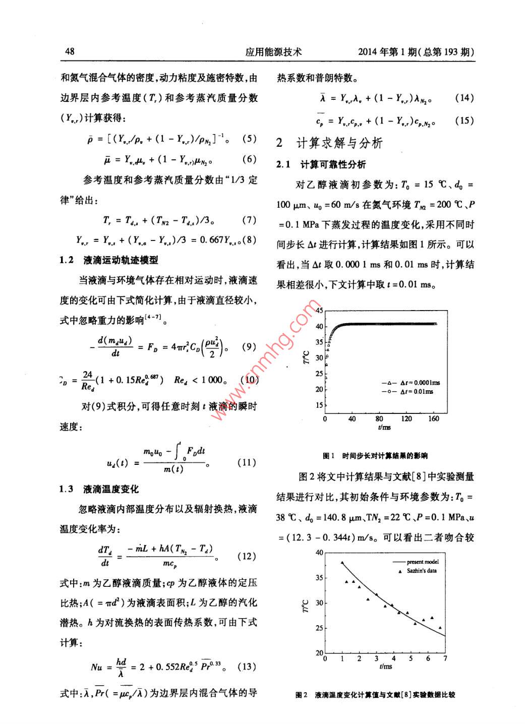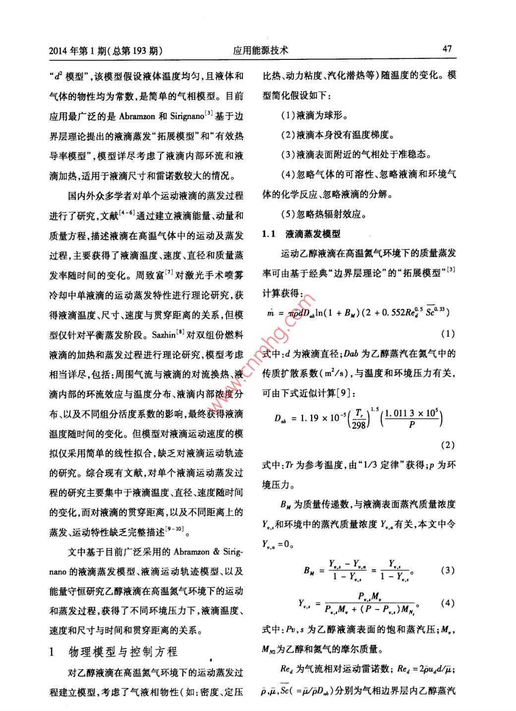 應(yīng)用能源技術(shù)2014年第1期(總第193期)doi:10.3969/j.isn.1009-3230.2014.001.011乙醇液滴在高溫氮氣環(huán)境下的運動蒸發(fā)特性劉璐,黃家榮,米夢龍(華北電力大學(xué)能源動力與機械工程學(xué)院,河北保定071003)摘要:為達到新型燃料發(fā)動機高效工作的目的,基于質(zhì)量、動量、能量方程,對單個乙醇液滴在高溫氮氣環(huán)境下的運動和蒸發(fā)過程建立數(shù)學(xué)模型,通過與實驗數(shù)據(jù)對比,驗證了模型的有效性。分析了不同環(huán)境壓力下,液滴溫度、速度、尺寸與時間和貫穿距離的關(guān)系。結(jié)果表明:環(huán)境壓力越高,瞬態(tài)和平衡燕發(fā)階段時間越長,溫度越高;液滴運動速度下降越快,貫穿距離越短;燕發(fā)速度越慢,液滴壽命越長。在液湳速度連續(xù)變化的距離內(nèi),液滴溫度逐漸上升,而尺寸略有膨脹,隨環(huán)境壓力升高,瞬態(tài)階段的膨脹越顯著。關(guān)鍵詞:液滴;蒸發(fā);環(huán)境壓力;乙醇中圖分類號:TK124文獻標(biāo)志碼:A文章編號:1009-3230(2014)01-0046-05Motion and Evaporation Characteristics of Ethanol Dropletin High Temperature Nitrogen EnvironmentLIU Lu, HUANG Jia-rong, MI Meng-longSchool of Energy Power and Mechanical Engineering, North China Electric Power UniversityBaoding 071003, China)Abstract: In order to achieve high efficiency of new fuel engine, a mathematical model based onmass,momentum and energy equations was developed to describe the motion and evaporation processof a single ethanol droplet in high temperature nitrogen environment. By comparing the numericalresults with experimental data, the model validation was confirmed. The relationships of droplettemperature, velocity, size with time and penetration distance under different ambient pressure wereanalyzed. The calculated results indicate that with a higher ambient pressure, the transient stage andthe equilibrium evaporation stage are longer, the droplet temperature is higher; the decline rate ofdroplet velocity is faster, the penetration distance is shorter; the evaporation rate is slower, and thedroplet life is longer. Within the distance where the droplet velocity continuous variation, the droplettemperature rises gradually, the droplet size expands slightly, and with the increase of ambientpressure, the droplet expansion during the transient stage is more significantKey words: Droplet; Evaporation; Ambient pressure; Ethanol0引言體燃燒的重要階段。近年來,隨著新型液體燃料燃料液滴在高溫環(huán)境下的運動蒸發(fā)過程是液(如醇類醚類等)的廣泛使用,有必要對該過程進行深入研究,更好地應(yīng)用于燃燒器和發(fā)動機等收稿日期:2013-11-18修訂日期:2013-12-21裝置的工作。基金項目:河北省自然科學(xué)基金項目(E2012502069);中央高?;究蒲袠I(yè)務(wù)費專項資金資助項目經(jīng)典的液滴蒸發(fā)模型是有 Godsave和spl-(10Q62)作者簡介:劉璐(984-),女江西省吉安市人,講師博ding2對單個液滴在靜止環(huán)境下蒸發(fā)過程提出的士,研究方向為相變傳熱機理研究。2014年第1期(總第193期)應(yīng)用能源技術(shù)d模型”,該模型假設(shè)液體溫度均勻,且液體和比熱、動力粘度、汽化潛熱等)隨溫度的變化。模氣體的物性均為常數(shù),是簡單的氣相模型。目前型簡化假設(shè)如下:應(yīng)用最廣泛的是 Abramzon和 Sirignano3基于邊(1)液滴為球形。界層理論提出的液滴蒸發(fā)“拓展模型”和“有效熱(2)液滴本身沒有溫度梯度。導(dǎo)率模型”,模型詳盡考慮了液滴內(nèi)部環(huán)流和液(3)液滴表面附近的氣相處于準(zhǔn)穩(wěn)態(tài)。滴加熱,適用于液滴尺寸和雷諾數(shù)較大的情況。(4)忽略氣體的可溶性、忽略液滴和環(huán)境氣國內(nèi)外眾多學(xué)者對單個運動液滴的蒸發(fā)過程體的化學(xué)反應(yīng)、忽略液滴的分解。進行了研究,文獻46通過建立液滴能量、動量和(5)忽略熱輻射效應(yīng)。質(zhì)量方程,描述液滴在高溫氣體中的運動及蒸發(fā)1.1液滴蒸發(fā)模型過程,主要獲得了液滴溫度、速度、直徑和質(zhì)量蒸運動乙醇液滴在高溫氮氣環(huán)境下的質(zhì)量蒸發(fā)發(fā)率隨時間的變化。周致富對激光手術(shù)噴霧率可由基于經(jīng)典“邊界層理論”的“拓展模型”1冷卻中單液滴的運動蒸發(fā)特性進行理論研究,獲計算獲得:得液滴溫度、尺寸速度與貫穿距離的關(guān)系,但模m=mdDl(1+B)(2+0.55S3)型僅針對平衡蒸發(fā)階段。 Sazhin!對雙組份燃料(1)液滴的加熱和蒸發(fā)過程進行理論研究模型考慮式中:d為液滴直徑;Dab為乙醇蒸汽在氮氣中的相當(dāng)詳盡,包括:周圍氣流與液滴的對流換熱、液傳質(zhì)擴散系數(shù)(m2/s),與溫度和環(huán)境壓力有關(guān),滴內(nèi)部的環(huán)流效應(yīng)與溫度分布、液滴內(nèi)部濃度分可由下式近似計算[9]:布、以及不同組分活度系數(shù)的影響,最終獲得液滴Dn=1.19×10-5(7,3/10113×l05溫度隨時間的變化。但模型對液滴運動速度的模擬僅采用簡單的線性擬合,缺乏對液滴運動軌跡的研究。綜合現(xiàn)有文獻,對單個液滴運動蒸發(fā)過式中:T為參考溫度,由“1/3定律”獲得;P為環(huán)程的研究主要集中于液滴溫度、直徑速度隨時境壓力。的變化,而對液滴的貫穿距離,以及不同距離上的B為質(zhì)量傳遞數(shù),與液滴表面蒸汽質(zhì)量濃度Y和環(huán)境中的蒸汽質(zhì)量濃度Y有關(guān),本文中令蒸發(fā)、運動特性缺乏完整描述10。F=0,文中基于目前廣泛采用的 abramzon& i Singnano的液滴蒸發(f