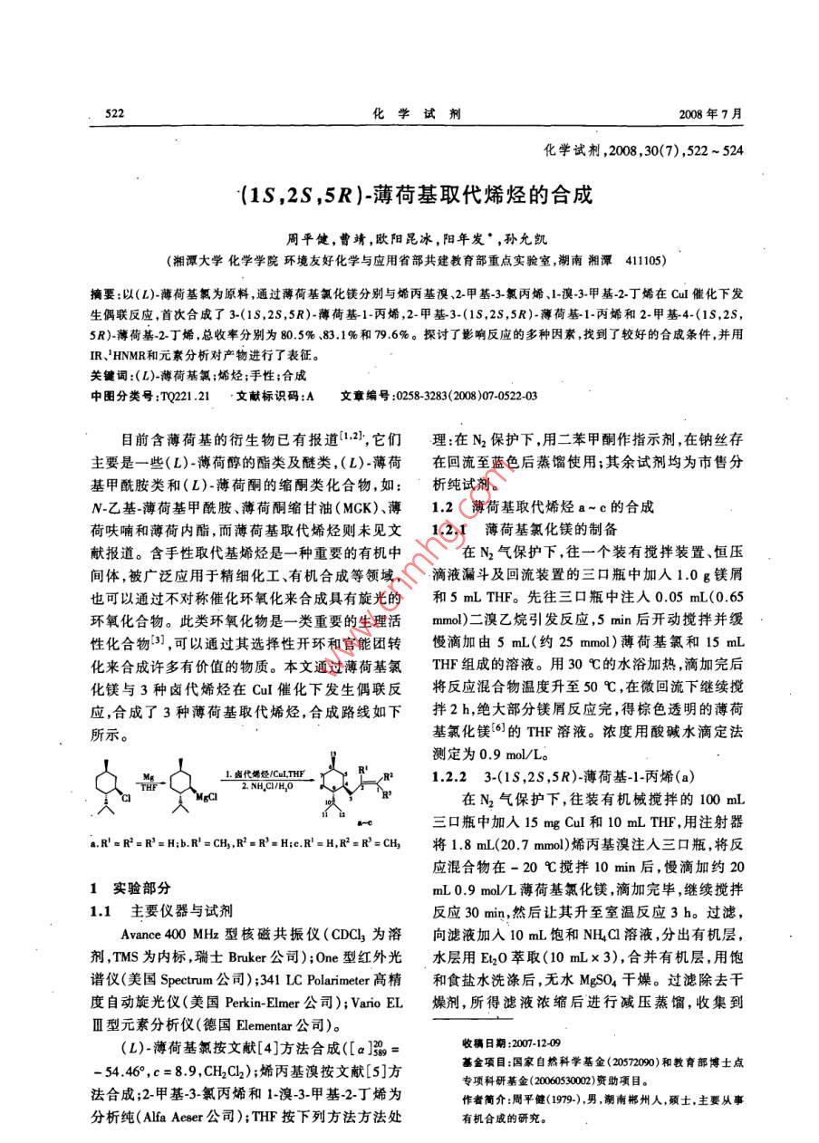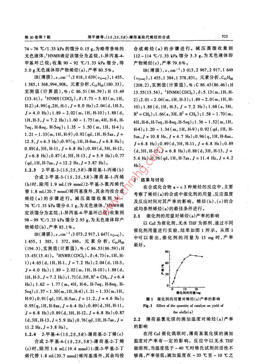 第30卷第7期周平健等:(1S,2S,5R)-薄荷基取代烯烴的合成,52374~76C/1.33kPa的餾分0.15g,為略帶香味的合成烯烴(a)的步驟進(jìn)行。減壓蒸餾收集到無色液體,'HNMR確定該餾分為孟烷,1-異丙基4-112~114 C/1.33 kPa餾分3.3 g,為無色液體即甲基環(huán)已烷;收集90~92 C/1.33 kPa餾分,得產(chǎn) 物烯烴(c),產(chǎn)率79.6%。3.0 g無色液體即產(chǎn)物烯烴(a),產(chǎn)率80.5%。IR(薄膜),v,cm-':3013,2 967,2 917,1 649IR(薄膜),v,cm-':2918,1 639(vC -c),1455,(vc -c),1 455,1 384,1 378,831。元素分析,CisH2g1 385,1 368 ,994,908。元素分析,C3H2(180.33),(208.2) ,實(shí)測(cè)值(計(jì)算值), %:C 86.43(86.46);H實(shí)測(cè)值(計(jì)算值),%:C 86.51(86.59);H 13.4913.55<(13.54)。1HNMR(CDCl]),8:5. 13(m,1H,H(13.41)。'HNMR(CDCl3), 8:5.73 ~5.83(m, 1H,2);2.01 ~2.04(m,1H, H-3);1.89~ 2.0(m,1H,H-H-2);4.99(q,2H,H-1,J =8.0 Hz);2.04(d,1H-3, .10);1.88(d,1H,H-3,J= 7.2 Hz); 1.68(8, 3H,J=4.0 Hz);1.89~ 2.02(m, 1H, H-10);1.88(d,R' = CHy);1.66(s,3H, R2= CHy);1.58~ 1.70(m,1H,H-3,J=7.2 Hz);1.60~ 1.75(m,4H, H-6, H-4H,H-6, H-7eq, H-8eq, H-5eq);1.36~ 1.52(m, 1H,7eq, H-8eq, H-5eq); 1.35 ~ 1.50(m, 1H, H4);H4);1.20~ 1.34(m, 1H, H-9);0.92(qd, 1H, H-1.21 ~.1.33(m, 1H, H-9);0.92(qd, 1H, H-5ax,J=5ax,J= 10.8 Hz,J =4.7 Hz);0. 96(q, 1H, H-8ax,12.5,J=4.3 Hz) ;0.97(q,1H,H-8ax,J=6.8 Hz);J=6.8 Hz);0.89(d,3H,H-11,J=6.8 Hz);0.890.89(d,3H,H-11,J=6.8 Hz);0.89(d, 3H, H-12,(d,3H,H-12,J=6.8 Hz);0.88(d,3H,H-13,J=J=6.8 Hz);0.87(d,3H, H-13,J=5.9 Hz);0.775.6 Hz) ;0.76(qd,1H,H-7ax,J=11.4 Hz,J=4.2(qd, 1H,H-7ax,J=12.2 Hz,J=3.87 Hz)。1.2.32-甲 基-3-(1S ,2s ,5R)-薄荷基-1-丙烯(b)Hz)。合成2-甲基-3-(1S,2S,5R)-薄荷基-1-丙烯2結(jié)果與討論(b)時(shí),除用1.9 mL(19 mmol)2-甲基-3-氯丙烯代在合成化合物a~c3種烯烴的反應(yīng)中,主要替1.8 mL(20.7 mmol)烯丙基溴外其余均按合成考察了烯烴(a)的合成中催化劑的用量、反應(yīng)溫度烯烴(a)的步驟進(jìn)行。臧壓蒸餾收集到74 ~及反應(yīng)時(shí)間對(duì)其產(chǎn)率的影響。烯烴(b)、(c) 的合76 C/1.33 kPa餾分0.1 g,為無色液體,' HNMR確成均參照烯烴(a)的最佳條件進(jìn)行。定該餾分為孟烷,1-異丙基4-甲基環(huán)己烷;收集到2.1 催化劑的用量對(duì)烯烴(a)產(chǎn)率的影響98~99 C/1.33 kPa餾分2.93 g,為無色液體即產(chǎn)以CuI為催化劑,無水THF為溶劑,通過不同物烯烴(b),產(chǎn)率83.1%。催化劑用量進(jìn)行實(shí)驗(yàn),結(jié)果如圖1所示。從圖1IR(薄膜),v,cm-1:3 073,2 917,1 647(vc- c),中可以看出,催化劑的用量為15 mg時(shí),產(chǎn)率.1455,1 385, 1 372, 886。 元素分析, C14H26最好。(194.3),實(shí)測(cè)值(計(jì)算值), % :C 86.53(86.59);H0[13. .45(13.41)。1HNMR( CDCl3), 8:4.73(s, 1H, H-1);4.65(d,1H,H-1,J= 7.2 Hz);2.04(d, 1H-3,1H,H-3,J=7.2 Hz);1.71(d,3H,R' = CHz,J=6.4Hz);1.62 ~ 1.77(m, 4H, H-6, H-7eq, H-8eq, H-5eq);1.37~ 1.50(m,1H,H-4);1.21 ~ 1.33(m,1H,催化劑的用量/mgH-9);0.91(qd, 1H,H-5ax,J= 11.2,J=4.6 Hz);圈1催化劑的用量對(duì)烯烴(a)產(chǎn)率的影響0.95(q,1H,H8ax,J=6.4 Hz);0.89(d,3H,H-11,Fig.1 Eflect of the quantity of catalyst on yield ofJ=6.8 Hz);0.89(d,3H,H-12,J=6.8 Hz);0.87the oleln(a).(d,3H,H-13,J=5.9 Hz) ;0.76(qd,1H,H-7ax,J=2.2薄荷基氯化鎂的滴加溫度對(duì)烯烴(a)產(chǎn)率11.2 Hz,J=3.8 Hz)。的影響1.2.4 2-甲基-4-(1S ,2S ,5R)-薄荷基-2-丁烯(c)在用Cul催化偶聯(lián)時(shí),薄荷基氯化鎂的滴加合成2-甲基4-(1s,2S,5R)-薄荷基-2-丁烯溫度對(duì)產(chǎn)率有一定的影響。反應(yīng)中以無水THF(c)時(shí),除用1.6 mL(19.4 mmol)1-澳-3-甲基-2-丁做溶劑,當(dāng)溫度低于-40 C時(shí)格氏試劑的活性不烯代替1.8 mL(20.7 mmol)烯丙基溴外,其余均按夠高,產(chǎn)率很低;滴加溫度在-20 C至- 10 C之524化學(xué)試劑2008年7月間,產(chǎn)率高;以后隨著反應(yīng)溫度的升高,產(chǎn)率明顯荷基甲酰胺的合成研究[].香料香精化妝品,2005,下降,用TLC跟蹤反應(yīng),發(fā)現(xiàn)溫度高于25C后副(1):7-8.[2]王建新,聶侃.涼型風(fēng)味料介紹[J].香料香精化妝品,產(chǎn)物增多。溫度對(duì)產(chǎn)率的影響如圖2。2003,(2):33-35. .[3]RAO A S,PAKNIKAR s K, KIRTANE J G.Recent advances70in the preparation and ration and synthetic applications of oxi-ranes[J]. Tetrahedron , 1983 ,39(14) :2 323-2 367.[4]SMTTH J G, WRICHT G F.The diastercomerie menthyl chlo-rides obtained from(-) menthol[J]. J. Org. Chem., 1952,17-20(8):1 116-1 121.反應(yīng)溫度/C[5]樊能廷有機(jī)合成事典[M].北京:北京理工大學(xué)出版.圉2反應(yīng)溫度對(duì)烯 烴(a)產(chǎn)率的影響社,1992:3.Fig.2 Efect of the reaction temperature on yield[6]BETHELL D, BULMAN P P C, VAHEDI H. Catalytic aym-of the olen(a)metric oxidation of sulfides to sulfoxides mediated by chiral 3-2.3反應(yīng)時(shí) 間對(duì)烯烴(a)產(chǎn)率的影響subtitued-1, 2-benzisothiazole 1, 1-dioxides[J]. J. 0rg.80Chem. ,2000,65(20) :6 756-6 760.gooThe synthesis of (1S, 2S , 5R )-menthyI substituted olefInsZHOU Ping-jian, CAO Jing, OUYANC Kun-bing, YANG Nian~fa° ,SUN Yun-kai (Key Laboratory of Environmentally FriendlyChemisty and Application of Ministry of Education, College of反應(yīng)時(shí)間/bChermisty, Xiangtan University , Xiangtan 411105 , China) , Hua-圈3反應(yīng)時(shí)間對(duì)烯烴(a)產(chǎn)率的影響xue Shiji ,2008 ,30(7) ,522 ~ 524Fig.3 Efeet of the reaction time on yield of the oleIn(a)Abtract:3-(1S ,2s ,5R)-Menhylprop-1.ene ,2-methy-3-(1S,反應(yīng)時(shí)間對(duì)烯烴(a)產(chǎn)率的影響如圖3所示。2S, 5R )-menthylprop-1-ene and 2-methy-4-(1s, 2s, 5R)-薄荷基氯化鎂在-20C滴加,滴加完畢繼續(xù)攪拌menthylbul-2- ene had been prepared via the reaction of menthylmagnesium chloride with alkenyl halide in the presence of copper30 min后再在室溫反應(y
