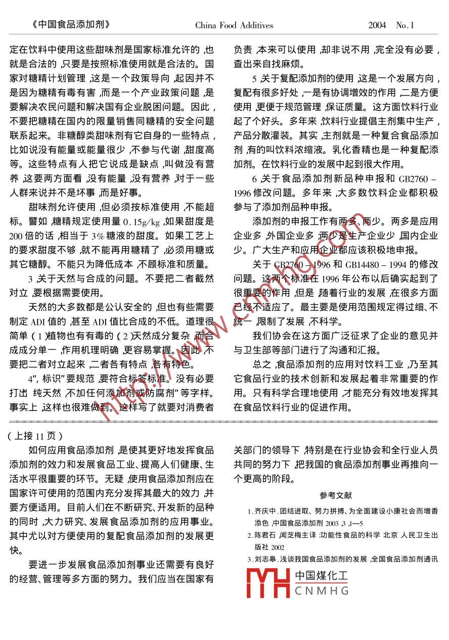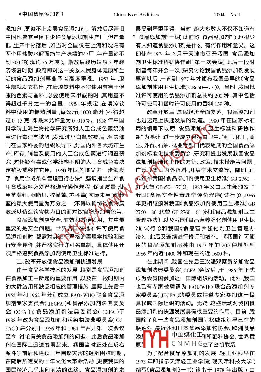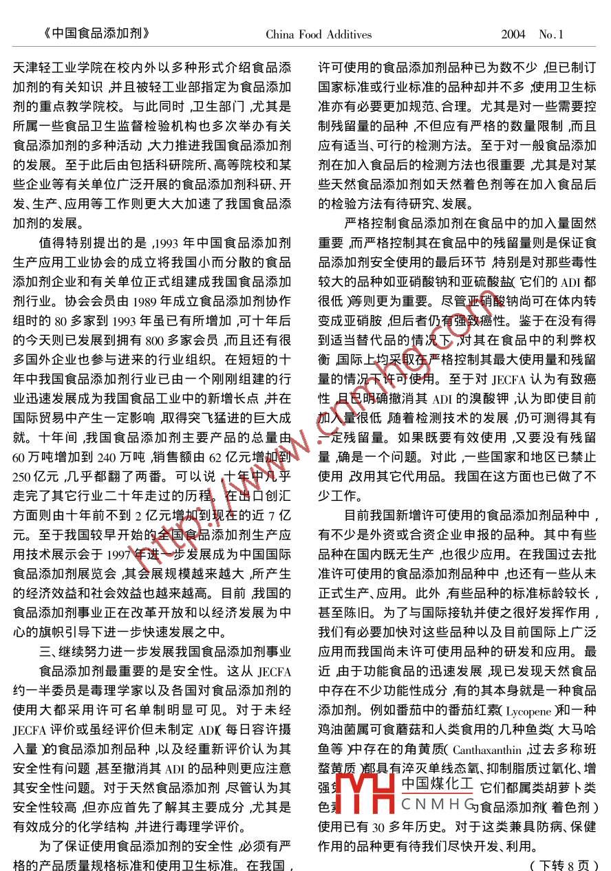 《中國食品添加劑》China Food Additives2004 No.1再談我國食品添加劑的發(fā)展劉志皋(天津科技大學,天津300222 )摘要食品添加劑做為現(xiàn)代食品工業(yè)重要的科技創(chuàng)新推動力,以及其有利于食品加工保藏、增加花色品種、提高食品感官質量和營養(yǎng)價值的重要作用越來越受到人們的重視。筆者曾在本刊1993年第3期上發(fā)表了淺淡我國食品添加劑的發(fā)展”時至今日已十年有余我國食品添加劑行業(yè)發(fā)生了巨大變化,有感撰文再談我國食品添加劑的發(fā)展"。關鍵詞再談,食品添加劑發(fā)展The Development of Chinese Food AdditiveLiu Zhigao( Tianjin Science and Technology University , Tianjin 300222 )Abstract :Food additives and ingredients are considered as the important power of improving scientific and technological innova-tion in food industry. It benefits to food preservation , increasing food species , improving food sensory quality and nutritive val-ue. In this paper,it showed the development of Chinese food additive and ingredients industry , especially in the past ten years.Key words :Food additive , Development食品添加劑因有利于食品加工保藏增加食品有-定規(guī)模的工業(yè)體系。產品除在國內廣泛銷售花色品種提高食品感官質量和營養(yǎng)價值等現(xiàn)已外,一些品種也已走向世界,在國際食品添加劑市幾乎人所共知。至于其在國民經(jīng)濟中的作用隨著場上占有一席之地,有的品種甚至還占據(jù)主導地我國食品工業(yè)上升為國民經(jīng)濟各部門之首的支柱位。例如我國味精、檸檬酸、木糖、木糖醇和乙基麥產業(yè)而逐漸被人們認識并不斷發(fā)展。食品添加劑芽酚等的產量均保持世界第- -。尤其是檸檬酸、山又是現(xiàn)代食品工業(yè)不可缺少的重要輔助材料或食梨酸鉀、維生素C等現(xiàn)已成為具有國際競爭力和品中的特殊配料現(xiàn)已獲取沒有食品添加劑就沒以出口為主的食品添加劑品種,而像檸檬酸等的產有現(xiàn)代食品工業(yè)”的美譽。量和出口量均居世界第一。據(jù)報告,目前全世界使用的食品添加劑約一、新中國成立是我國食品添加劑發(fā)展的基礎4000~ 5000種,美國使用的品種最多,約3000多盡管通常認為食品添加劑的發(fā)展只是近-一個種歐洲和日本約為2000種我國經(jīng)國家批準許可多世紀以來的事但人們使用食品添加劑的歷史悠使用的食品添加劑品種,至2002年也已近1600久。我國在距今約2000年前的東漢時期就已使用種。至于我國食品添加劑的產量,2002年,全國已凝固劑鹽鹵點制豆腐并一直流傳至今。 800 年前,達240萬噸銷售額約為人民幣250億元,出口創(chuàng)南中國煤化工肉,使之防腐、發(fā)色和匯近7億美元。在改革開放以來的短短20多年增YHCNMHG。這些都是天然食品中我國的食品添加劑已經(jīng)由品種少、產量低、質量添加劑的應用但新中國成立前并未能對其進行深不夠穩(wěn)定生產企業(yè)小而分散根本談不上稱其為入了解和發(fā)展。行業(yè)的情況下發(fā)展成為初步標準化、國際化并具解放前中國人民饑寒交迫不僅不了解食品《中國食品添加劑》China Food Additives2004 No.1添加劑更談不上發(fā)展食品添加劑。解放后盡管舊展受到嚴重阻礙。當時絕大多數(shù)人不僅不知道有中國也曾零星留下少許食品添加劑生產廠但產量“食品添加劑”-詞此前稱食品副加劑”),也很少低生產十分落后,如當時全國僅在上海和沈陽有有人知道食品添加劑是什么,有何作用和意義。這兩個用鹽酸水解面筋生產味精的小廠年產量尚不即使在1974年2月于天津市召開我國食品添加到300噸(現(xiàn)約75萬噸》解放后經(jīng)歷短短3年經(jīng)劑衛(wèi)生標準科研協(xié)作組"第-次會議(此后-段時濟恢復時期政府即對這-關系人民身體健康和生期曾每年開會-次)研究討論我國食品添加劑發(fā)展活的食品添加劑事業(yè)予以高度重視。1953年 ,衛(wèi)事宜以后一直到1977年才頒布我國最早的《食品生部就發(fā)文指出在清涼飲料中不得使用有害于健添加劑使用衛(wèi)生標準( GBn50- -77 )》。當時我國批康的色素與香料必要使用苯甲酸鈉時其用量不準許可使用的食品添加劑總共約200種其中包括得超過千分之一的含量。1954 年規(guī)定,在清涼飲許可使用和暫時許可使用的香料139種。料中使用的糖精劑量,每公斤( 1000毫升)不得超改革開放后國民經(jīng)濟全面復蘇。食品添加劑過0.15克即最大允許量為0.015%。1958 年中國也迅速走上快速發(fā)展的軌道。1980年在國家標準科學院.上海生物化學研究所對人工合成色素奶油局的領導下以原食品添加劑衛(wèi)生標準科研協(xié)作黃進行毒理學試驗發(fā)現(xiàn)對小白鼠致癌后,有關部組”為基礎進-步成立包括由衛(wèi)生、輕工、化工、商門在國家科委的組織領導下對國內外各大城市生業(yè)、外貿、石油、林業(yè)等部門]代表組成的全國食品添產、庫存、銷售及使用的人工合成色素進行調查研加劑標準化技術委員會研究和提出發(fā)展我國食品究對懷疑有毒或化學結構不明的人工合成色素決添加劑標準化工作的方針、政策、技術措施等問題,定銷毀或移作它用。1960 年國務院又進一步頒發(fā)廣泛收集國內外資料開展學術交流等。隨即,正了食用合成染料管理暫行辦法”強調指出生產食式頒布我國《食品添加劑使用衛(wèi)生標準( CB 2760-用合成染料必須嚴格遵守操作規(gu