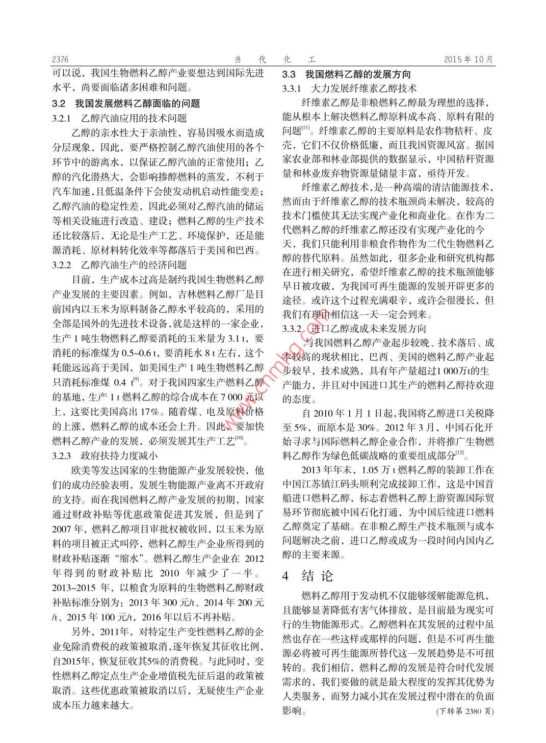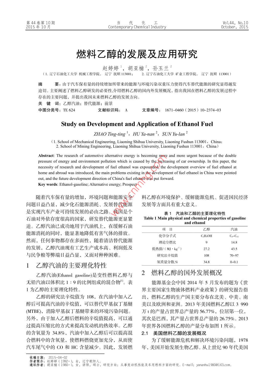 第44卷第10期 Vol.44, No.10015年10月當代化 Contemporary Chemical Industry October,2015燃料乙醇的發(fā)展及應(yīng)用研究趙婷婷1,胡亞楠2,孫玉蘭2(1.遼寧石油化工大學(xué)機械工程學(xué)院,遼寧撫順1130012.遼寧石油化工大學(xué)礦業(yè)工程學(xué)院,遼寧順113001摘要:由于汽車保有量的持續(xù)增加所帶來的能源與環(huán)境污染雙重壓力使得汽車替代能源的研究顯得越發(fā)迫切。主要闡述了燃料乙醇研發(fā)的必要性介紹燃料乙醇的國內(nèi)外發(fā)展概況,指出我國在燃料乙醇的發(fā)展過程中存在的主要問題,并提出我國未來燃料乙醇的發(fā)展方向。關(guān)鍵詞:乙醇汽油;替代能源;前景中圖分類號:TE624文獻標識碼:A文章編號:1671-460(2015)10-2374-03 Study on Development and Application of Ethanol Fuel ZHAO Ting-ting', HU Ya-nan2, SUN Yu-lan 2 (1. School of Mechanical Engineering, Liaoning Shihua University, Liaoning Fushun 113001, China; 2. School of Mining Engineering, Liaoning Shihua University Liaoning Fushun 113001, China) Abstract: The research of automotive alternative energy is becoming more and more urgent because of the double pressure of energy and environment pollution wh nt s caused by the increasing of car ownership. In this paper, the necessity of research and development of fuel ethan hom s expounded, the development overview of fuel ethanol at ome and abroad was introduced, the main problems existing in the development of fuel ethanol in China were pointed out, and the future development direction of China's fuel ethanol was put forward. Key words: Ethanol-gasoline; Alternativ隨著汽車保有量的增加,環(huán)境問題和能源安全料乙醇在環(huán)境保護、緩解能源危機、促進國民經(jīng)濟問題日益凸顯,減少化石能源消耗、發(fā)展替代能源發(fā)展等方面具有重大意義。是實現(xiàn)汽車產(chǎn)業(yè)可持續(xù)發(fā)展的必由之路。我國是個表1汽油和乙醇的主要理化特性 of gasoline石油對外依存度很高的國家,研發(fā)替代能源更顯緊 Table Main physical and cethaioal properties ical and chen迫。乙醇汽油已成功地用于汽油機上,在緩解石油項目乙醇汽油能源消耗的同時,能顯著地降低有害氣體的排放。化學(xué)分子式 C2HSOH C-Ci2然而,任何事物都存在多面性,隨著清潔替代能源理論空燃比914.8的發(fā)展,乙醇汽油現(xiàn)有工藝生產(chǎn)成本高、利潤低及低熱值/(MJ·kg)27.243.5與民爭糧等弊端日益凸顯,又面對種種困難。研究法辛烷值108709734.80-0.11乙醇汽油的主要理化特性氧質(zhì)量分數(shù)%乙醇汽油(Ethanol gasoline)是變性燃料乙醇與2燃料乙醇的國外發(fā)展概況無鉛汽油以體積比1:9的比例組成的混合物。表能源基金會中國2014年5月發(fā)布的題為《世1為乙醇的主要理化特性。界主要國家生物液體燃料產(chǎn)業(yè)政策》的研究報告指乙醇的研究法辛烷值為108,在汽油中加入乙出,燃料乙醇的生產(chǎn)國主要分布在北美、中美、南醇后可提高汽油的辛烷值,可以替代甲基叔丁基醚美以及歐洲和亞洲。2013年美國燃料乙醇以3990(MTBE),消除甲基叔丁基醚帶來的環(huán)境污染問題。萬t的產(chǎn)量占世界總產(chǎn)量的56.77%,位居第一位,另外,由于加入乙醇后燃料的辛烷值提高,可以通其次是巴西,其產(chǎn)量占世界總產(chǎn)量的26.75%。2013過提高壓縮比的方式來提高發(fā)動機的熱效率。乙醇年世界各國燃料乙醇的產(chǎn)量分布如圖1所示。的含氧量為34.8%,汽油中加入乙醇后可以提高混2.1美國燃料乙醇的發(fā)展概況合燃料中的含氧量,使燃料燃燒更加充分,從而使為了緩解能源危機和解決環(huán)境污染問題,1978汽車尾氣中的CO和HC含量減少因此,發(fā)展燃年,美國開始發(fā)展生物乙醇。從上世紀90年代美國收稿日期:2015-04-02作者簡介:趙婷婷(1992-),女,遼寧朝陽人通訊作者:胡亞楠(1980-),女,講師,碩士,研究方向:從事發(fā)動機性能及車用燃料方面的研究。-mail: :(1980-),, e-mail: yananhul980@163.coma980163.com第44卷第10期趙婷婷,等:燃料乙醇的發(fā)展及應(yīng)用研究2375實現(xiàn)燃料乙醇的商業(yè)化生產(chǎn)開始,其乙醇產(chǎn)量一直醚直接調(diào)和而成。2013年,歐盟以約411.3萬t的處于平穩(wěn)增長狀態(tài)。自2006年生物燃料乙醇產(chǎn)量超乙醇產(chǎn)量,占世界乙醇總產(chǎn)量的5.85%過巴西以后,美國一直穩(wěn)居世界最大燃料乙醇生產(chǎn)國的位置。2011年美國乙醇產(chǎn)量達到4170萬,這3我國燃料乙醇的發(fā)展問題2012年4月,美國環(huán)保署(EPA)通過了一3使美國減少了4.8億桶石油的進口。正因如此1我國燃料乙醇發(fā)展概況生物燃料乙醇在巴西、美國應(yīng)用多年,技術(shù)上劃,汽油中乙醇調(diào)合比例由先前的10%提高到15,已十分成熟,而我國在燃料乙醇發(fā)展方面起步卻比以供2001年及以后生產(chǎn)的汽車和卡車使用。這意較晚。2004年2月,經(jīng)國務(wù)院同意,國家發(fā)改委等8味著美國將近三分之二的車輛都可以使用含有1%部門聯(lián)合制定頒布了《車用乙醇汽油擴大試點工作乙醇的乙醇汽油混合燃料,足以證明乙醇汽油在節(jié)實施細則》和《車用乙醇汽油擴大試點方案》,車用能減排方面所具有的優(yōu)勢。乙醇汽油試點工作全面啟動。從2004年4月起,在黑龍江、吉林、遼寧、河南、安徽五省全部地區(qū),以2.972.3322331■美國及河北、山東、江蘇、湖北四省部分地市全面推廣5.8■巴西使用車用乙醇汽油。到2006年底,車用乙醇汽油56.77