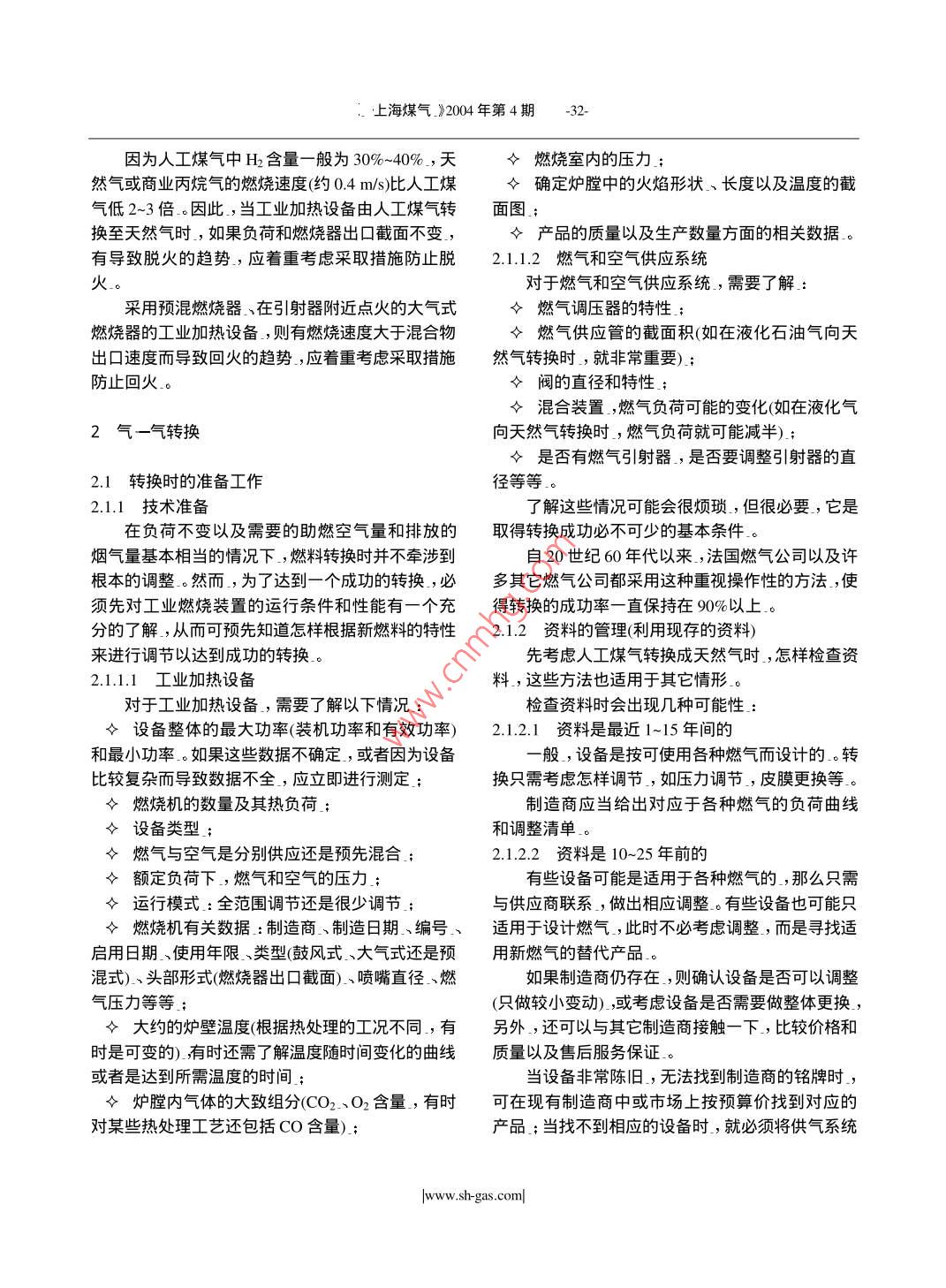 上海煤氣_》2004年第4期向天然氣轉(zhuǎn)換時工業(yè)加熱設備的調(diào)整上海燃氣浦東銷售有限公司王謹楊鳳玲摘要:文章介紹了氣體和液體燃料用于工業(yè)加熱的一些基本特性,以及對工業(yè)加熱設備的燃料從人工煤氣或油向天然氣轉(zhuǎn)換時,設備應做的調(diào)整。關鍵詞:工業(yè)加熱設備人工煤氣油天然氣技術準備設備調(diào)整由于天然氣是一種高效、清潔能源,天然氣將備在燃料轉(zhuǎn)換時有如下的基本特征得到大規(guī)模應用。由于將進行燃料的轉(zhuǎn)換,即從人工煤氣或油轉(zhuǎn)換至天然氣。許多工業(yè)加熱設備需要1.1燃燒產(chǎn)物無根本變化做一些相應的調(diào)整。在由一種燃料向另一種燃料過渡時,其燃燒產(chǎn)物的組分并不會發(fā)生根本的變化,只是因燃料的特1氣體和液體燃料用于工業(yè)加熱的一些基本特征性不一樣,產(chǎn)物中的CH比會發(fā)生一些變化。在按化學計量比燃燒的情況下,產(chǎn)生的煙氣中工業(yè)加熱設備所涉及的燃料一般都是碳氫化CO2比例是:天然氣1%-12%,油15%-16%,人合物(CHn)燃燒釋放出的產(chǎn)物隨燃燒狀況(如燃料工煤氣是12%-15%的性質(zhì),空燃比、過氧燃燒還是缺氧燃燒等)而變。過氧燃燒時,燃燒產(chǎn)物主要為CO2,HO,O2和1.2燃燒空氣量與煙氣量基本相當N2;而缺氧燃燒時,燃燒產(chǎn)物主要為CO和H2。在相當?shù)臒嶝摵?燃燒所需的空氣量基本相當,燃燒氣體燃料時還可能會岀現(xiàn)未燃盡顆粒(自由所產(chǎn)生的煙氣量也基本相當(表1),這是一個涉及碳),液體燃料燃燒時,更是經(jīng)常如此。工業(yè)加熱設工業(yè)燃燒實際的基本特征。表1各種燃料助燃空氣量與煙氣量lkWh(低熱值)所需助燃空氣量(m3)kWh低熱值)所產(chǎn)生的濕煙氣量(m)天然氣液化石油氣人工煤氣油然氣液化石油氣人工煤氣油0.880.98由此可以得出工業(yè)加熱設備進行燃料轉(zhuǎn)換的則是2000℃,兩者相差60-70:℃,即從油轉(zhuǎn)換為般結(jié)論天然氣時,燃燒溫度要下跌3.5%。這是由過量空氣在由一種燃料向另一種燃料轉(zhuǎn)換時,供給燃燒所導致的所需空氣的設備不必做調(diào)整或改動這一點對一體在對工業(yè)加熱設備進行燃料轉(zhuǎn)換后,燃燒溫度化的燃燒機尤為重要);同樣,燃料變動時,排煙系并不會引起明顯的變化統(tǒng)也不必做變動(對原來燒重油的情況在考慮酸露點時,尤其如此)1.4爆燃速度(燃燒速度)概括地講,對于爆燃速度,主要考慮兩個因素3燃燒溫度由熱傳導而引起的混合物過熱與自由基層向未燃天然氣的平均理論燃燒溫度為1930℃,而油層的傳導速度。www.sh-gas.com上海煤氣_》2004年第4期因為人工煤氣中H含量一般為30%~40%,天◆燃燒室內(nèi)的壓力然氣或商業(yè)丙烷氣的燃燒速度(約0.4m/s比人工煤◆確定爐膛中的火焰形狀、長度以及溫度的截氣低2~3倍。因此,當工業(yè)加熱設備由人工煤氣轉(zhuǎn)面圖換至天然氣時,如果負荷和燃燒器出口截面不變◇產(chǎn)品的質(zhì)量以及生產(chǎn)數(shù)量方面的相關數(shù)據(jù)有導致脫火的趨勢,應著重考慮采取措施防止脫2.1.1.2燃氣和空氣供應系統(tǒng)火對于燃氣和空氣供應系統(tǒng),需要了解采用預混燃燒器、在引射器附近點火的大氣式◆燃氣調(diào)壓器的特性燃燒器的工業(yè)加熱設備,則有燃燒速度大于混合物◇燃氣供應管的截面積(如在液化石油氣向天出口速度而導致回火的趨勢,應著重考慮采取措施然氣轉(zhuǎn)換時,就非常重要)防止回火◇閥的直徑和特性;◇混合裝置,燃氣負荷可能的變化(如在液化氣2氣一氣轉(zhuǎn)換向天然氣轉(zhuǎn)換時,燃氣負荷就可能減半);◇是否有燃氣引射器,是否要調(diào)整引射器的直2.1轉(zhuǎn)換時的準備工作徑等等。21.1技術準備了解這些情況可能會很煩瑣,但很必要,它是在負荷不變以及需要的助燃空氣量和排放的取得轉(zhuǎn)換成功必不可少的基本條件煙氣量基本相當?shù)那闆r下,燃料轉(zhuǎn)換時并不牽涉到自20世紀60年代以來,法國燃氣公司以及許根本的調(diào)整。然而,為了達到一個成功的轉(zhuǎn)換,必多其它燃氣公司都采用這種重視操作性的方法,使須先對工業(yè)燃燒裝置的運行條件和性能有一個充得轉(zhuǎn)換的成功率一直保持在9%以上.。分的了解,從而可預先知道怎樣根據(jù)新燃料的特性2.1.2資料的管理(利用現(xiàn)存的資料)來進行調(diào)節(jié)以達到成功的轉(zhuǎn)換」先考慮人工煤氣轉(zhuǎn)換成天然氣時,怎樣檢查資21.1.1工業(yè)加熱設備料,這些方法也適用于其它情形對于工業(yè)加熱設備,需要了解以下情況檢查資料時會出現(xiàn)幾種可能性令設備整體的最大功率(裝機功率和有效功率)2.1.2.1資料是最近1-15年間的和最小功率。如果這些數(shù)據(jù)不確定,或者因為設備一般,設備是按可使用各種燃氣而設計的轉(zhuǎn)比較復雜而導致數(shù)據(jù)不全,應立即進行測定換只需考慮怎樣調(diào)節(jié),如壓力調(diào)節(jié),皮膜更換等」◇燃燒機的數(shù)量及其熱負荷制造商應當給出對應于各種燃氣的負荷曲線◇設備類型;和調(diào)整清單?!笕細馀c空氣是分別供應還是預先混合2.122資料是10~25年前的◇額定負荷下,燃氣和空氣的壓力有些設備可能是適用于各種燃氣的,那么只需◇運行模式:全范圍調(diào)節(jié)還是很少調(diào)節(jié)與供應商聯(lián)系,做出相應調(diào)整。有些