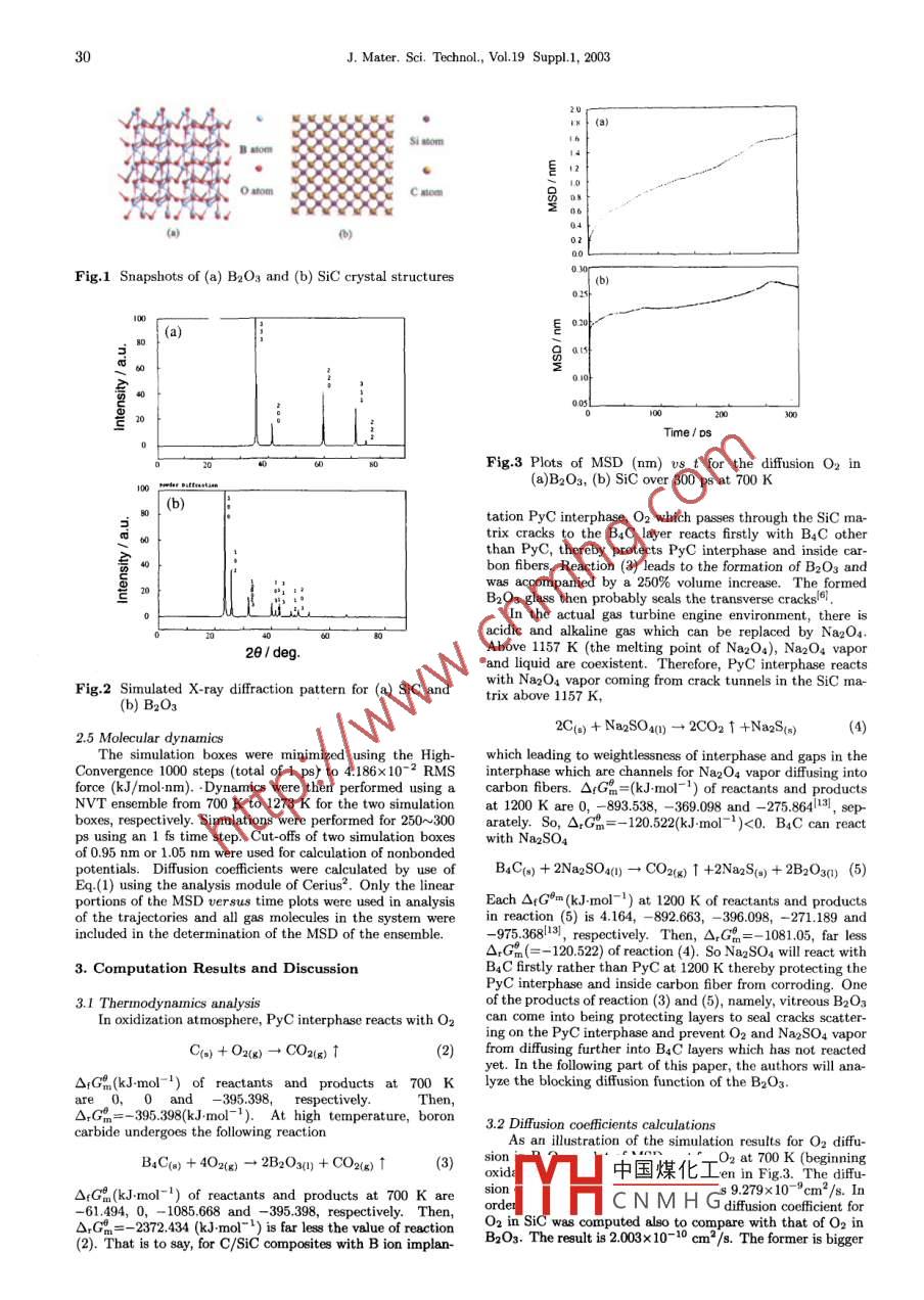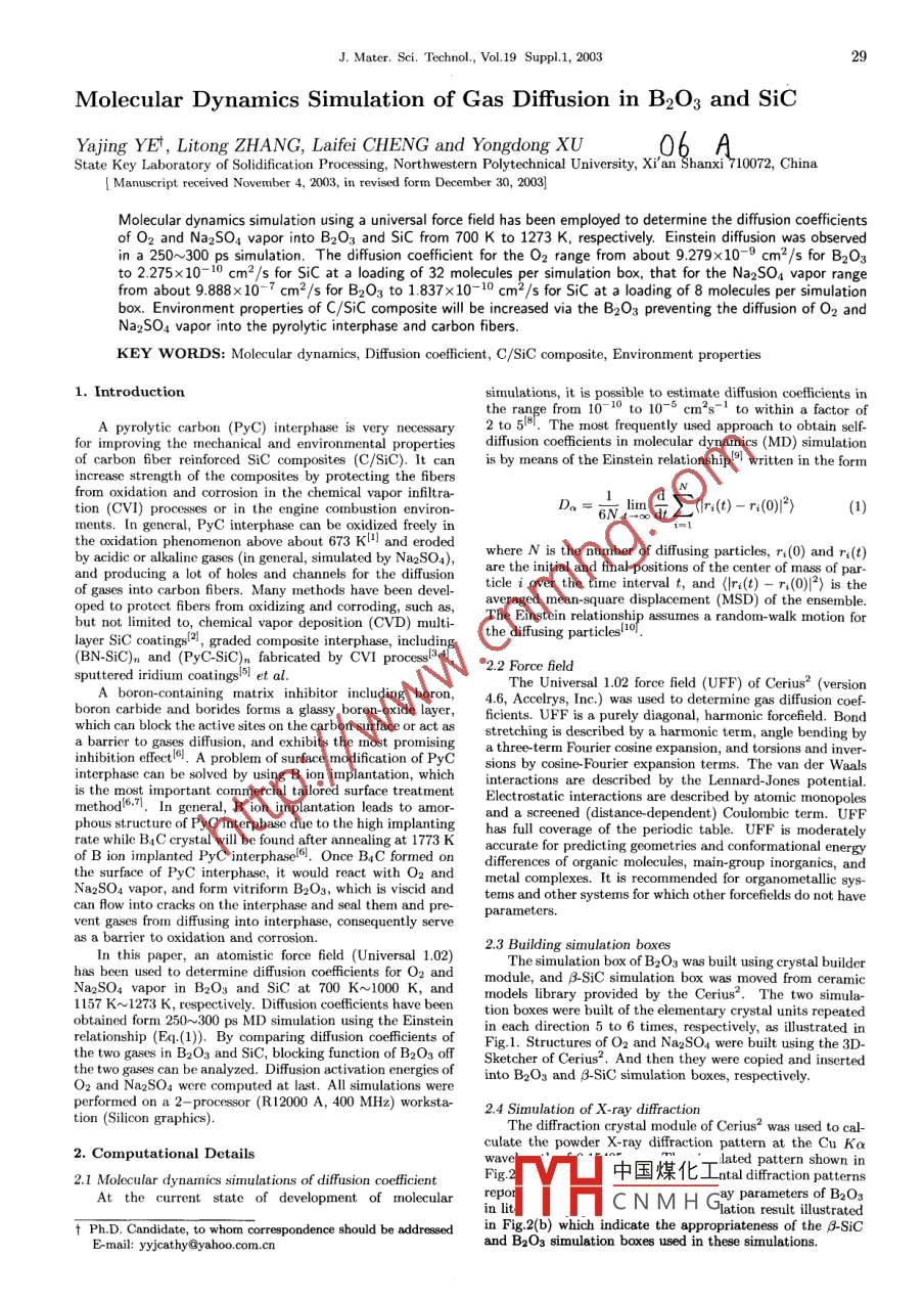 J. Mater. Sci. Technol, Vol.19 Suppl.1, 200329Molecular Dynamics Simulation of Gas Diffusion in B2O3 and SiCYajing YE*, Litong ZHANG, Laifei CHENG and Yongdong XU 06 AState Key Laboratory of Solification Processing, Northwestern Polytechnical University, Xi an Shanxi 710072, China[ Manuscript received November 4, 2003, in revised form December 30, 2003]Molecular dynamics simulation using a universal force field has been employed to determine the diffusion cofficientsof O2 and Na2SO4 vapor into B2O3 and SiC from 700 K to 1273 K, respectively. Einstein diffusion was observedin a 250~300 ps simulation. The diffusion cofficient for the 02 range from about 9.279x10 9 cm2/s for B2O3to 2.275x10-10 cm2/s_ for SiC at a loading of 32 molecules per simulation box, that for the Na2SOs vapor rangefrom about 9.888x10- 7 cm2/s for B2O3 to 1.837x10-10 cm2/s for SiC at a loading of 8 molecules per simulationbox. Environment properties of C/SiC composite will be increased via the B2O3 preventing the diffusion of O2 andNa2SOs vapor into the pyrolytic interphase and carbon fibers.KEY WORDS: Molecular dynamics, Difusion cofficient, C/SiC composite, Environment properties1. Introductionsimulations, it is possible to estimate difusion coefficients inthe range from 10-10 to 10-5 cm2s-1 to within a factor ofA pyrolytic carbon (PyC) interphase is very necessary2to 58. The most frequently. used approach to obtain self-for improving the mechanical and environmental propertiesdifusion coefficients in molecular dynamics (MD) simulationof carbon fiber reinforced SiC composites (C/SiC). It canis by means of the Einstein relationshipl9l written in the formincrease strength of the composites by protecting the fibersfrom oxidation and corrosion in the chemical vapor infiltra-ion (CV1) processes or in the engine combustion environ-Da=;6N t-∞dt乙ll。2(r()- r()1)(1)ments. In general, PyC interphase can be oxidized freely inthe oxidation phenomenon above about 673 K{[] and erodedwhere N is the number of diffusing particles, r:(0) and r:(t)by acidic or alkaline gases (in general, simulated by Na2SO4),are the initial and final positions of the center of mass of par-and producing a lot of holes and channels for the diffusionticle i over the time interval t, and <{|r:(t) - r(0)|-)istheof gases into carbon fibers. Many methods have been devel-averaged mean-square displacement (MSD) of the ensemble.oped to protoct fbers from oxidizing and corroding, such as,The Einstein relationship assumes a random- walk motion forbut not limited to, chemical vapor deposition (CVD) multi-the difusing particlesllayer SiC coatings|2l , graded composite interphase, including(BN-SiC)n and (PyC-SiC)n fabricated by CVI processl3.4,2.2 Force fieldsputtered iridium coatingsI5l et al.A boron-containing matrix inhibitor including boron,The Universal 1.02 force field (UFF) of Cerius2 (versionboron carbide and borides forms a glassy boron-oxide layer,4.6, Accelrys, Inc.) was used to determine gas difusion coef-which can block the active sites on the carbon surface or act asficients. UFF is a purely diagonal, harmonic forcefeld. Bondstretching is described by a harmonic term, angle bending bya barrier to gases difusion, and exhibits the most promisinga three-term Fourier cosine expansion, and torsions and inver-inhibition efectl. A problem of surface modification of PyCsions by cosine Fourier expansion terms. The van der Waalsinterphase can be solved by using B ion implantation, whichinteractions are described by the Lennard-Jones potential.is the most important commercial tailored surface treatmentmethod.. In general, B ion implantation leads to amor-and a screened (distance-dependent) Coulombic term. UFFphous structure of PyC interphase due to the high implantinghas full coverage of the periodic table. UFF is moderatelyimpantngrate while B4C crystal will be fourafter annealing at 1773 Kaccurate for predicting geometries and conformational energyof B ion implanted PyC interphasel6l. Once B4C formed ondifferences of organic molecules, main-group inorganics, andthe surface of PyC interphase, it would react with O2 andmetal complexes. It is recommended for organometallic sys-Na2SO4 vapor, and form vitriform B2O3, which is viscid andtems and other systems for which other forcefields do not havecan flow into cracks on the interphase and seal them and pre-parameters.vent gases from difusing into interphase, consequently serveas a barrier to oxidation and corrosion.In this paper, an atomistic force field (Universal 1.02)2.3 Building simulation boxeshas been used to determine difusion coefficients for O2 andmodule, and B SiC simulation box was moved from ceramicNazSO4 vapor in B2O3 and SiC at 700 K~1000 K,andmodels library provided by the Cerius2. The two simula-1157 K~1273 KK, rspetively. Difusion cofficients have beention boxes were built of the elementary crystal units repeatedobtained form 250~300 ps MD simulation using the Einsteinin each direction 5 to 6 times, respectively, as ilustrated inrelationship (Eq(1)). By comparing difusion cofficients ofFig.1. Structures of O2 and Na2SO4 were built using the 3D-the two gases in B2O3 and SiC, blocking function of B2O3 offSketcher of Cerius2 . And then they were copied and insertedthe two gases can be analyzed. Difusion activation energies ofinto B2O3 and 8-SiC simulation boxes, respectively.O2 and Na2SO4 were computed at last. All simulations wereperformed on a 2-processor (R12000 A, 400 MHz) worksta-2.4 Simulation of X-ray difractiontion (Silicon graphics).The difraction crystal module of Cerius2 was used to cal-culate the powder X-ray diffraction pattern at the Cu Ka2. Computational Detailswave2.1 Molecular dynamics simulations of difusion coefficientFig.2_ntal difraction patternslt the current state of development of molecularrepoiYHay parameters of B2O3in litC N M H Glation esut lustata↑Ph.D. Candidate, to whom correspondence should be addesedin Fig.2(b) which indicate the appropriateness of the β-SiCE-mail