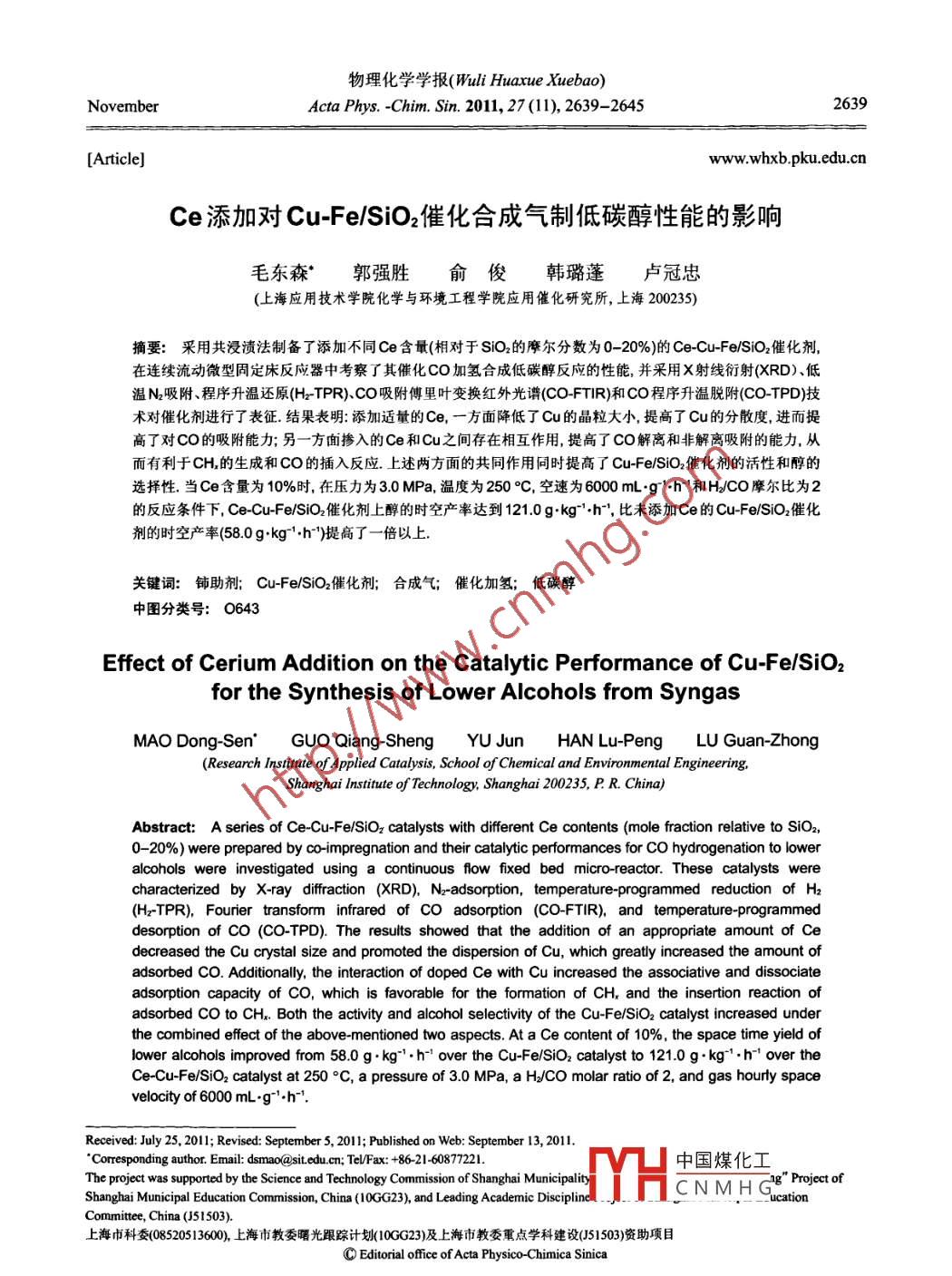 Ce添加對Cu-Fe/SiO2催化合成氣制低碳醇性能的影響